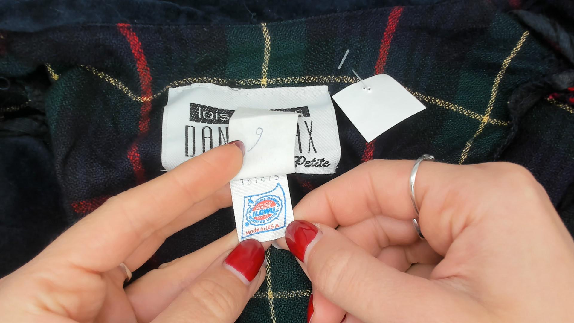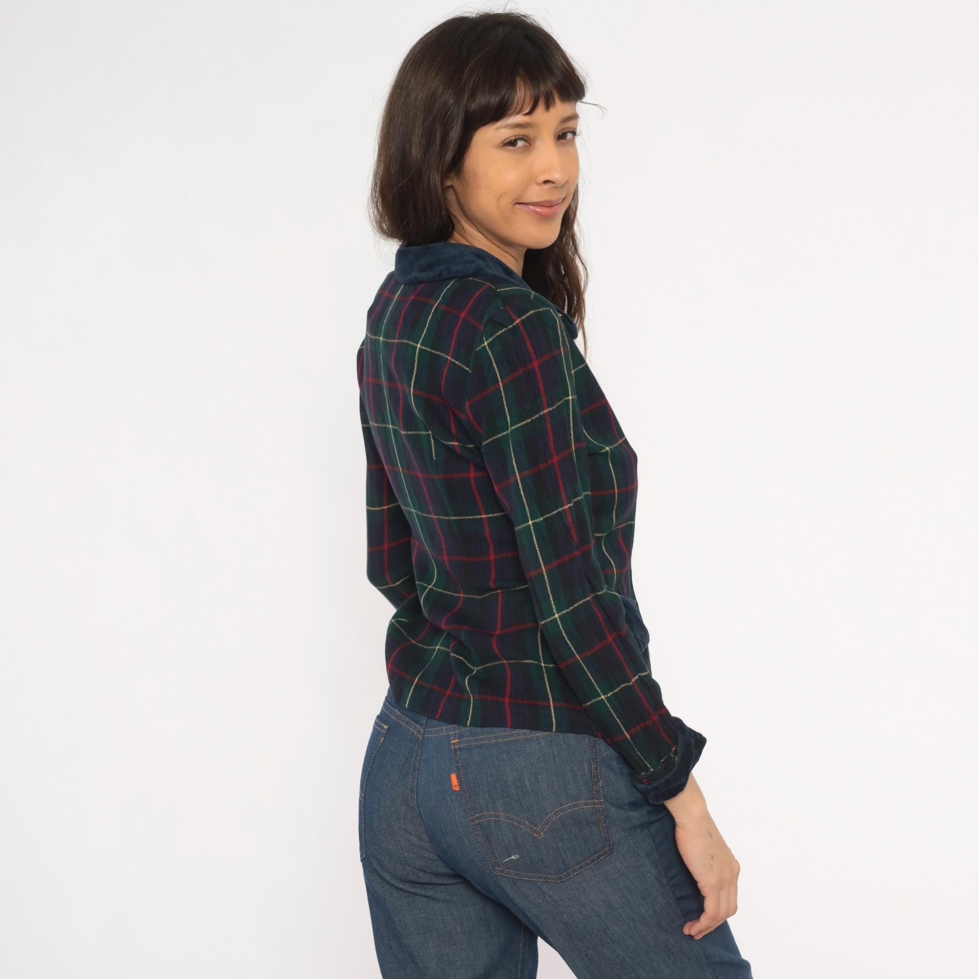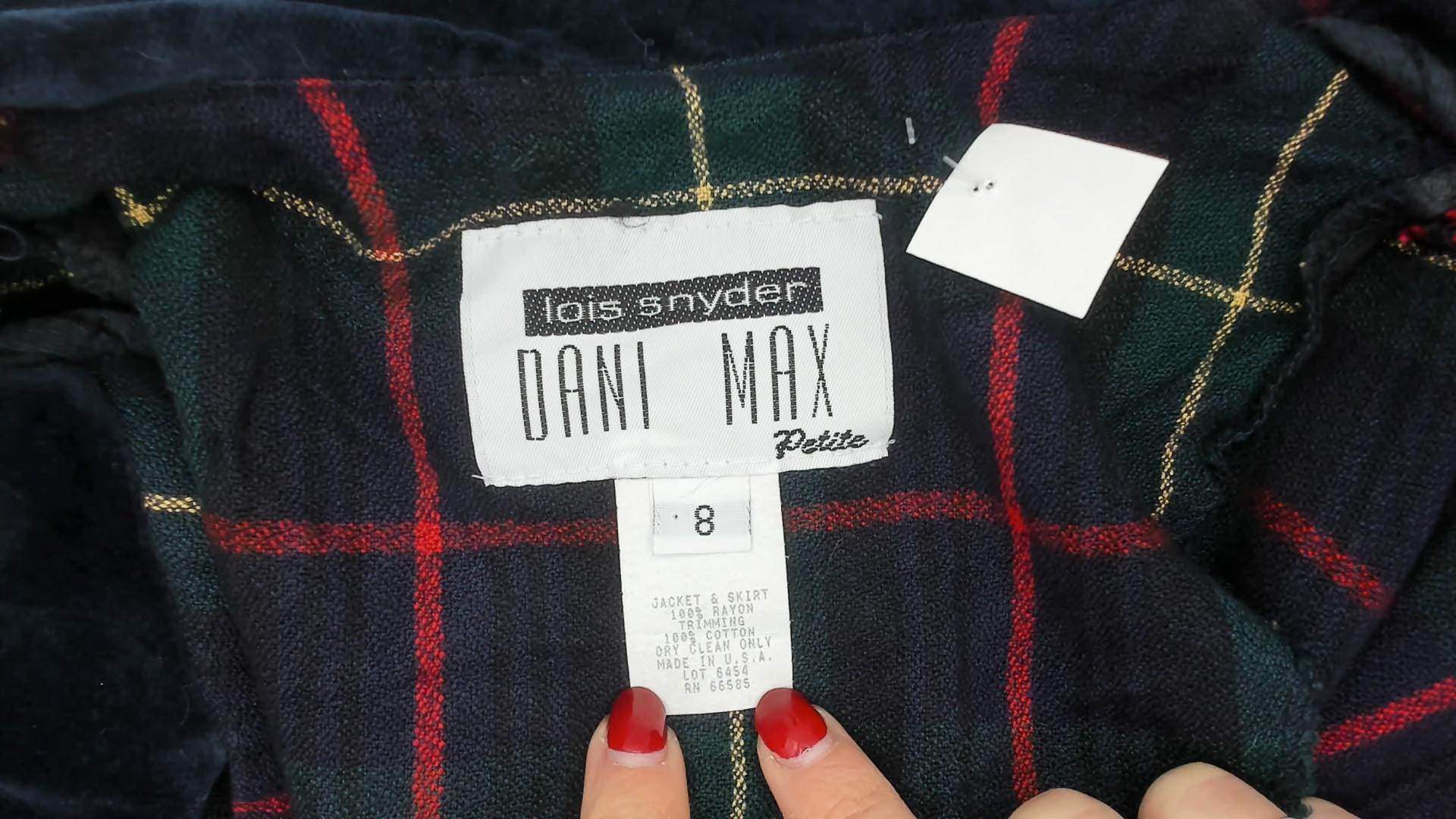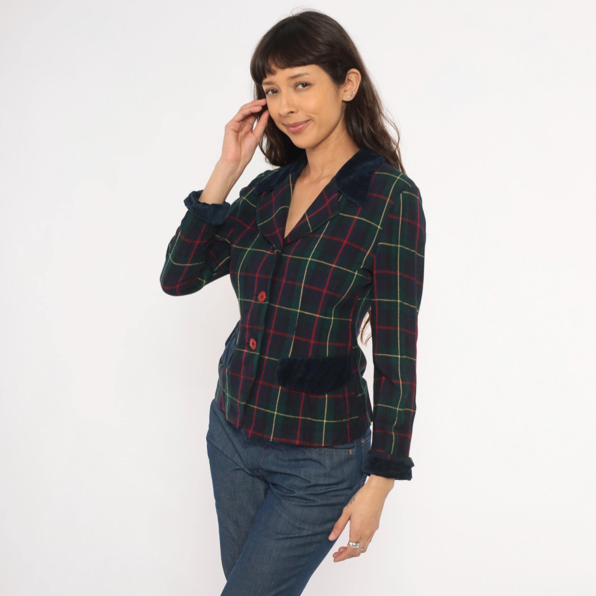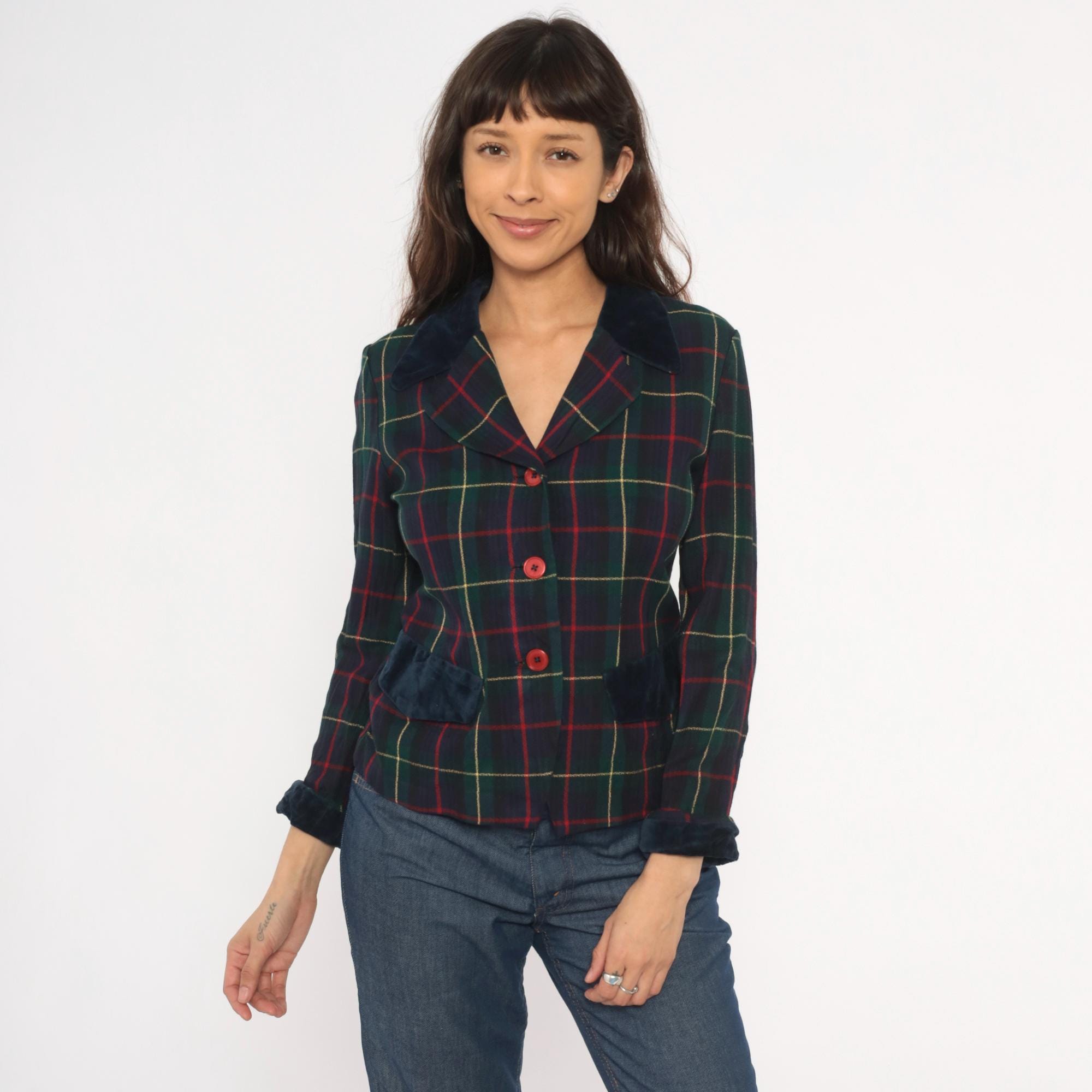 90s tartan plaid blazer from Dani Max in navy, forest green, and red with gold accent lines. Dark navy velvet collar, pocket flaps, and cuffs contrast against the woven plaid body. Three red button front closure, notched lapel, and fitted waist with a cropped hip length cut.