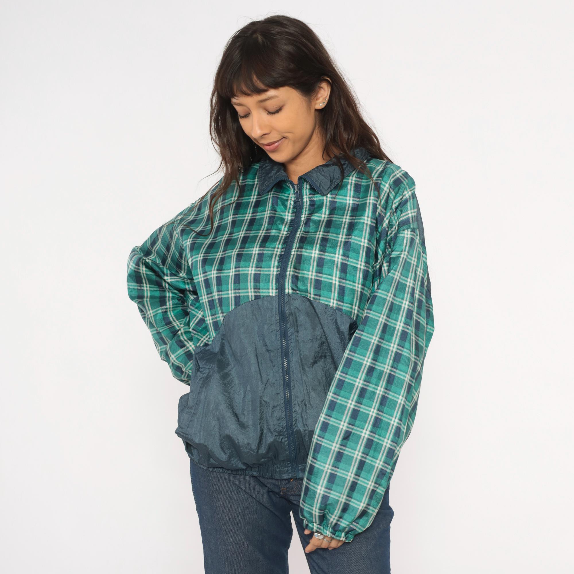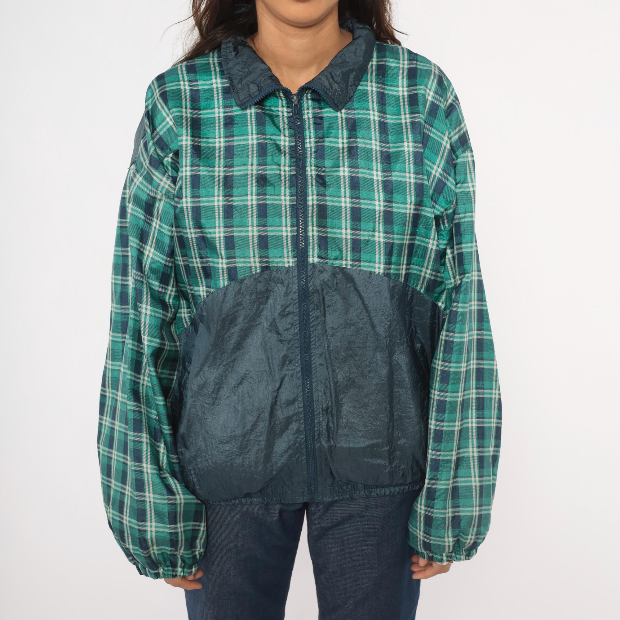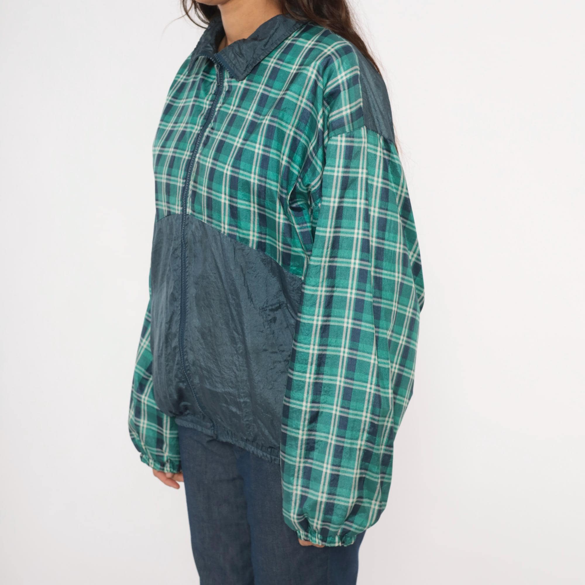 90s green and navy plaid windbreaker jacket from Honors with full front zipper closure and fold-down collar. Color-blocked construction with a teal, white, and navy plaid upper chest and sleeves paired with a solid dark blue-gray nylon lower torso and full back panel. Elasticized cuffs and hem, front patch pocket at the lower section, and a light-colored lining visible on the interior.
