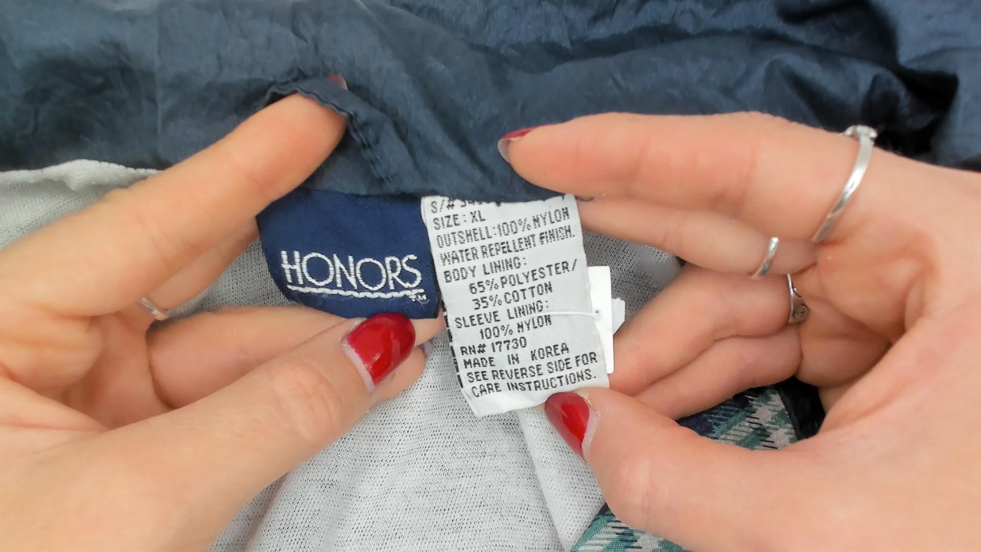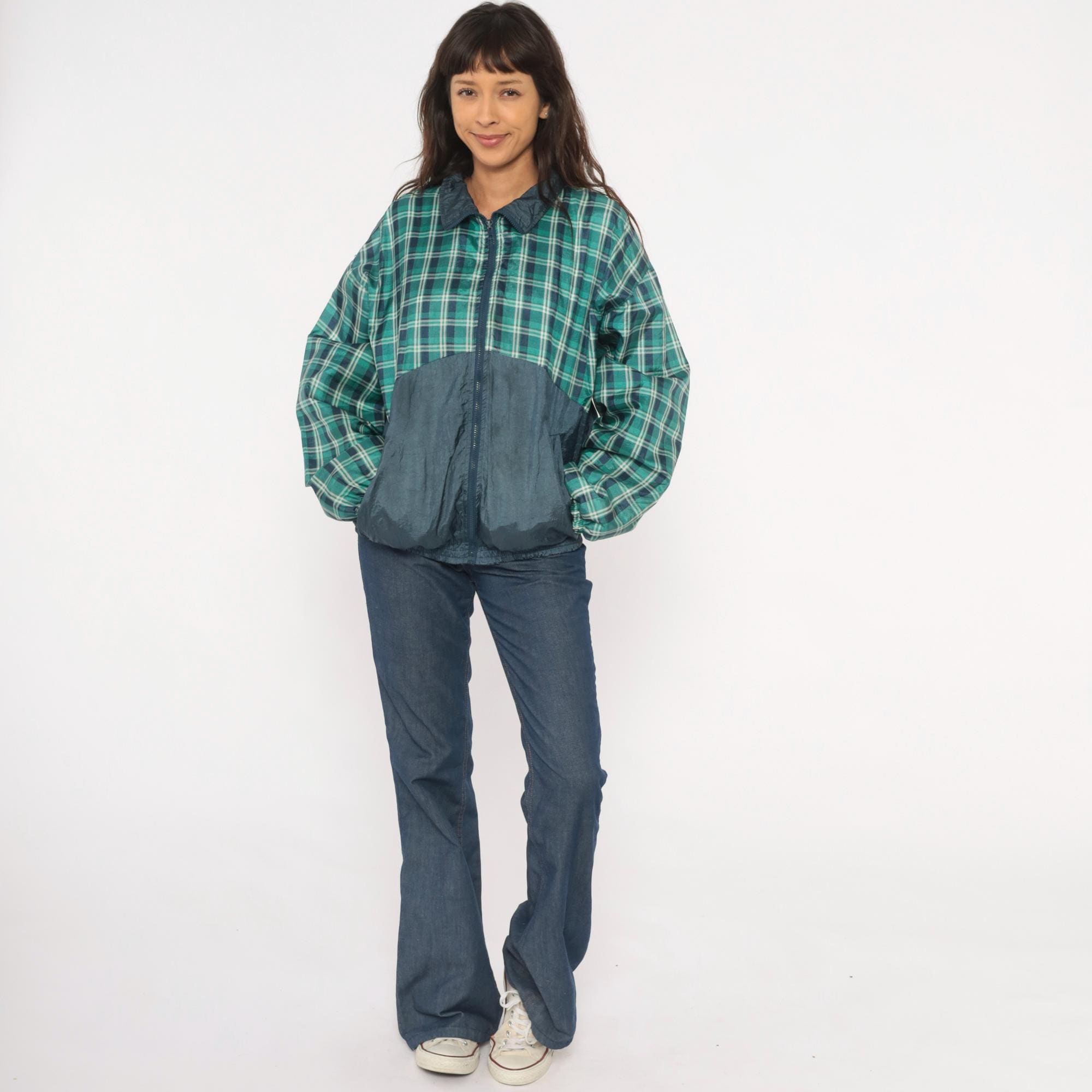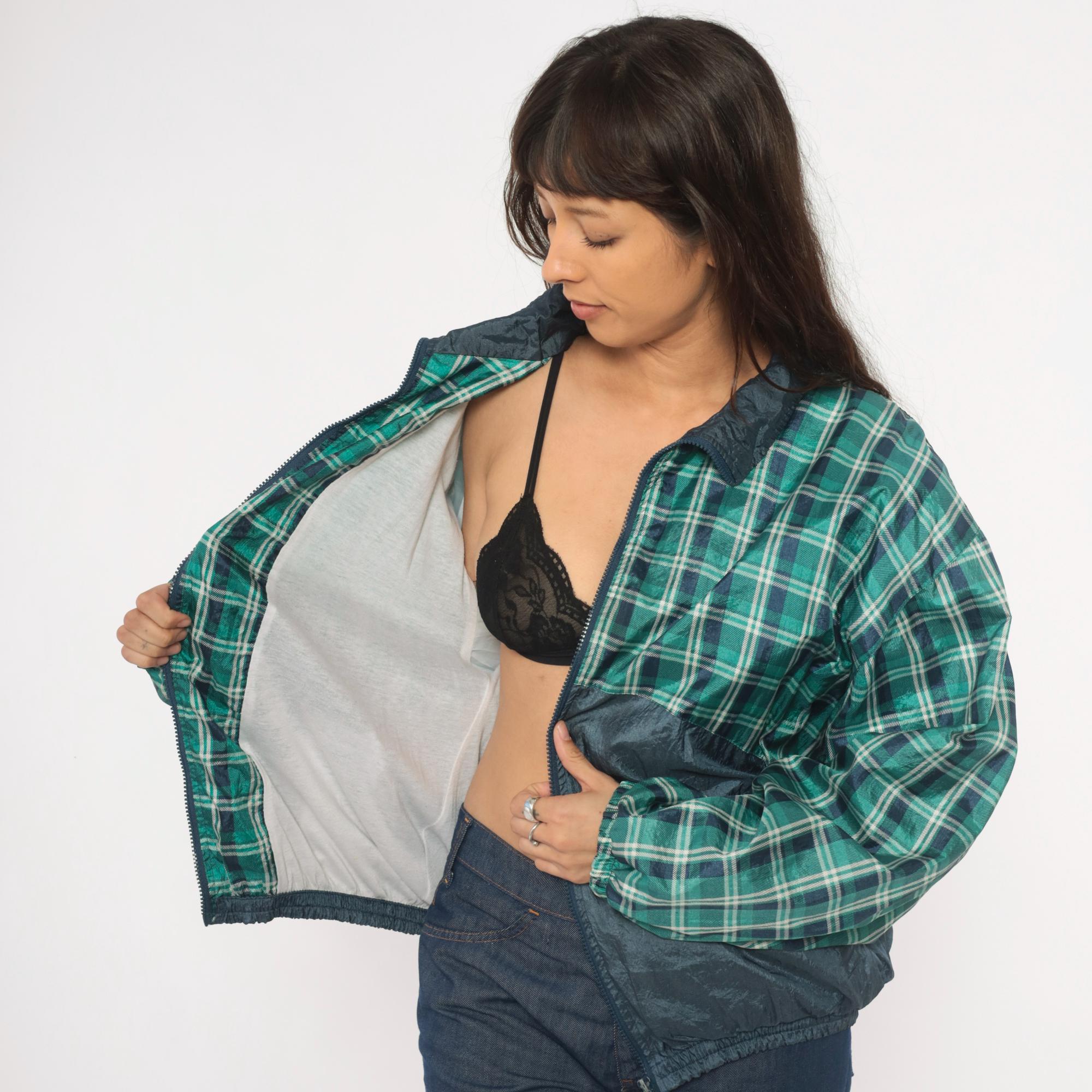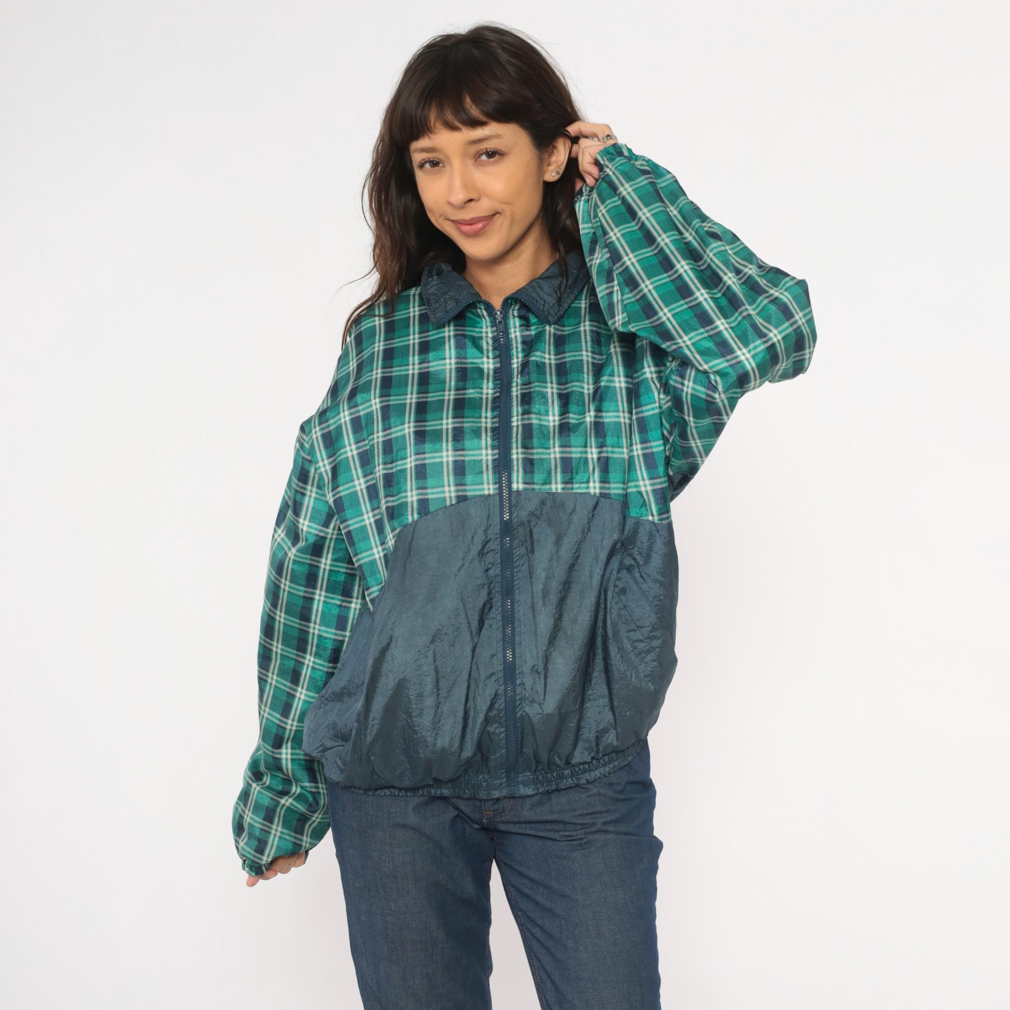 90s green and navy plaid windbreaker jacket from Honors with full front zipper closure and fold-down collar. Color-blocked construction with a teal, white, and navy plaid upper chest and sleeves paired with a solid dark blue-gray nylon lower torso and full back panel. Elasticized cuffs and hem, front patch pocket at the lower section, and a light-colored lining visible on the interior.