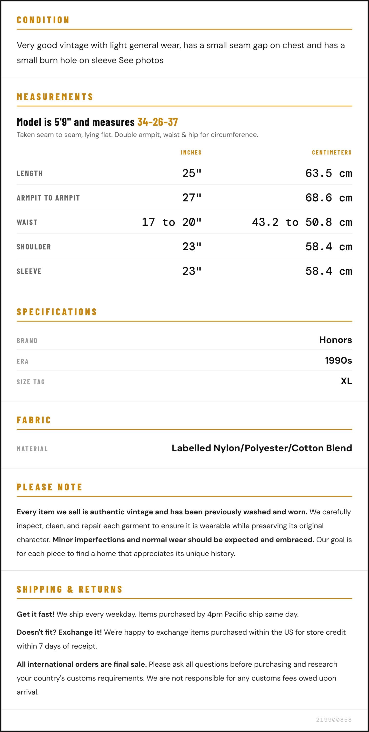 Condition: Very good vintage with light general wear, has a small seam gap on chest and has a small burn hole on sleeve See photos
