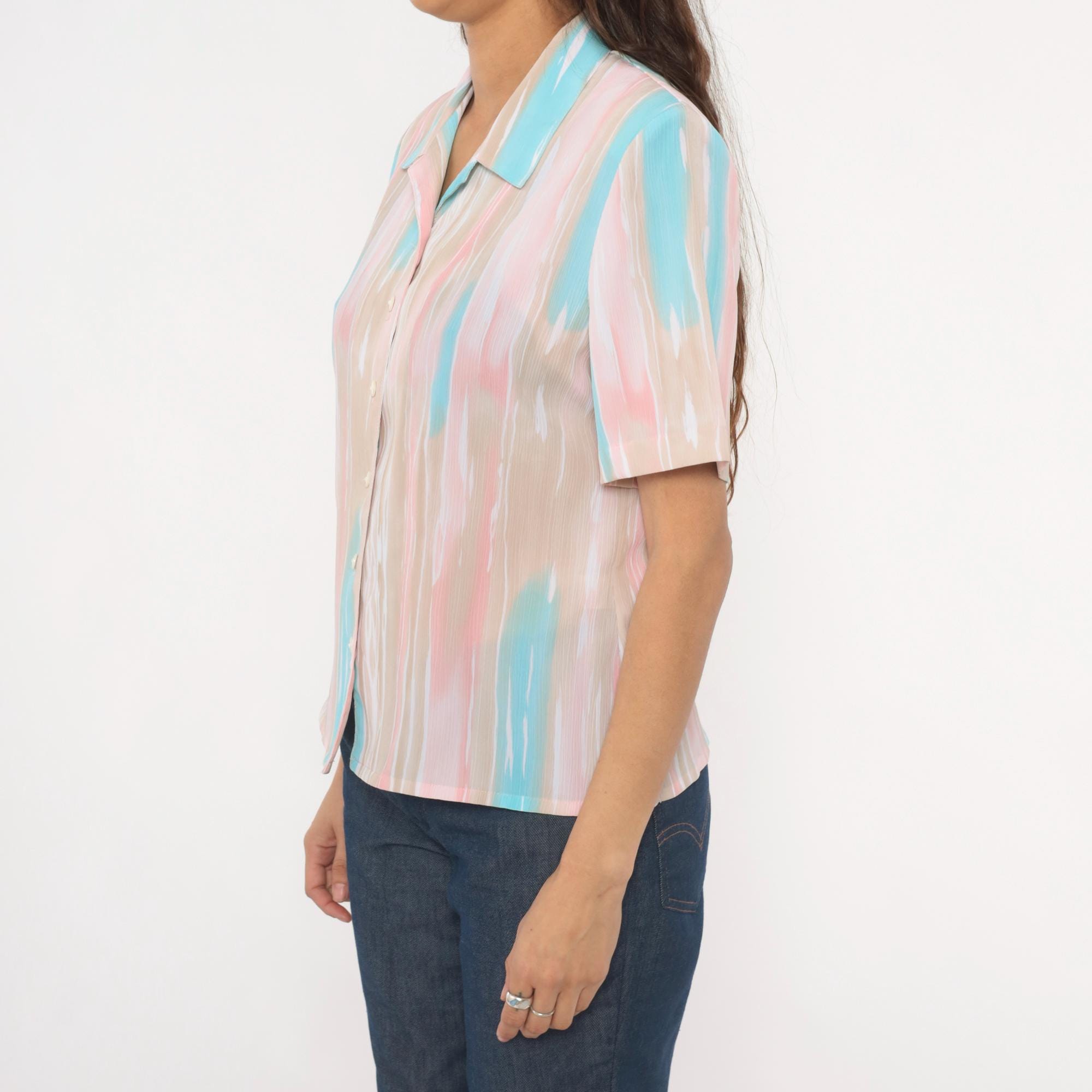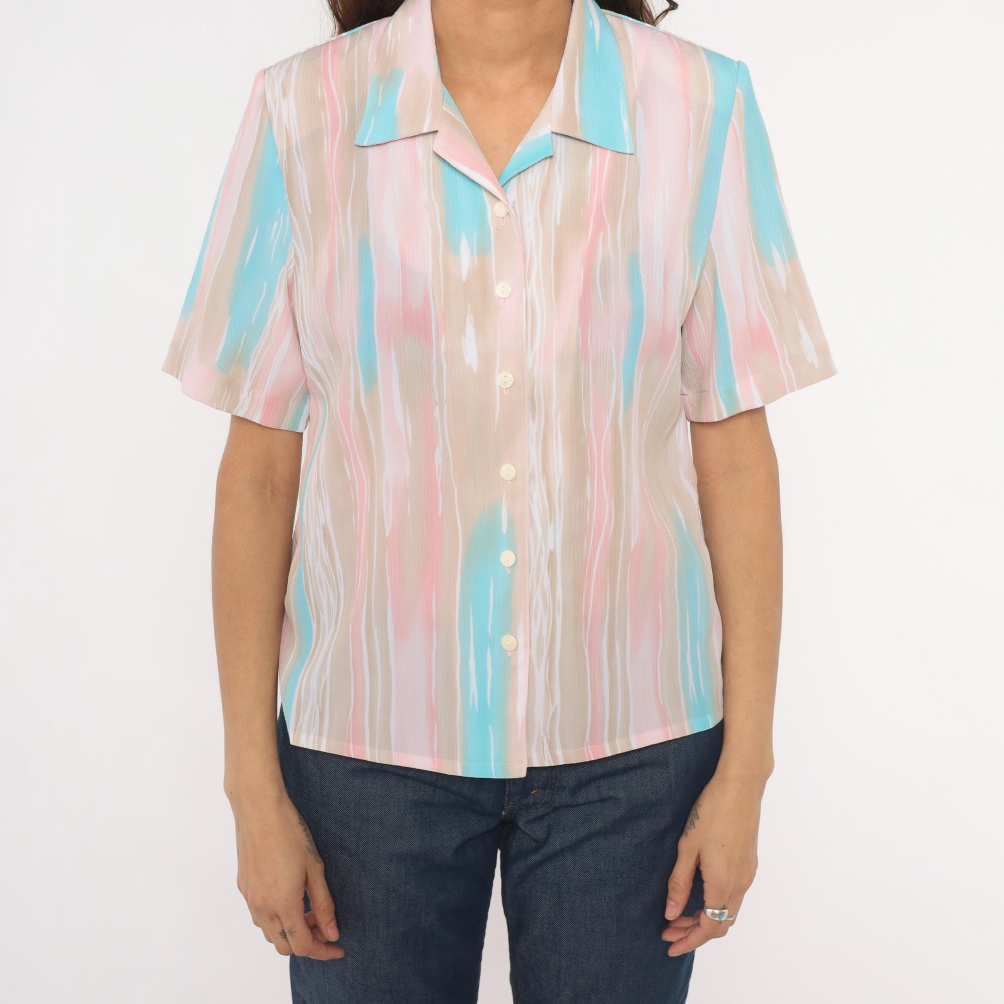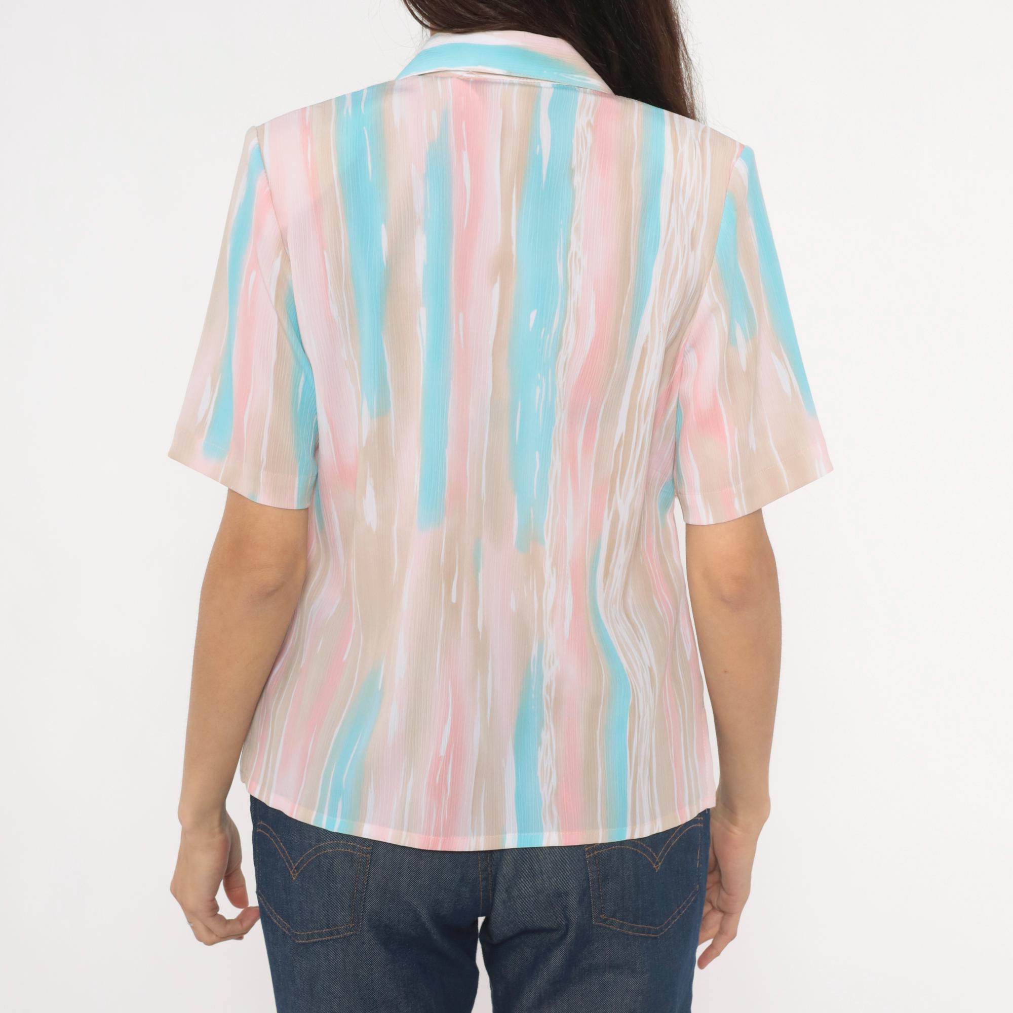 80s pastel button front blouse from Allison Daley with a watercolor-style vertical stripe pattern in pink, aqua, beige, and white. Camp collar, short sleeves, and semi-sheer body with front button closure. Straight hem with small side slits.