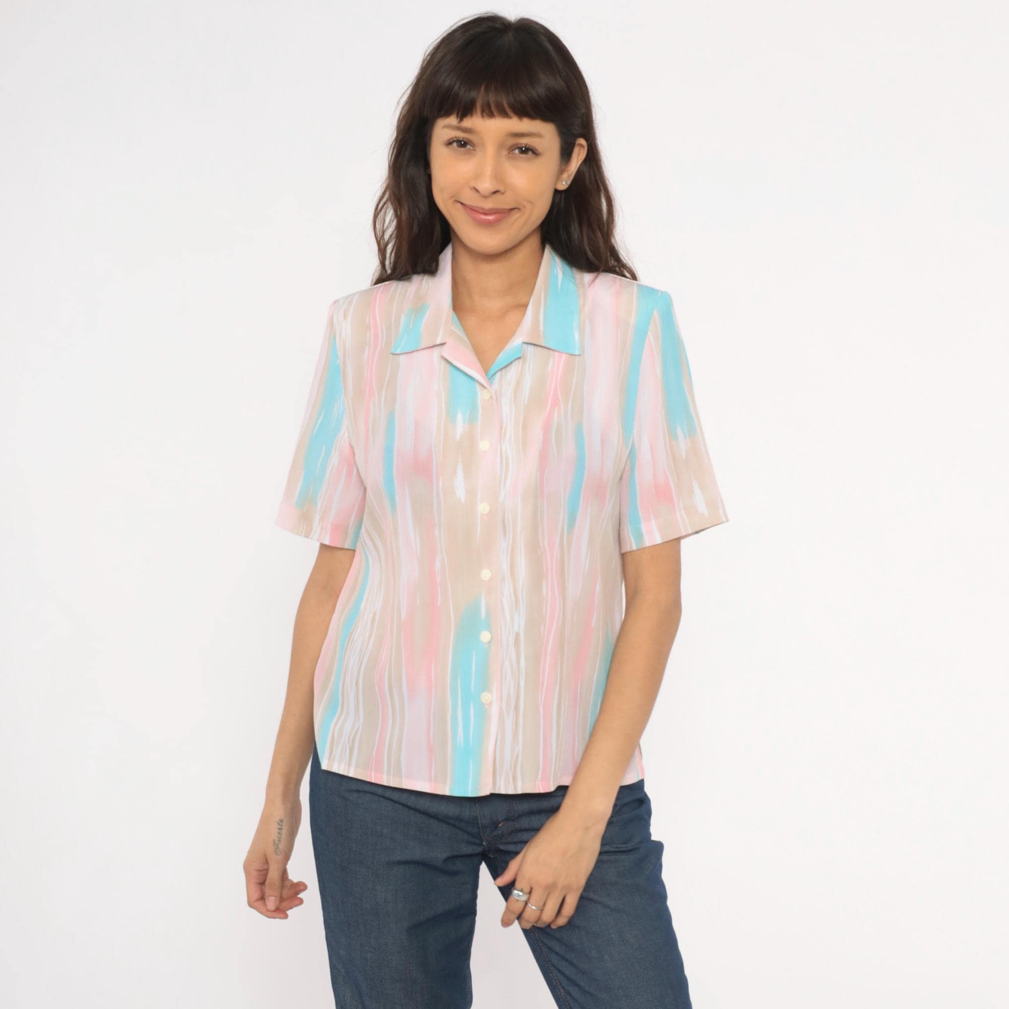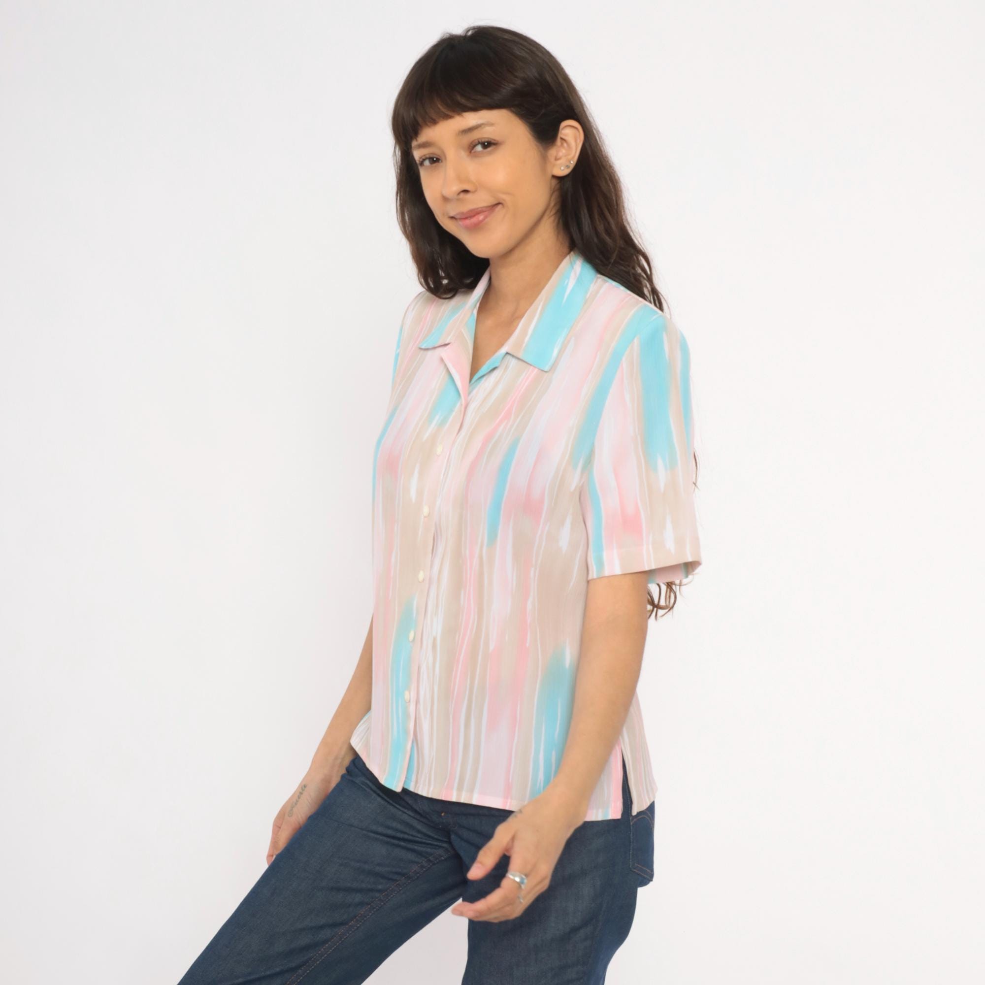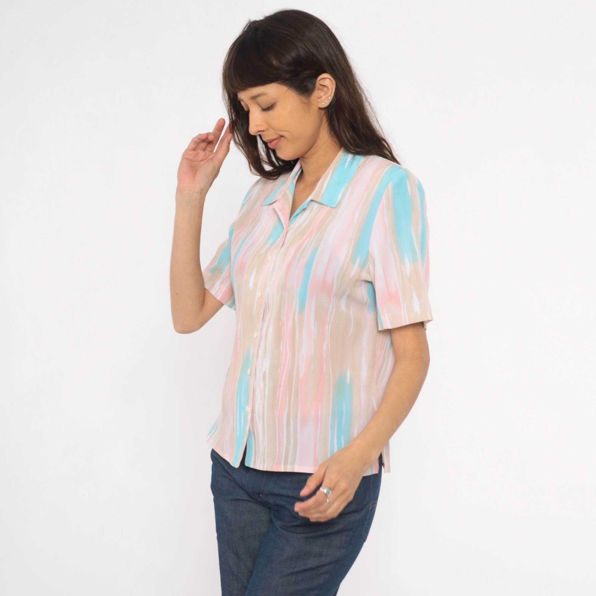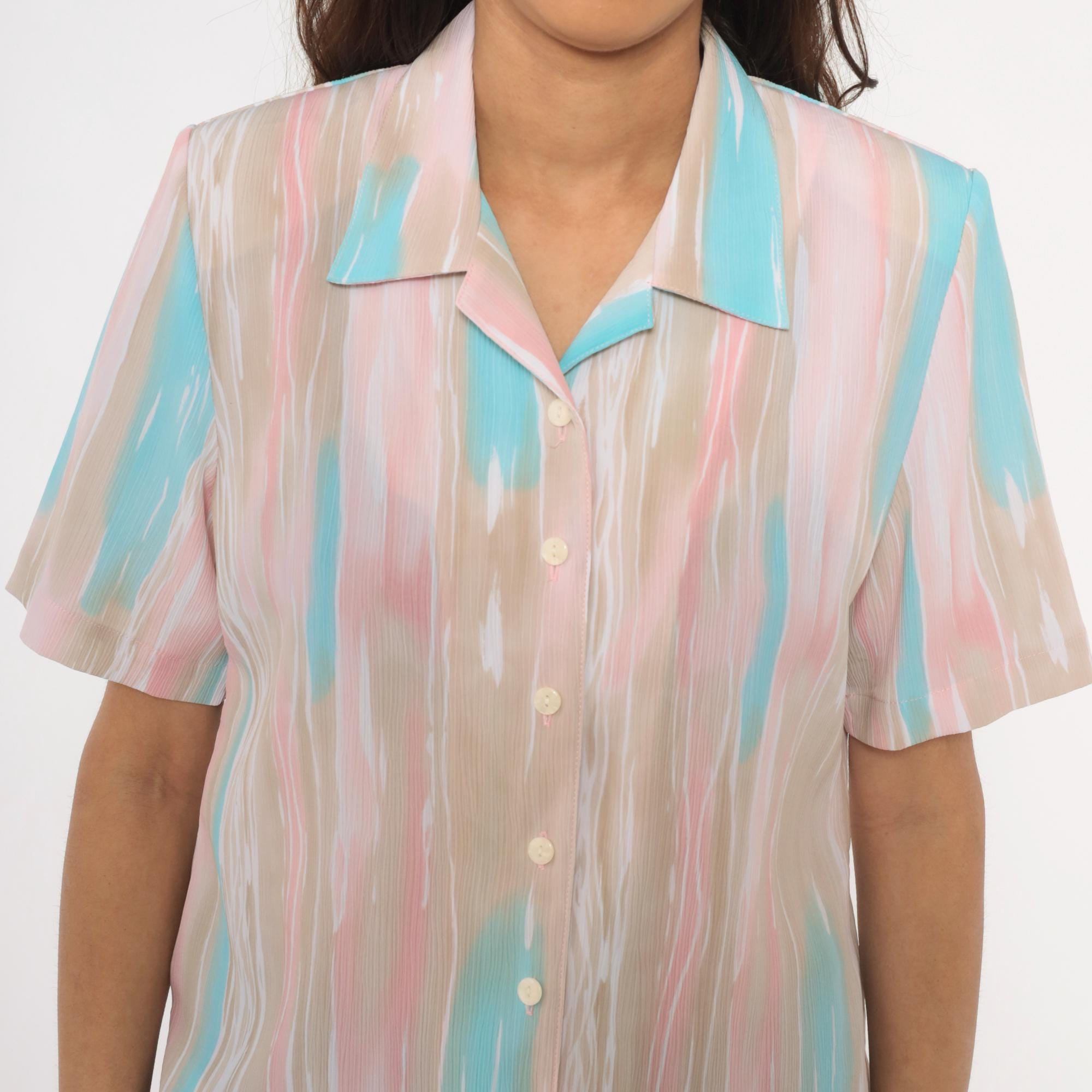 80s pastel button front blouse from Allison Daley with a watercolor-style vertical stripe pattern in pink, aqua, beige, and white. Camp collar, short sleeves, and semi-sheer body with front button closure. Straight hem with small side slits.