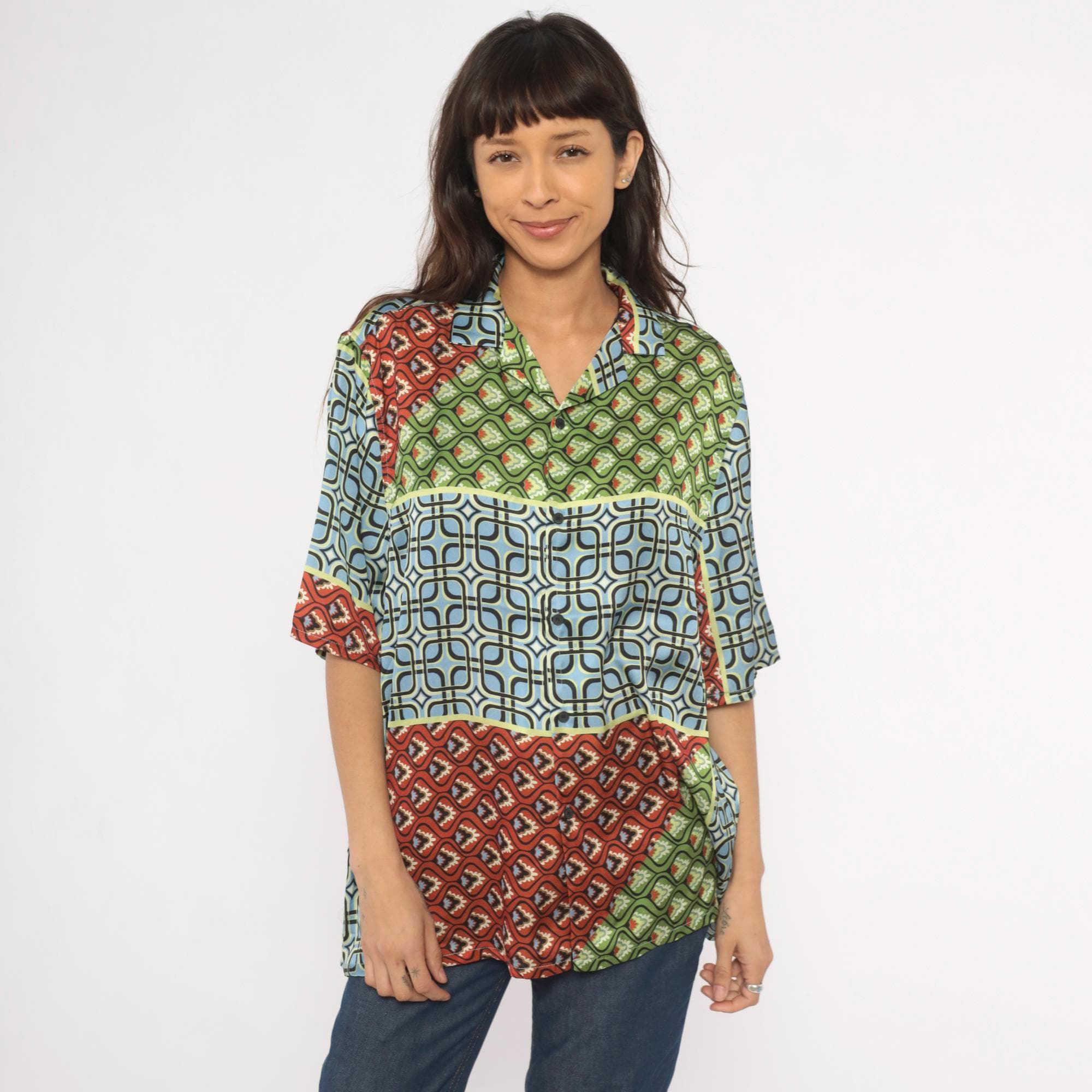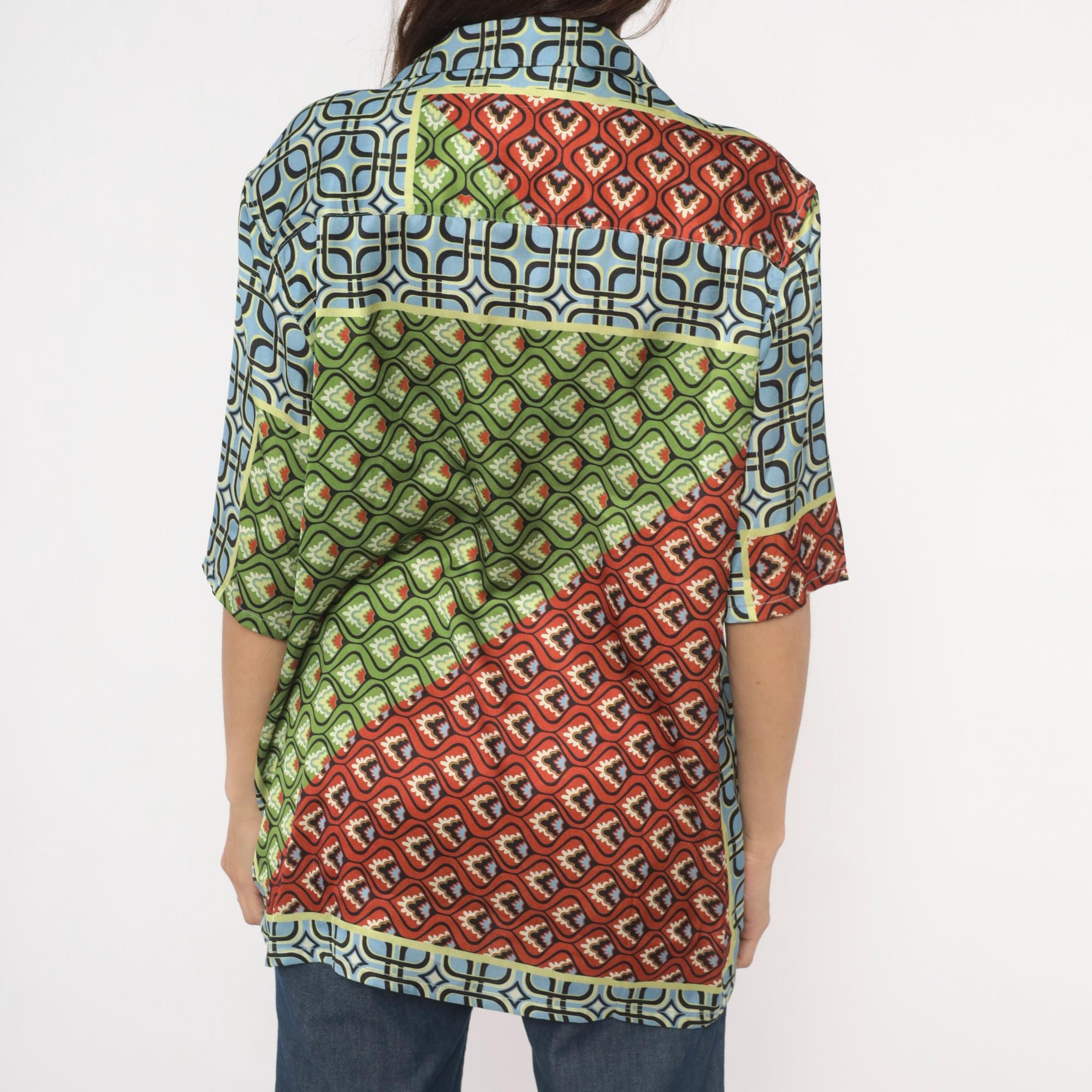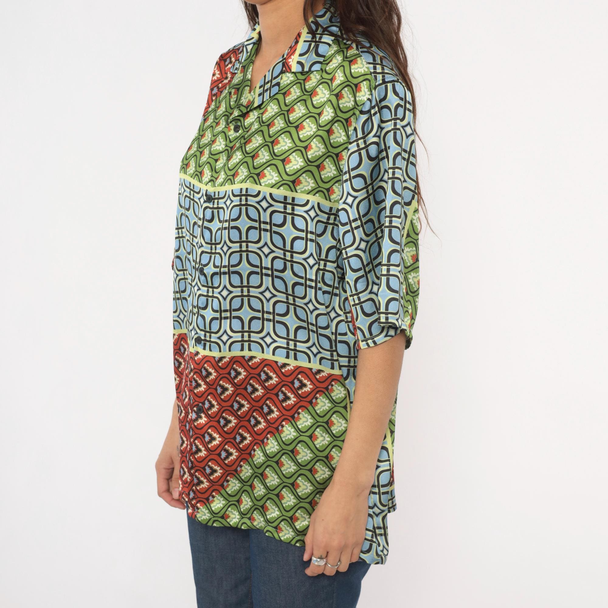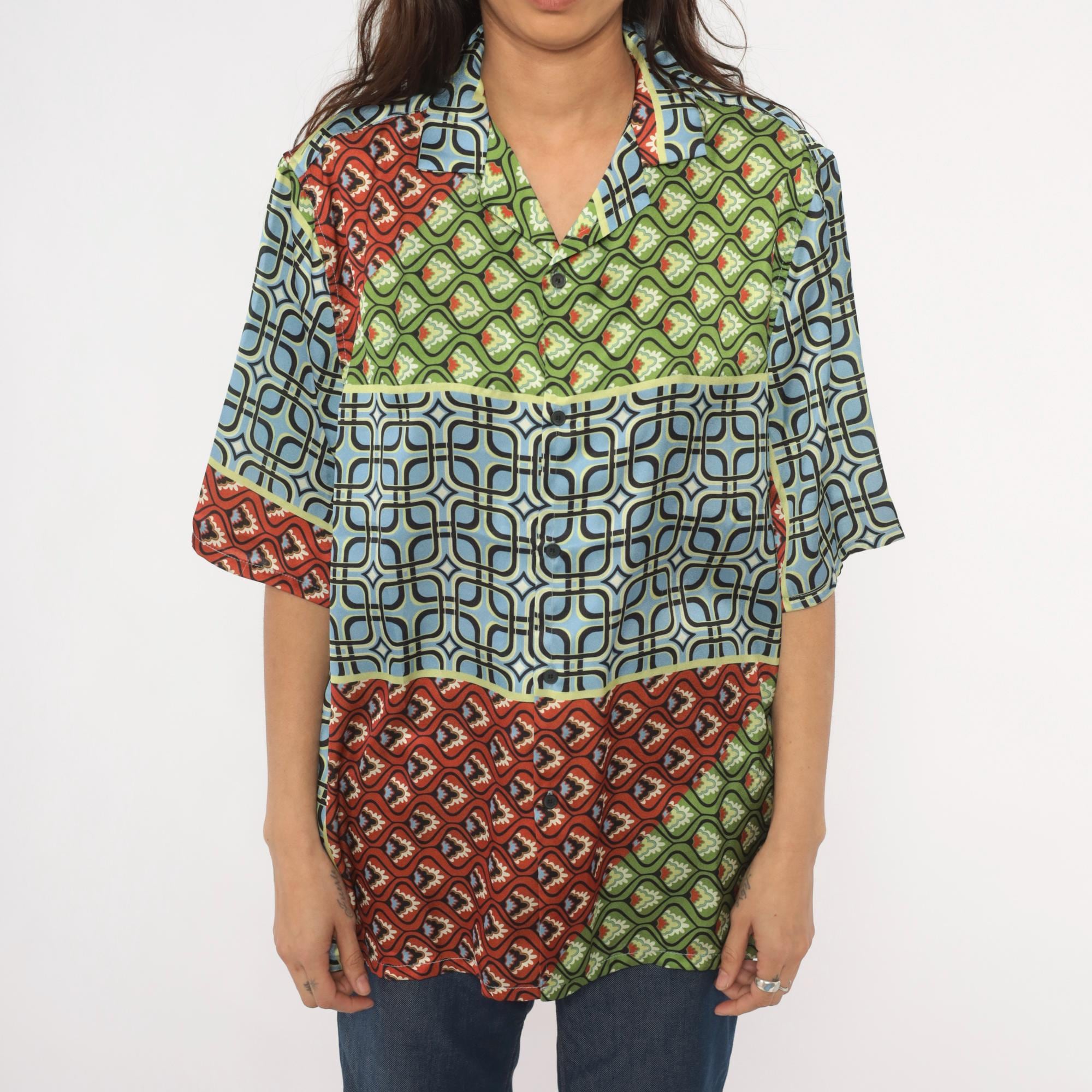 2000s geometric patchwork shirt from Juny with three distinct tile-inspired prints in green, blue, and red-brown colorways separated by yellow piping trim. Camp collar, button front closure, and short sleeves with contrasting cuff detail. Each panel uses a different scale and color variation of interlocking ogee and lattice motifs, with a semi-sheer silky hand.