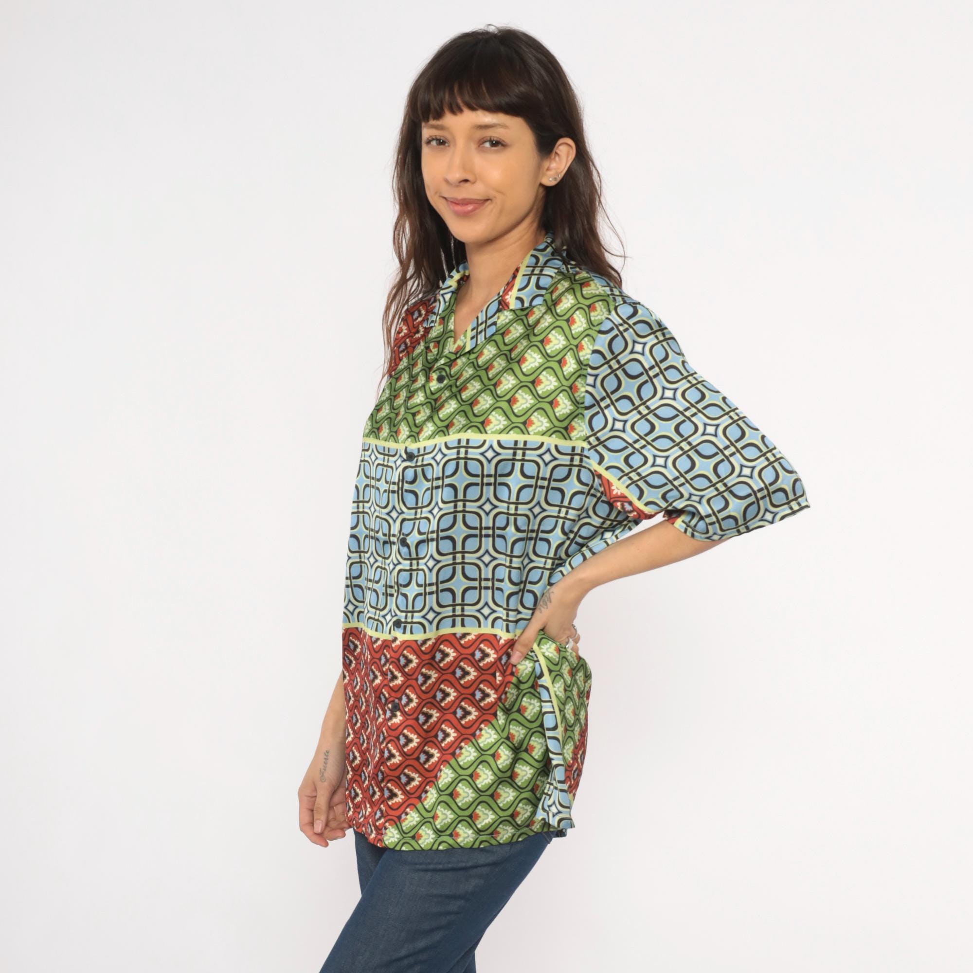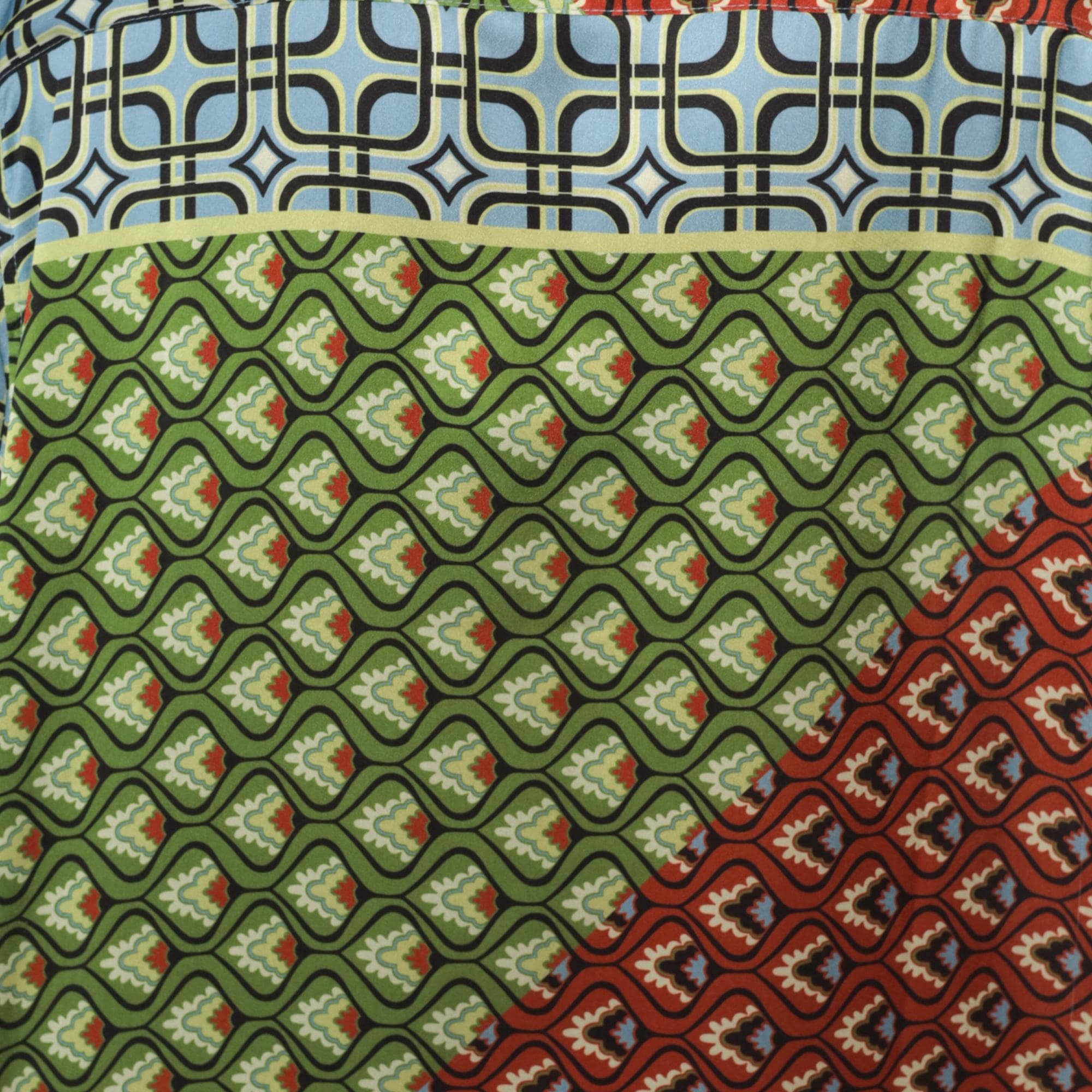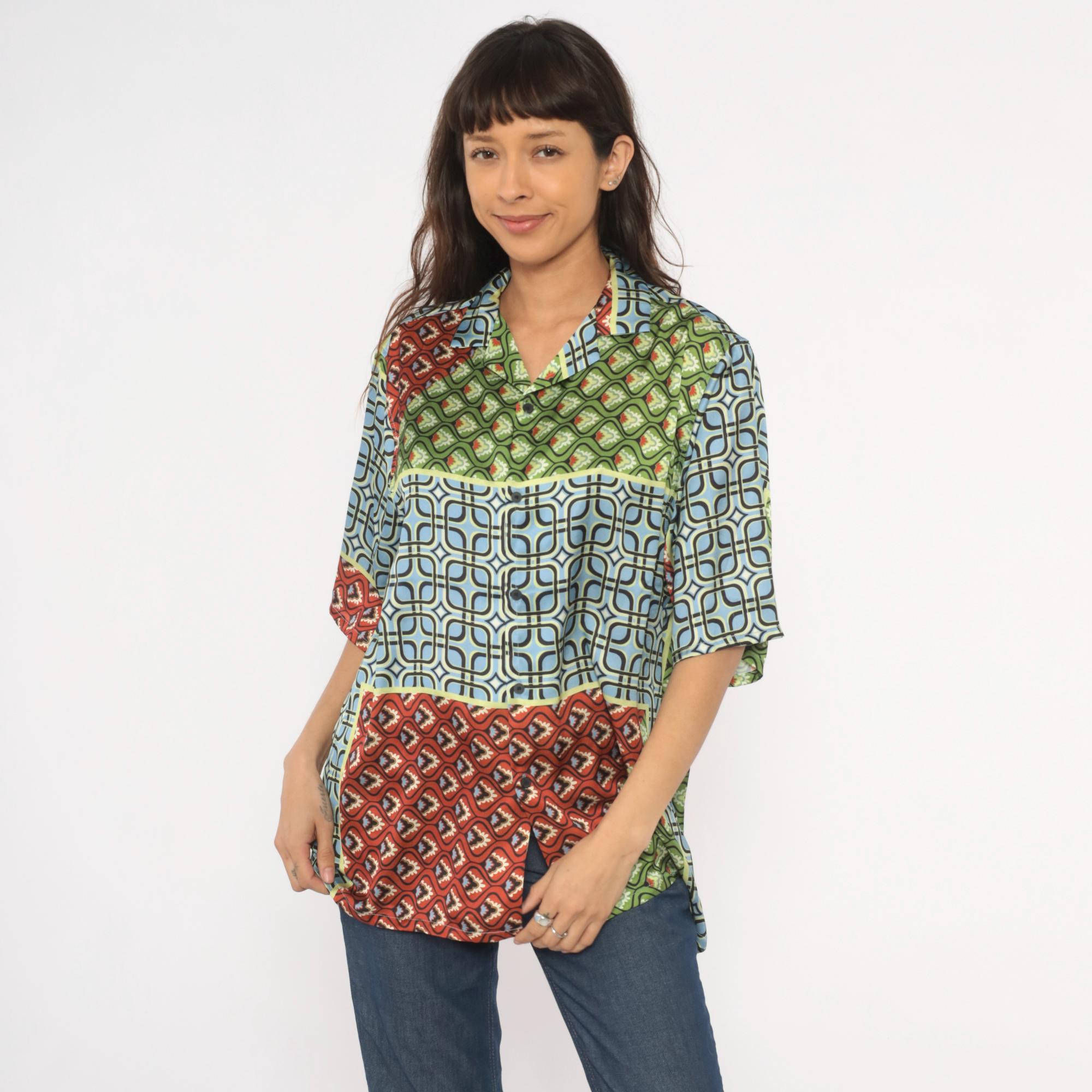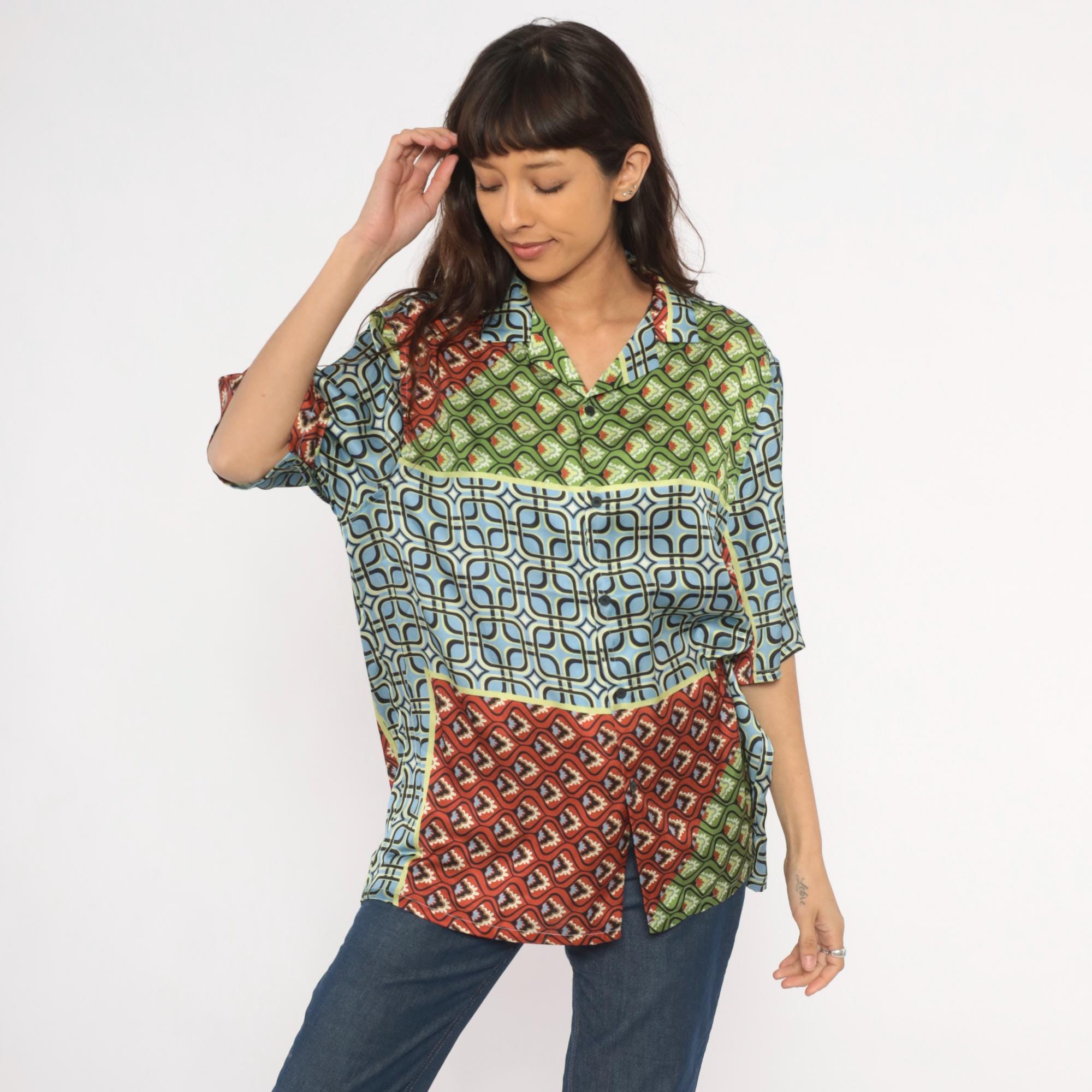 2000s geometric patchwork shirt from Juny with three distinct tile-inspired prints in green, blue, and red-brown colorways separated by yellow piping trim. Camp collar, button front closure, and short sleeves with contrasting cuff detail. Each panel uses a different scale and color variation of interlocking ogee and lattice motifs, with a semi-sheer silky hand.
