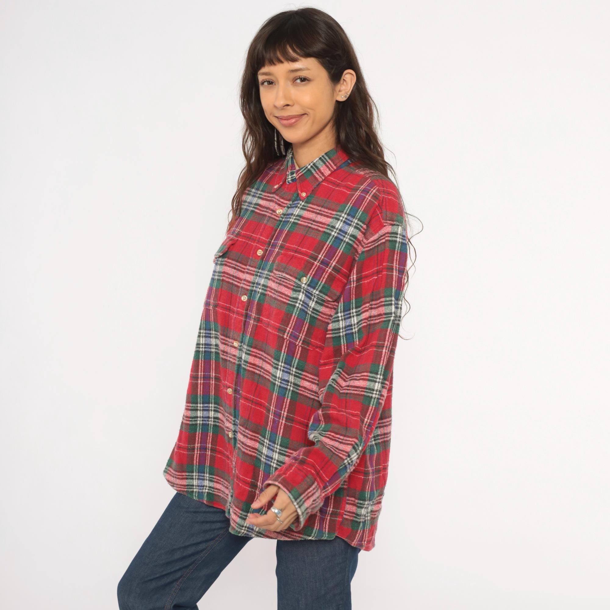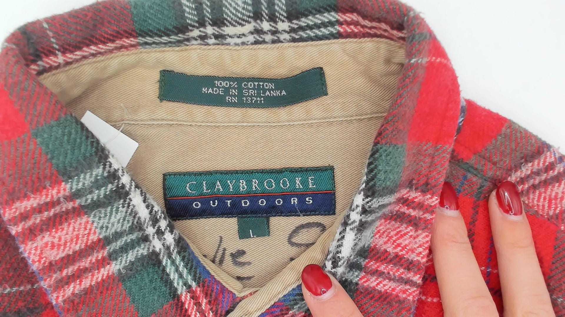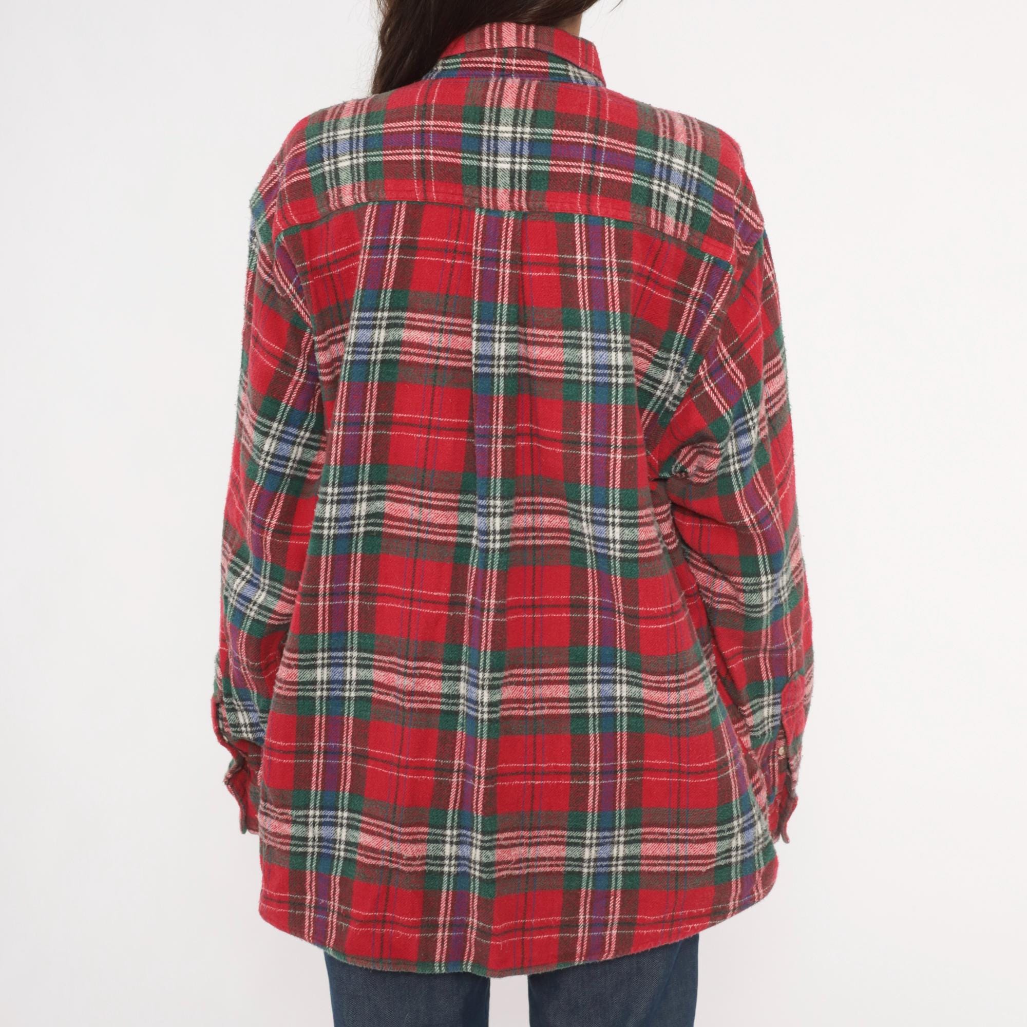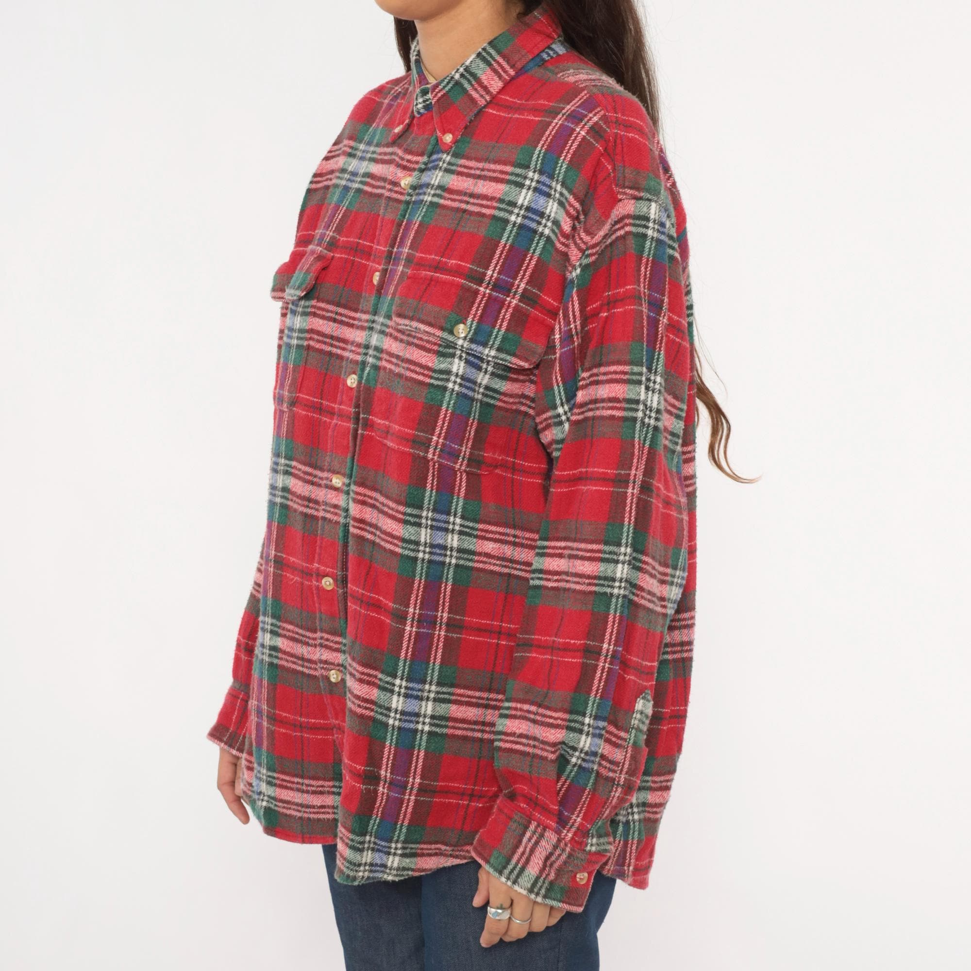 90s red tartan flannel shirt from Claybrooke Outdoors with a button-down collar and full button front closure. Green, navy, white, and purple plaid pattern across the cotton fabric. Two front patch pockets on the chest, long sleeves with buttoned cuffs, and a straight hem.