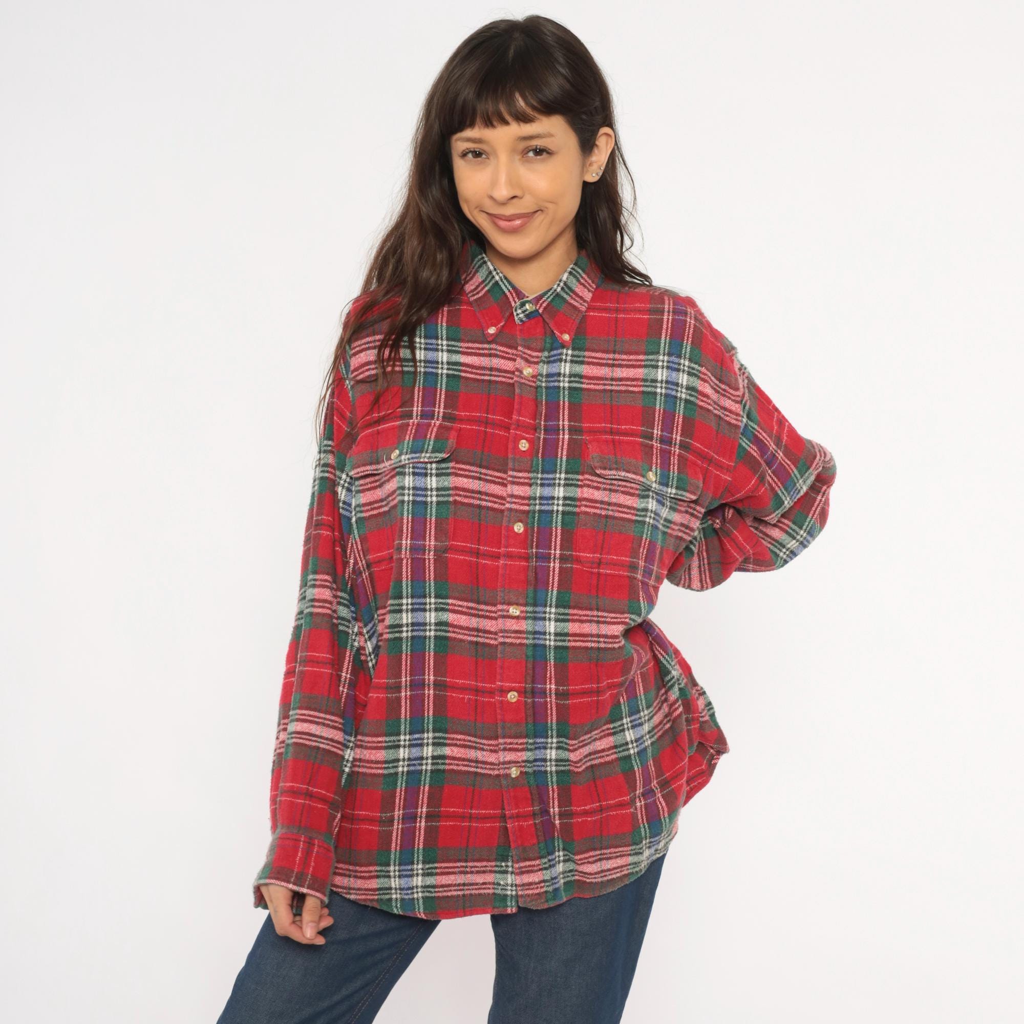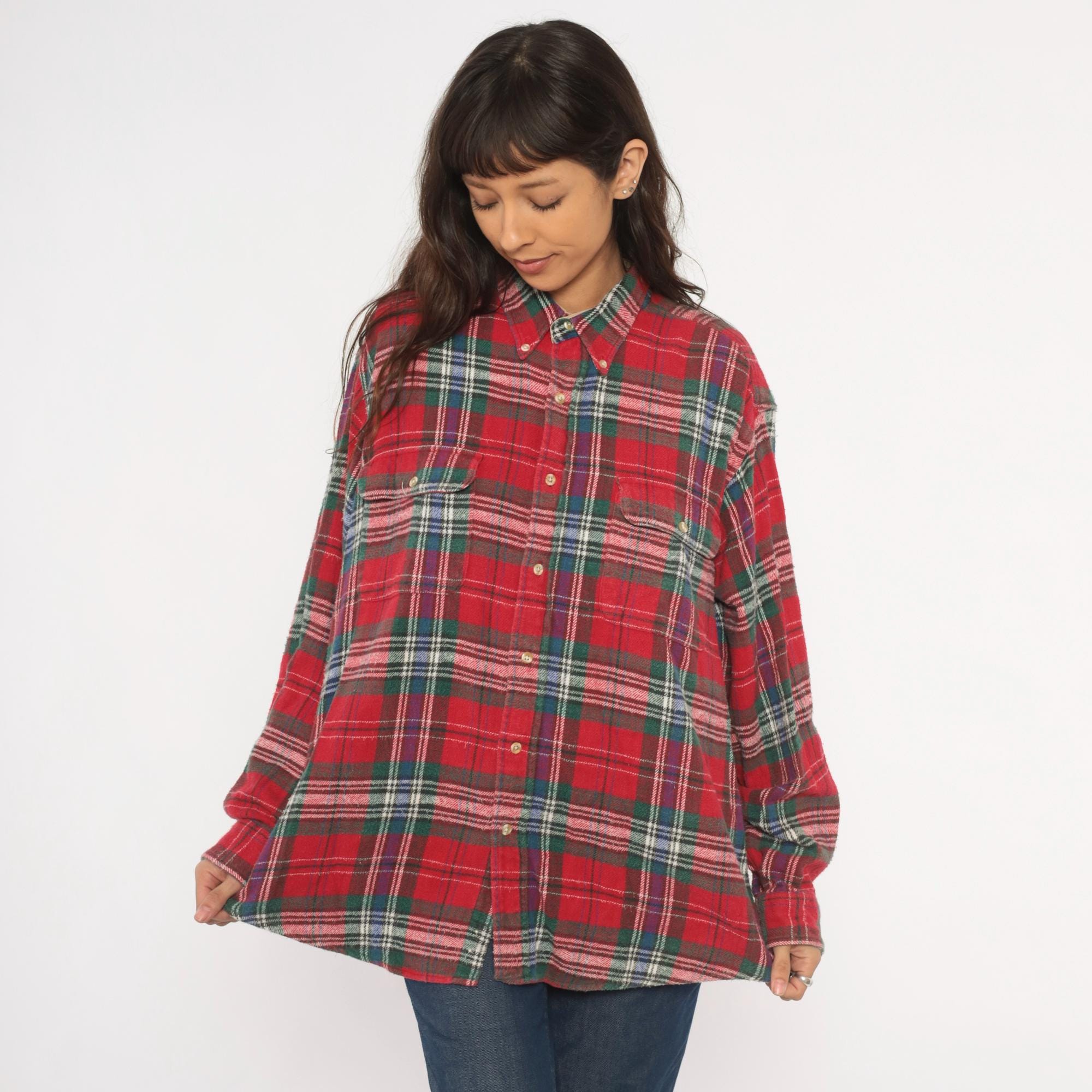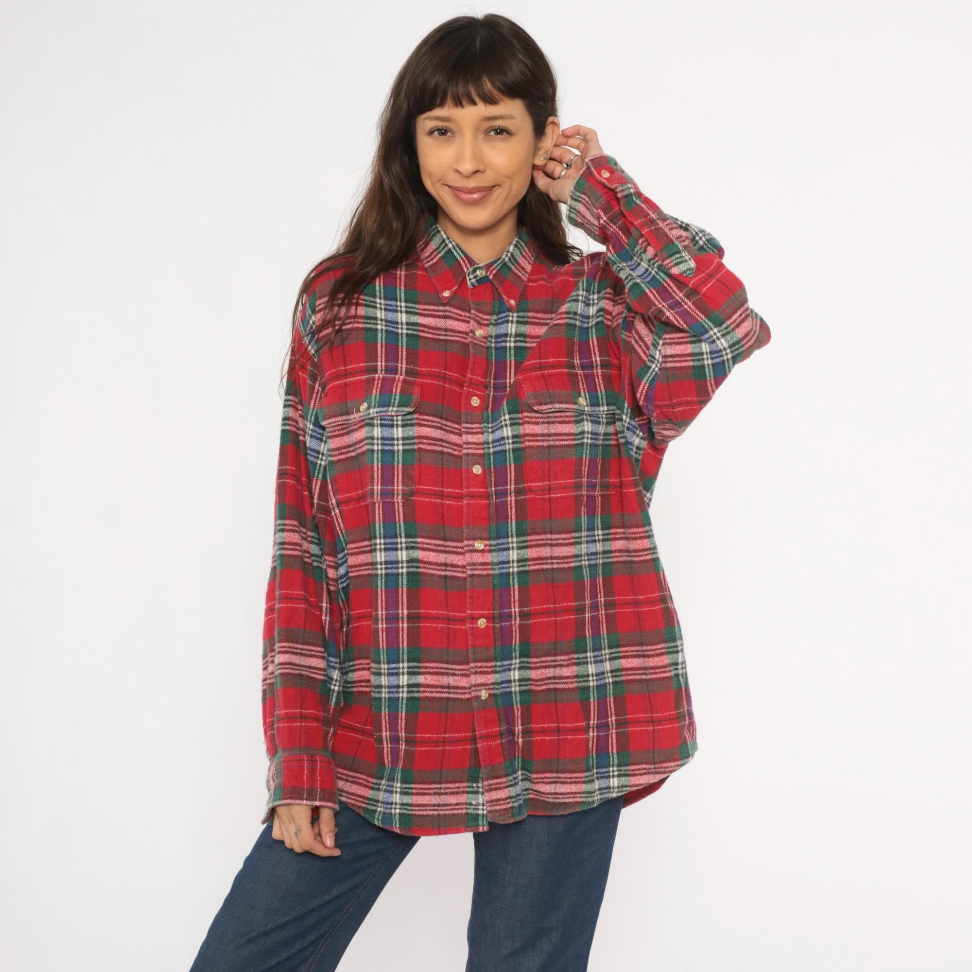 90s red tartan flannel shirt from Claybrooke Outdoors with a button-down collar and full button front closure. Green, navy, white, and purple plaid pattern across the cotton fabric. Two front patch pockets on the chest, long sleeves with buttoned cuffs, and a straight hem.
