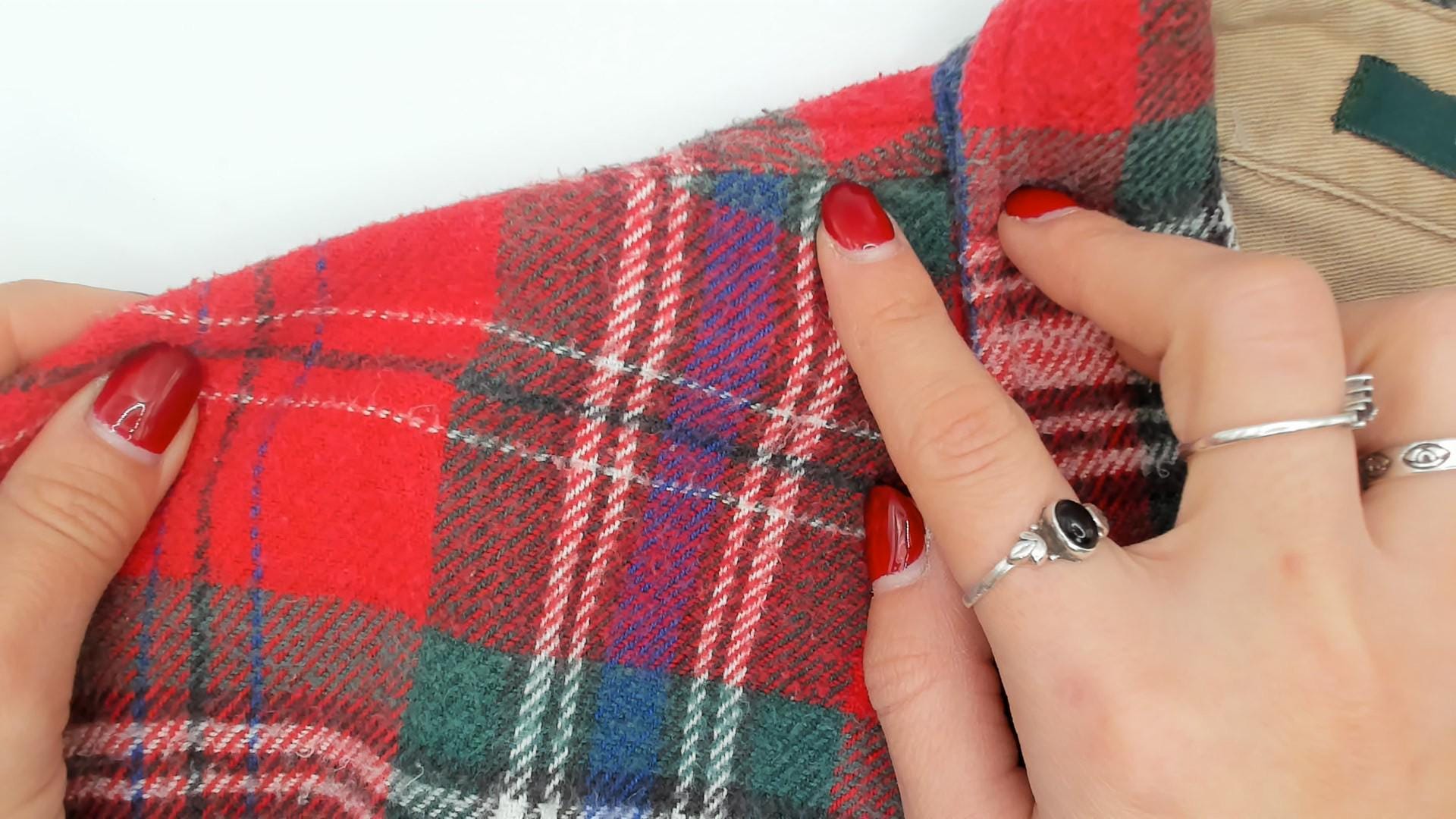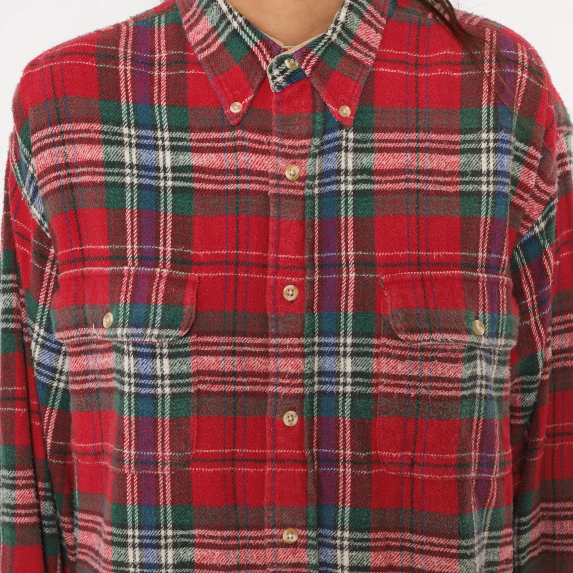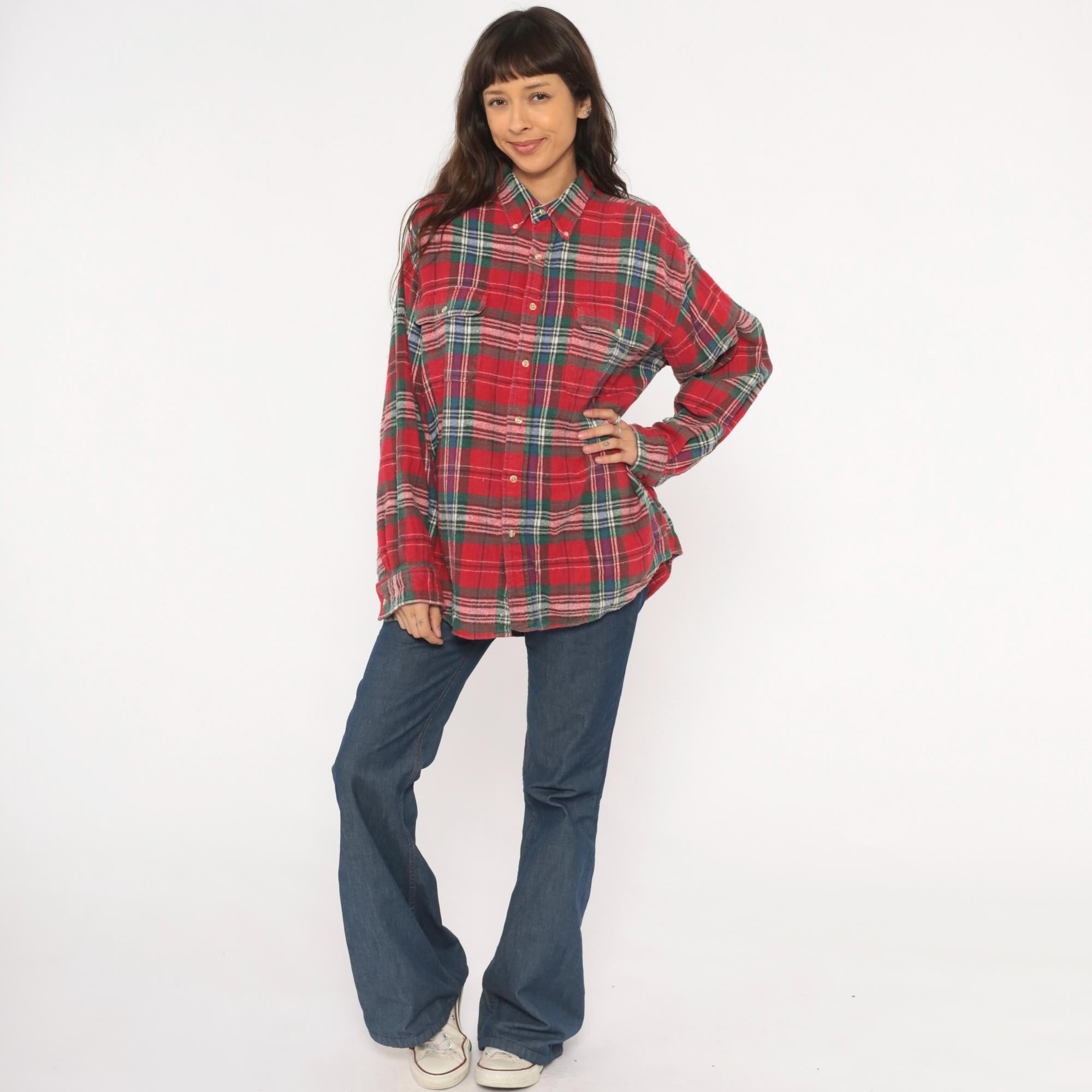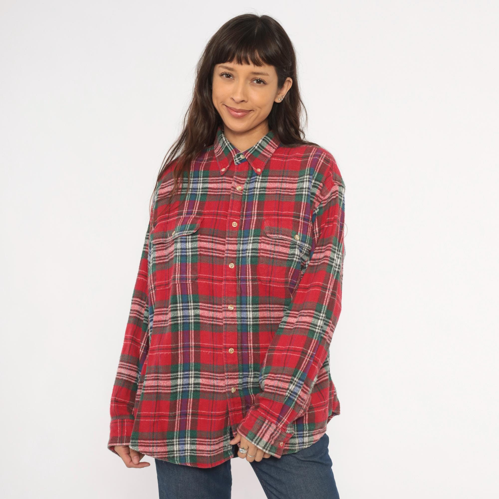 90s red tartan flannel shirt from Claybrooke Outdoors with a button-down collar and full button front closure. Green, navy, white, and purple plaid pattern across the cotton fabric. Two front patch pockets on the chest, long sleeves with buttoned cuffs, and a straight hem.