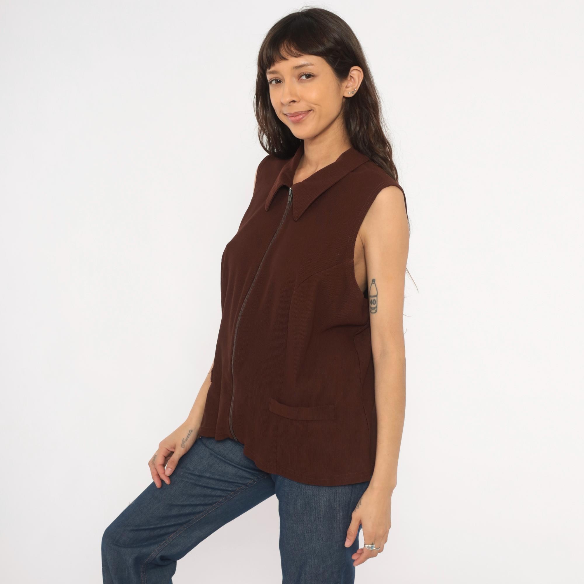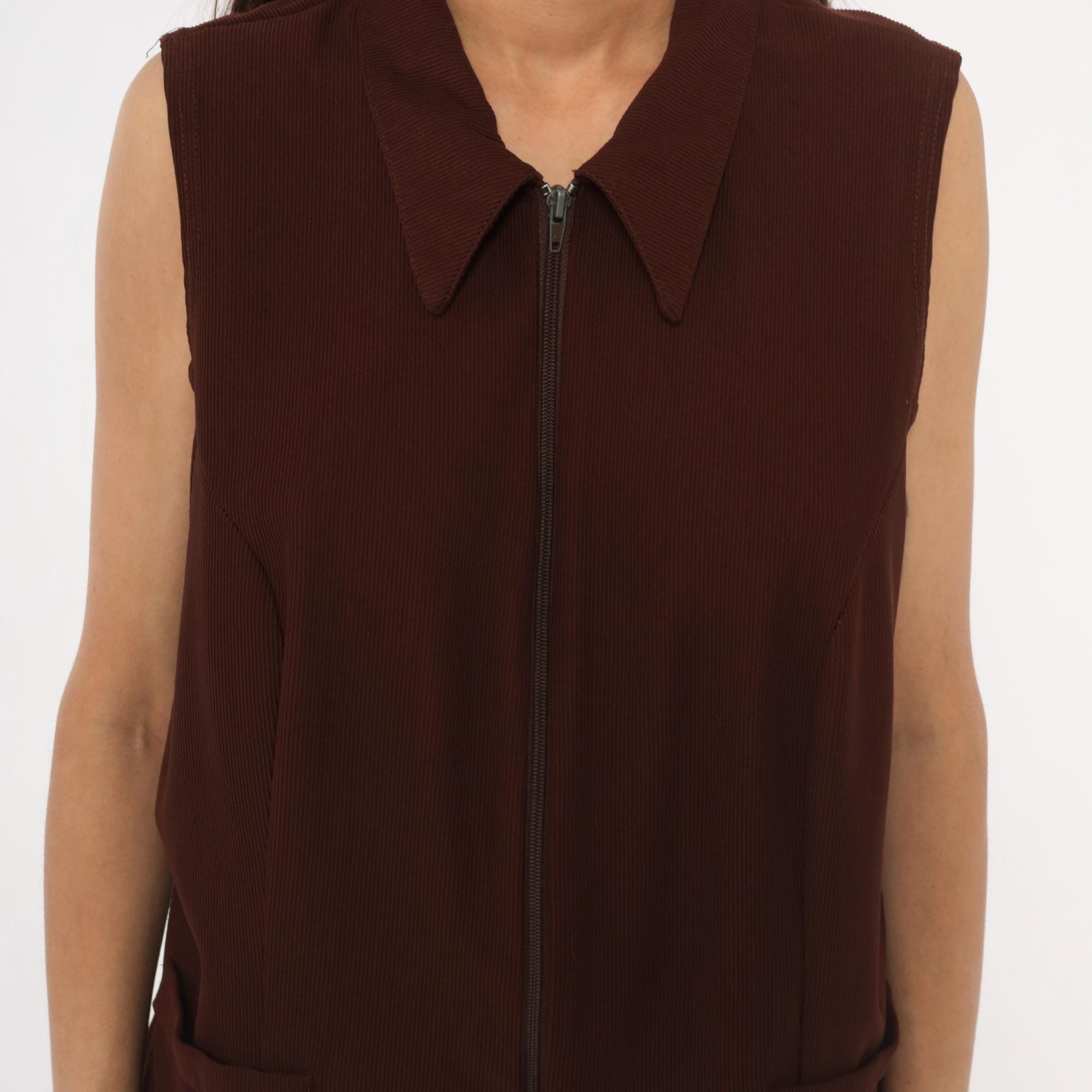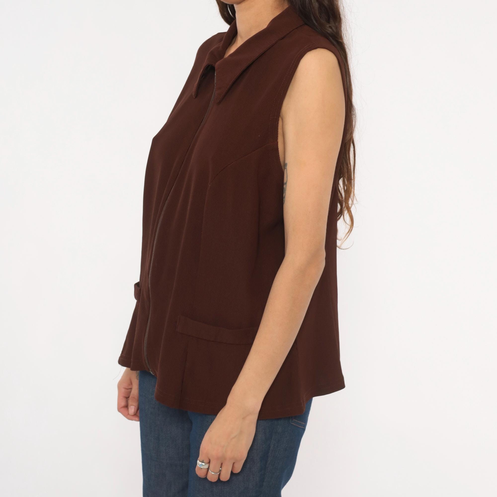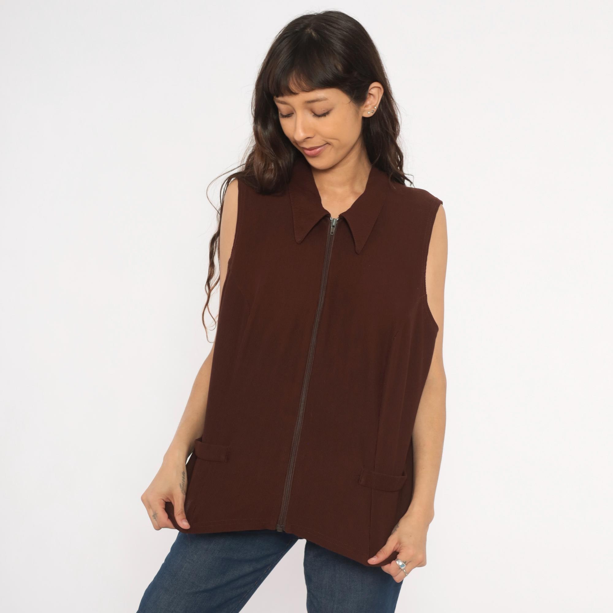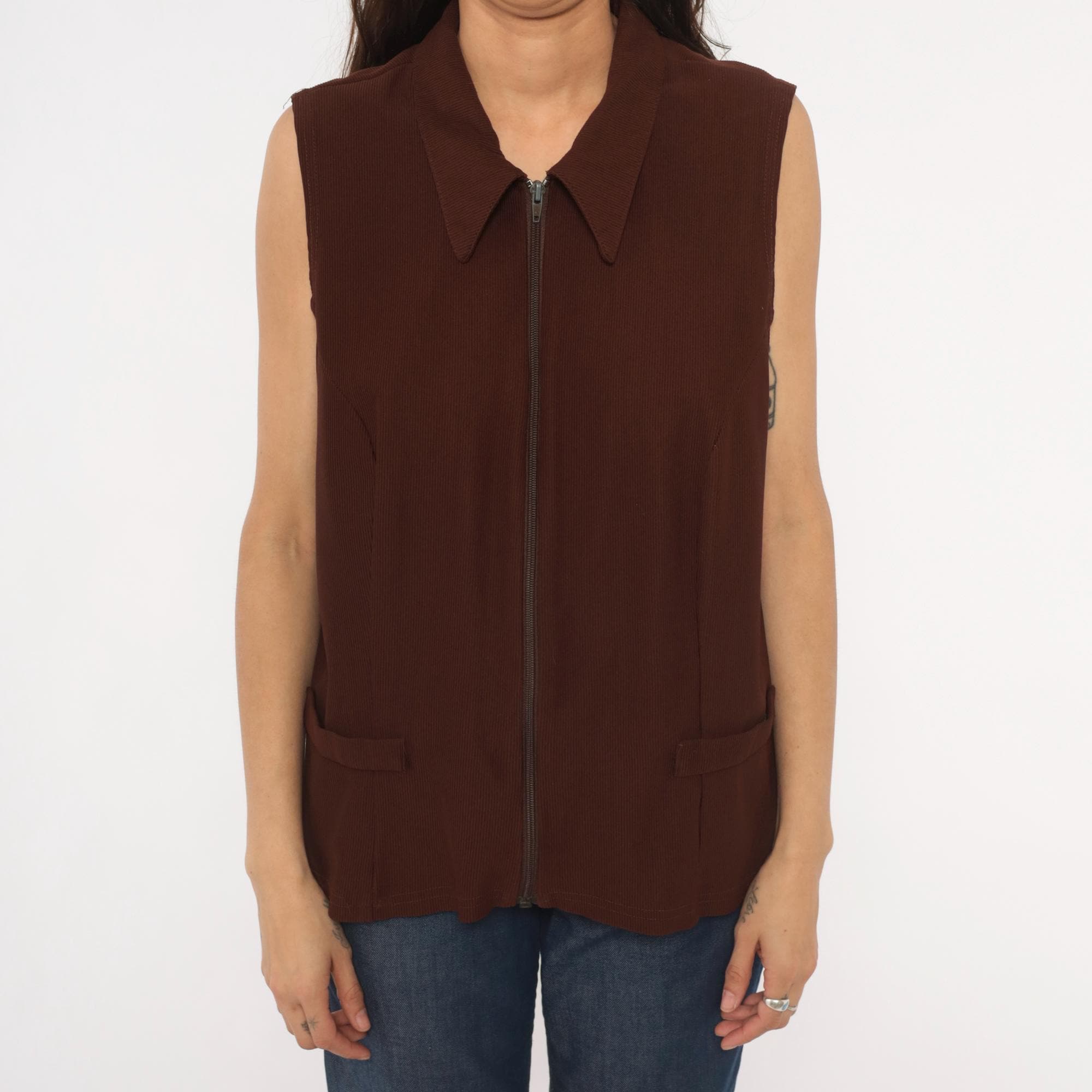 90s brown zip-front vest from New Woman with pointed spread collar and full-length zipper closure. Ribbed knit construction with seam detailing across the bodice and back, sleeveless cut with wide armholes. Two front flap pockets sit near the hip, and the silhouette is relaxed through the body with a straight hem.