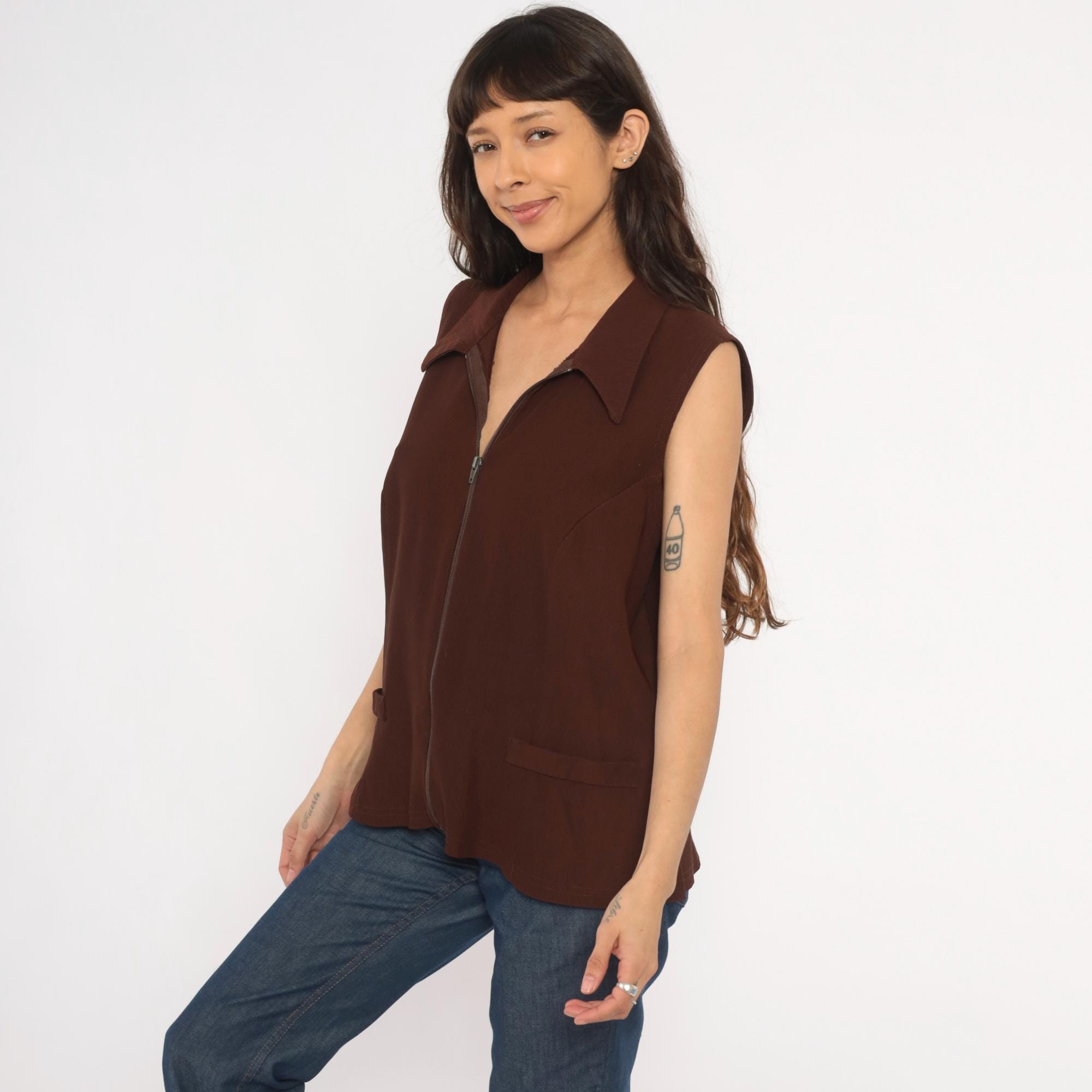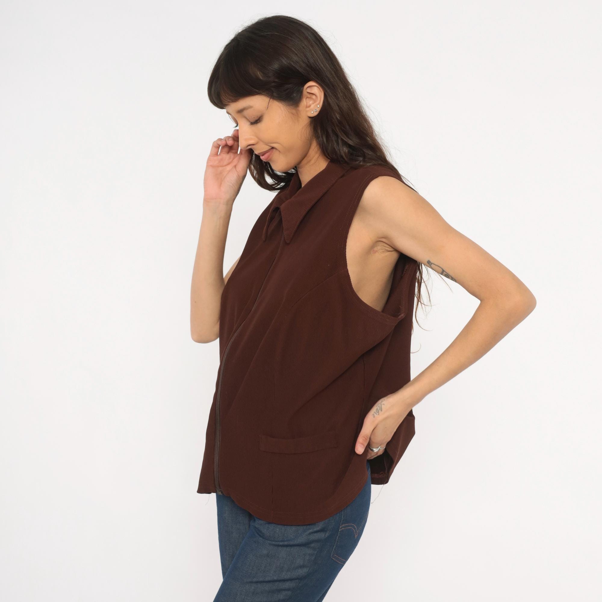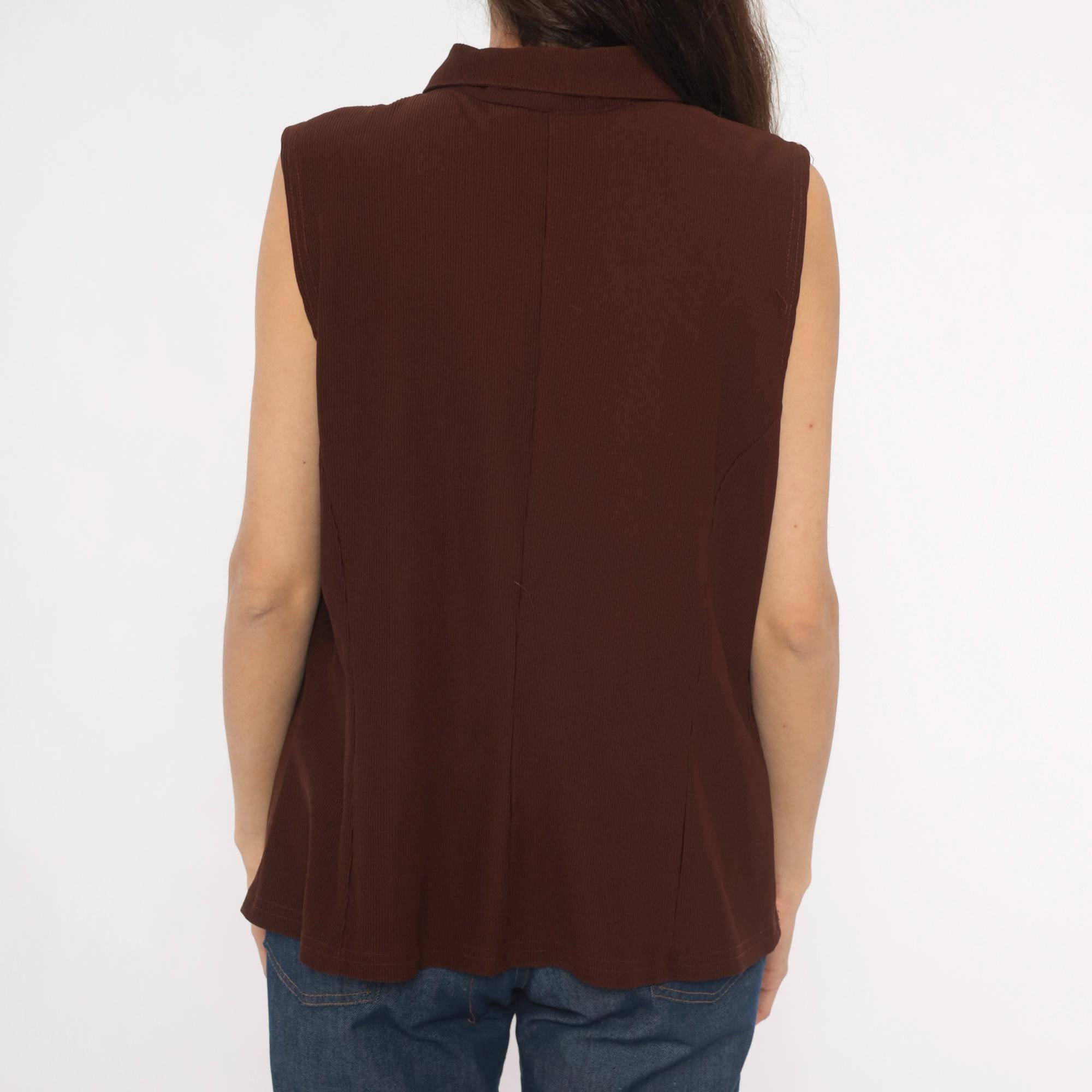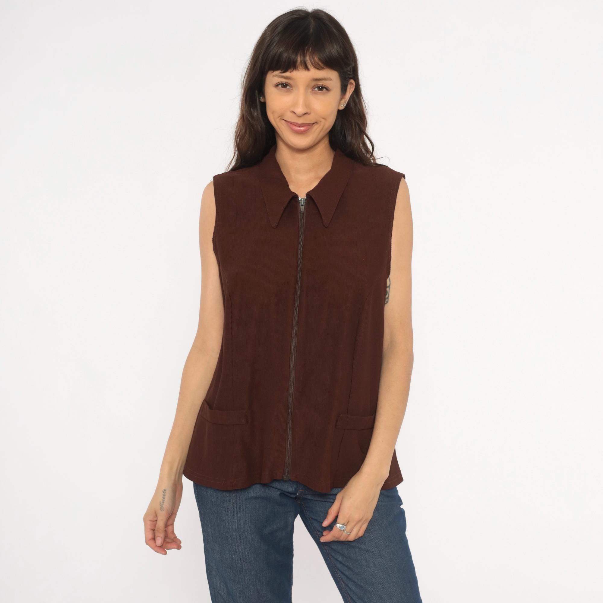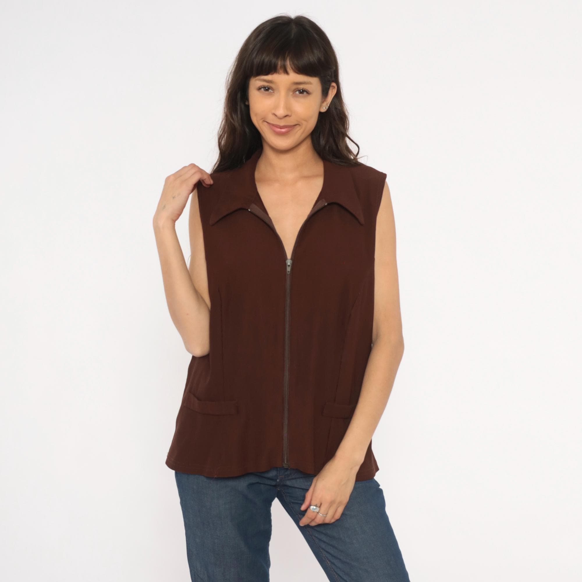 90s brown zip-front vest from New Woman with pointed spread collar and full-length zipper closure. Ribbed knit construction with seam detailing across the bodice and back, sleeveless cut with wide armholes. Two front flap pockets sit near the hip, and the silhouette is relaxed through the body with a straight hem.
