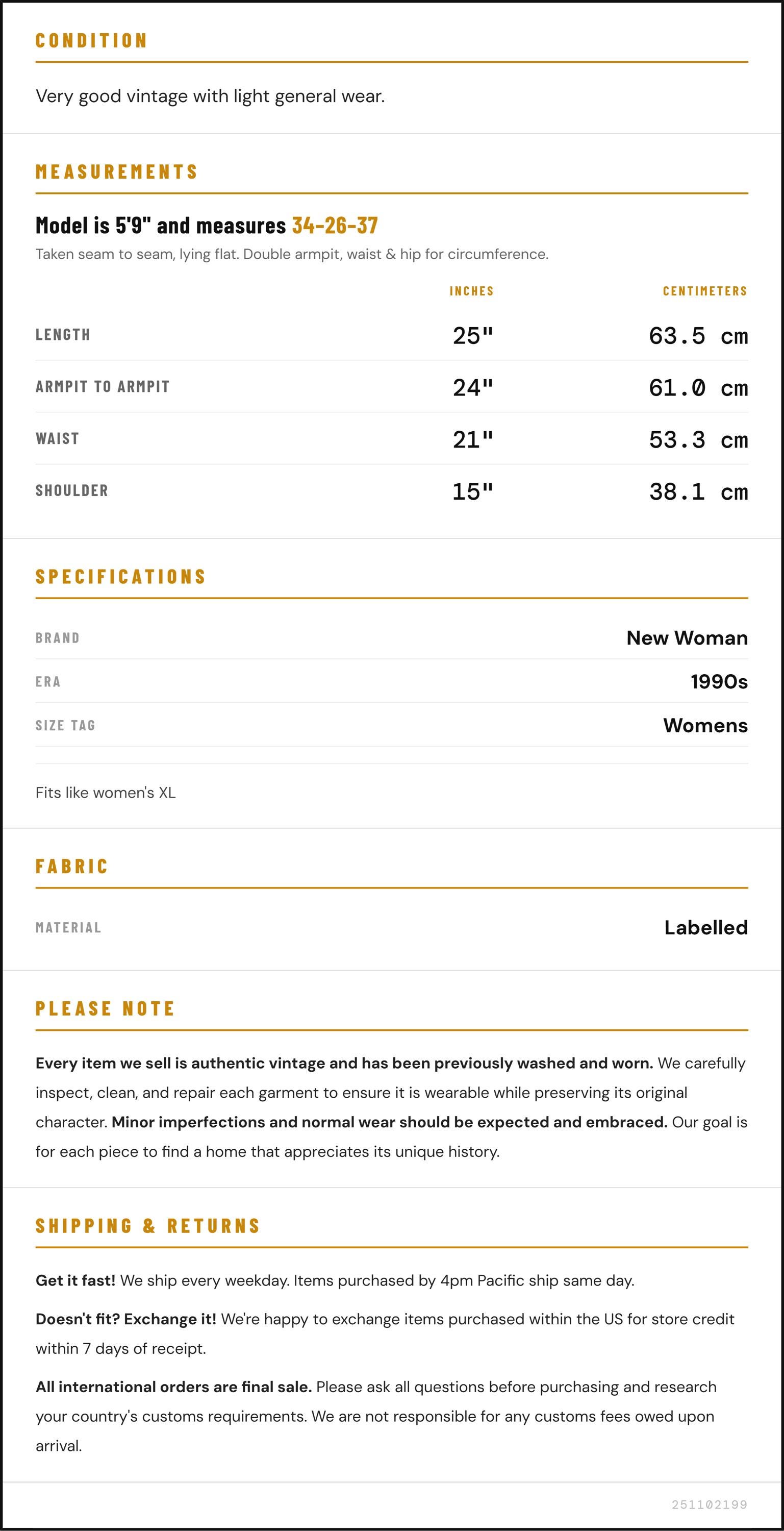 Vintage denim was usually made without any stretch, unlike modern jeans. Check the measurements to ensure proper fit, and remember to give yourself a little wiggle room in the waist and hips, depending on your preferred fit.