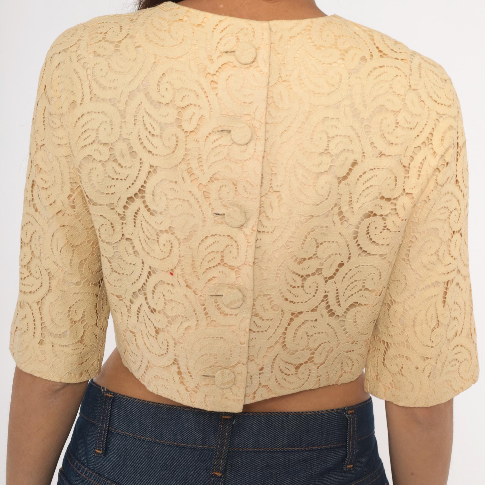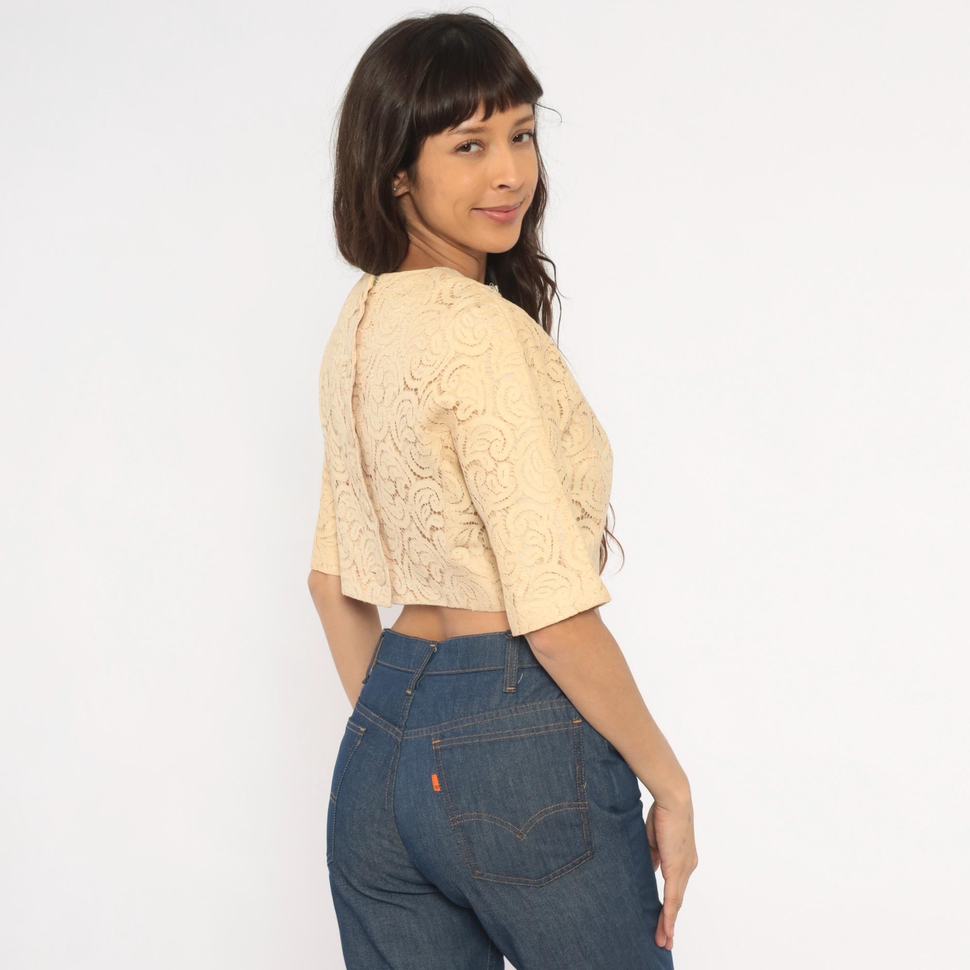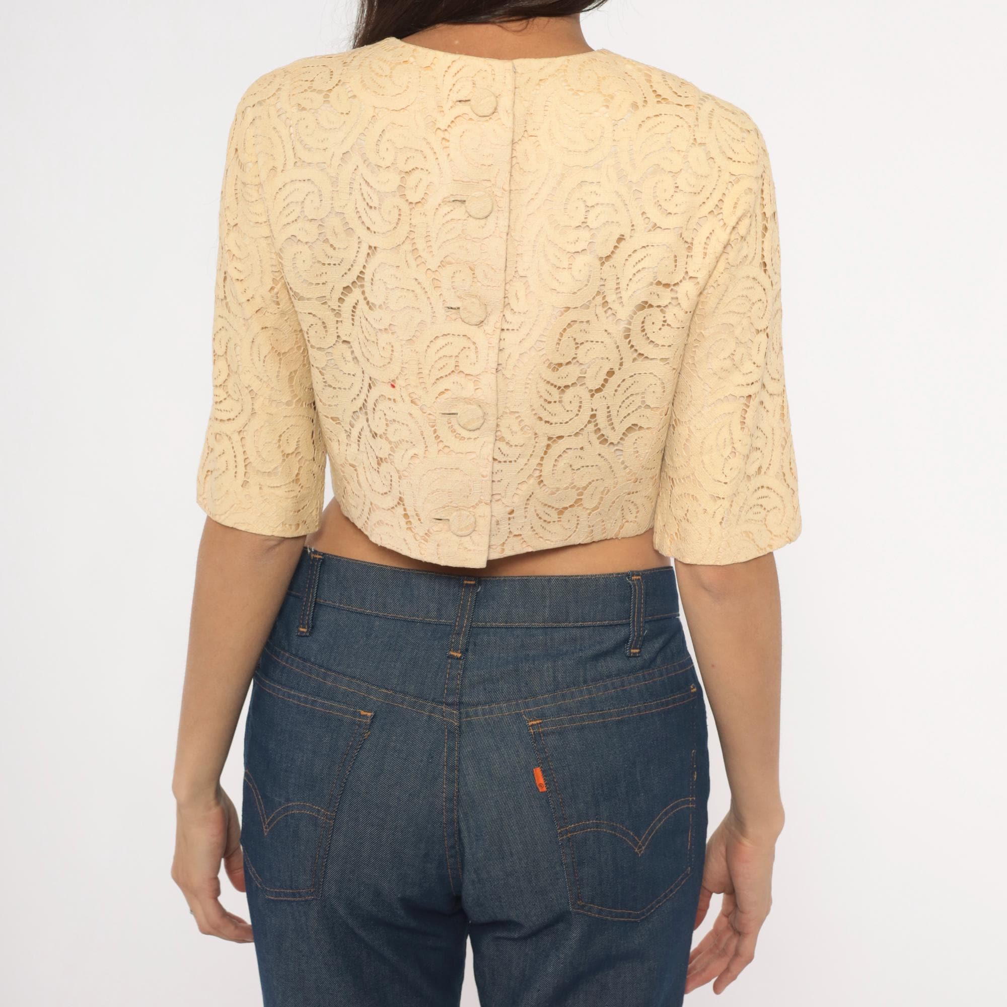 70s cream lace crop top from Carol Craig with an allover swirl and scroll openwork pattern. Round neckline, half-length sleeves, and a back closure with covered buttons and a snap. The lace overlay is semi-sheer with a tonal lining through the bodice.