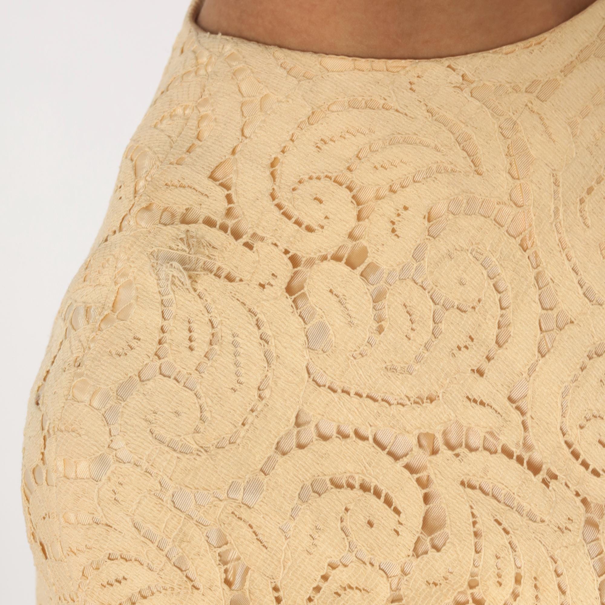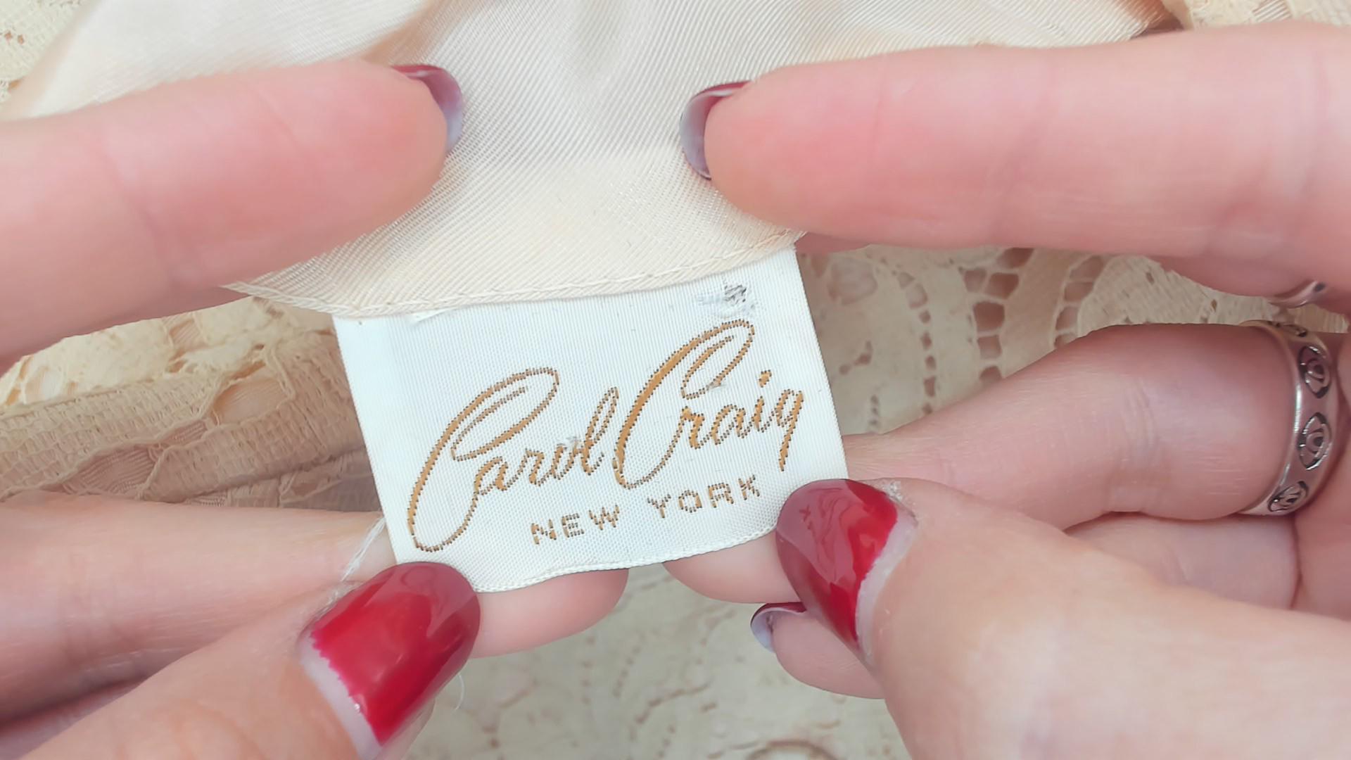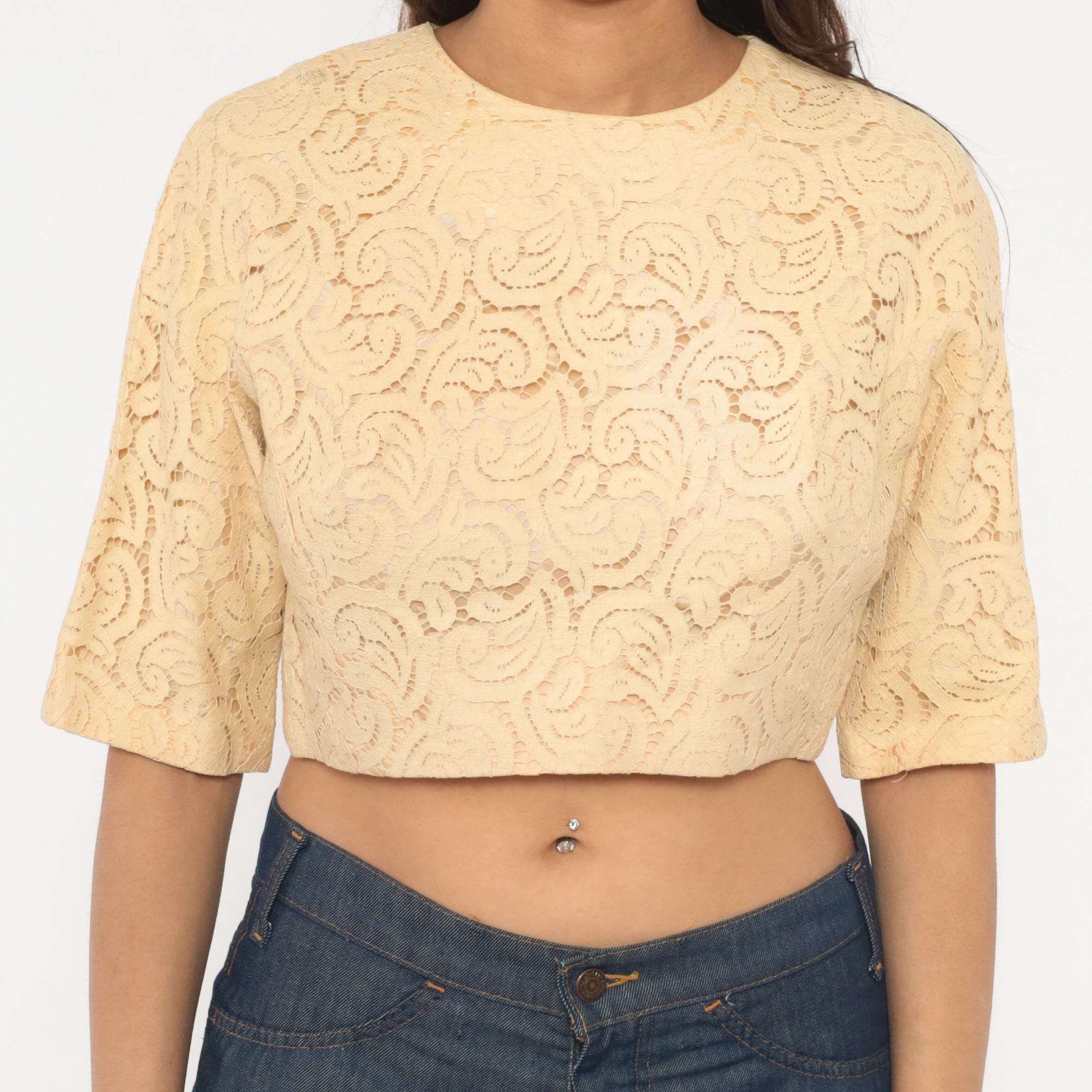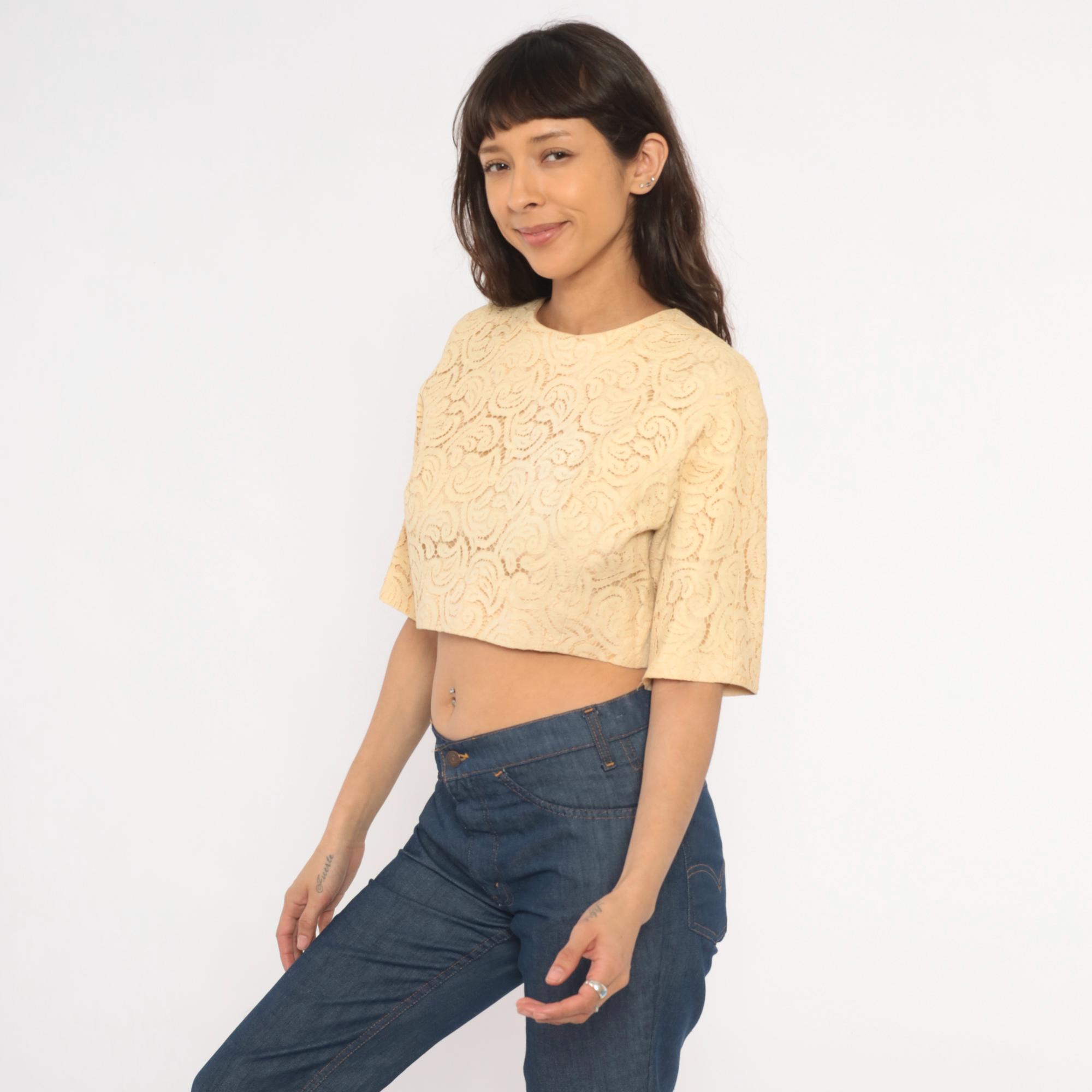 70s cream lace crop top from Carol Craig with an allover swirl and scroll openwork pattern. Round neckline, half-length sleeves, and a back closure with covered buttons and a snap. The lace overlay is semi-sheer with a tonal lining through the bodice.