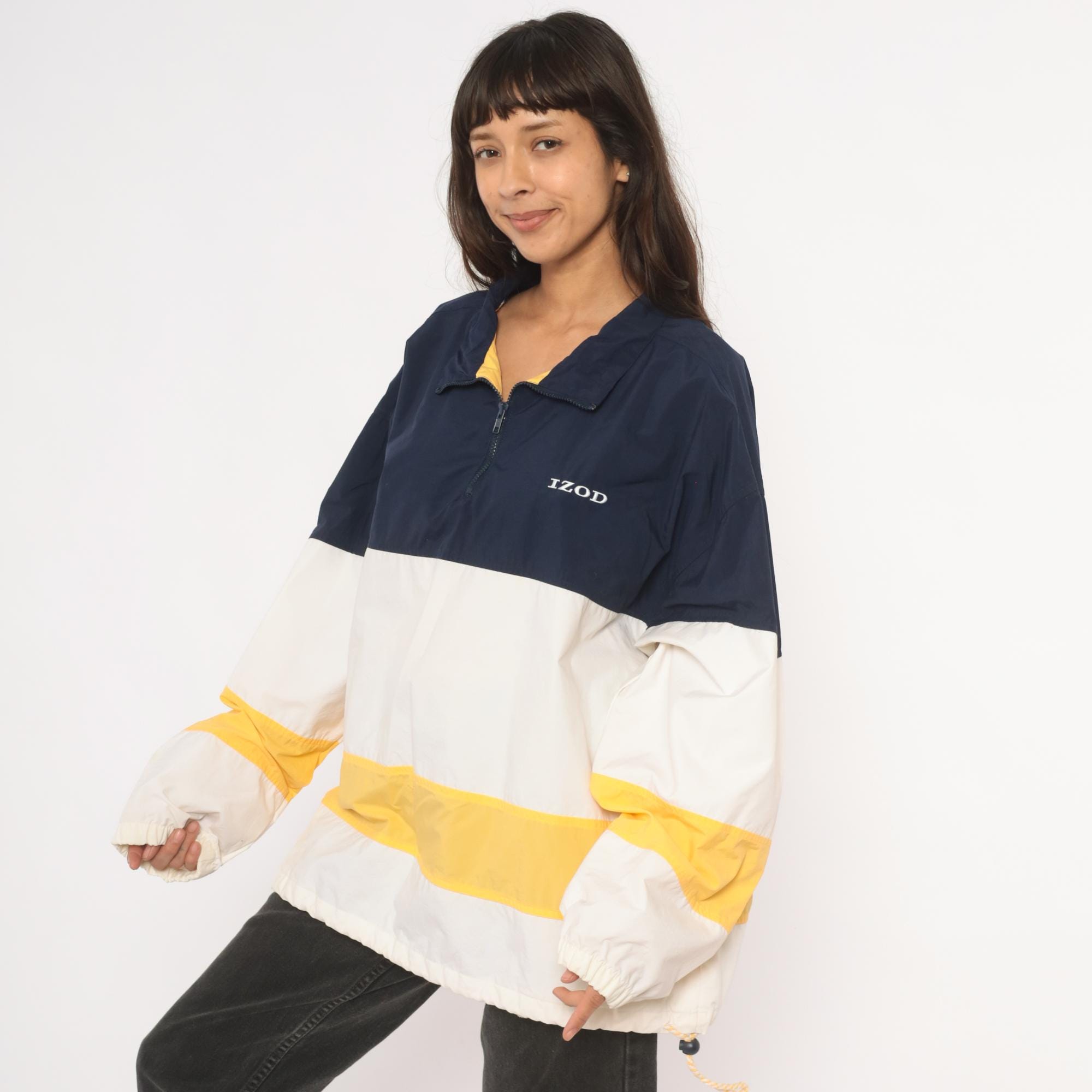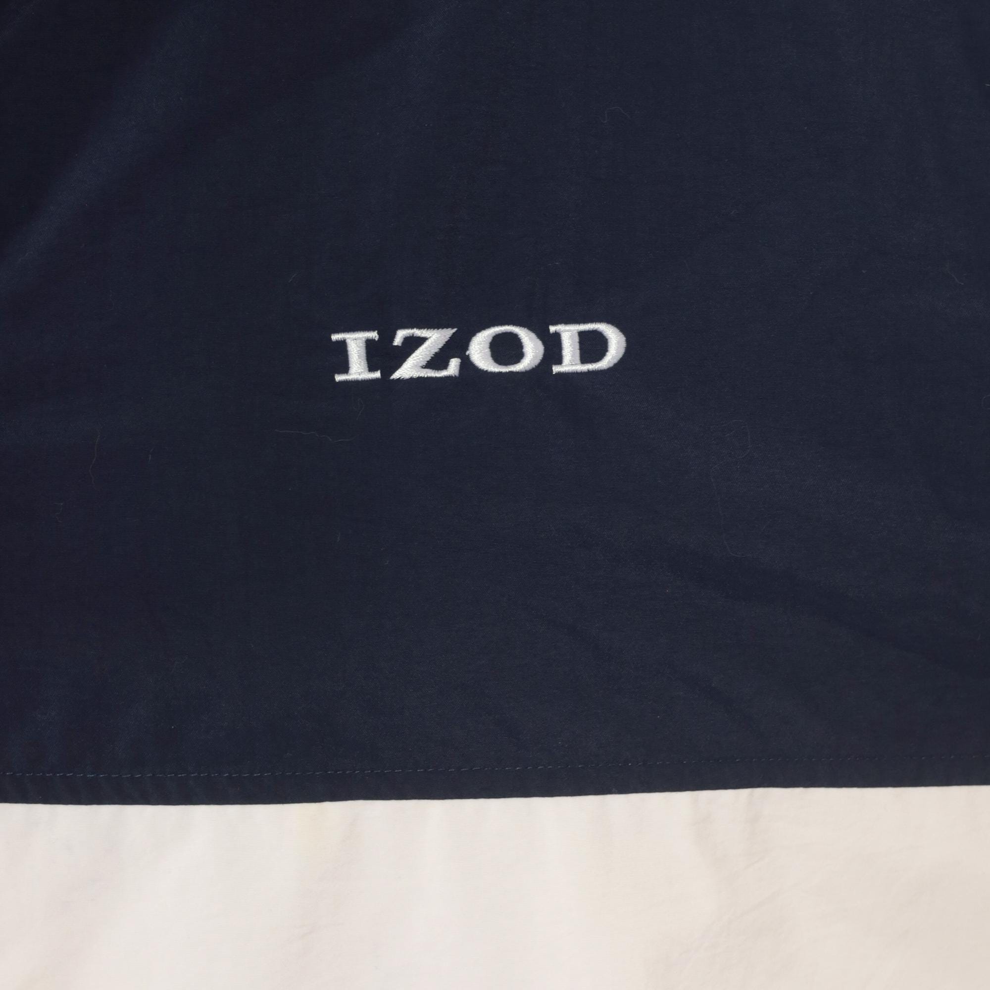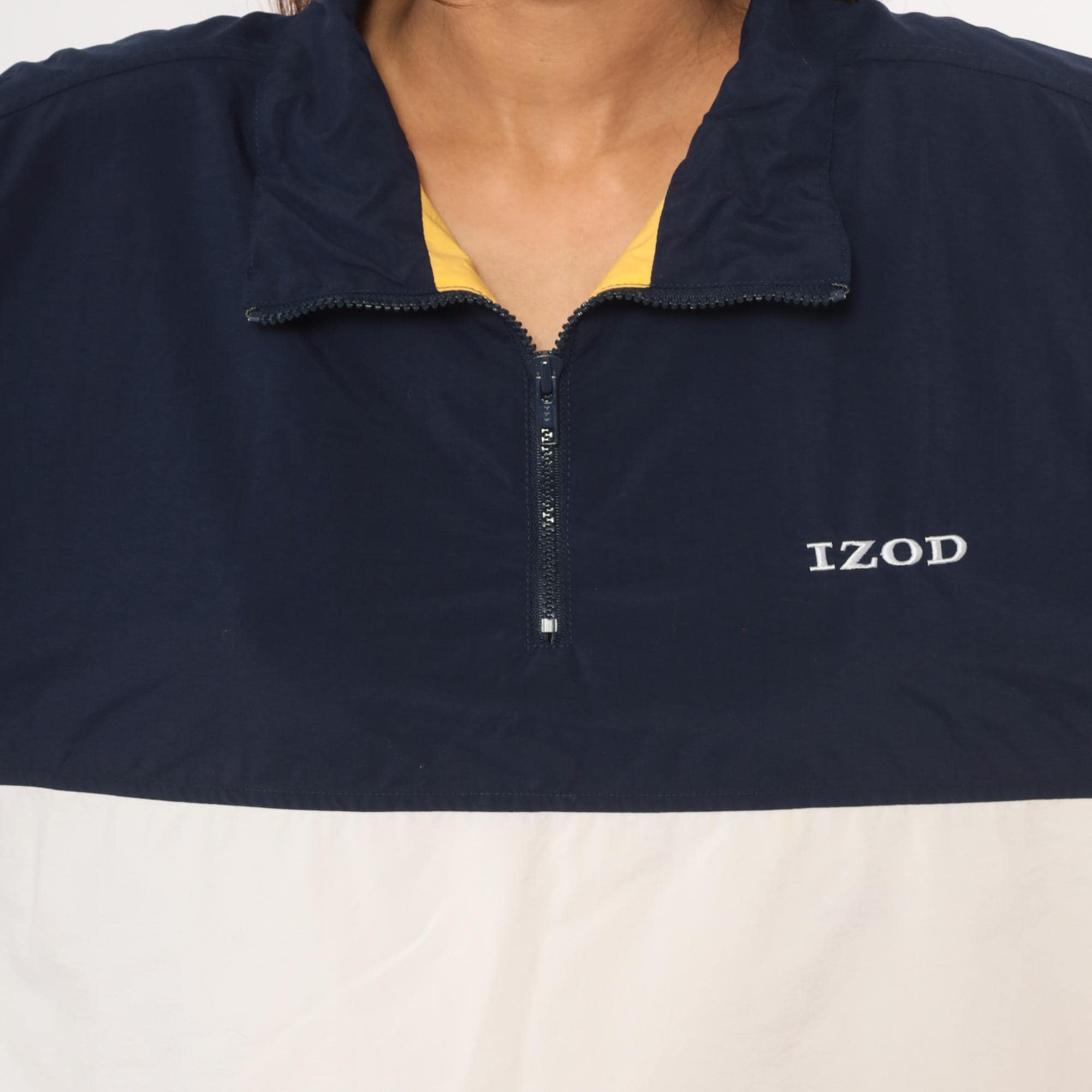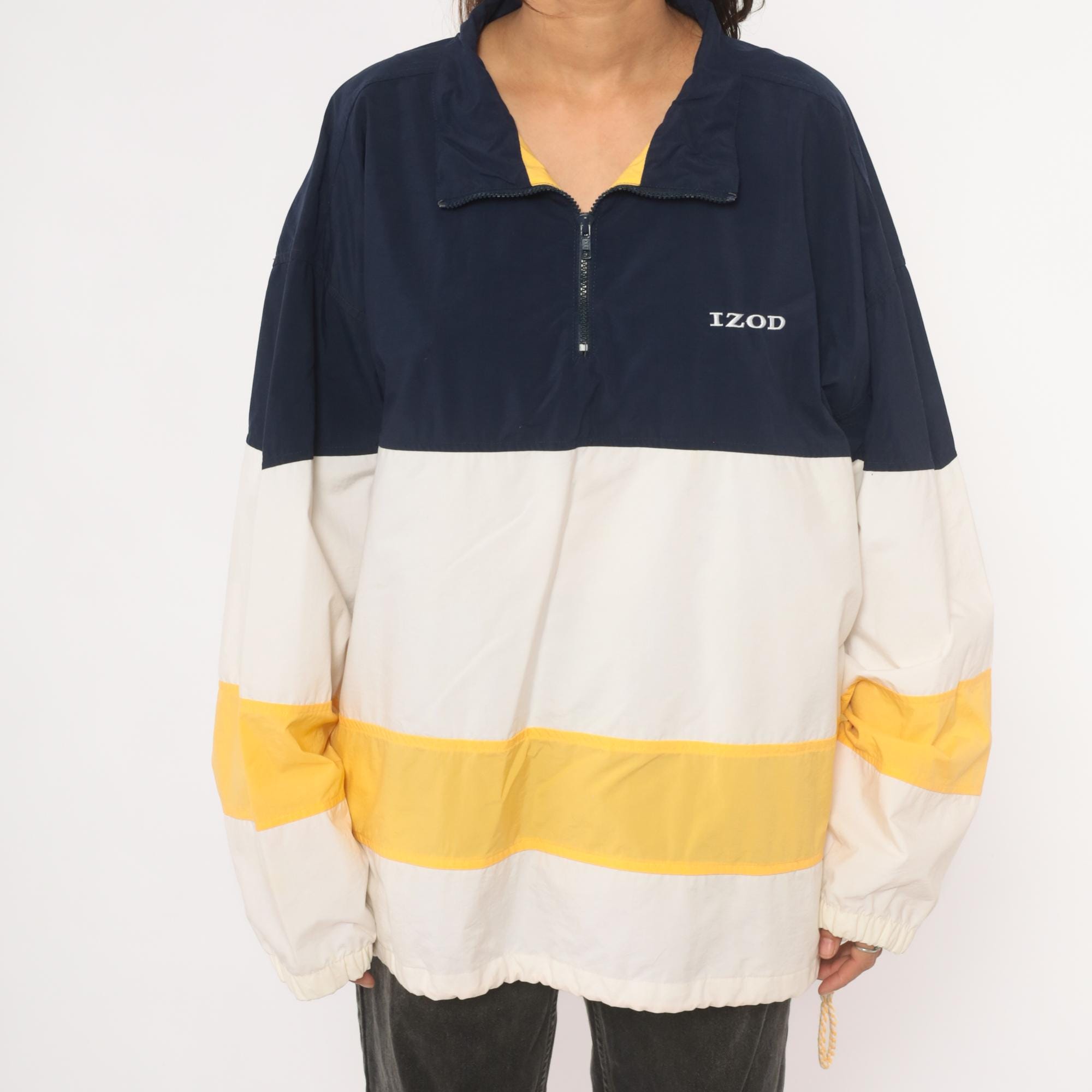 90s half-zip pullover windbreaker from Izod with navy, white, and gold color block striping. Fold-down collar with yellow inner lining visible at the neckline, front zip closure, and side seam pockets. Elastic cuffs at the wrists and a drawstring rope hem at the bottom. Embroidered "IZOD" logo on the left chest in white.