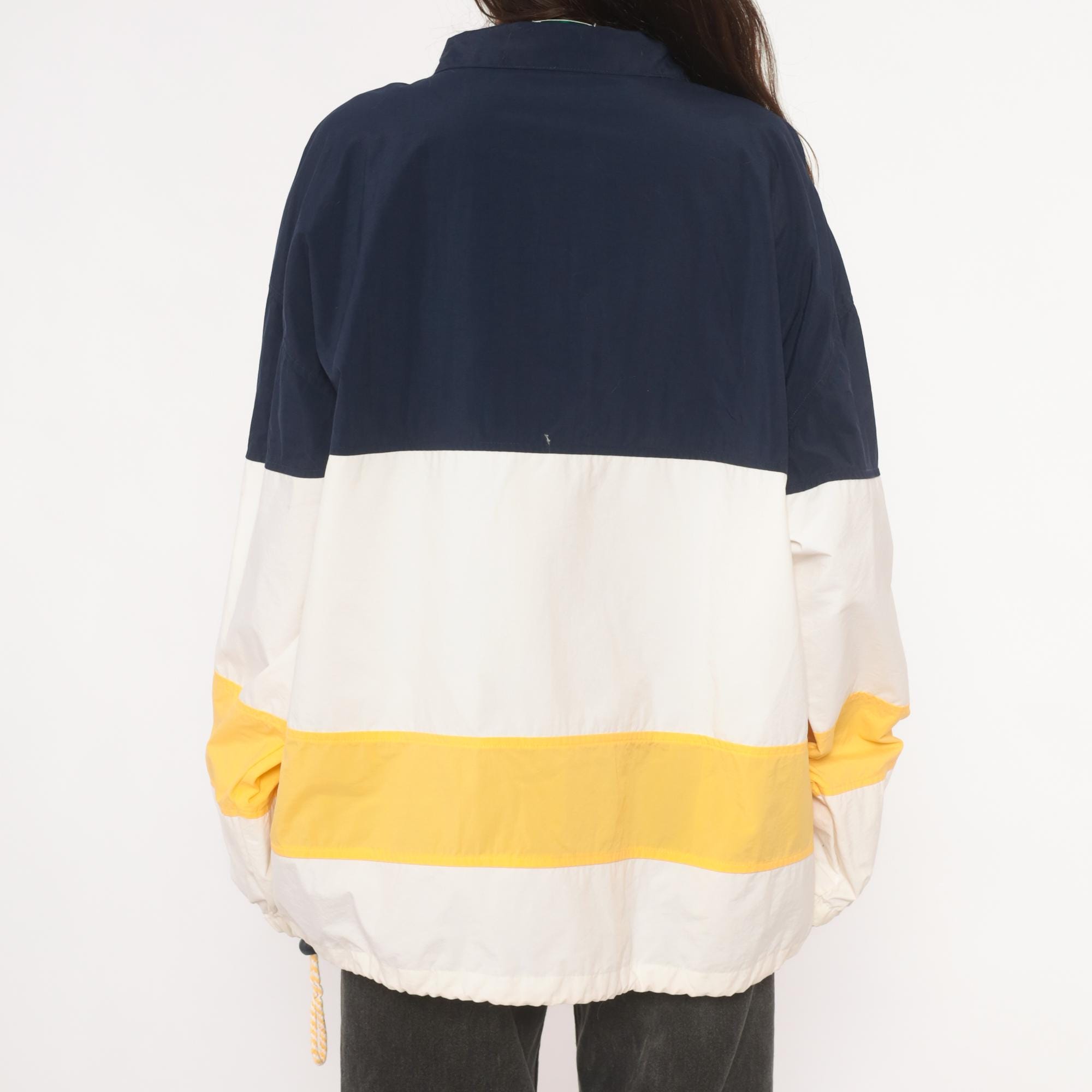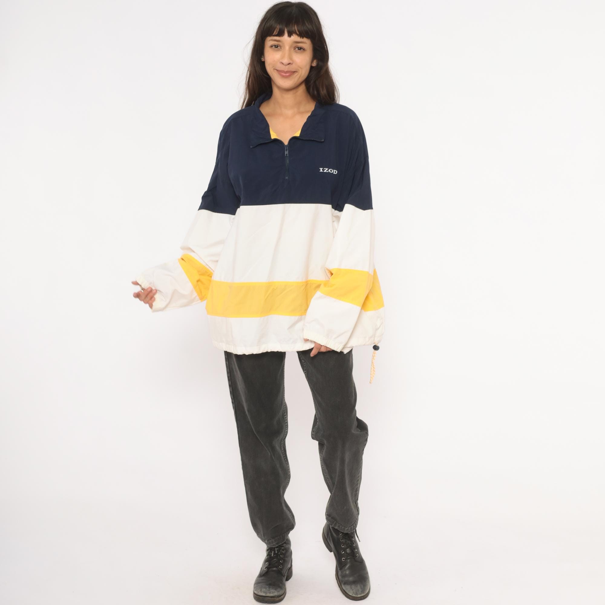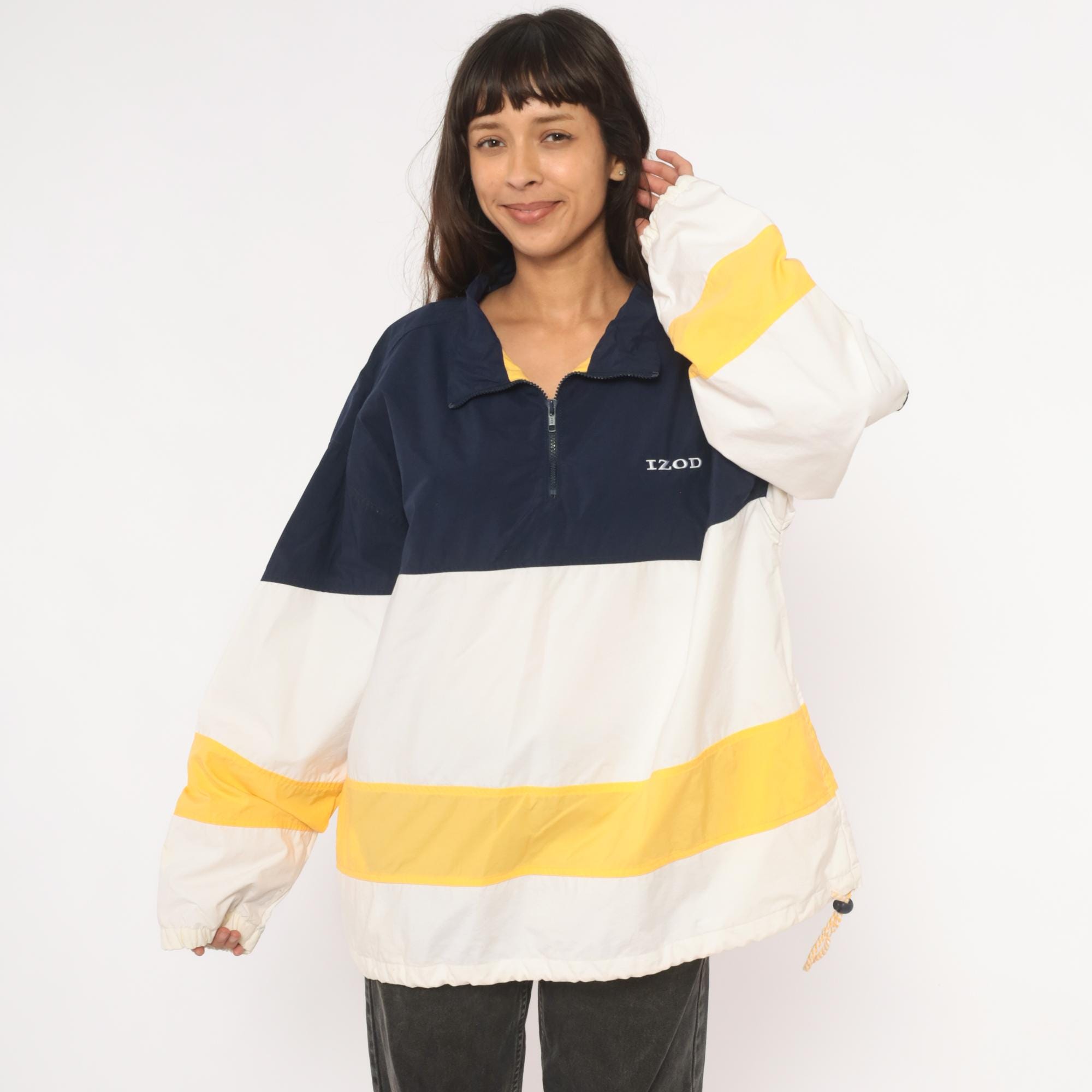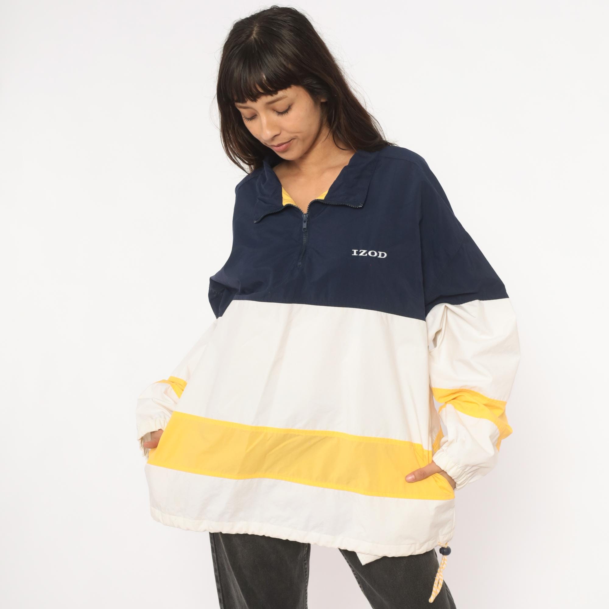 90s half-zip pullover windbreaker from Izod with navy, white, and gold color block striping. Fold-down collar with yellow inner lining visible at the neckline, front zip closure, and side seam pockets. Elastic cuffs at the wrists and a drawstring rope hem at the bottom. Embroidered "IZOD" logo on the left chest in white.