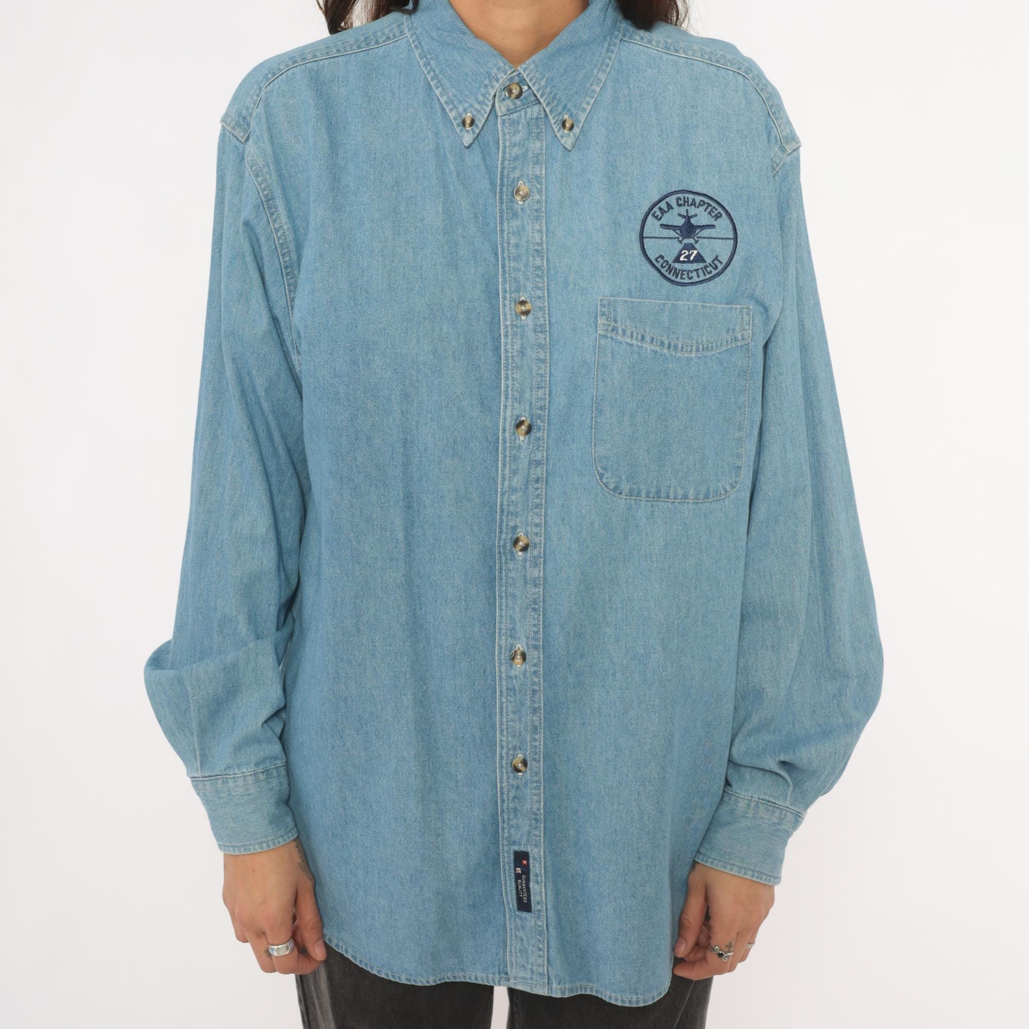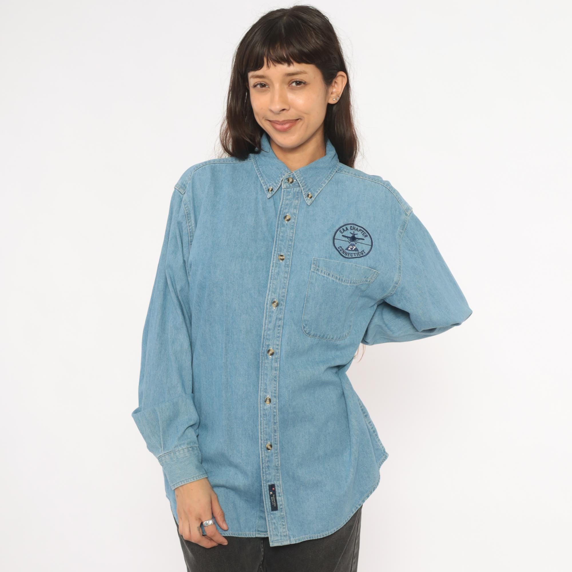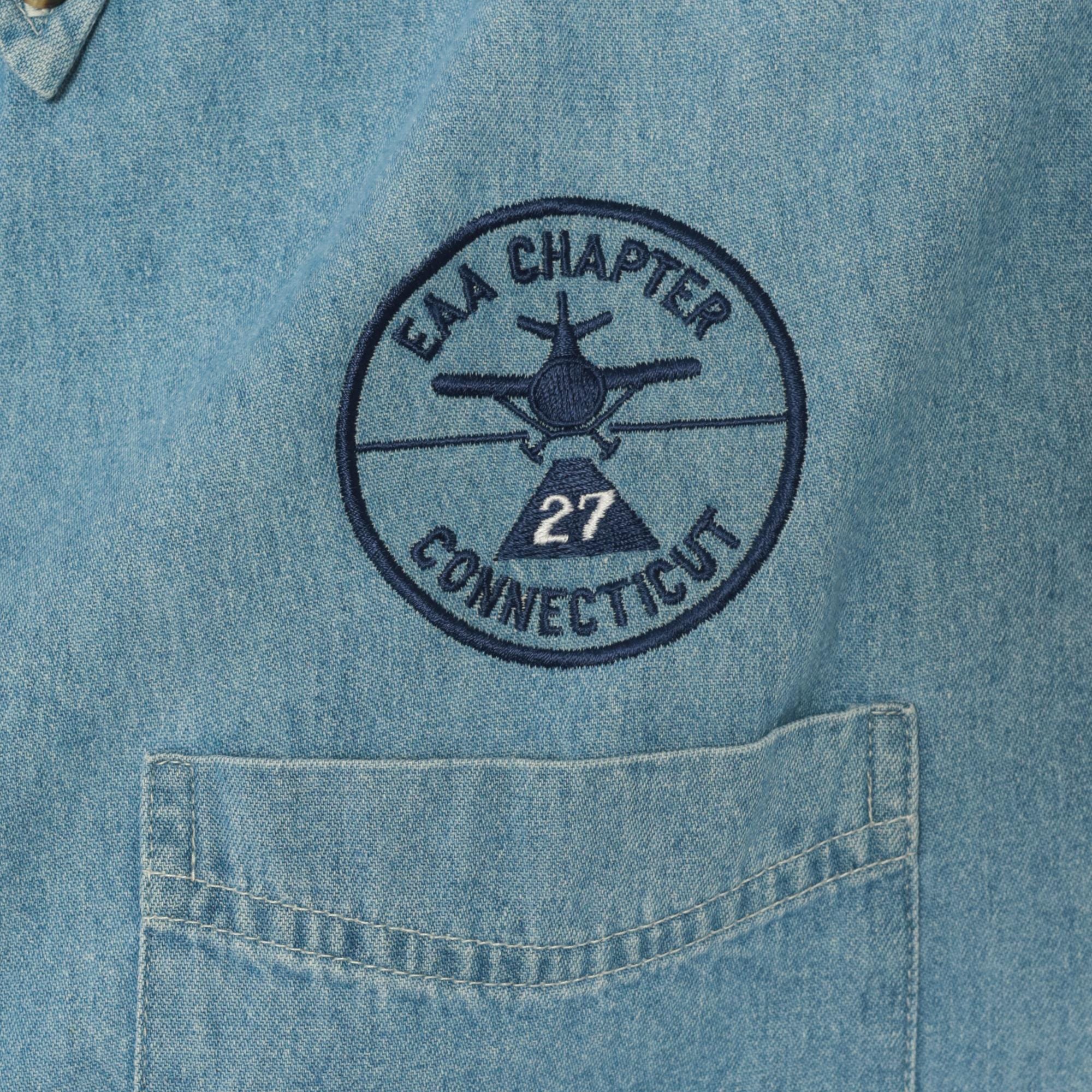 Light wash denim button-down shirt from Port and Company with an embroidered circular "EAA Chapter 27 Connecticut" aviation patch above the left chest pocket. Button-down collar, single front patch pocket, and full button front closure with brass-tone buttons. Long sleeves with single-button cuffs and a curved hem.