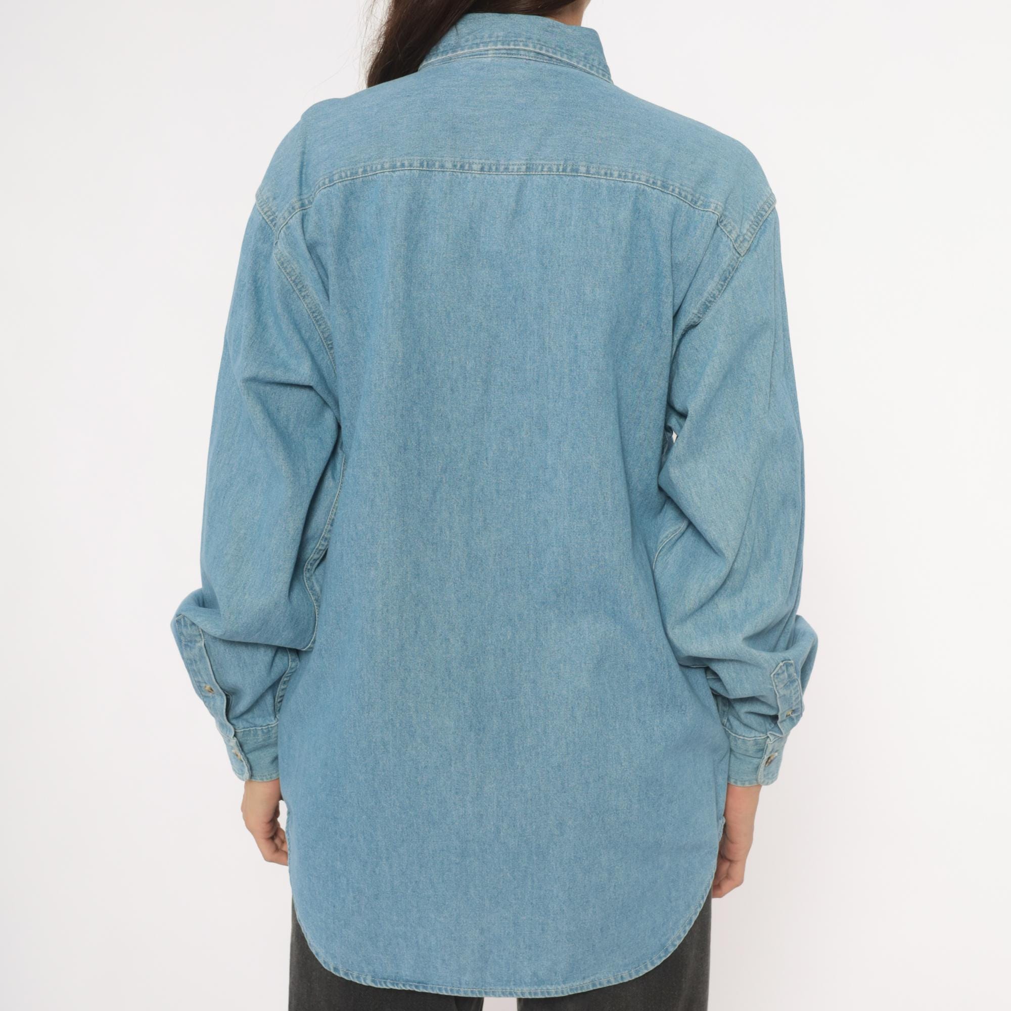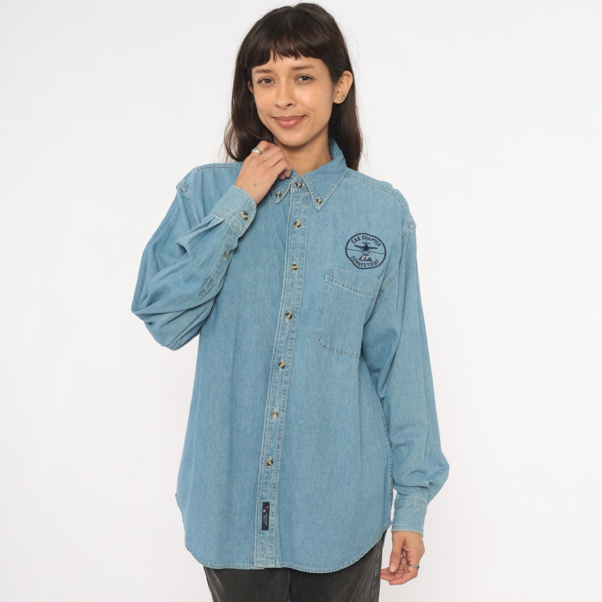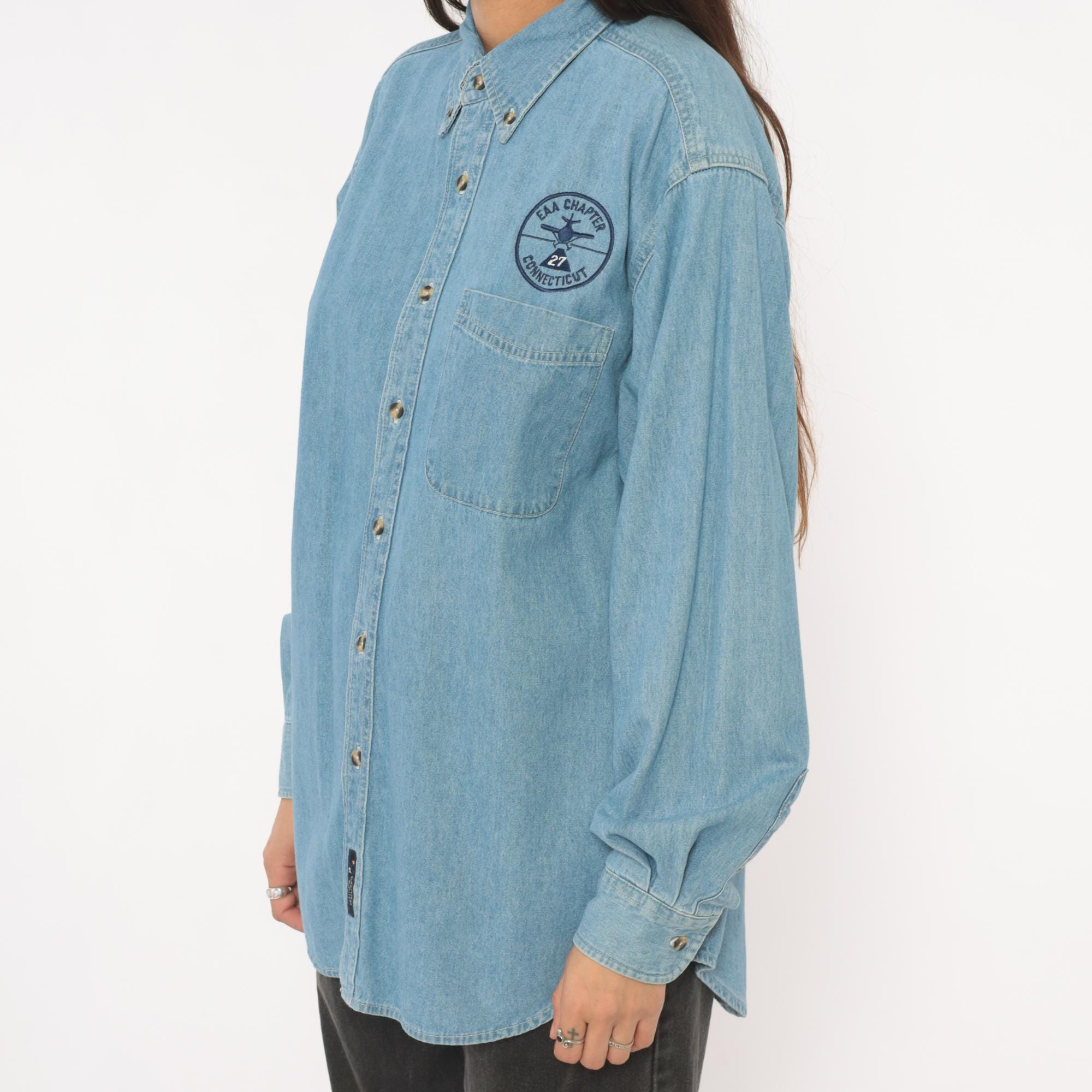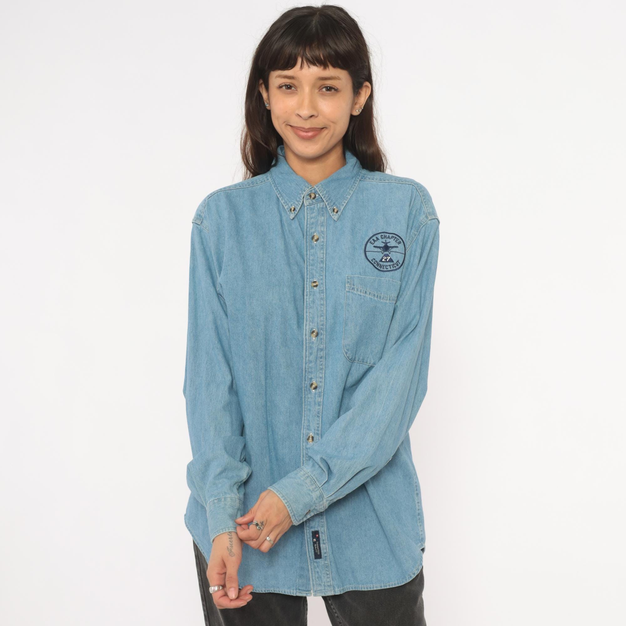 Light wash denim button-down shirt from Port and Company with an embroidered circular "EAA Chapter 27 Connecticut" aviation patch above the left chest pocket. Button-down collar, single front patch pocket, and full button front closure with brass-tone buttons. Long sleeves with single-button cuffs and a curved hem.