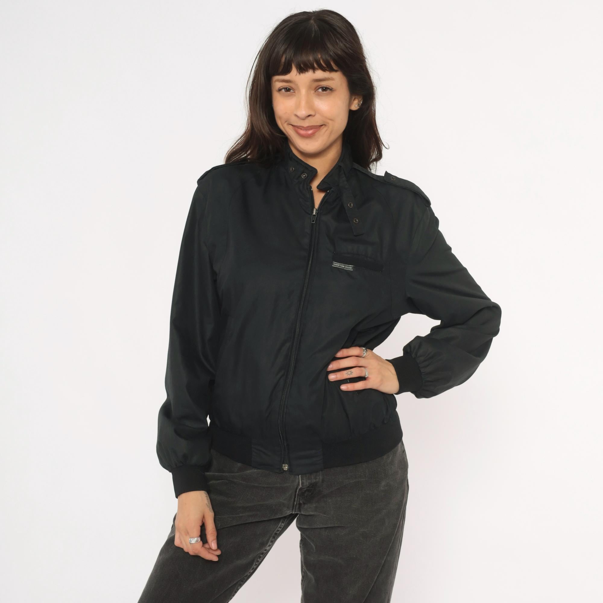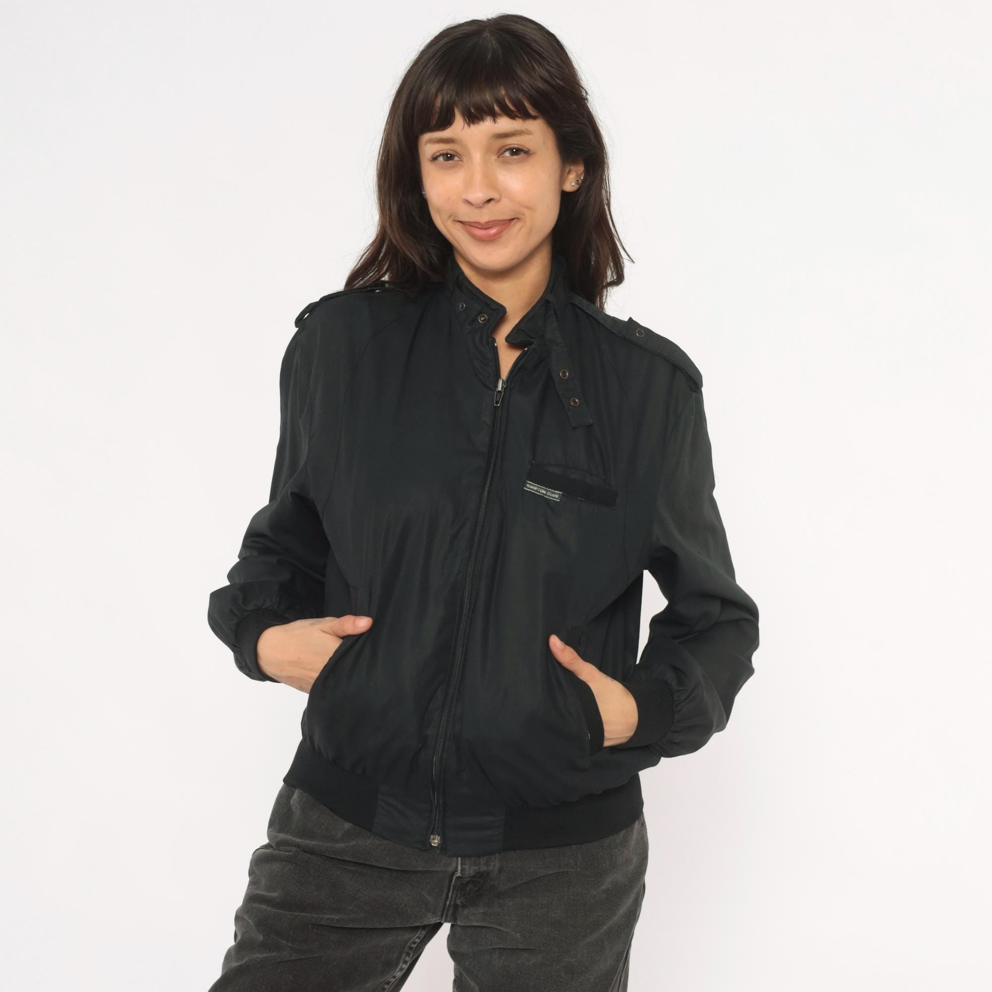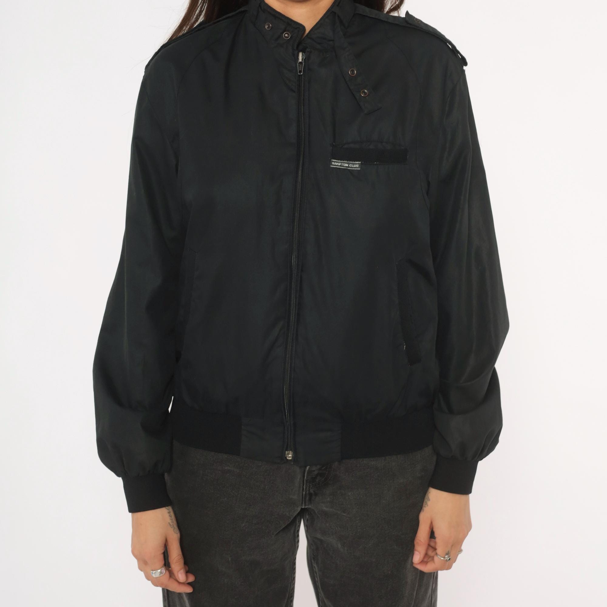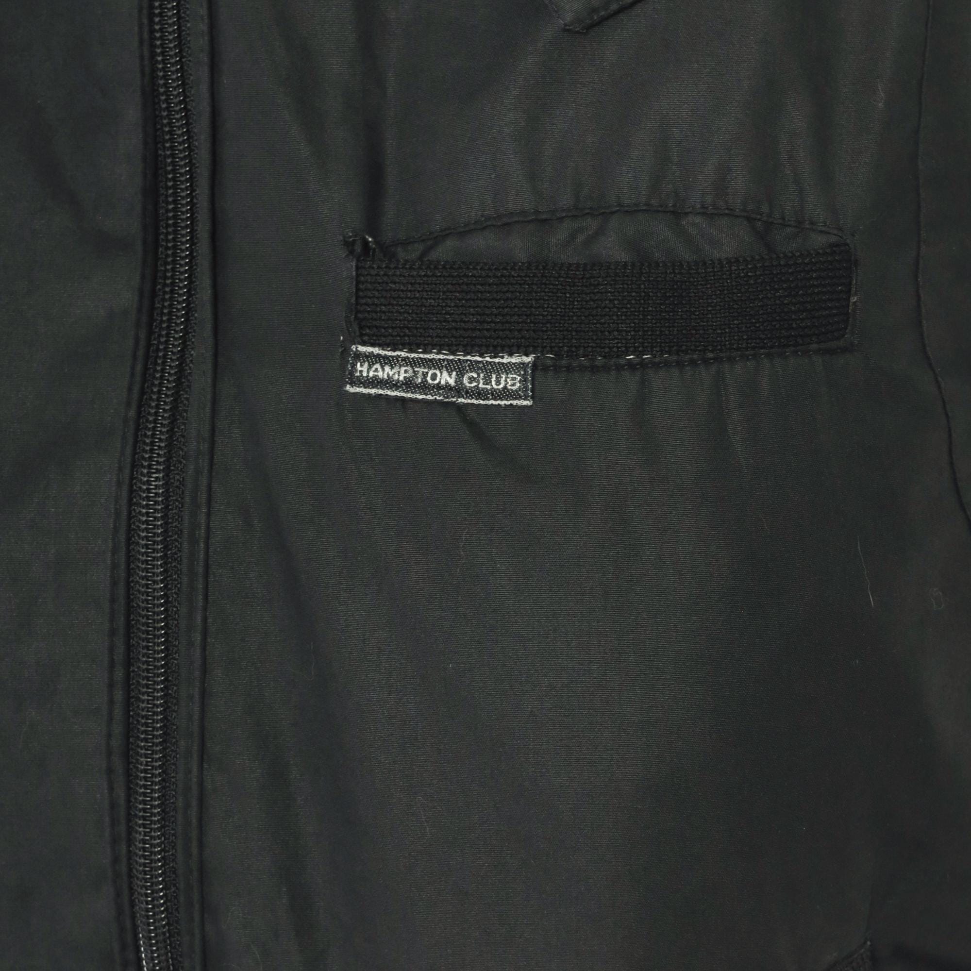80s black bomber jacket from Hampton Country Club with front zipper closure and snap-button stand collar. Epaulette tabs on both shoulders, zippered side seam pockets, and a small brand label on the left chest pocket flap. Ribbed knit cuffs and waistband, nylon-lined interior.