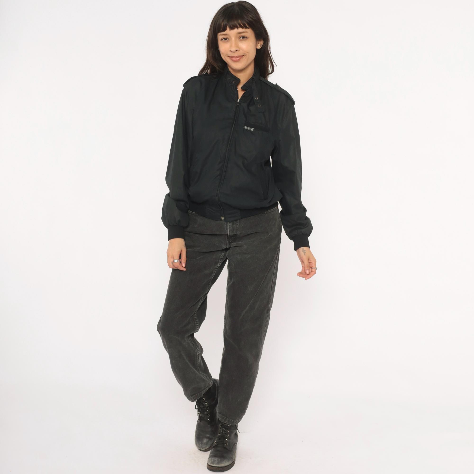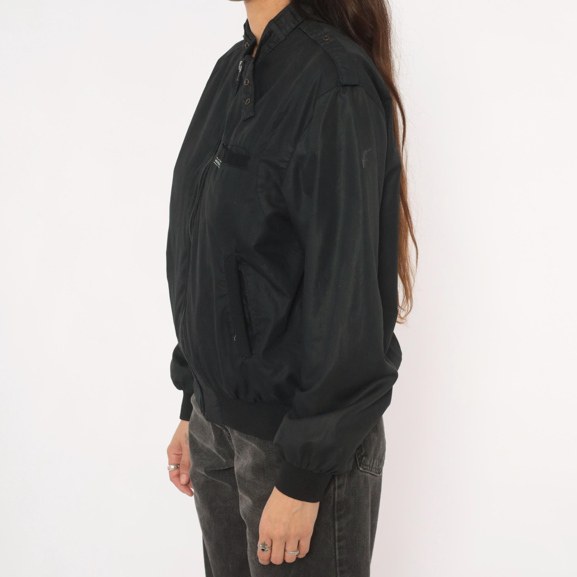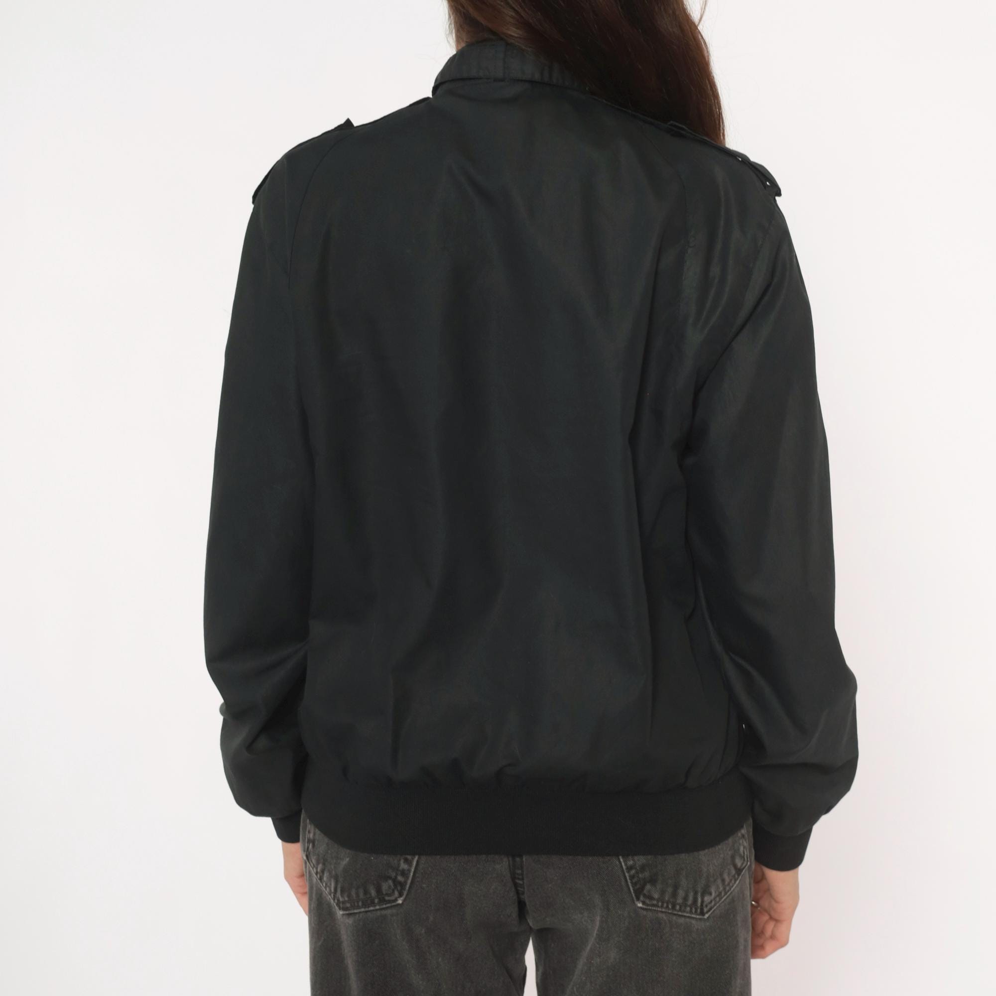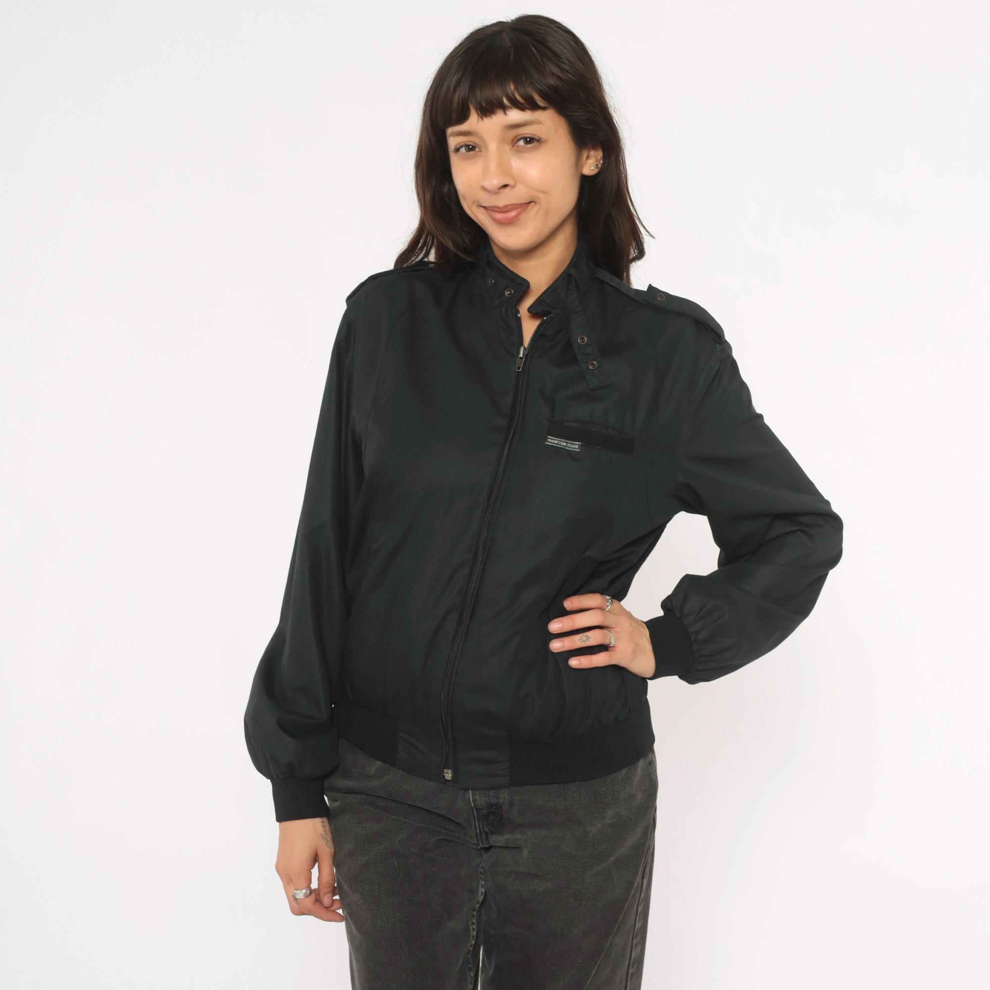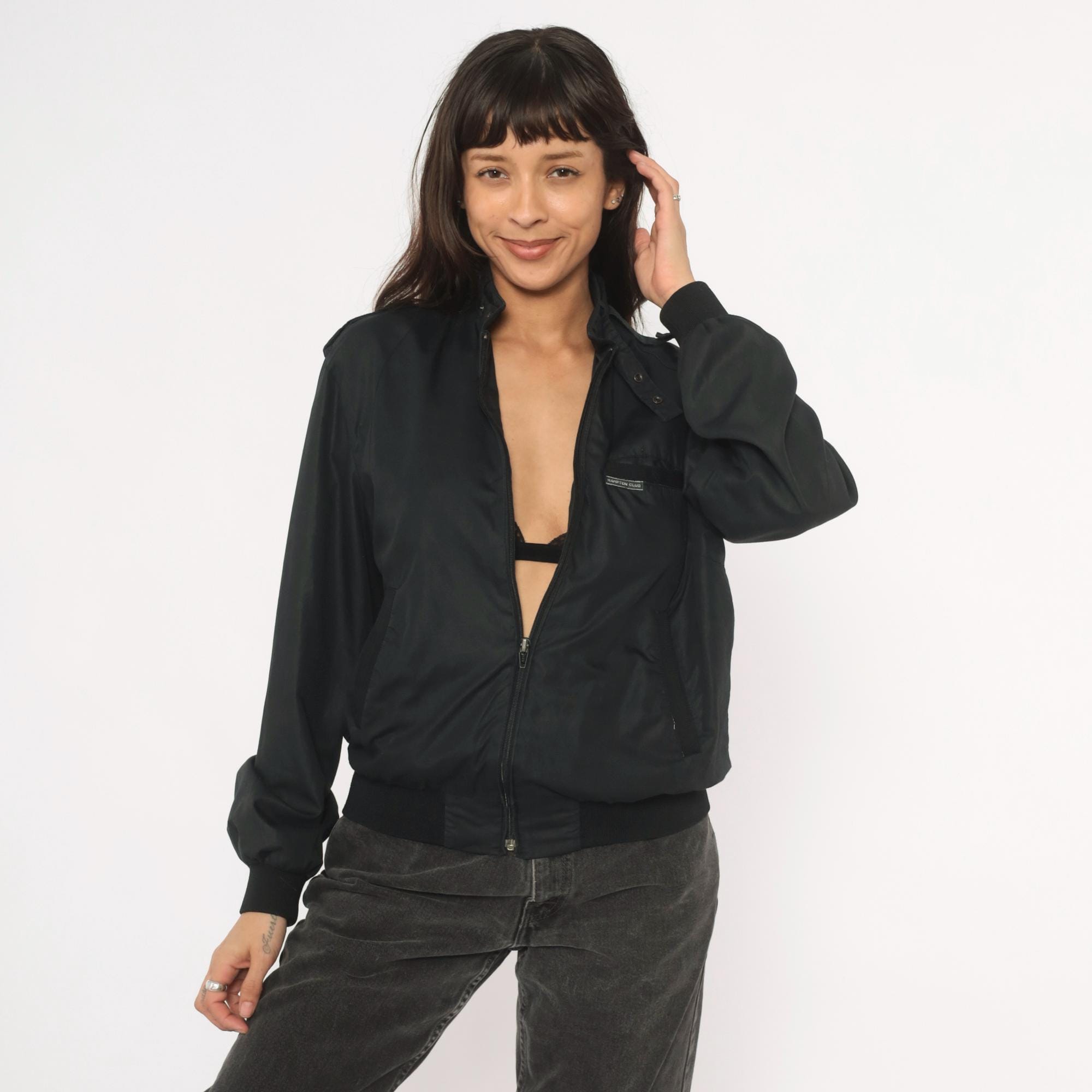 80s black bomber jacket from Hampton Country Club with front zipper closure and snap-button stand collar. Epaulette tabs on both shoulders, zippered side seam pockets, and a small brand label on the left chest pocket flap. Ribbed knit cuffs and waistband, nylon-lined interior.