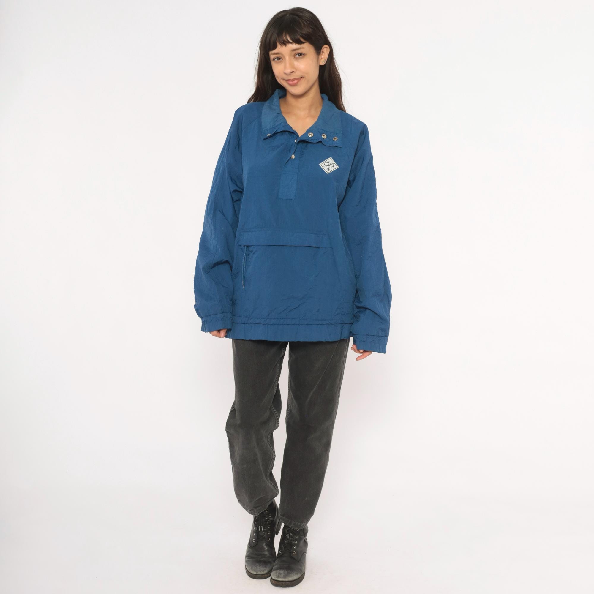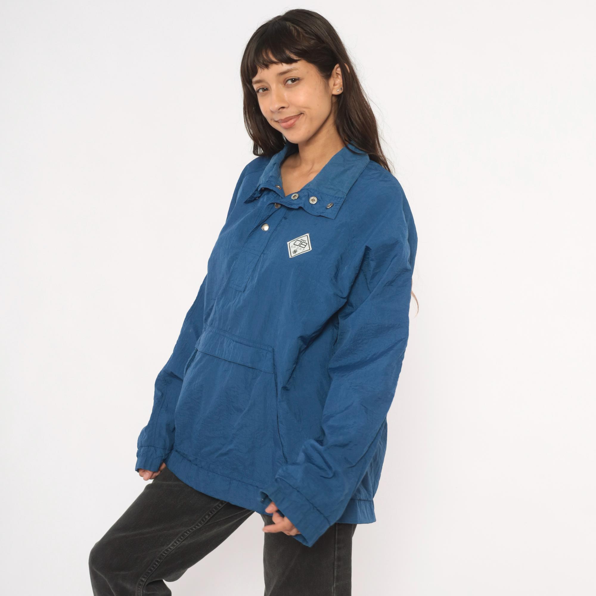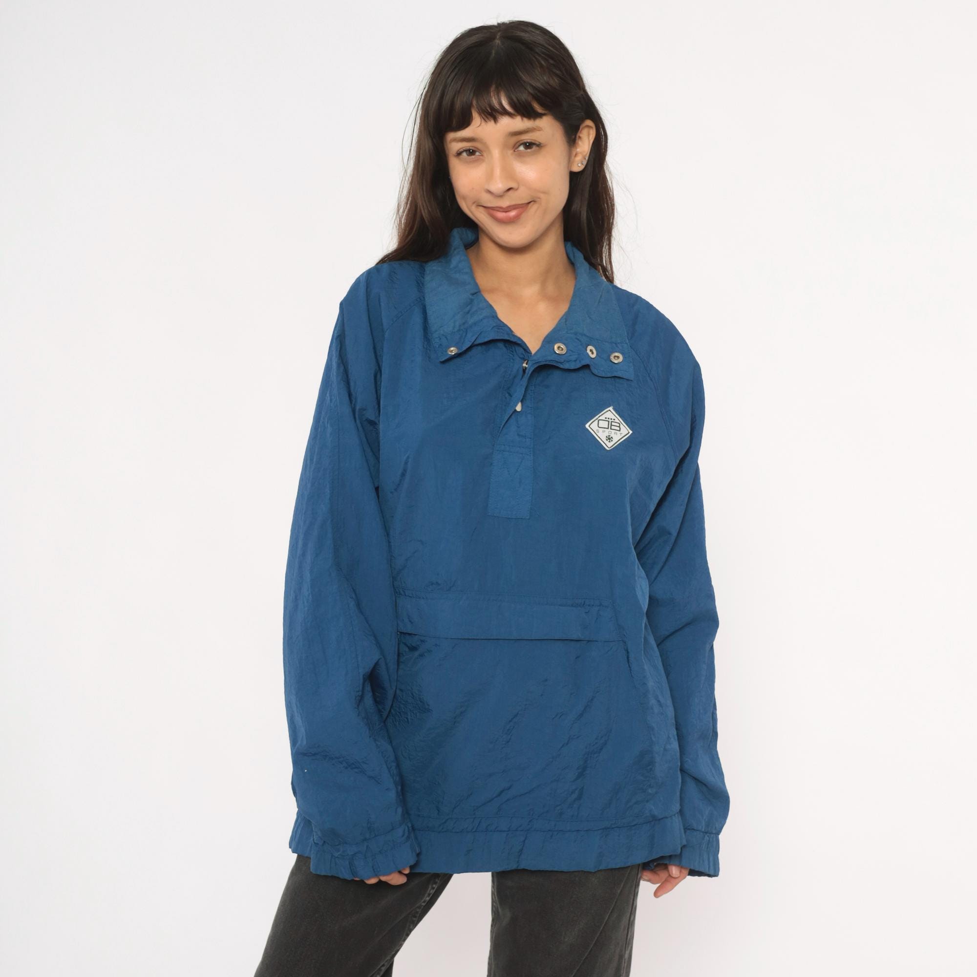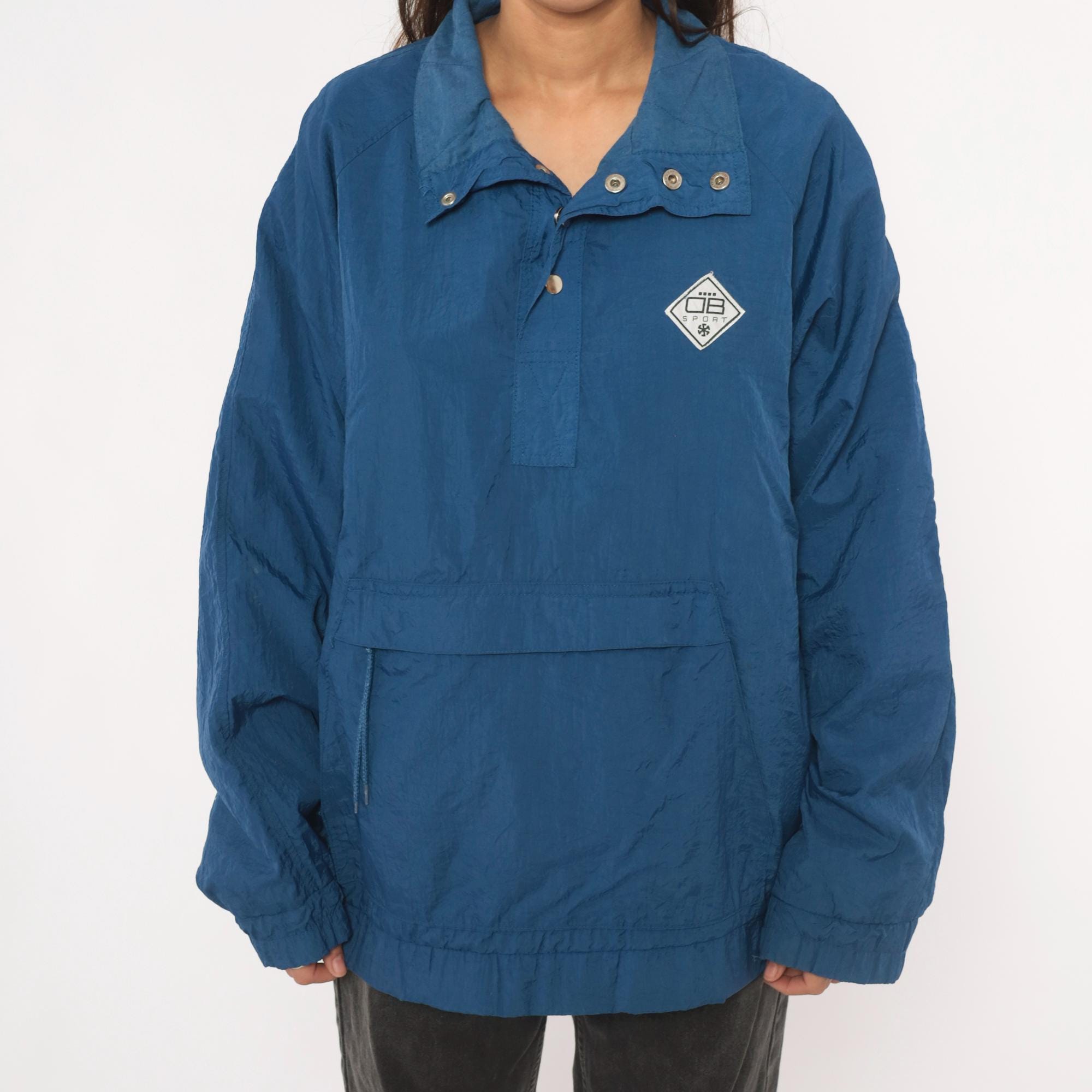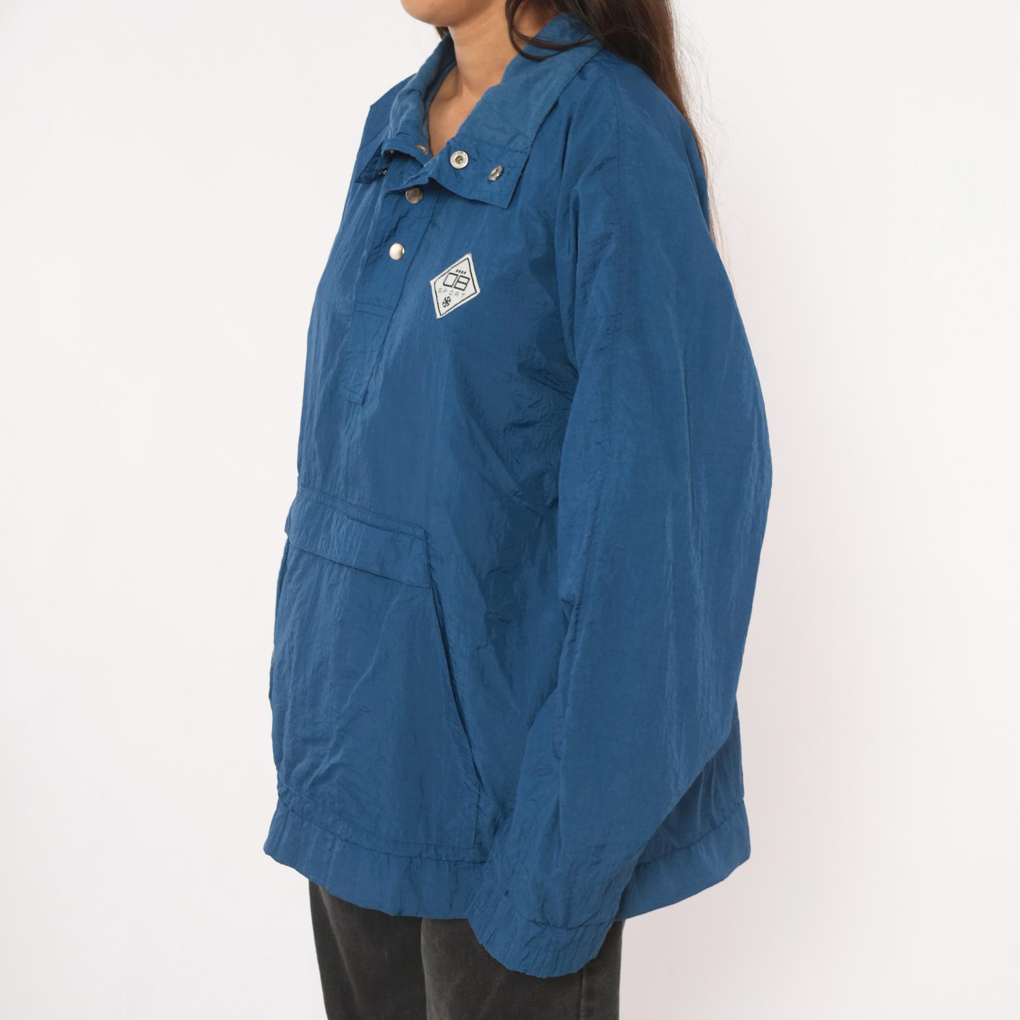 90s blue nylon anorak pullover from Drummer Boy Collection with snap button collar closure and partial zip front. Kangaroo pocket across the front, elasticized cuffs and hem. Solid cobalt blue shell with a diamond-shaped logo patch on the left chest.