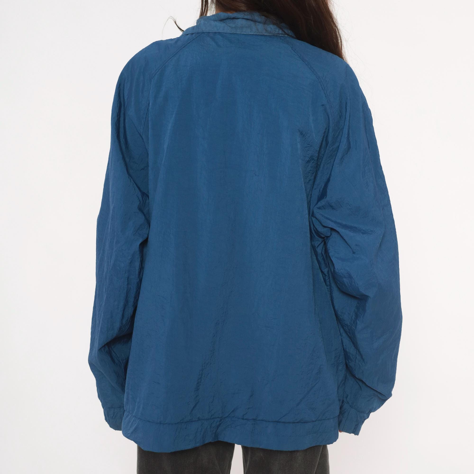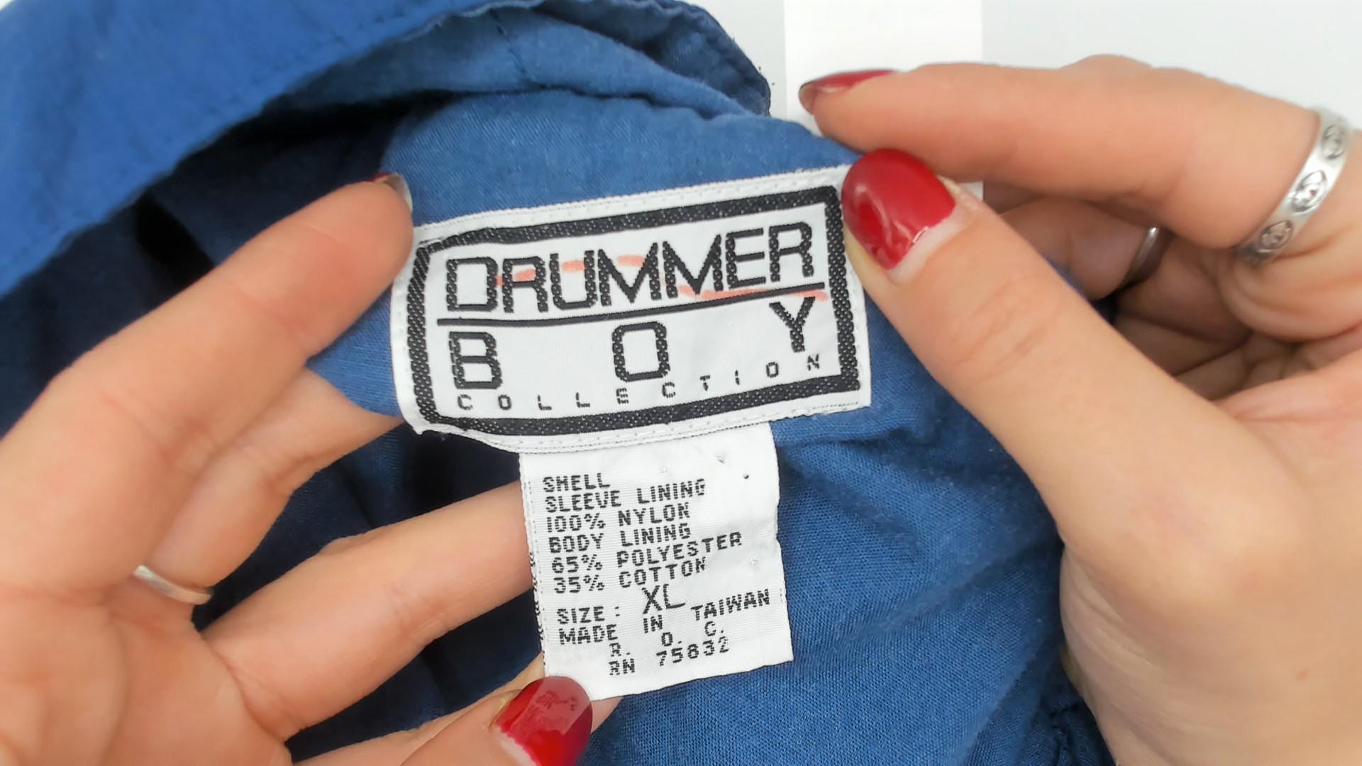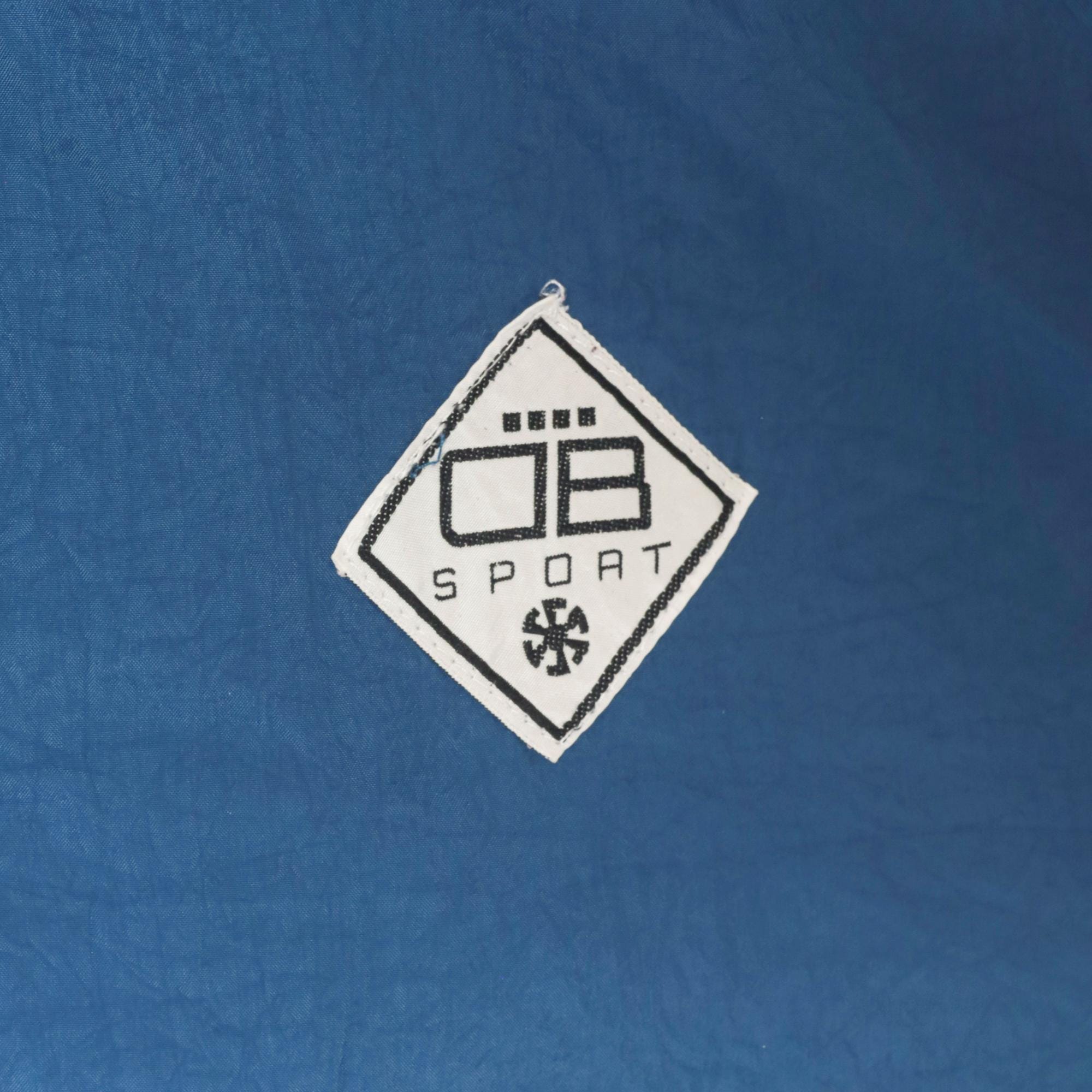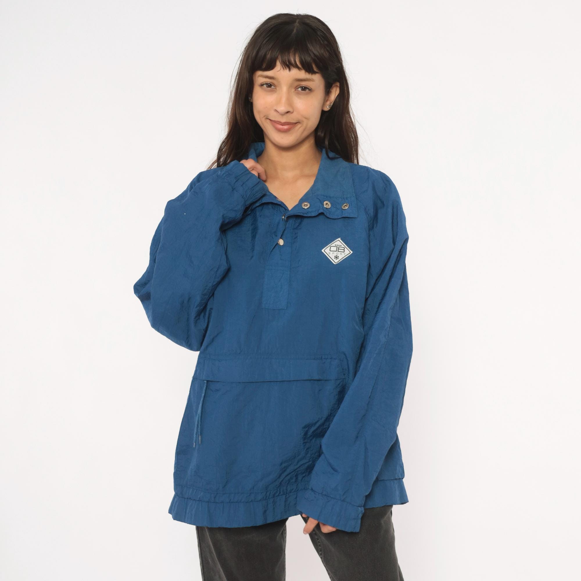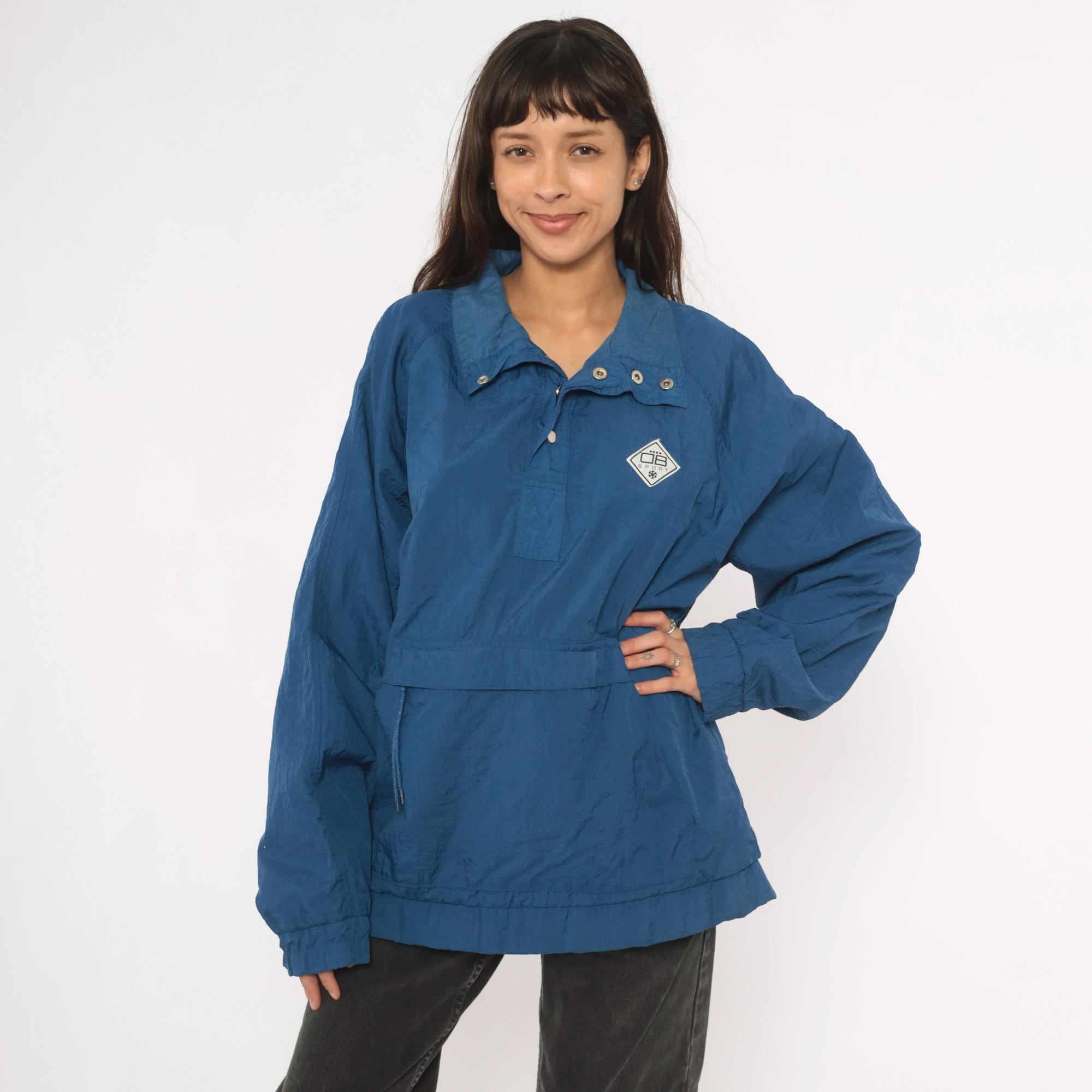 90s blue nylon anorak pullover from Drummer Boy Collection with snap button collar closure and partial zip front. Kangaroo pocket across the front, elasticized cuffs and hem. Solid cobalt blue shell with a diamond-shaped logo patch on the left chest.