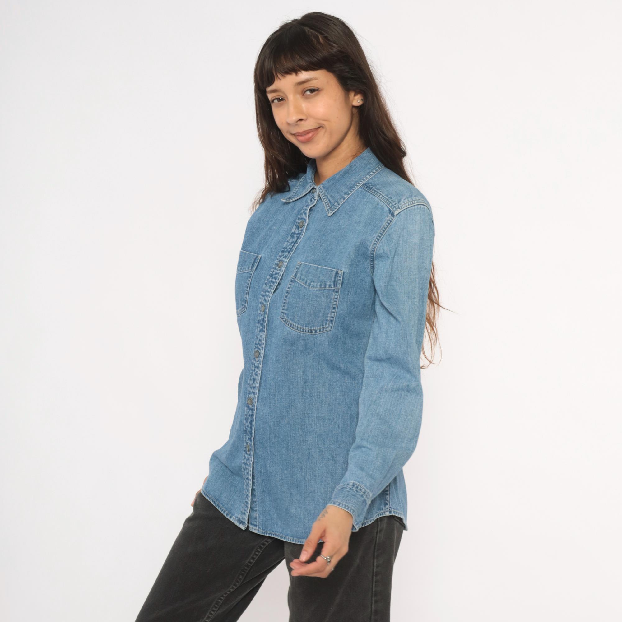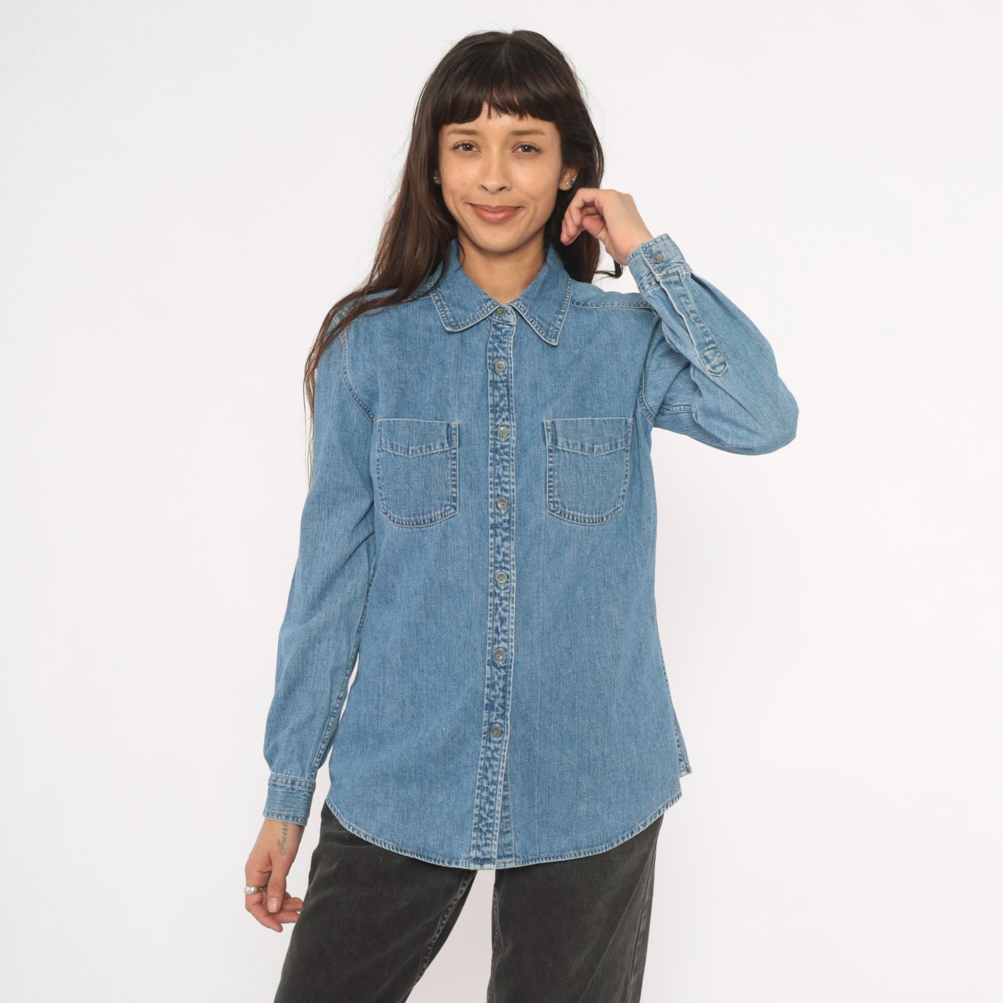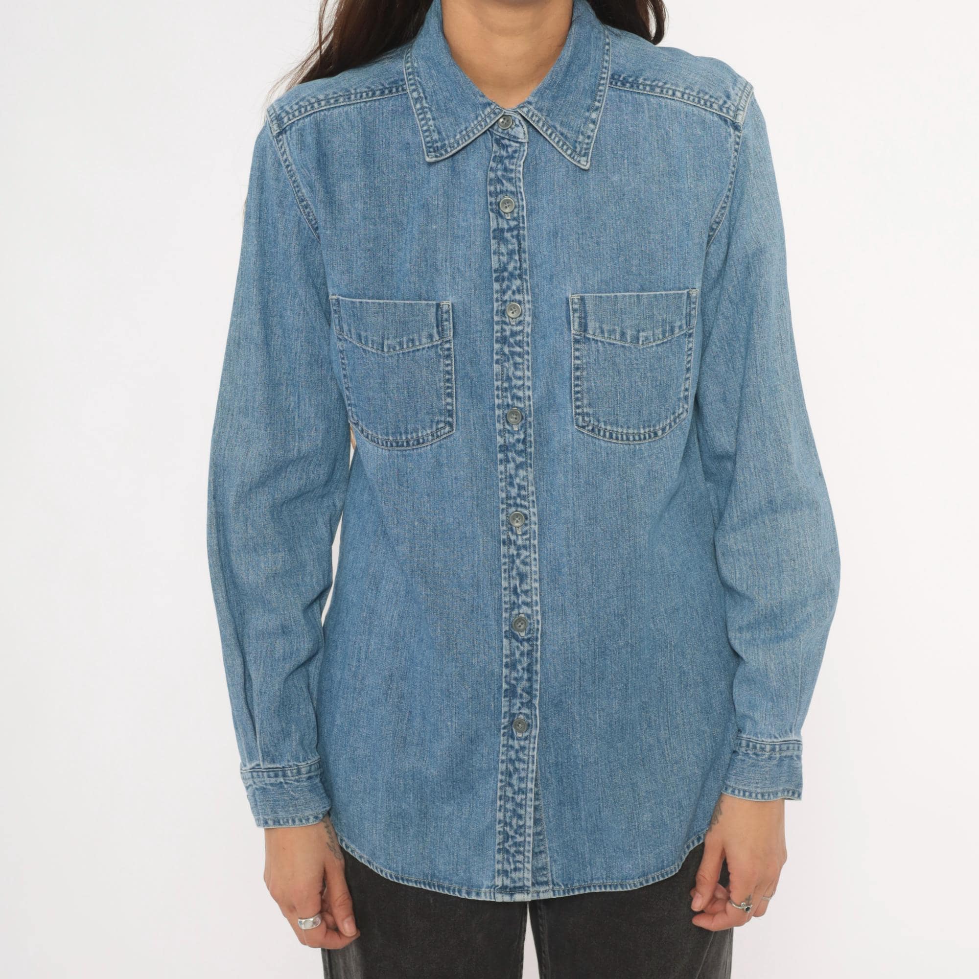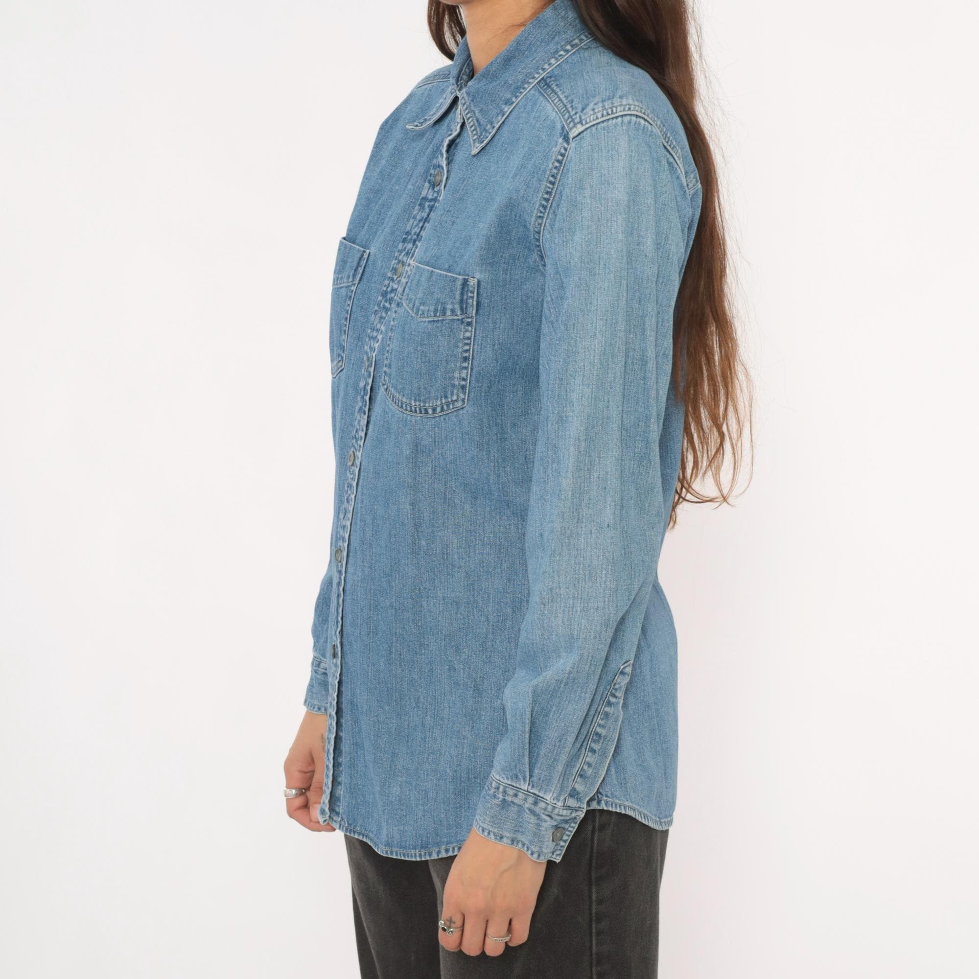 90s light wash denim shirt from Maurices with a pointed collar and full button front closure. Two chest patch pockets with button flaps, long sleeves with buttoned cuffs. Back yoke seam detail and a curved hem with side slits.