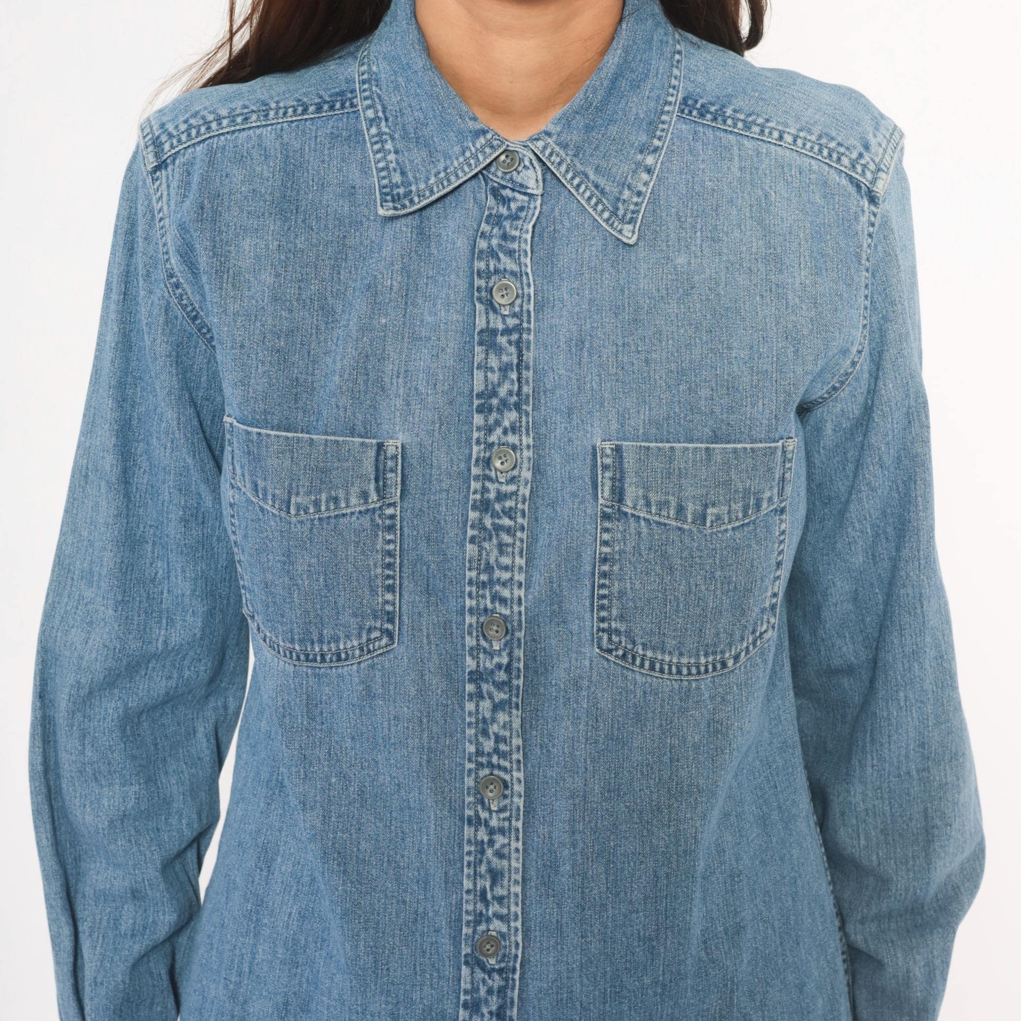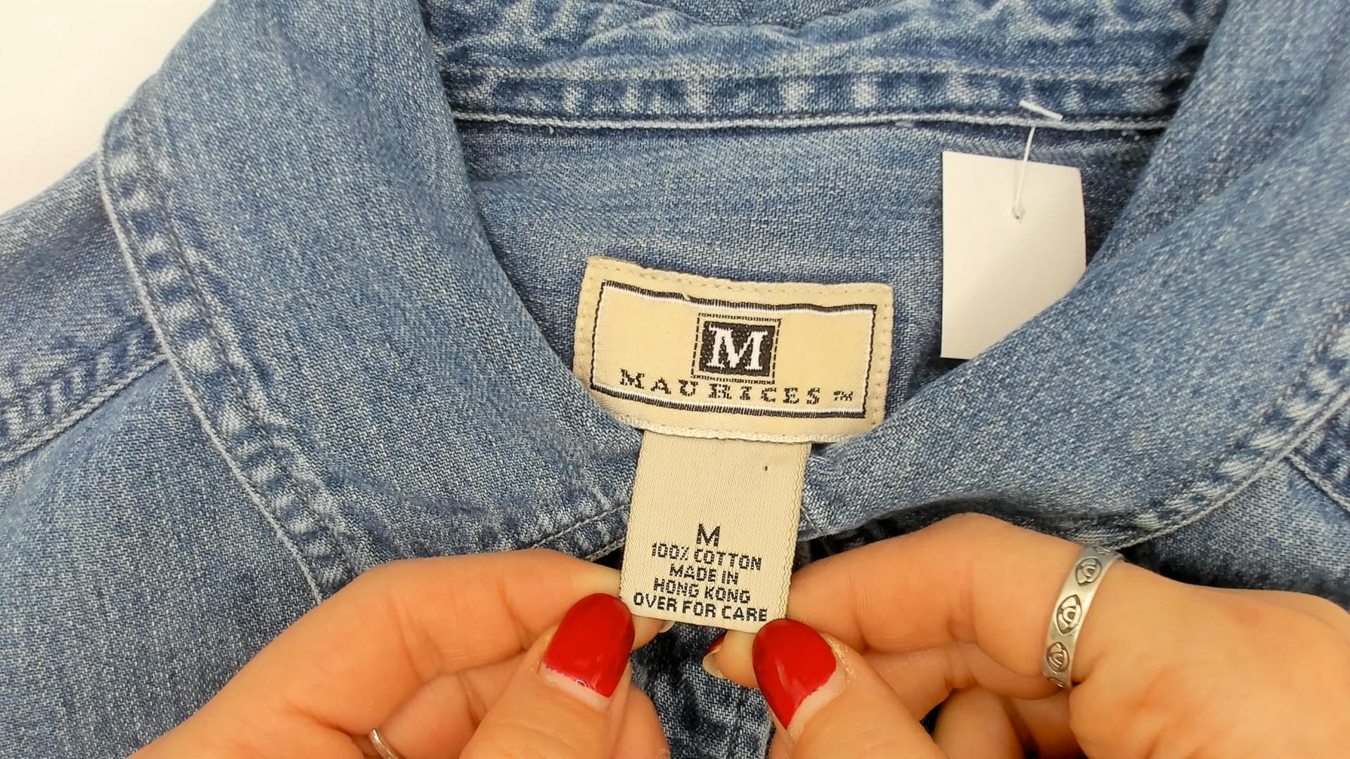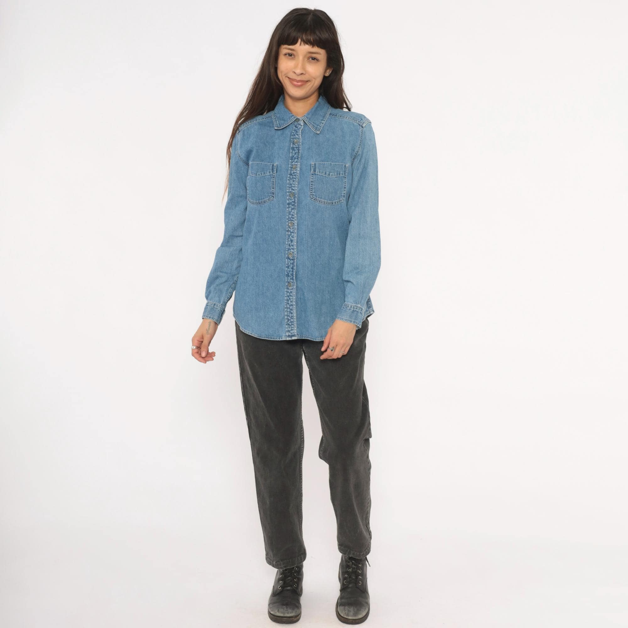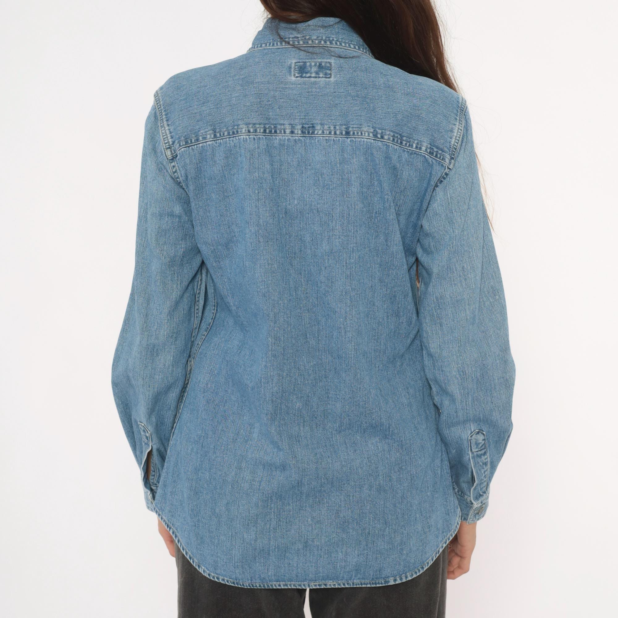 90s light wash denim shirt from Maurices with a pointed collar and full button front closure. Two chest patch pockets with button flaps, long sleeves with buttoned cuffs. Back yoke seam detail and a curved hem with side slits.