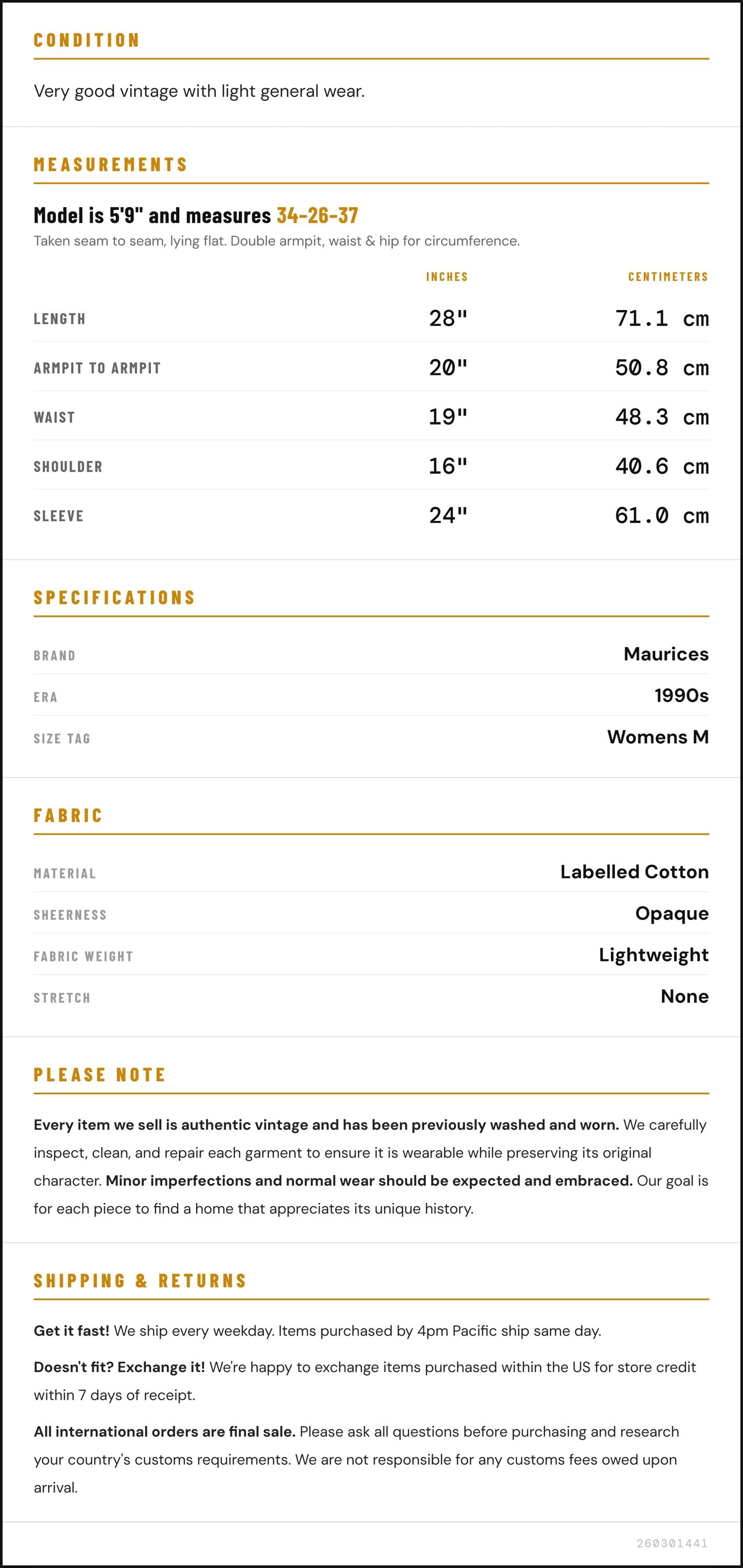 Vintage denim was usually made without any stretch, unlike modern jeans. Check the measurements to ensure proper fit, and remember to give yourself a little wiggle room in the waist and hips, depending on your preferred fit.