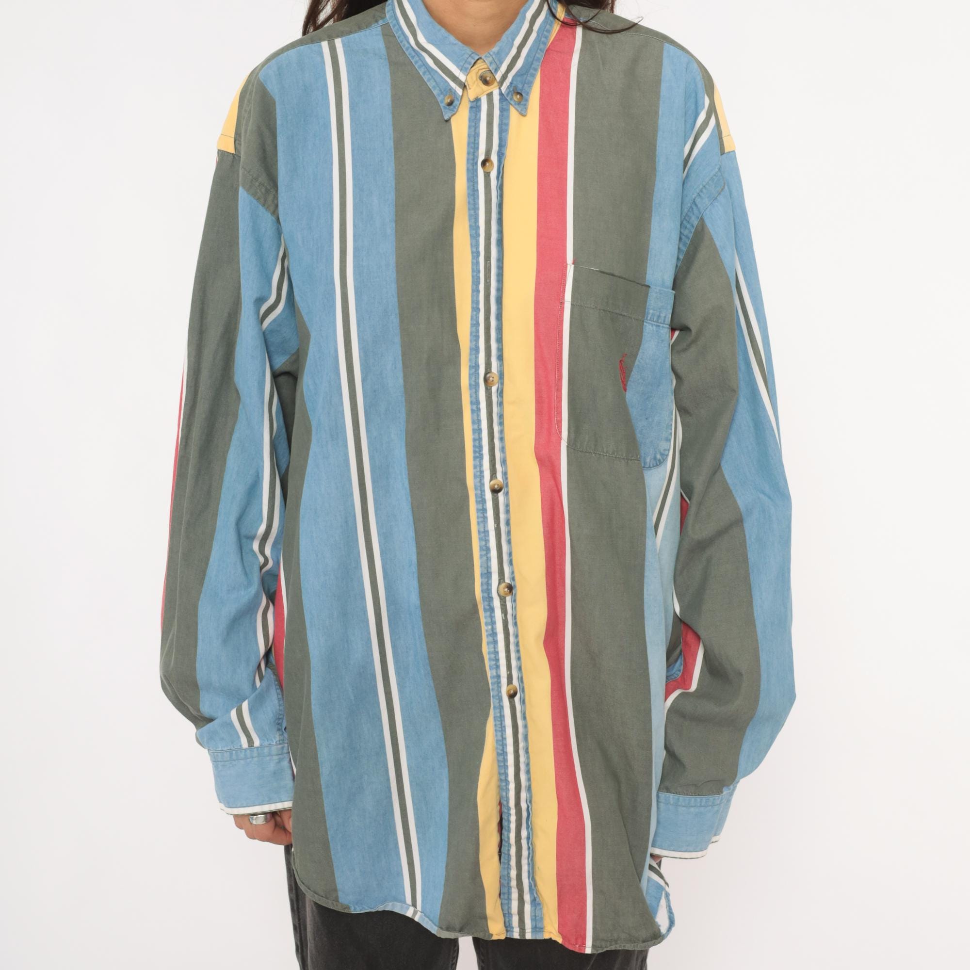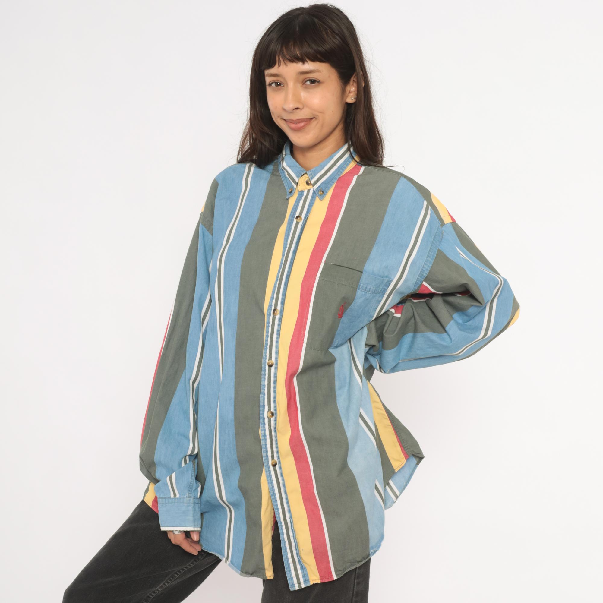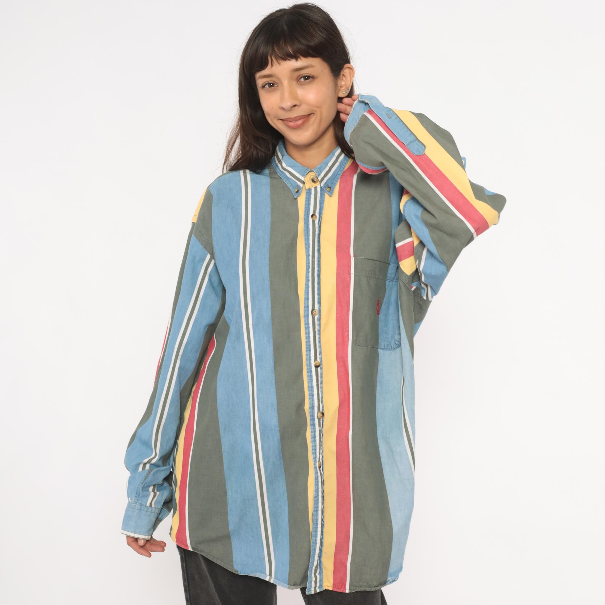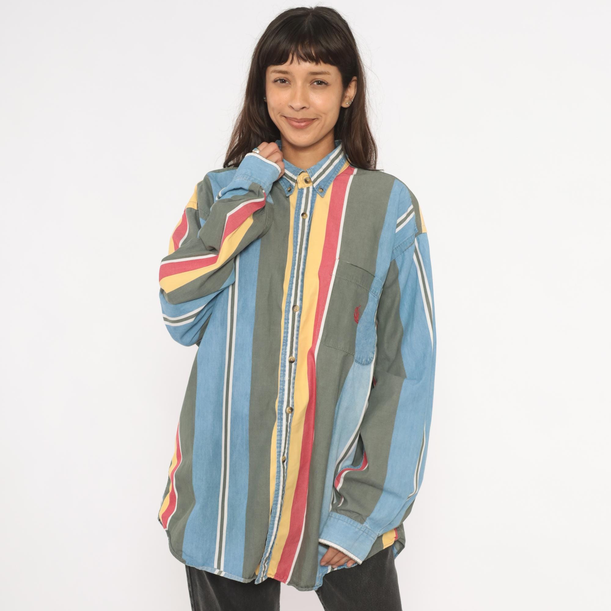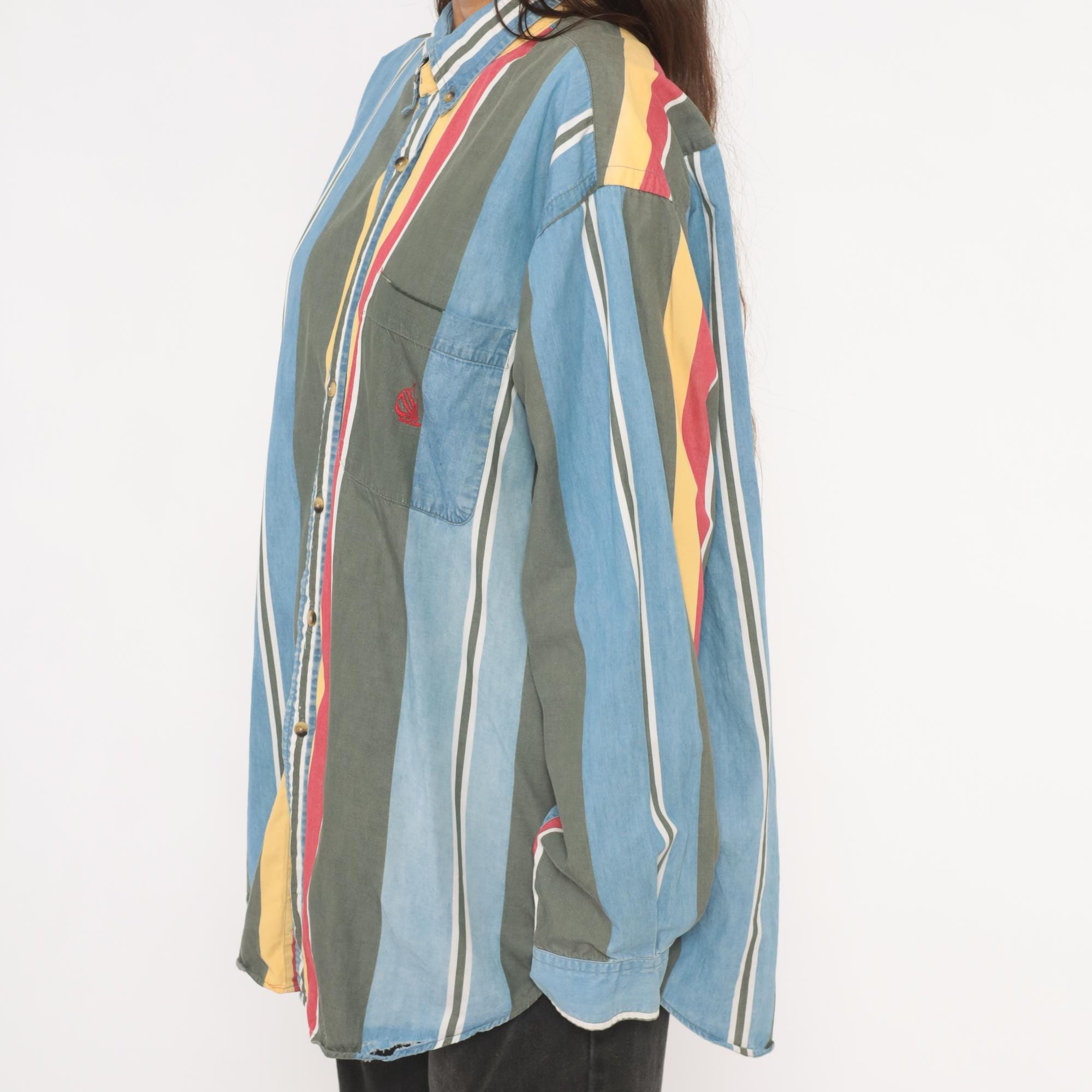 90s Nautica button-down shirt with wide vertical stripes in sky blue, charcoal, gold, rose, and white. Button-down collar with brass-tone buttons, single chest patch pocket with small embroidered logo. Long sleeves with buttoned cuffs and a relaxed straight hem.