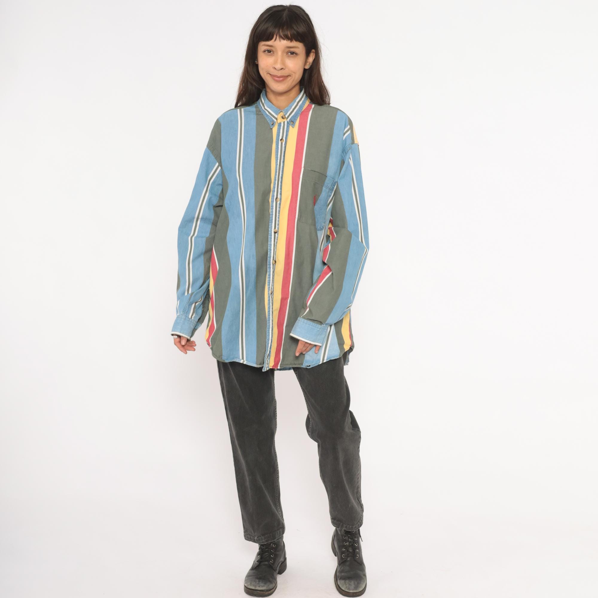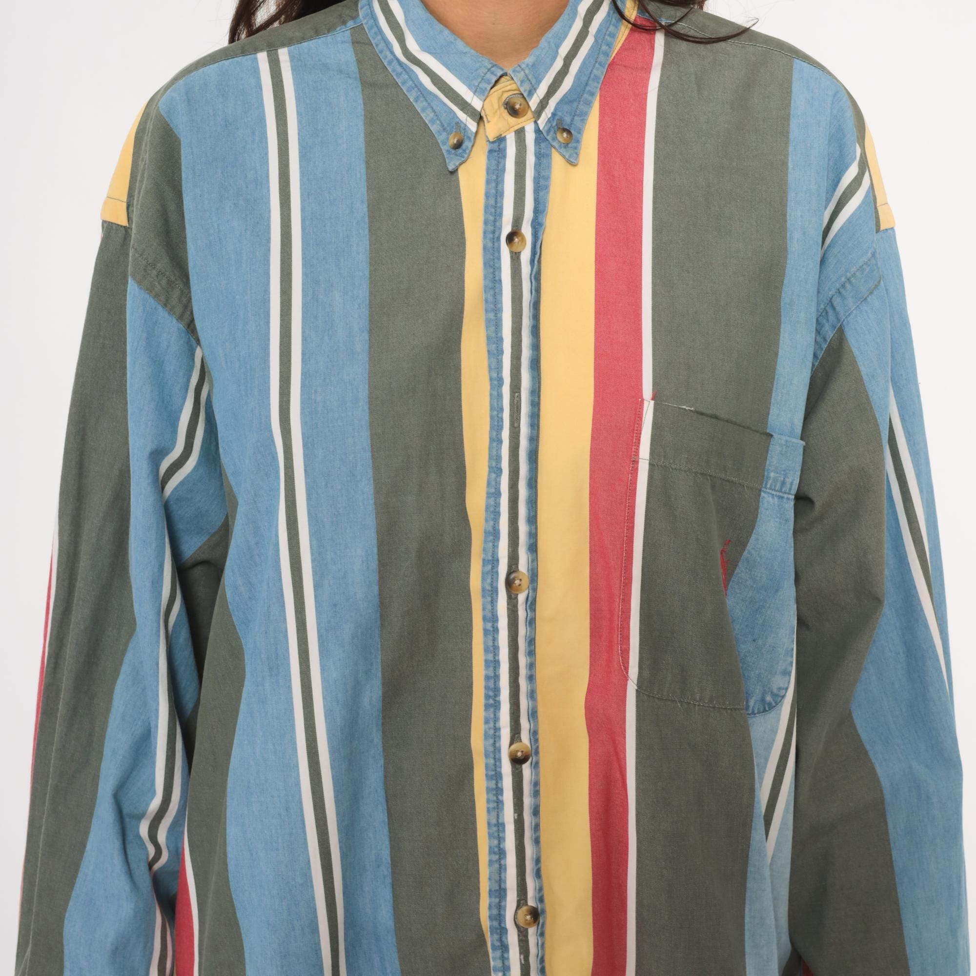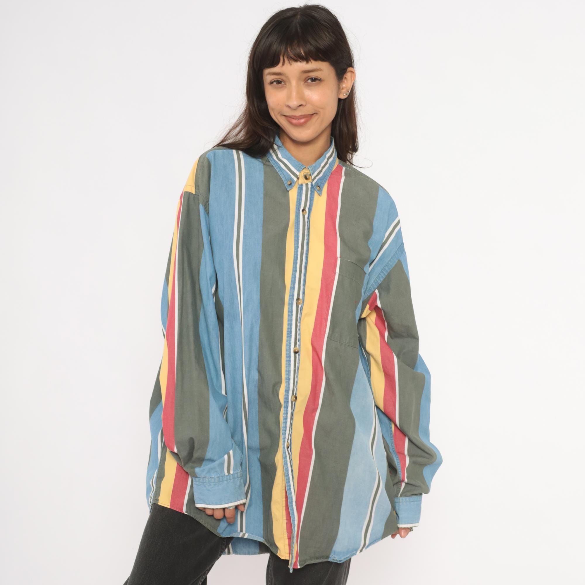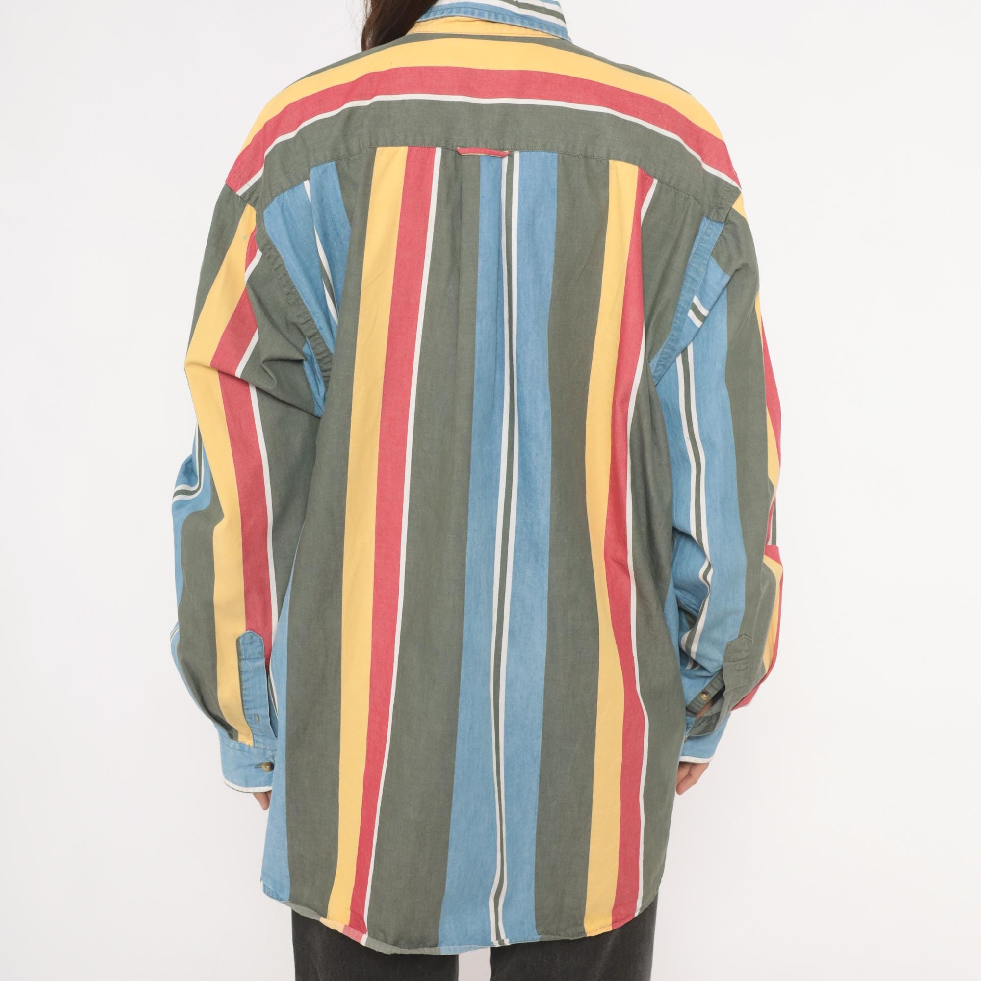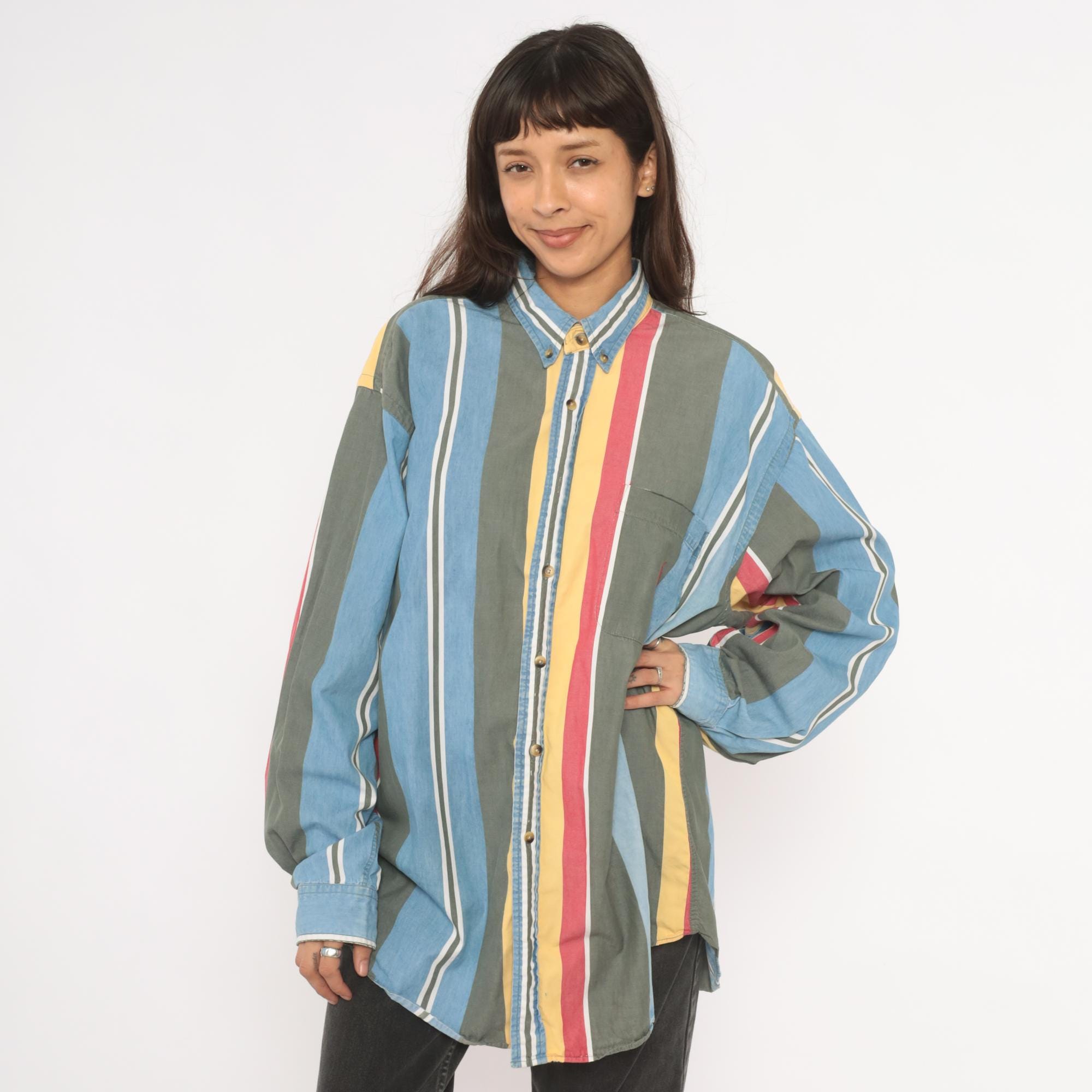 90s Nautica button-down shirt with wide vertical stripes in sky blue, charcoal, gold, rose, and white. Button-down collar with brass-tone buttons, single chest patch pocket with small embroidered logo. Long sleeves with buttoned cuffs and a relaxed straight hem.