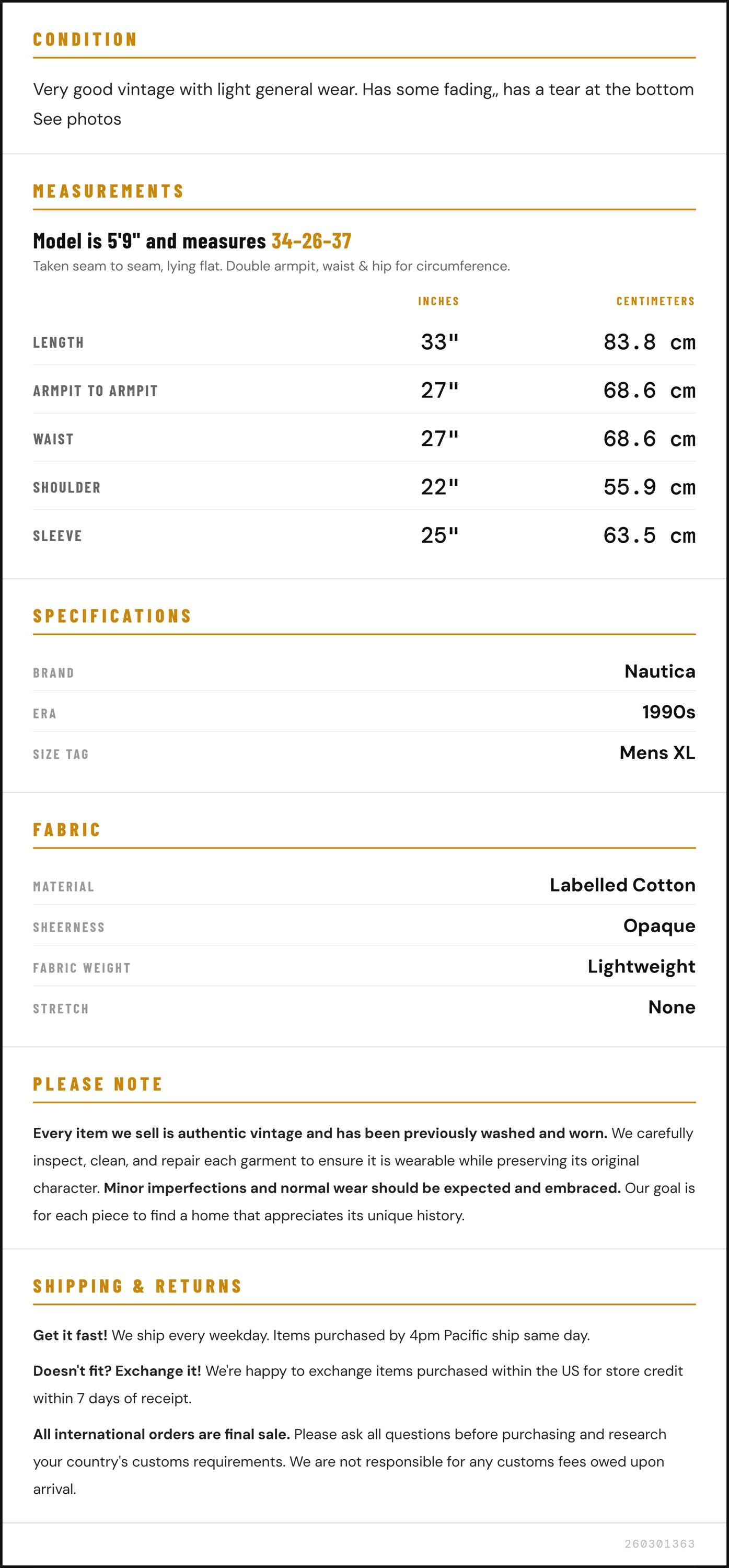 Vintage denim was usually made without any stretch, unlike modern jeans. Check the measurements to ensure proper fit, and remember to give yourself a little wiggle room in the waist and hips, depending on your preferred fit.