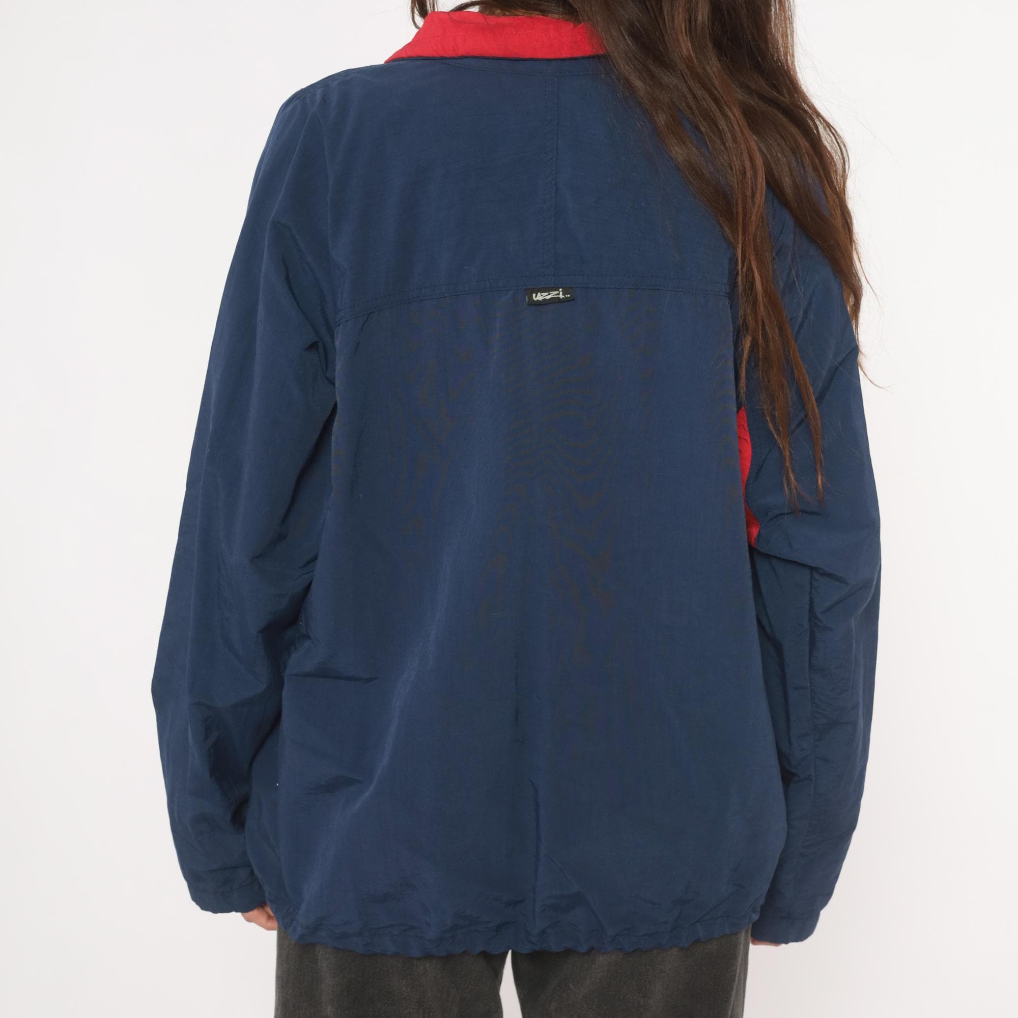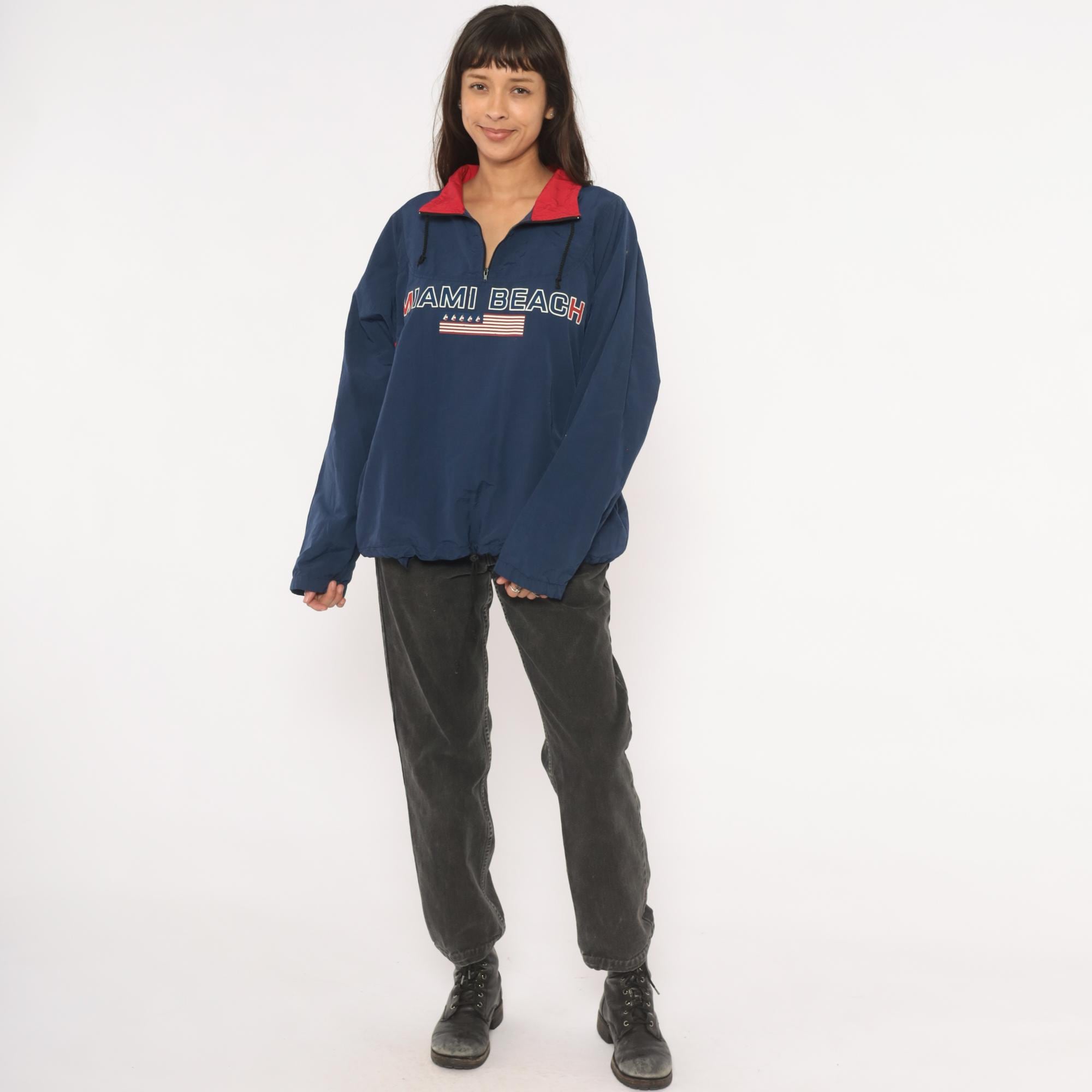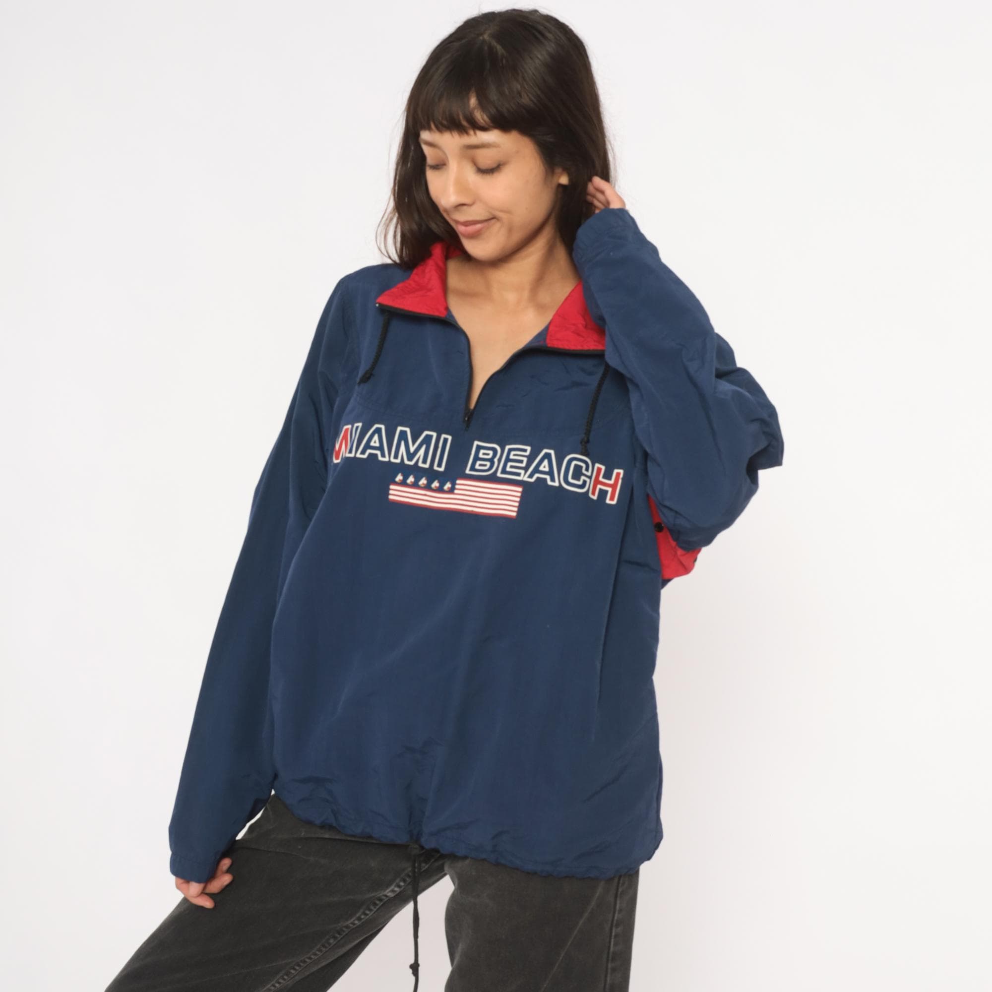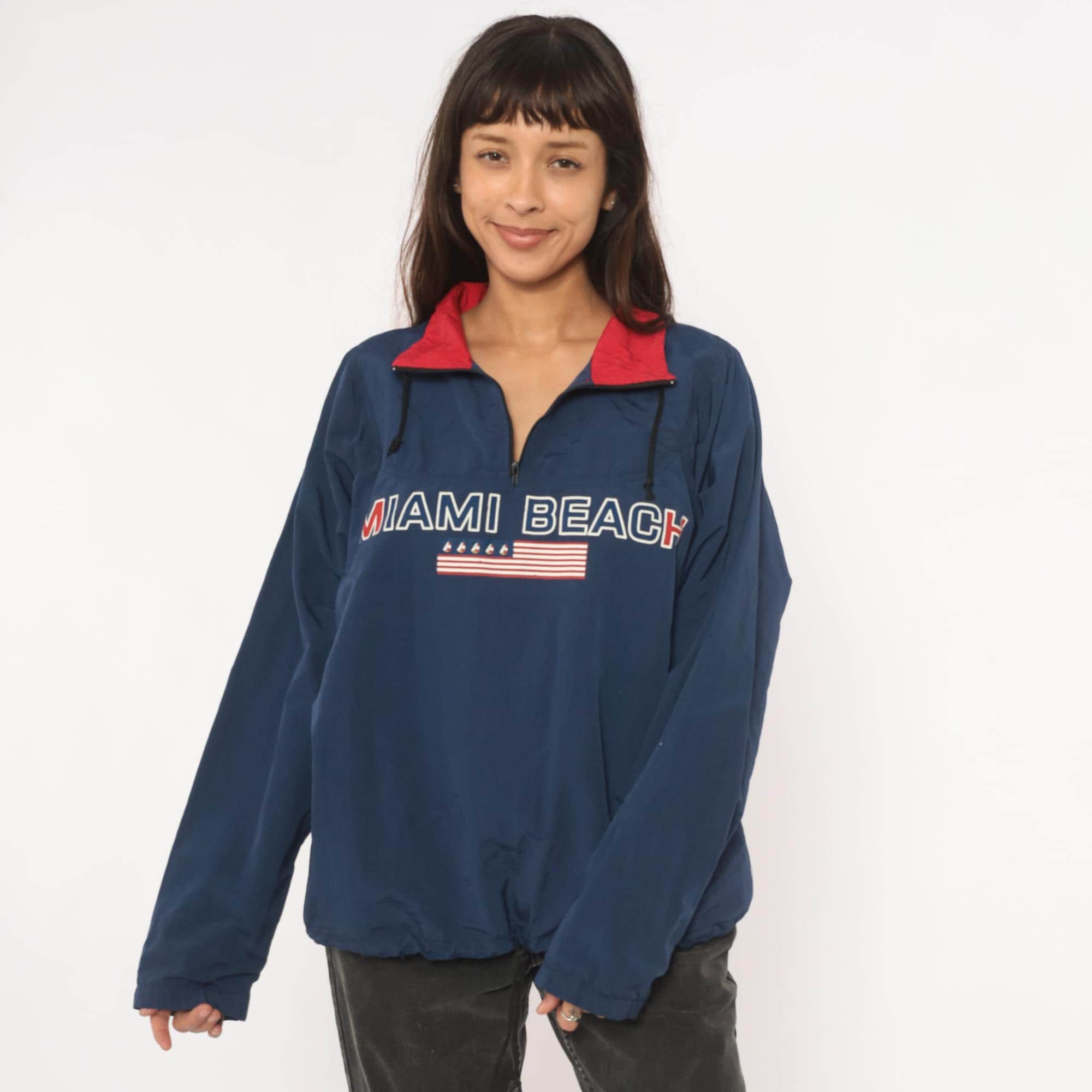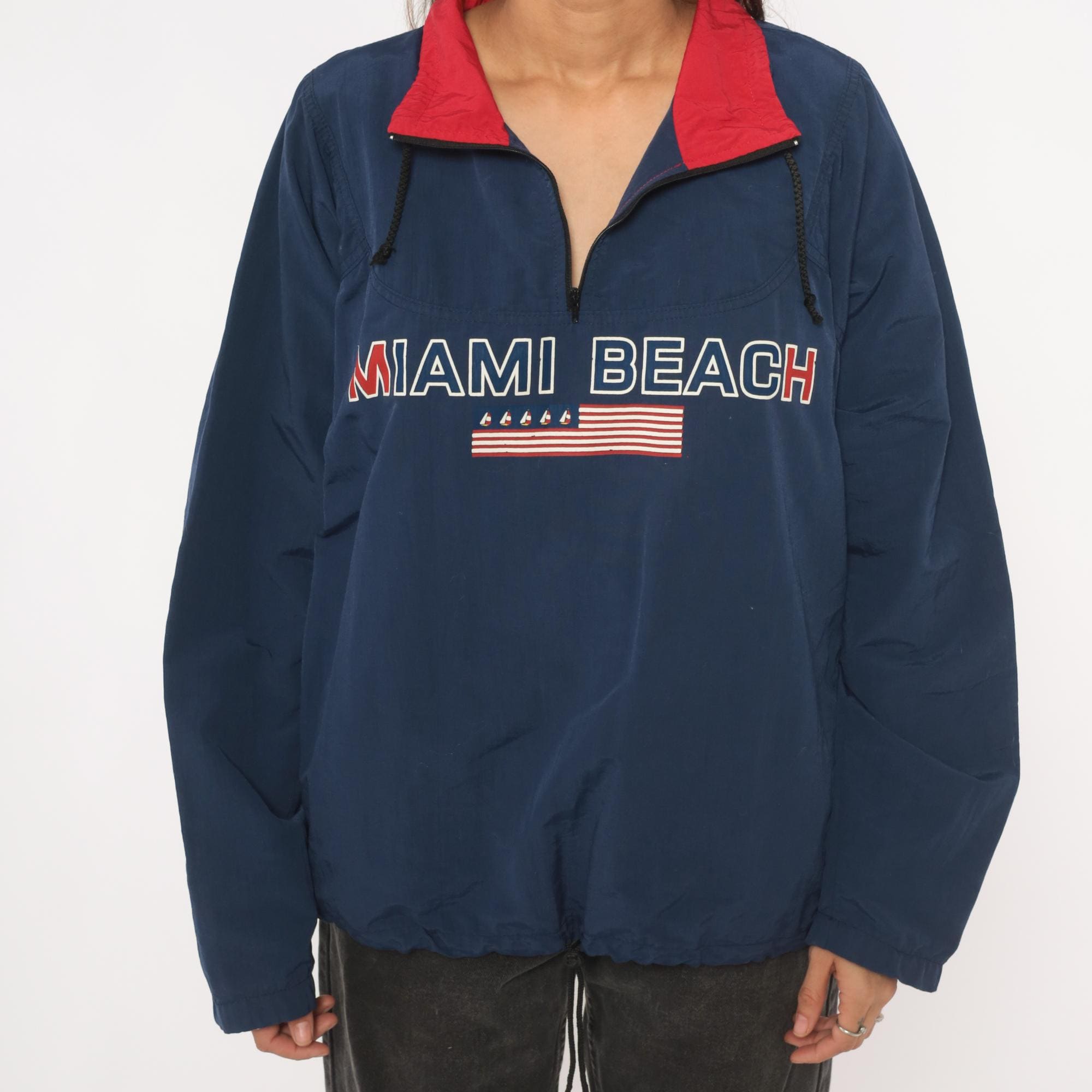 90s navy half-zip pullover windbreaker from Uzzi with "Miami Beach" embroidered across the chest above a small American flag graphic with sailboat motifs. Red contrasting fold-down collar with black drawcord ties at the neck and an elastic drawstring hem. Side seam pockets, elasticized cuffs, and a relaxed boxy silhouette through the body. Small brand label on the upper back yoke.