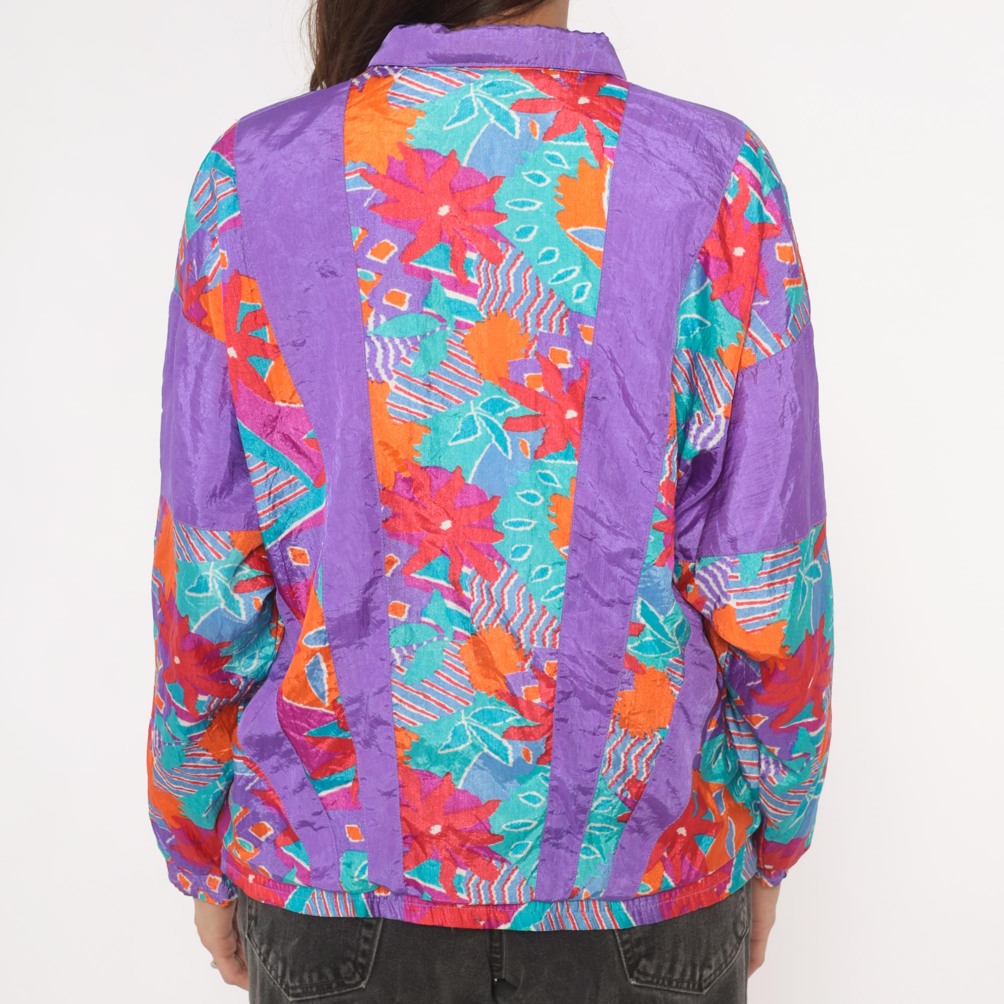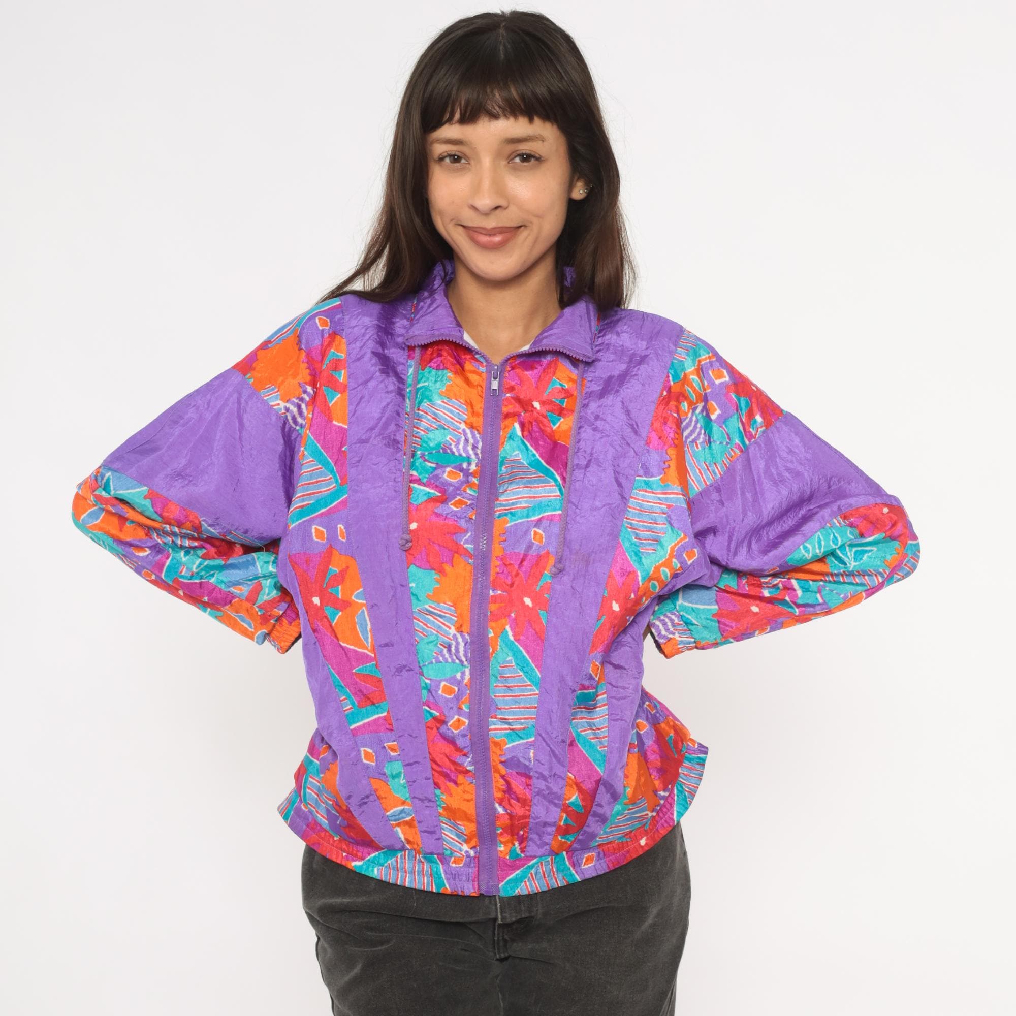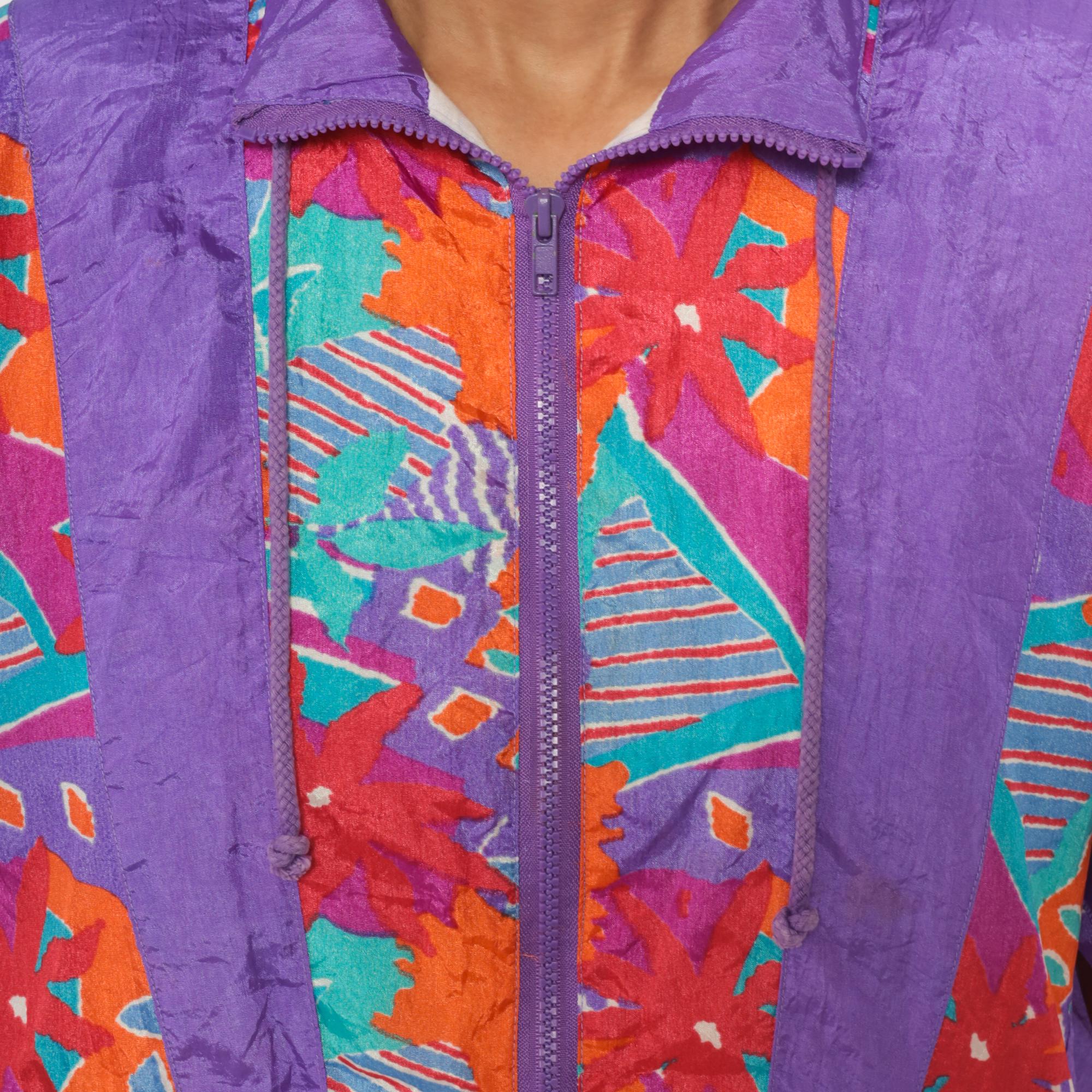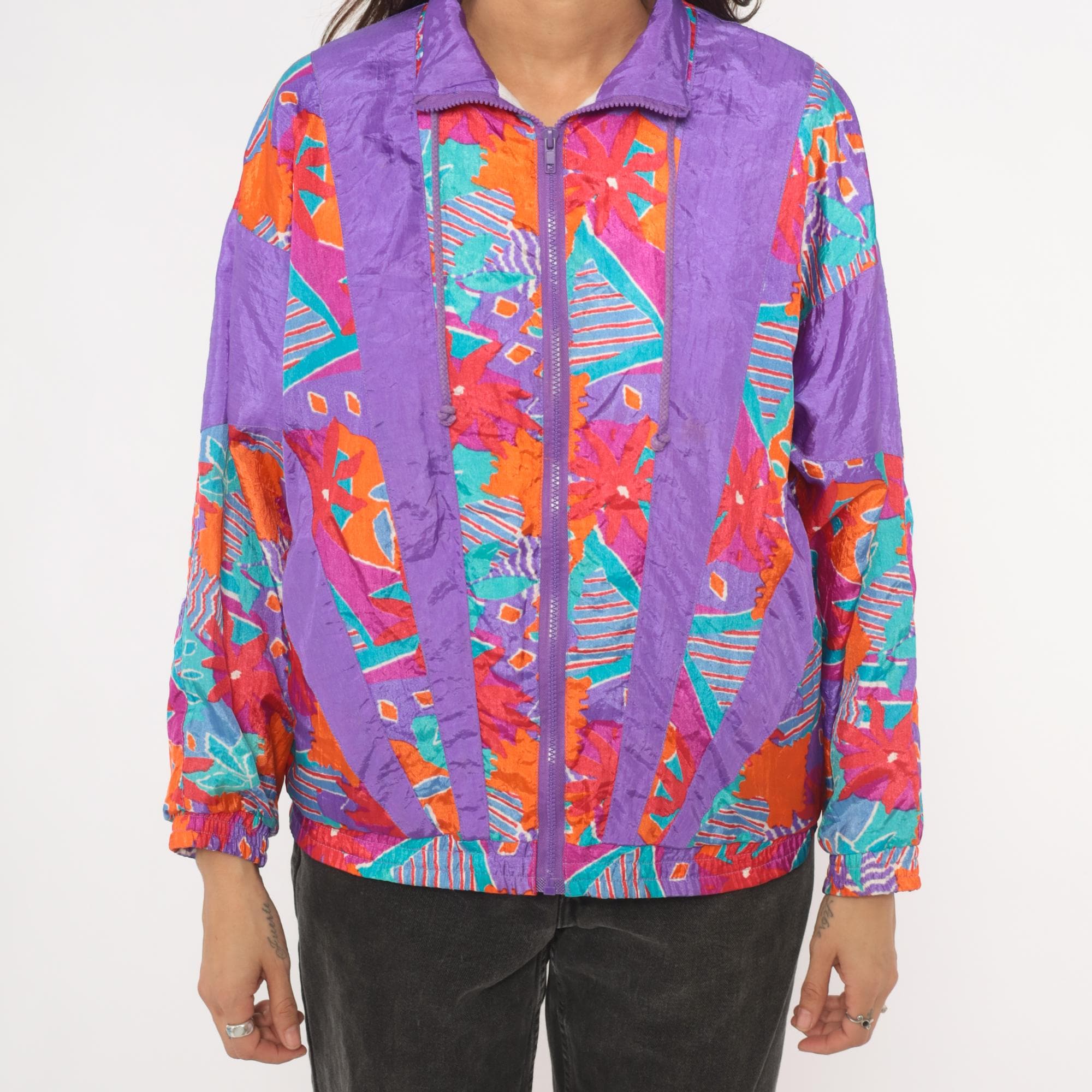 90s zip front windbreaker from Aviat Sportif in purple with abstract geometric and floral print panels in teal, orange, magenta, and white. Fold-down collar, elastic cuffs, and elastic hem with a relaxed silhouette. Side seam pockets and full front zipper closure. The all-over print includes triangles, striped shapes, leaf motifs, and starburst florals across the body and sleeves.
