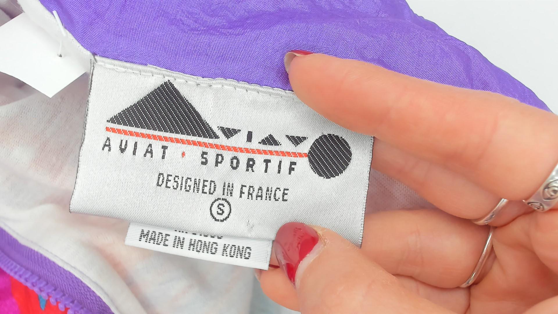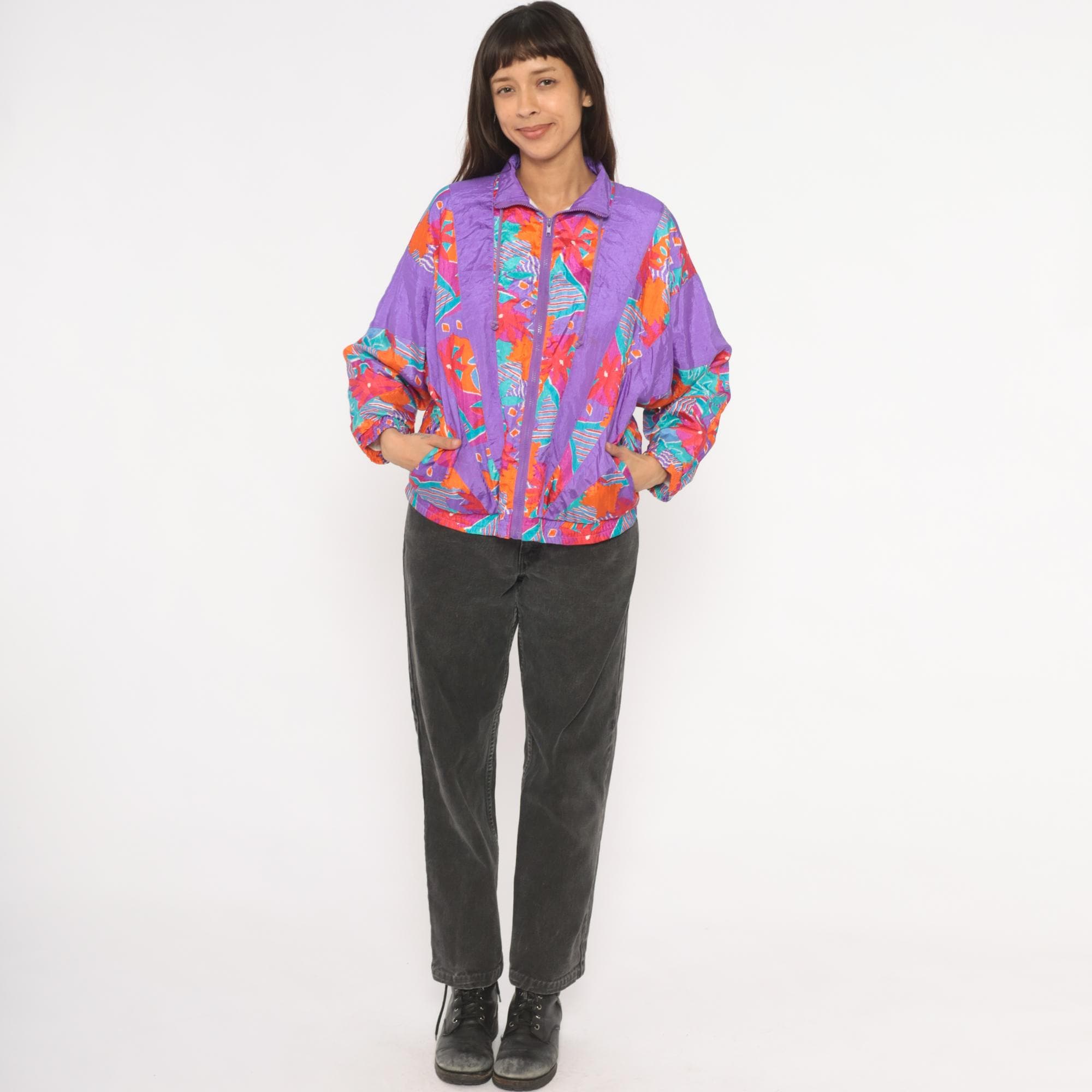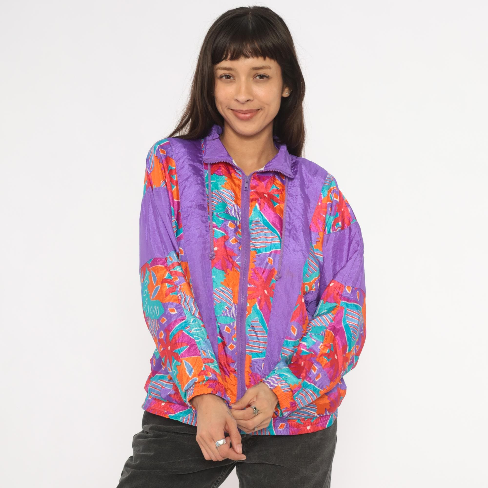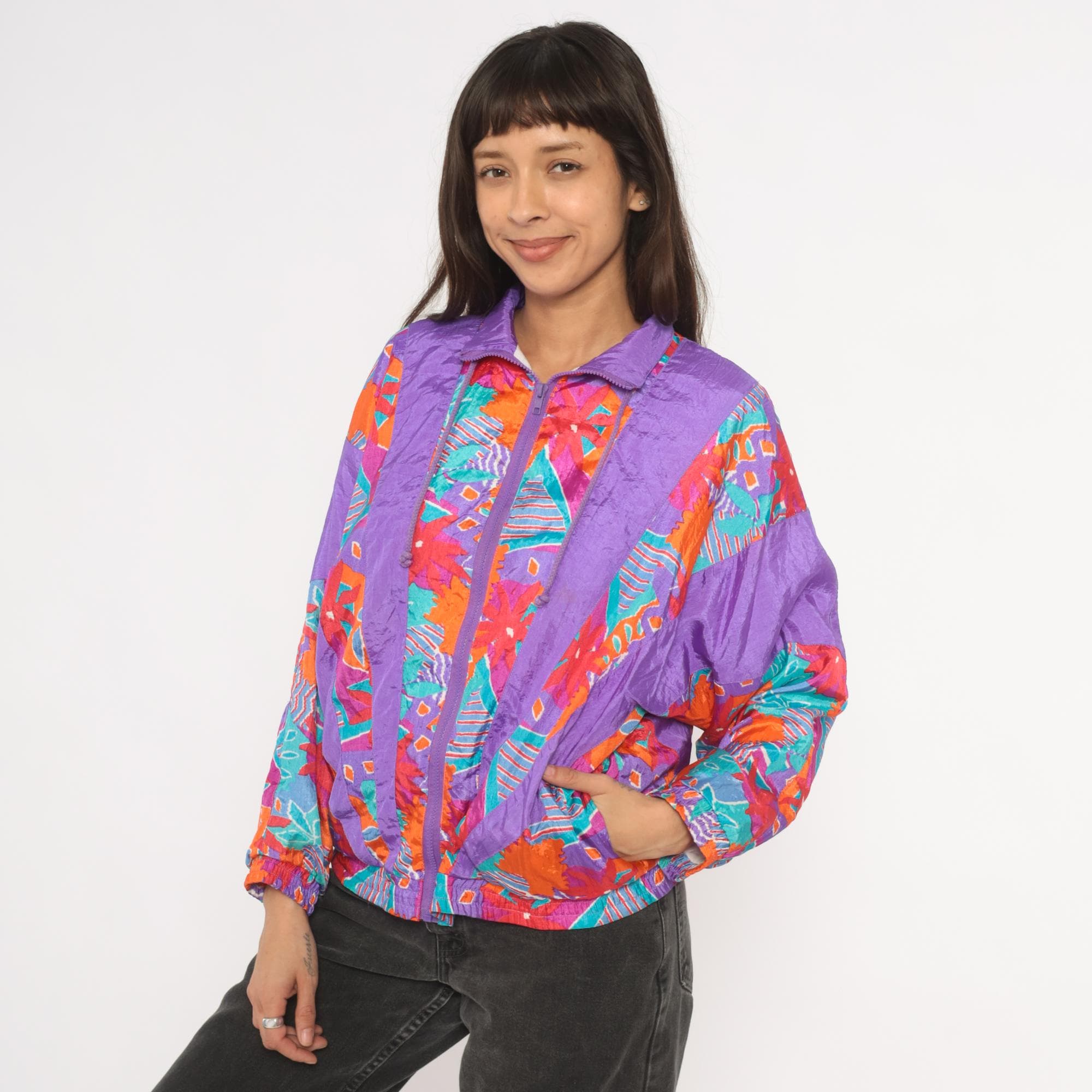 90s zip front windbreaker from Aviat Sportif in purple with abstract geometric and floral print panels in teal, orange, magenta, and white. Fold-down collar, elastic cuffs, and elastic hem with a relaxed silhouette. Side seam pockets and full front zipper closure. The all-over print includes triangles, striped shapes, leaf motifs, and starburst florals across the body and sleeves.