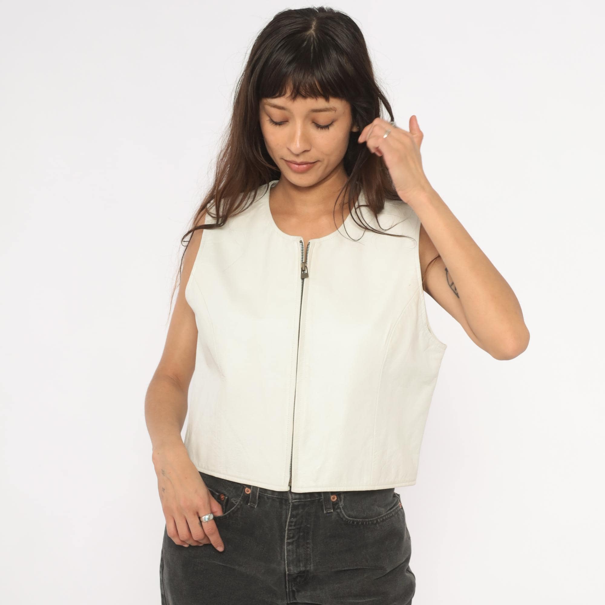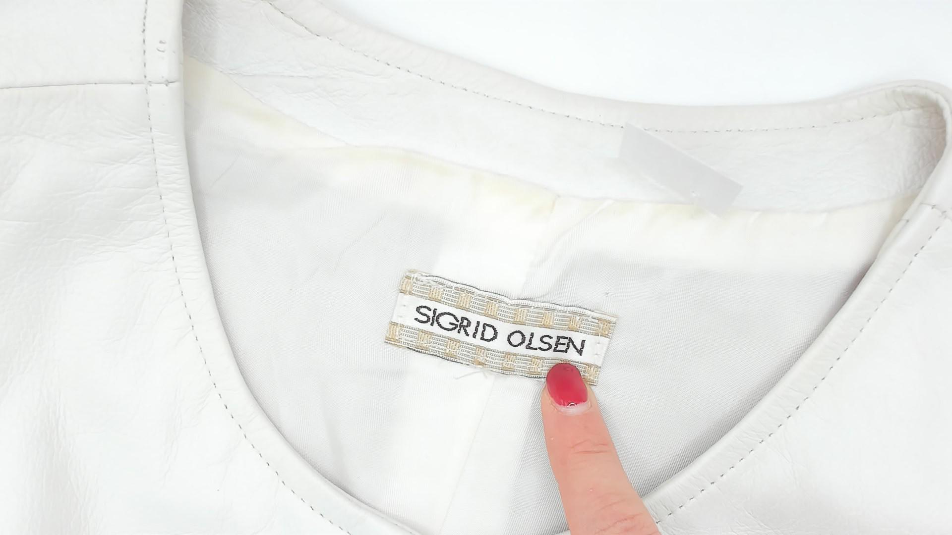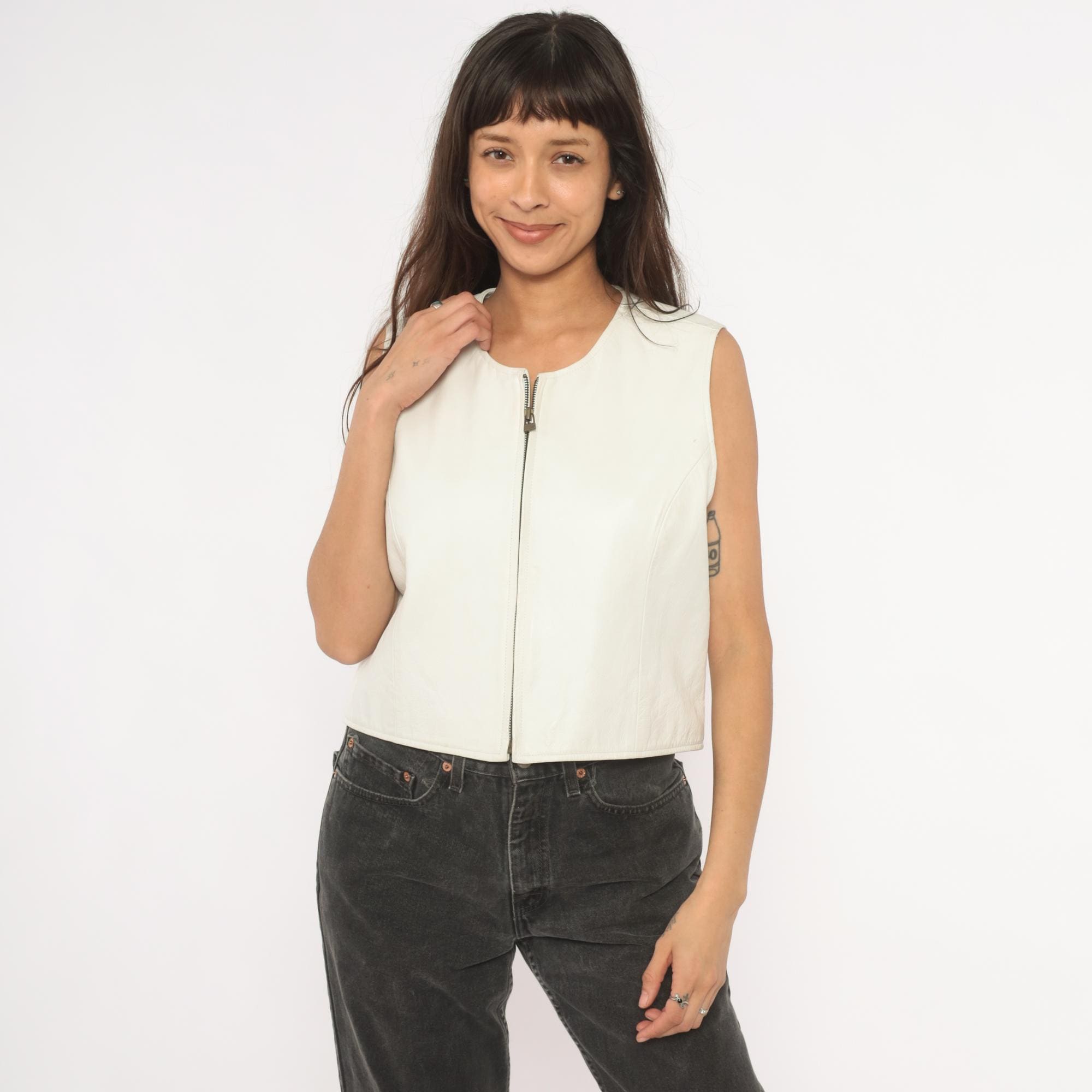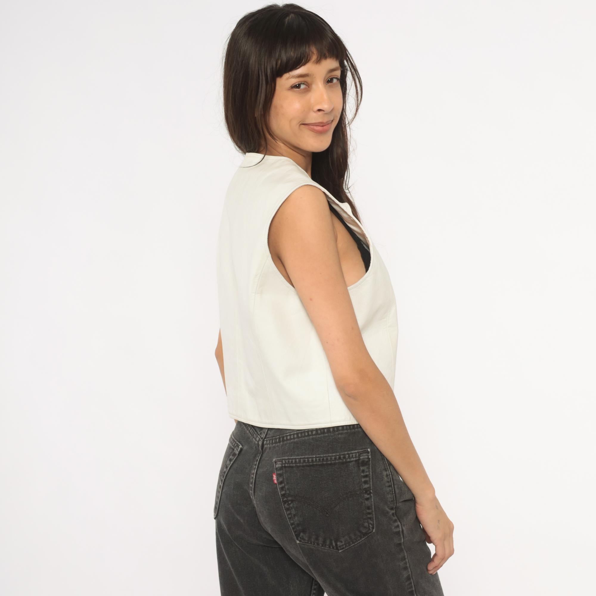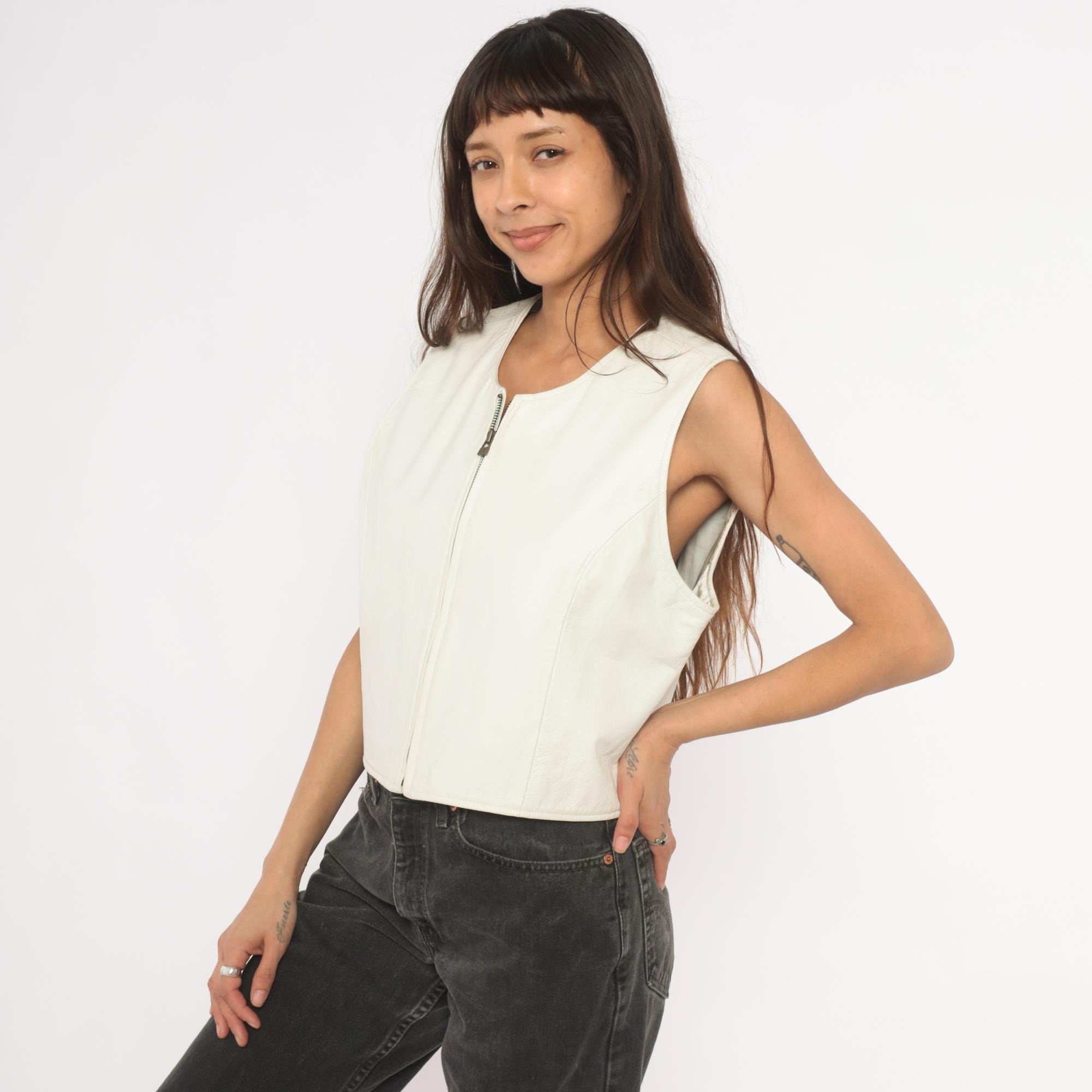 90s white leather vest from Sigrid Olsen with front zipper closure and scoop neckline. Cropped, fitted silhouette with structured shoulders and paneled seaming throughout. Ivory tone with silver-toned exposed zipper hardware and acetate lining.