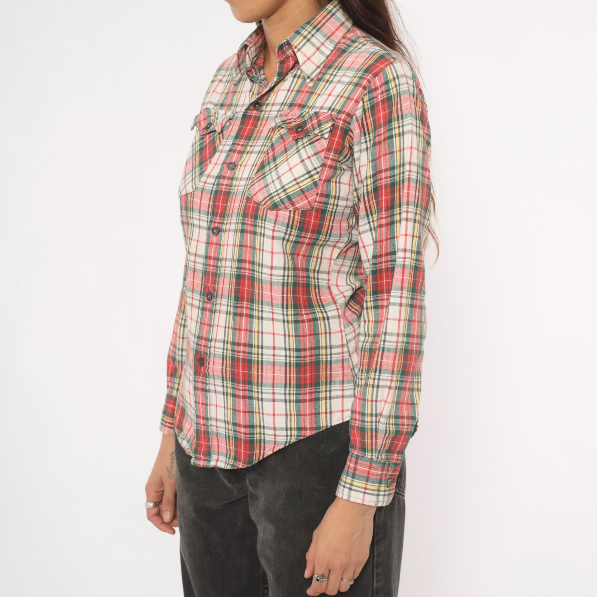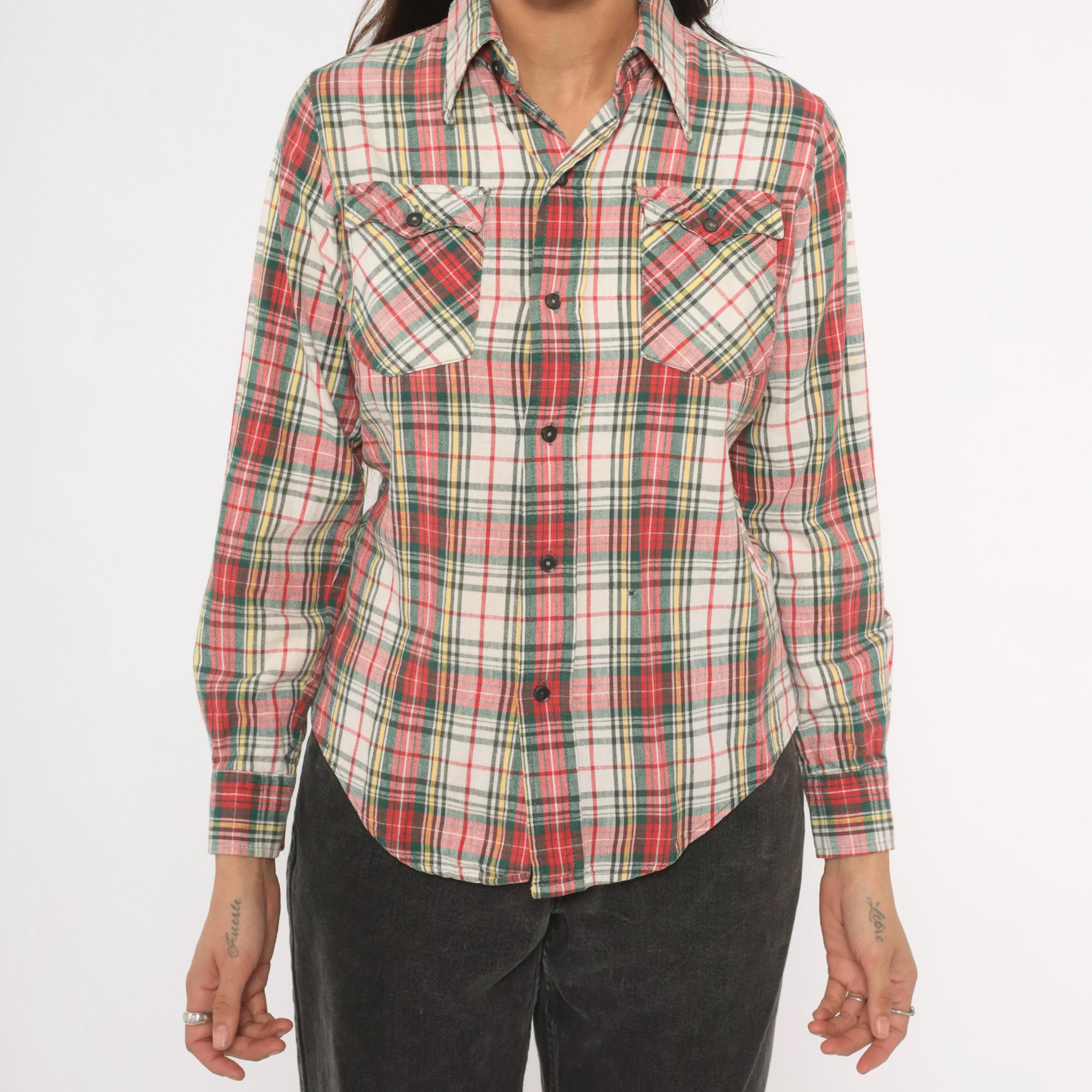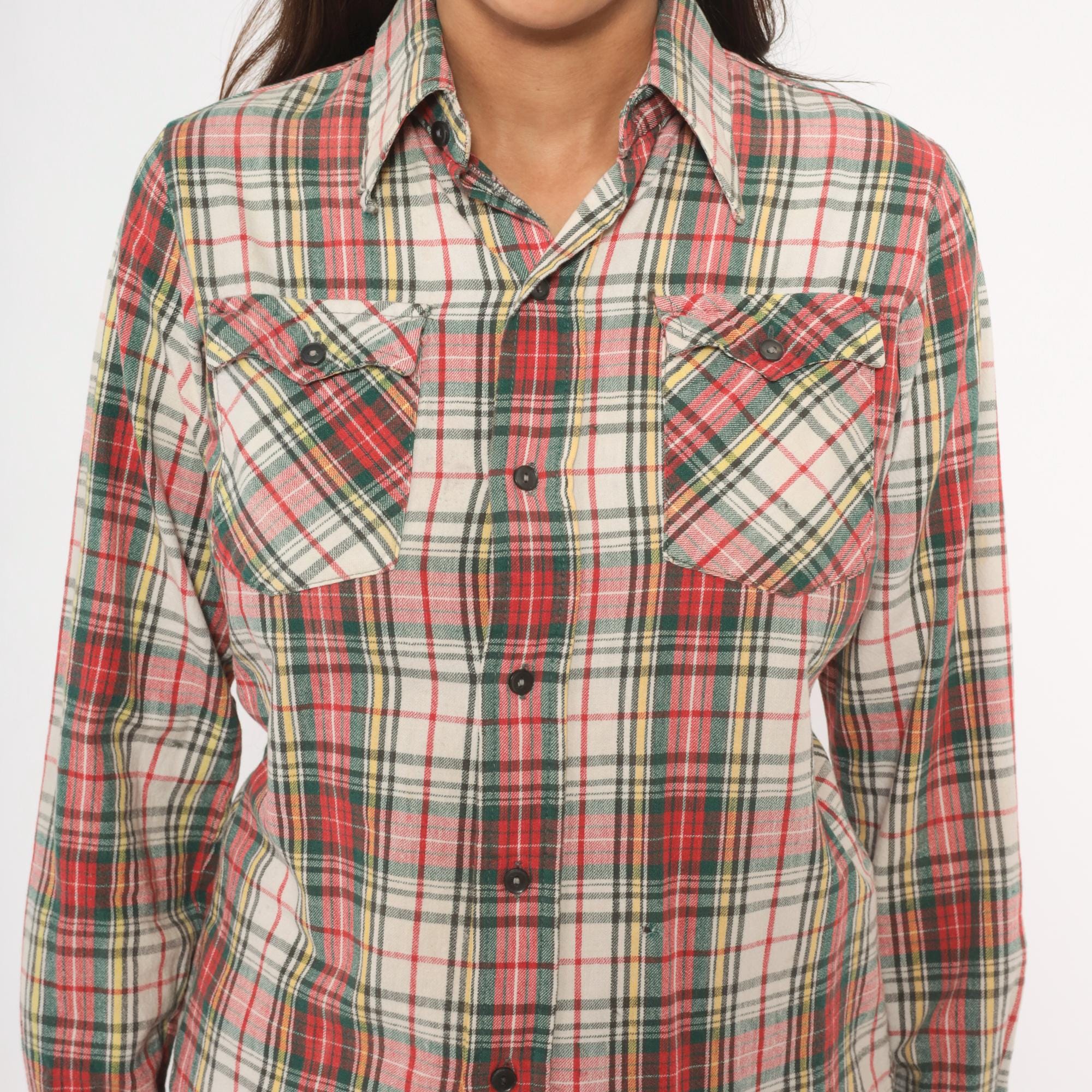 80s plaid flannel shirt from Medalist in a red, green, yellow, and cream tartan pattern with a button front closure. Pointed collar, two front chest patch pockets with button flaps, and long sleeves. Western-style yoke across the chest and back.
