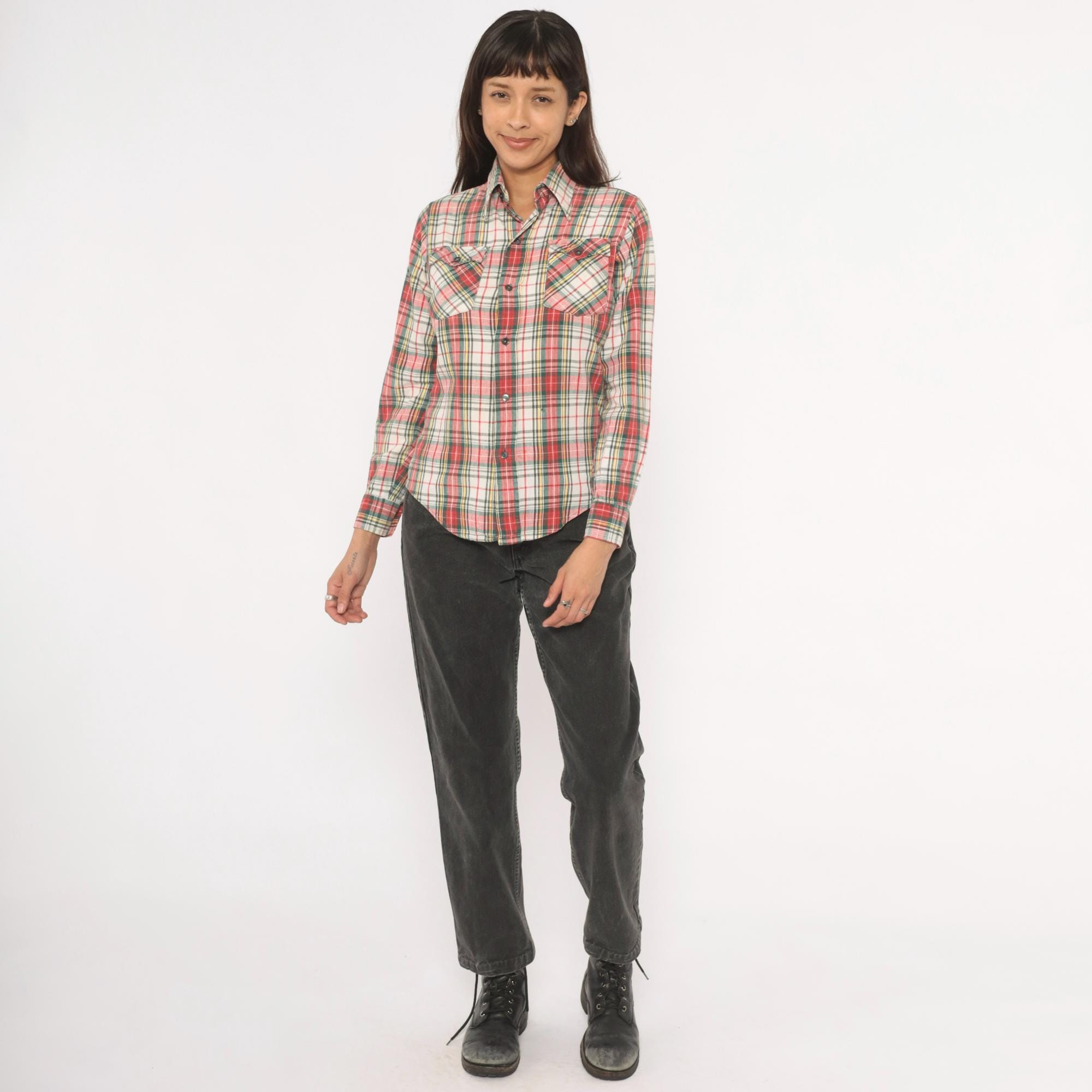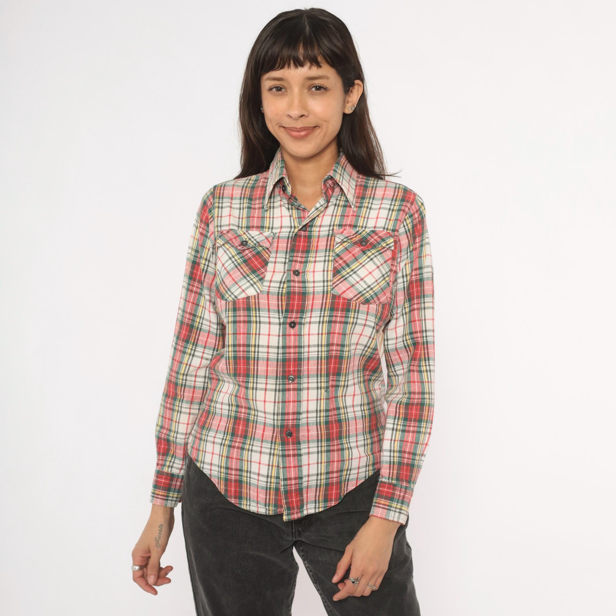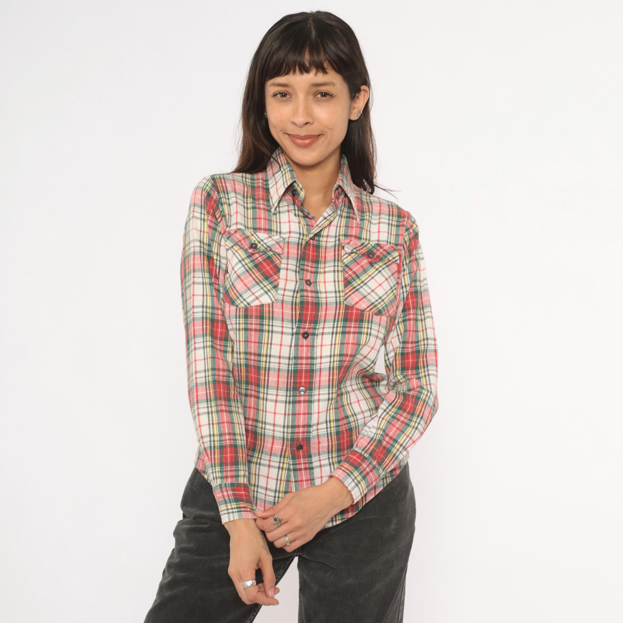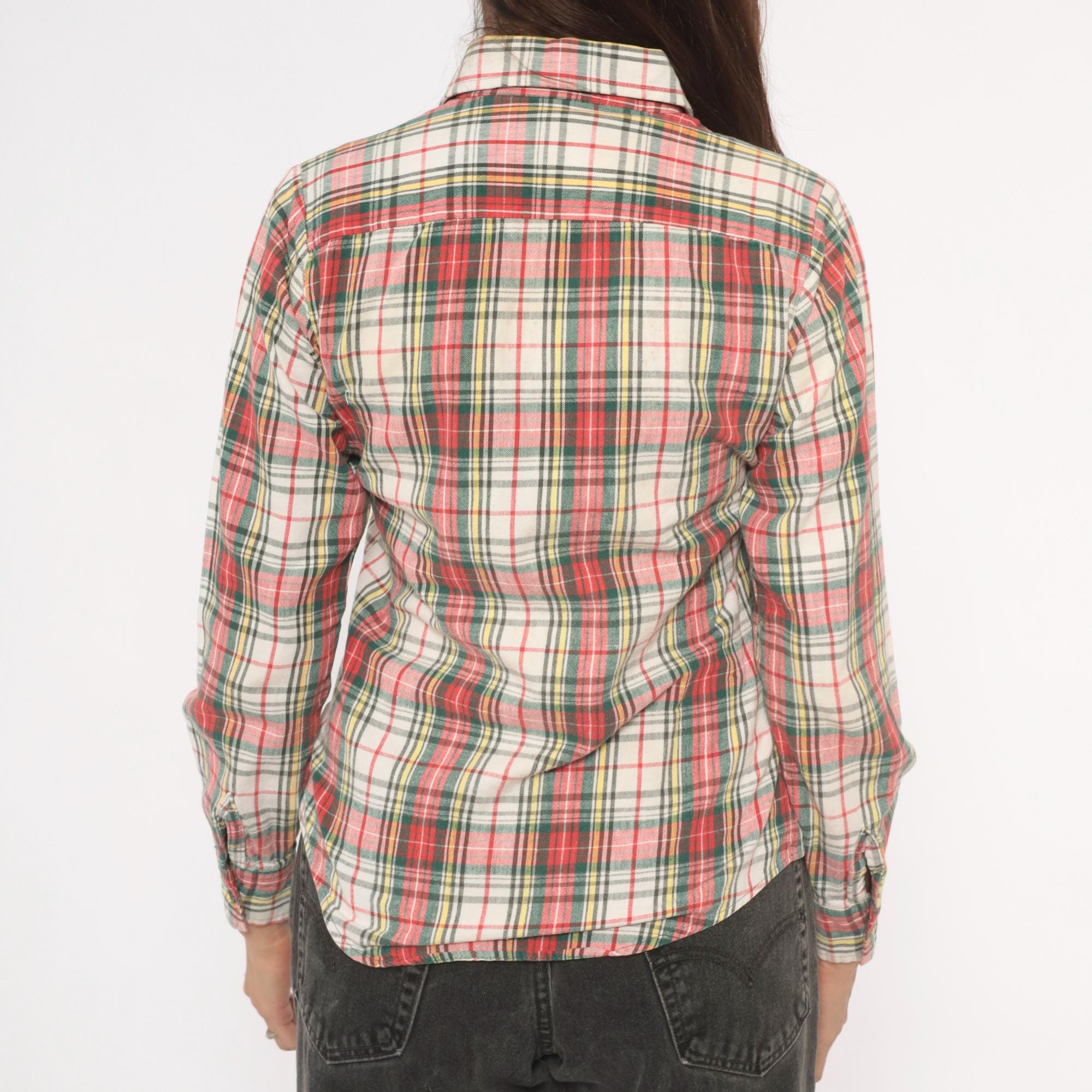 80s plaid flannel shirt from Medalist in a red, green, yellow, and cream tartan pattern with a button front closure. Pointed collar, two front chest patch pockets with button flaps, and long sleeves. Western-style yoke across the chest and back.