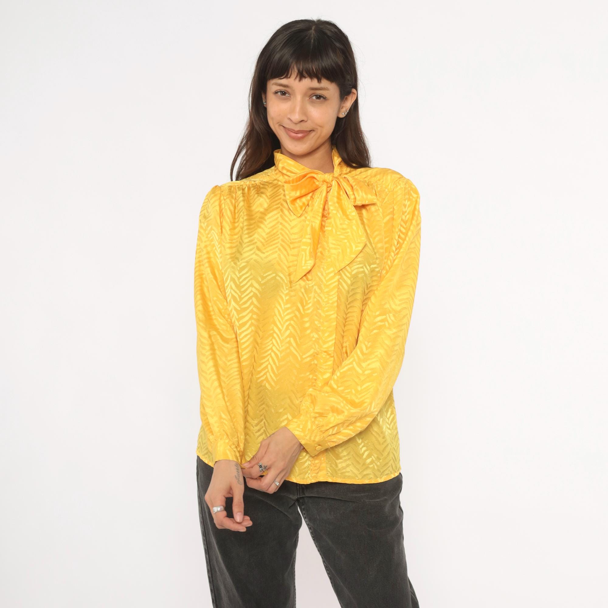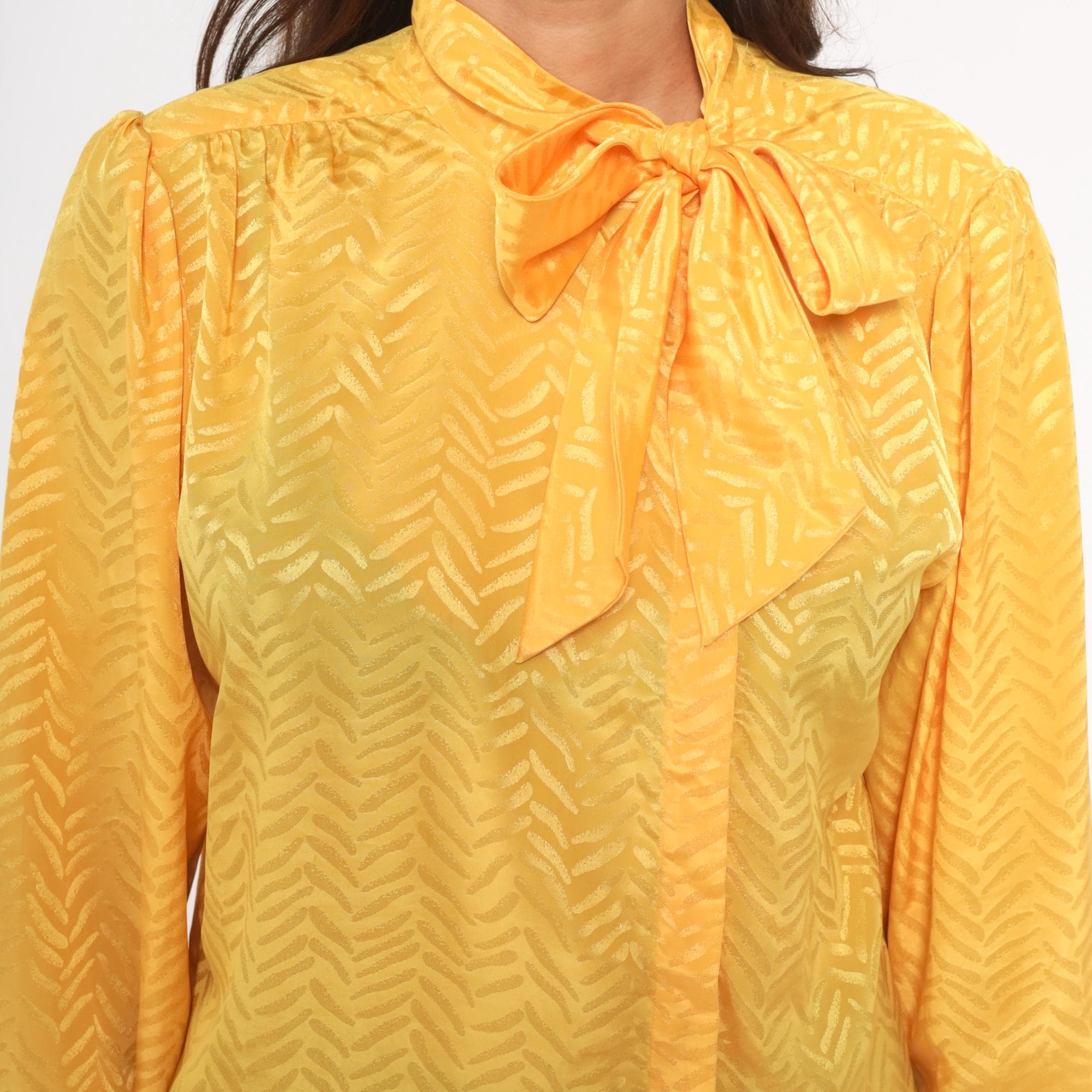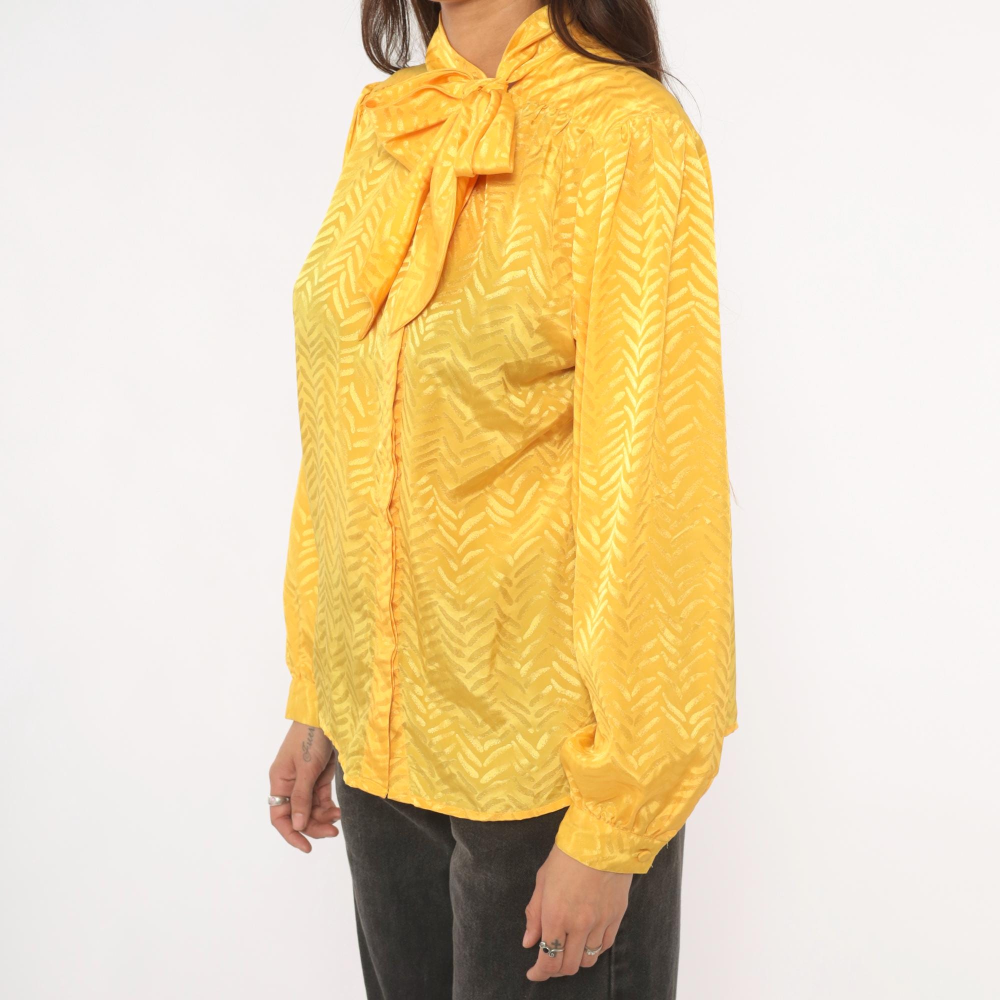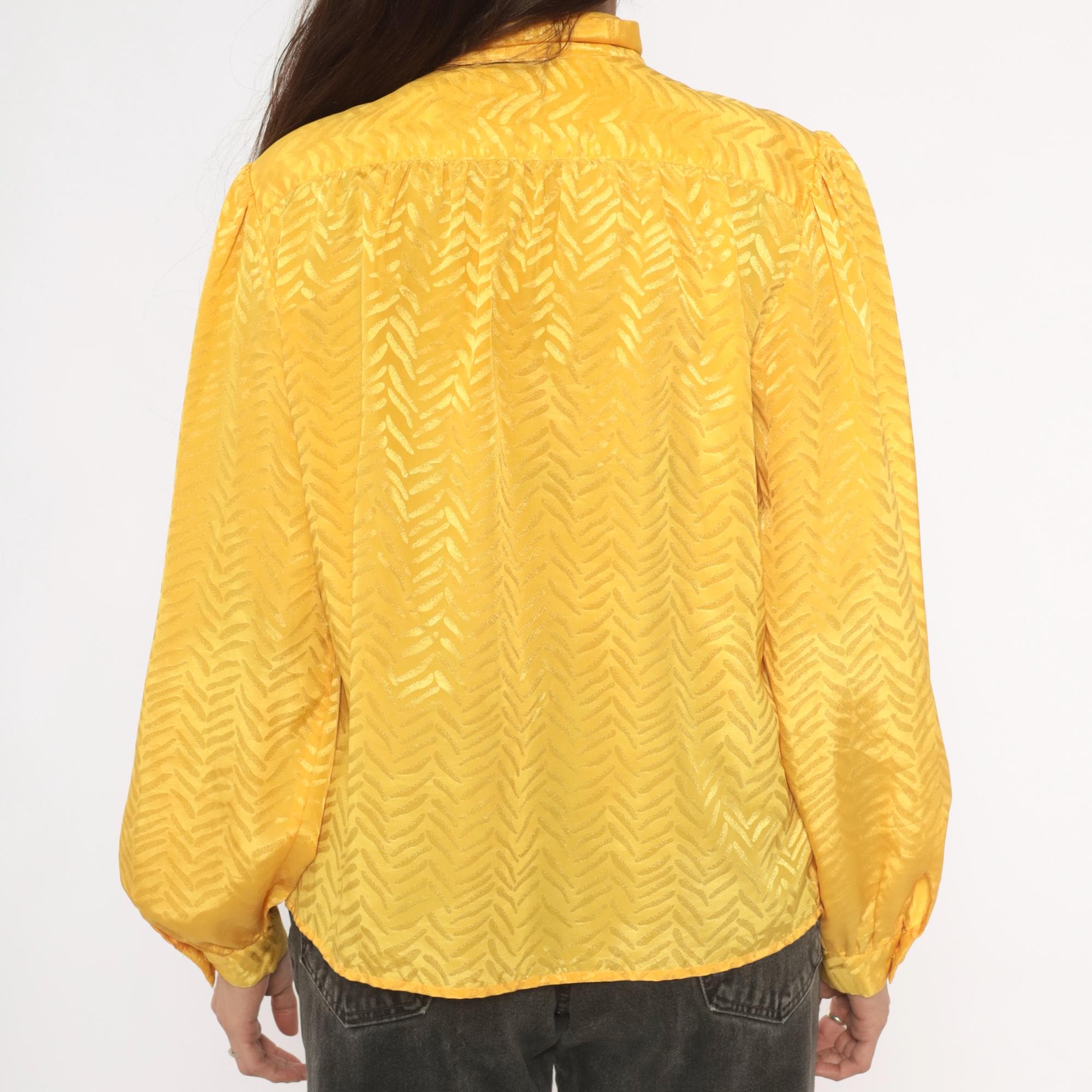80s golden yellow pussy bow blouse from Josephine with a tonal chevron jacquard pattern throughout. Button front closure, gathered shoulders, and full puff sleeves with elasticized cuffs. The neck tie drapes down the front in a wide sash bow, and the back yoke has soft gathers below the seam.