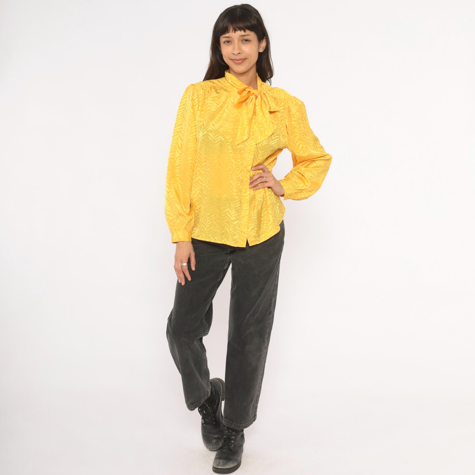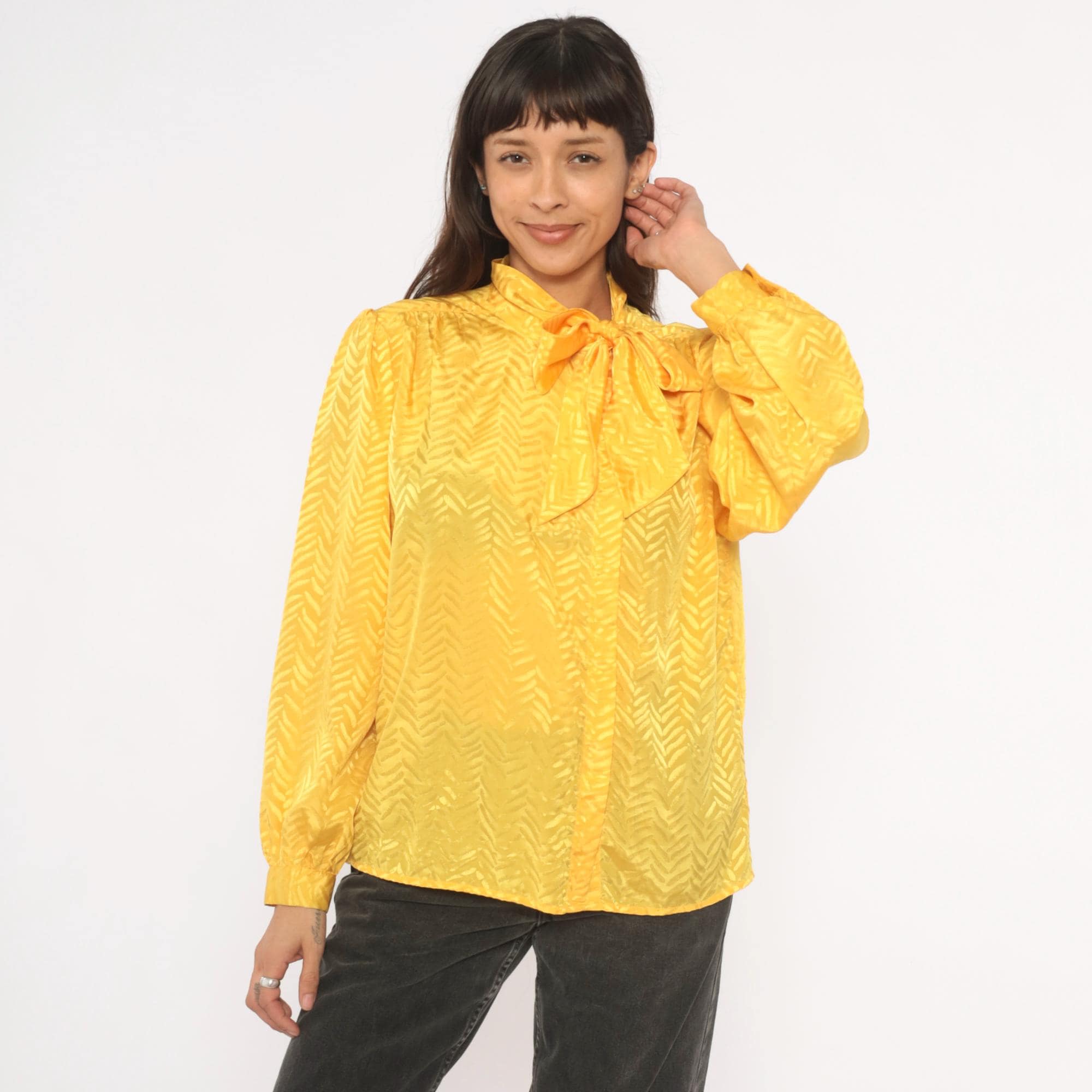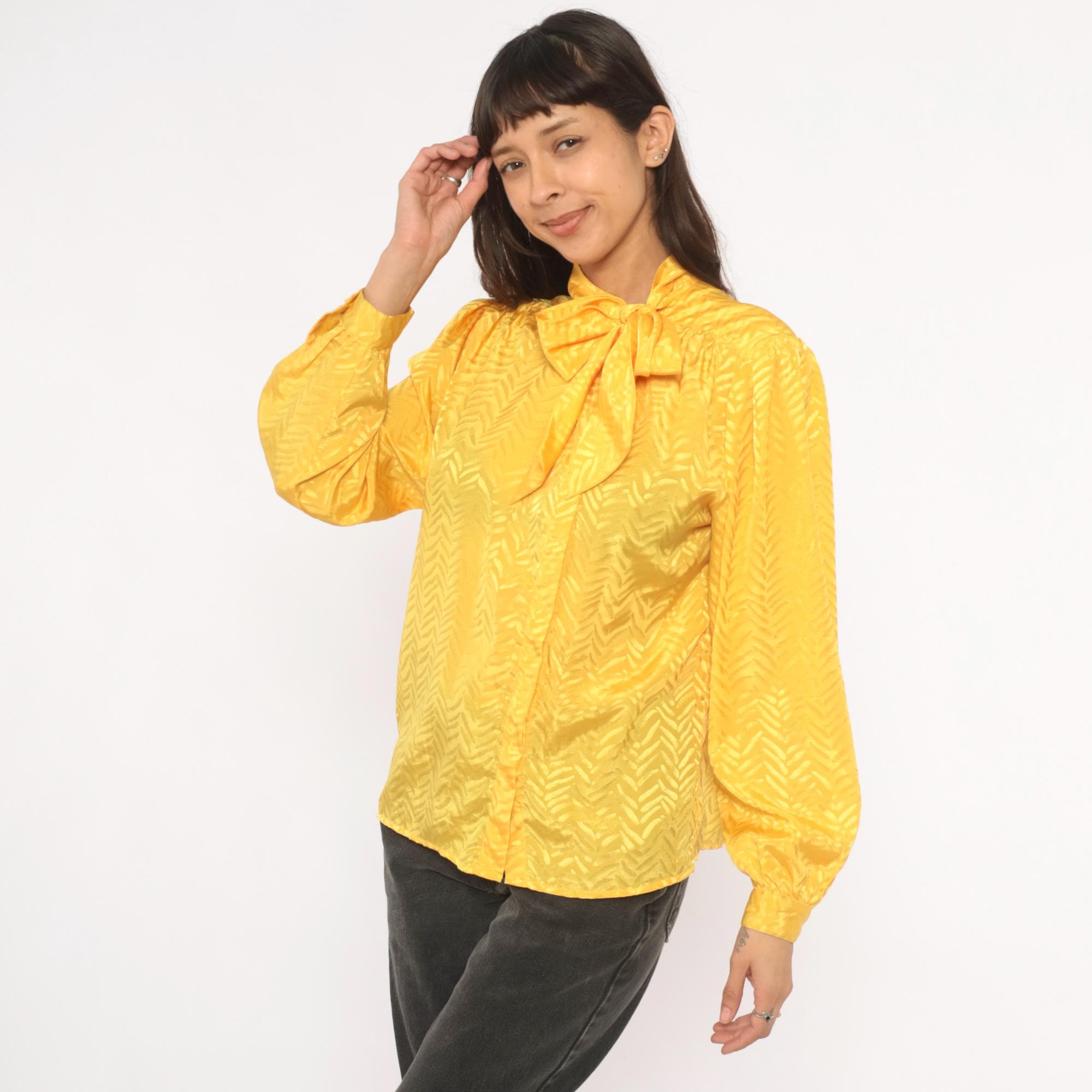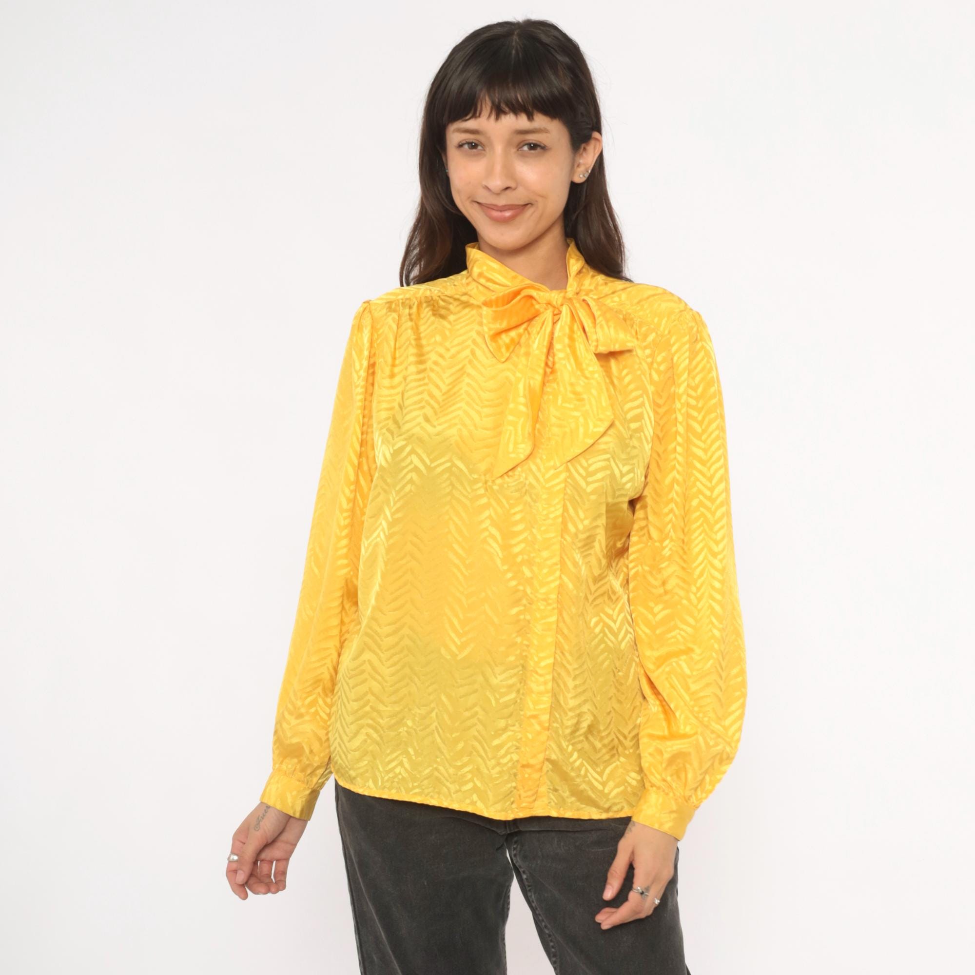 80s golden yellow pussy bow blouse from Josephine with a tonal chevron jacquard pattern throughout. Button front closure, gathered shoulders, and full puff sleeves with elasticized cuffs. The neck tie drapes down the front in a wide sash bow, and the back yoke has soft gathers below the seam.
