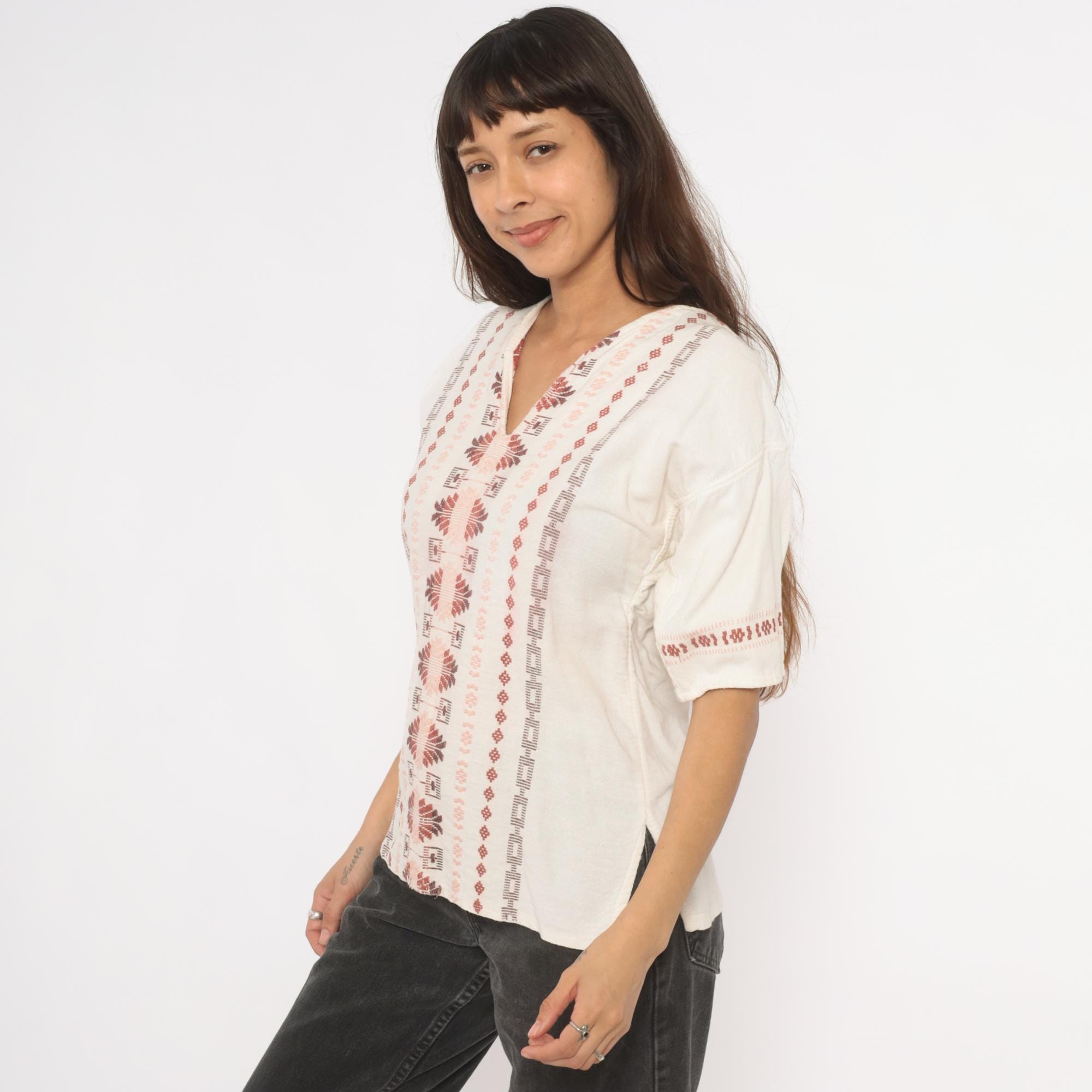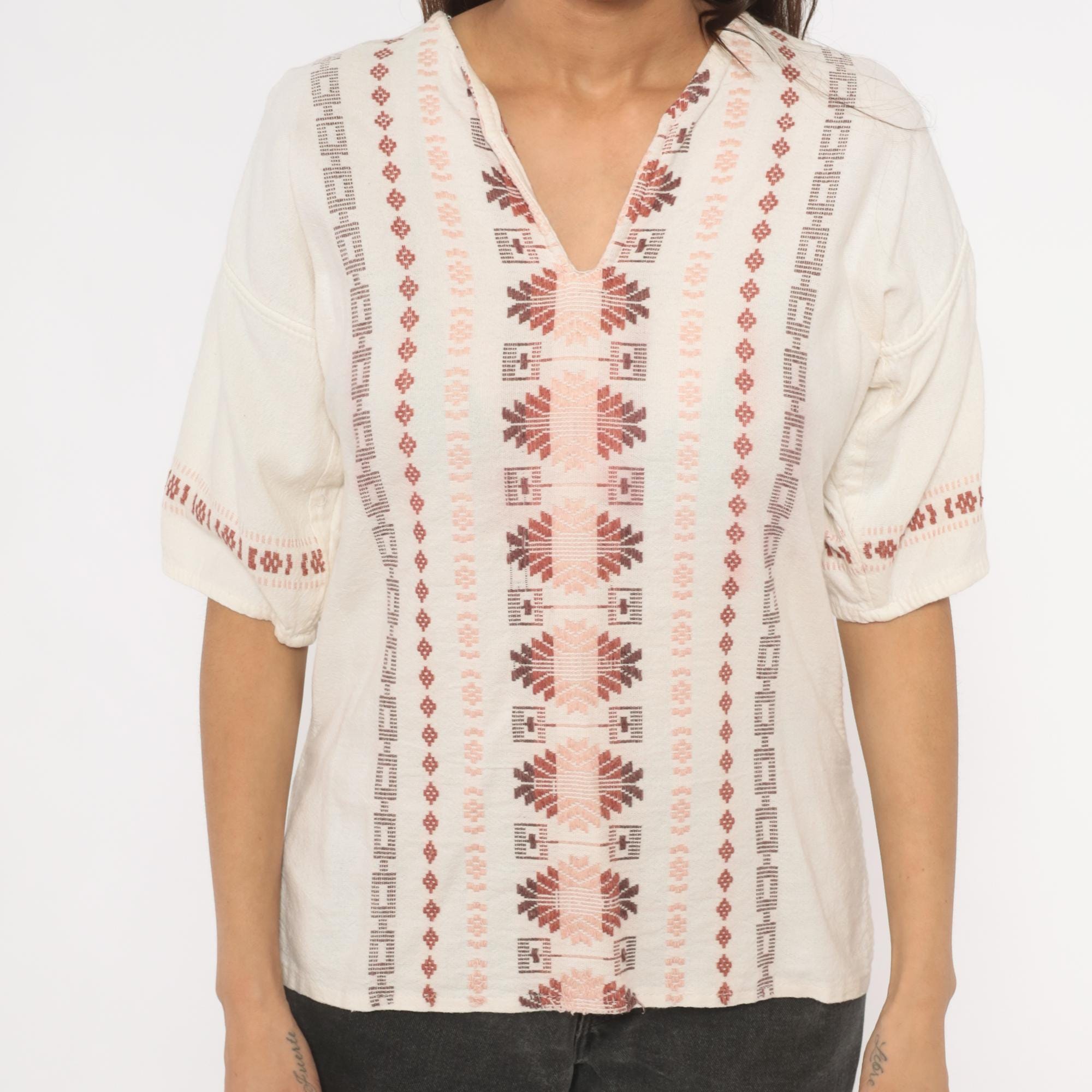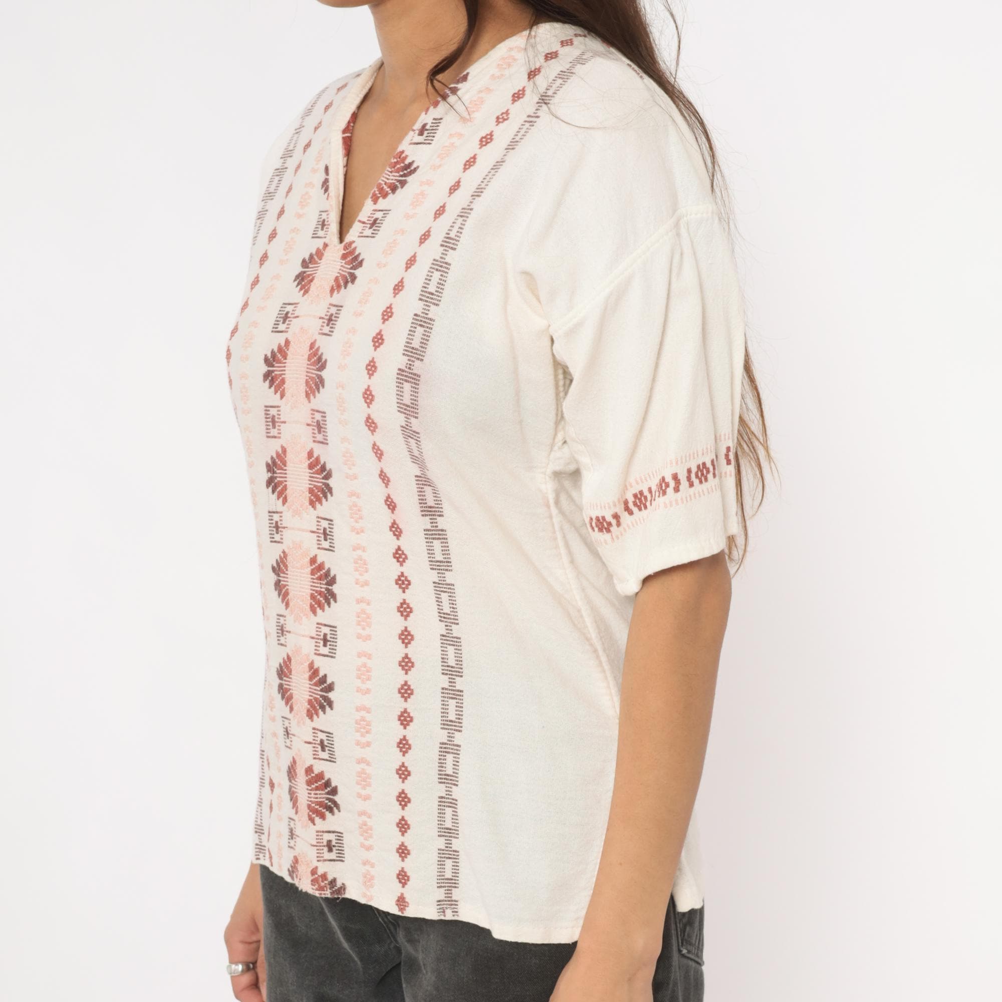 90s cream pullover blouse with woven geometric and floral embroidery down the front placket, along the neckline yoke, and around each sleeve cuff. V-neck opening with notched split neckline, short puff sleeves gathered at elasticized cuffs. The back features an embroidered yoke panel with a pointed chevron shape, and the body is plain ivory below.
