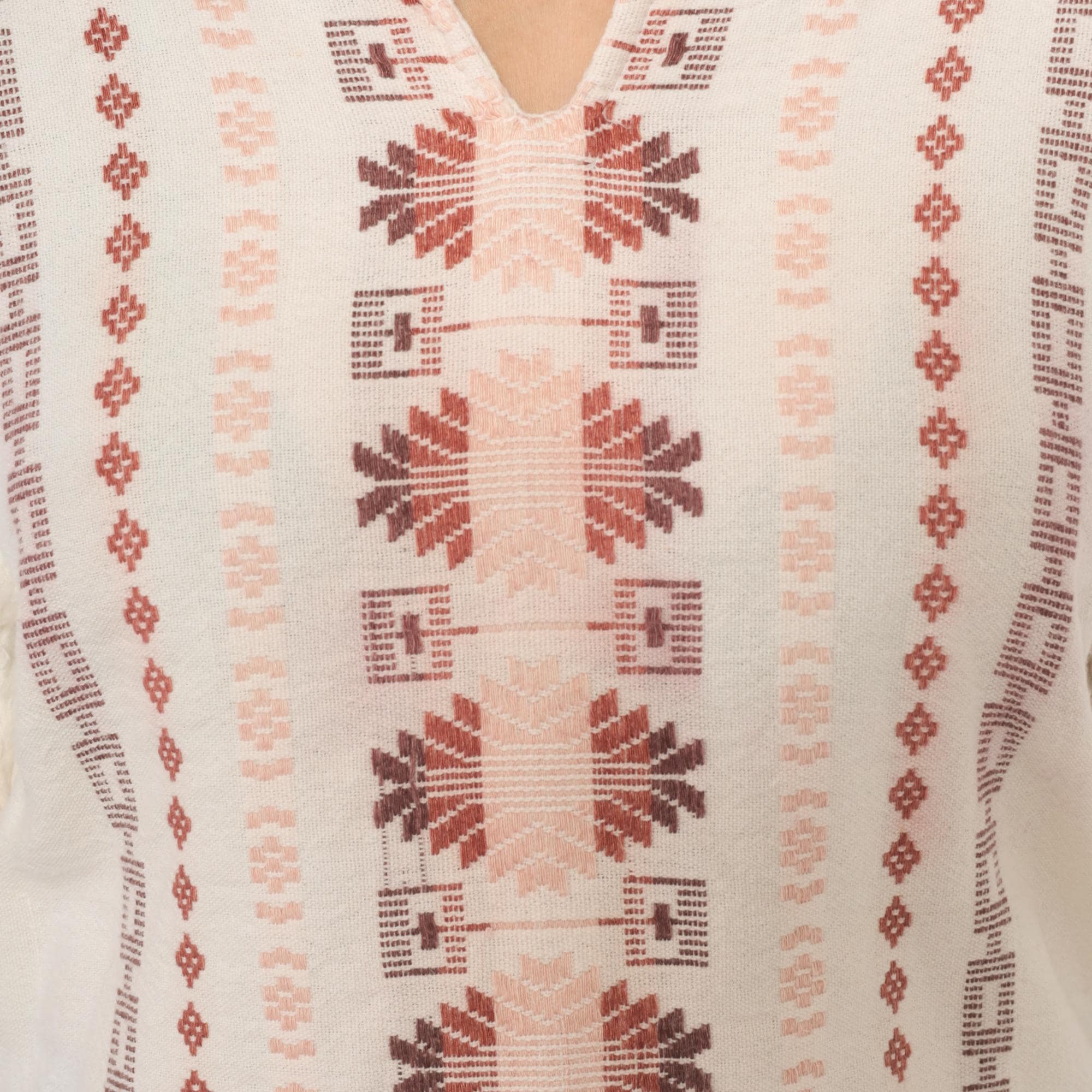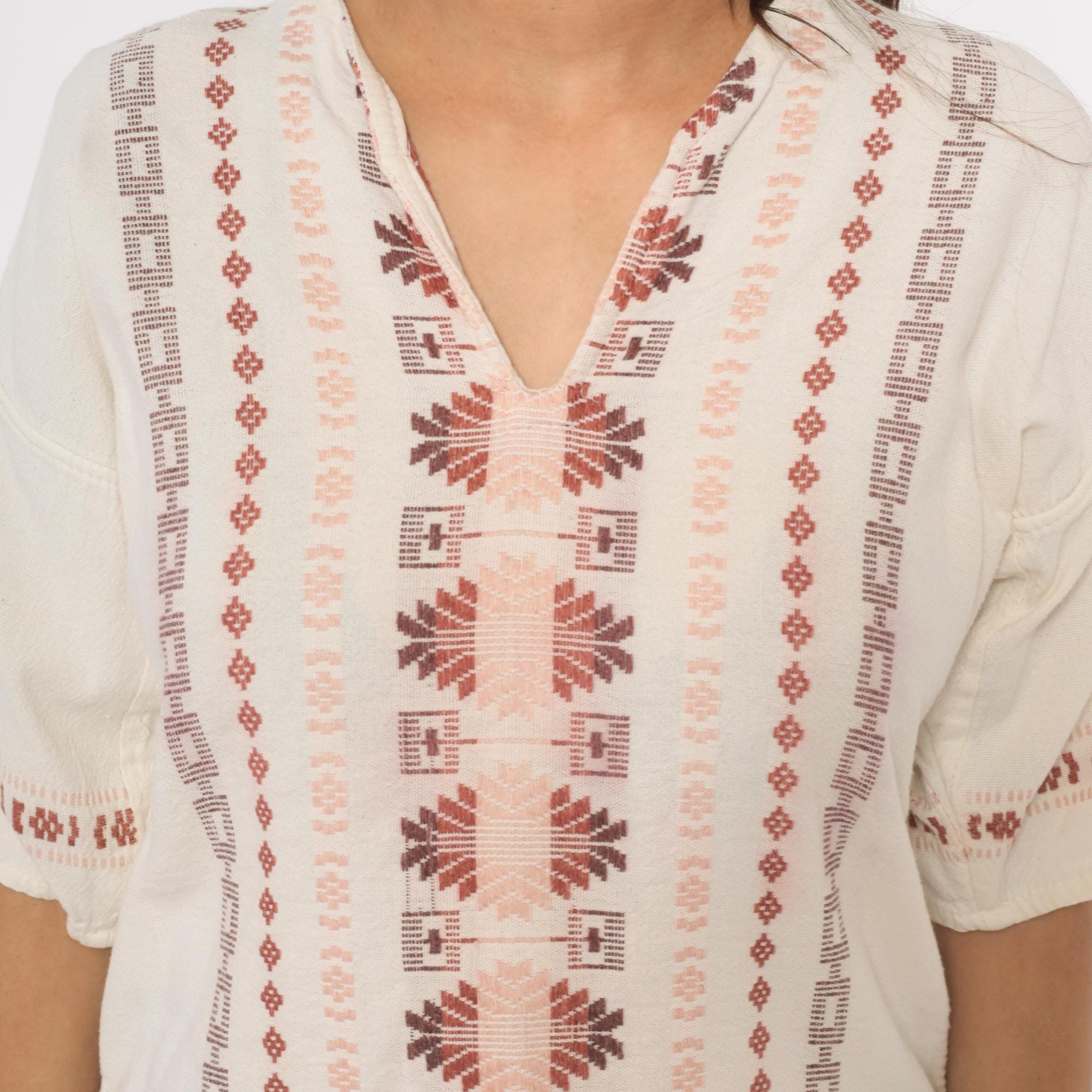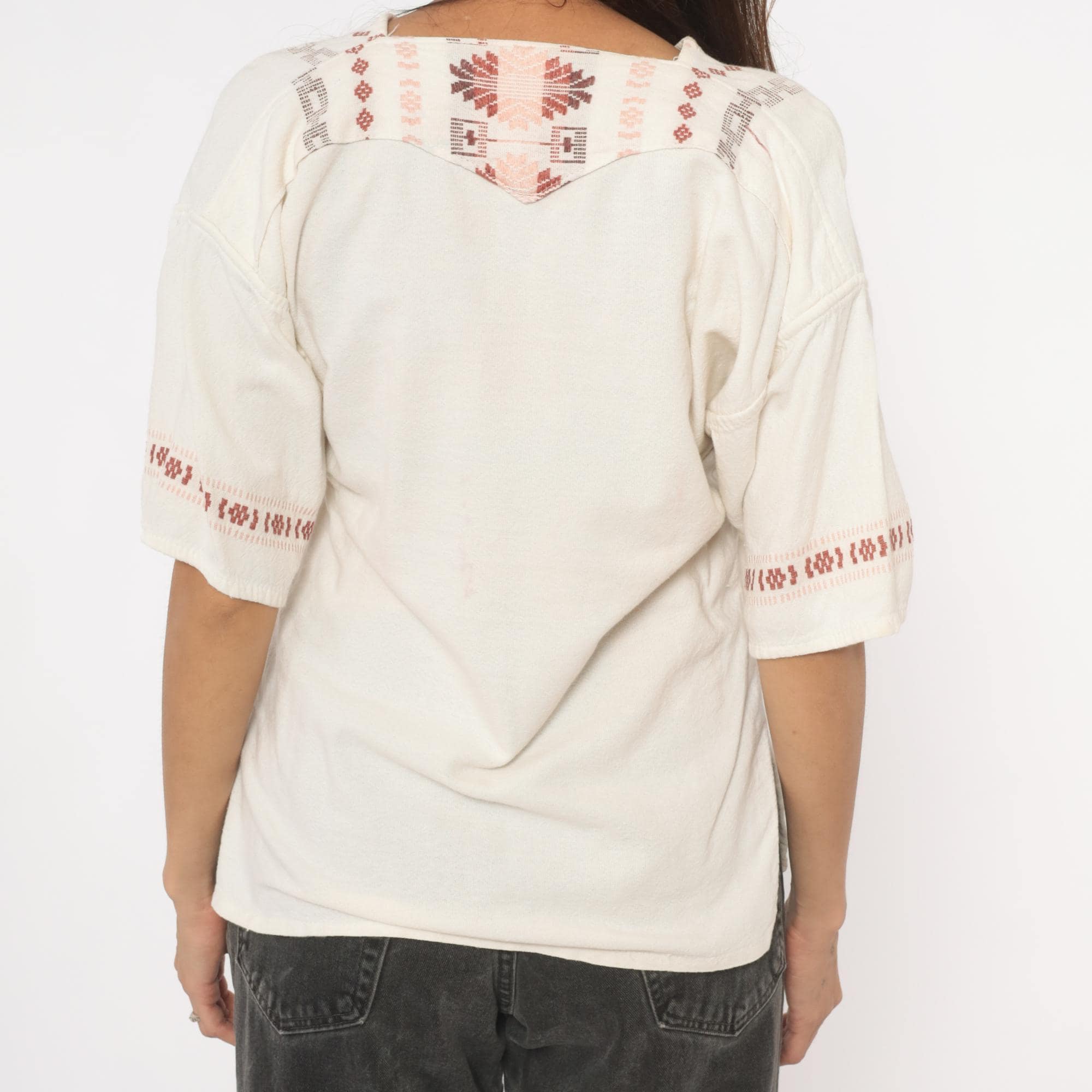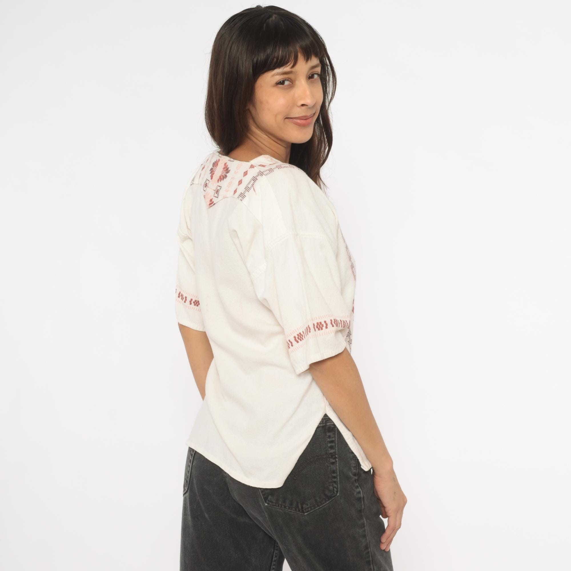 90s cream pullover blouse with woven geometric and floral embroidery down the front placket, along the neckline yoke, and around each sleeve cuff. V-neck opening with notched split neckline, short puff sleeves gathered at elasticized cuffs. The back features an embroidered yoke panel with a pointed chevron shape, and the body is plain ivory below.
