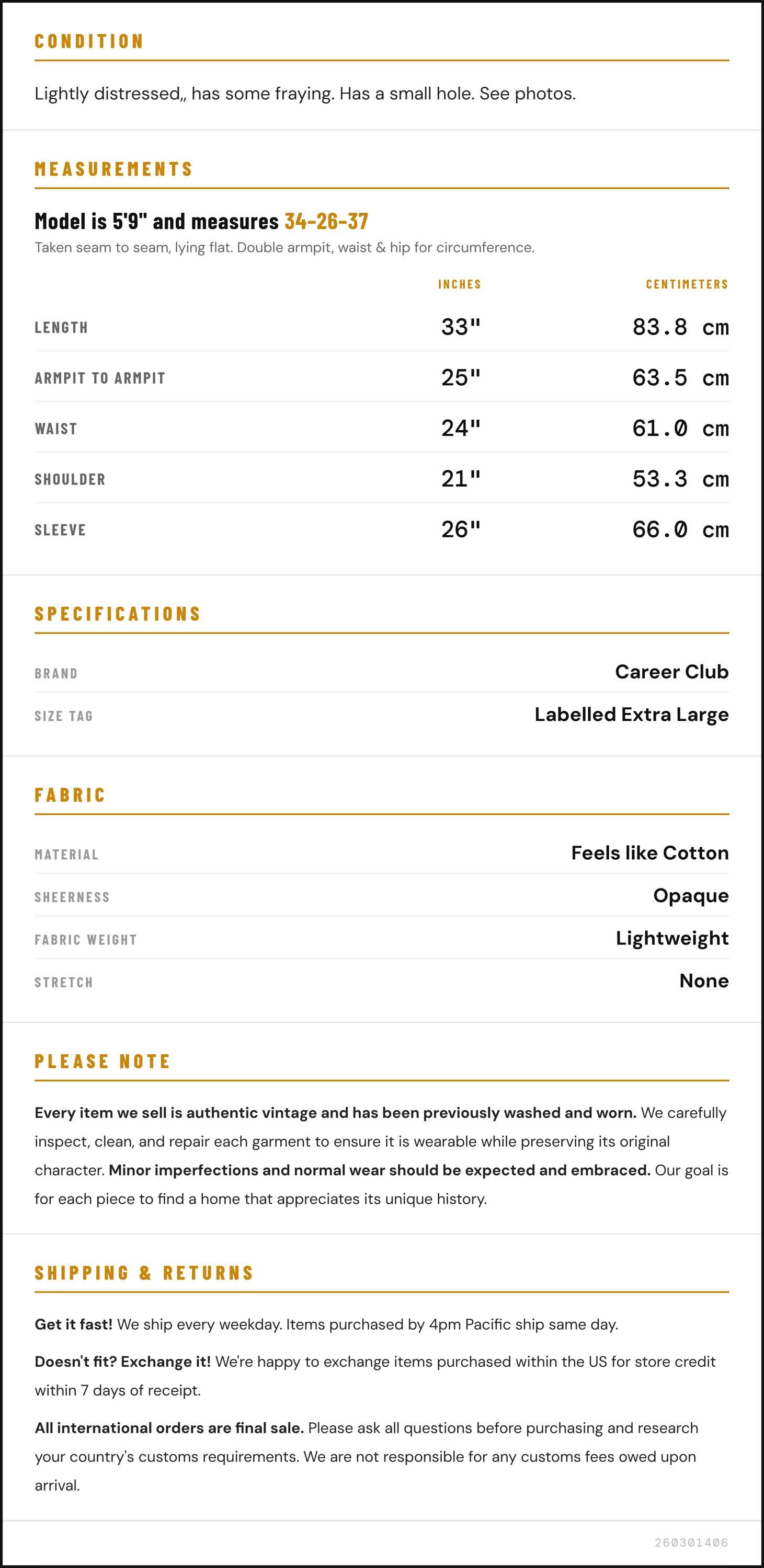 Sleeve: 26" / 66.0 cm