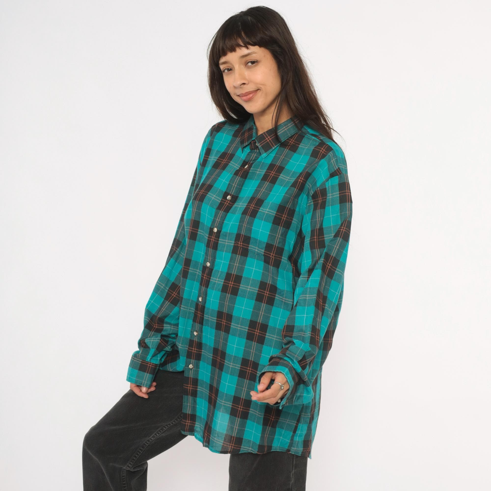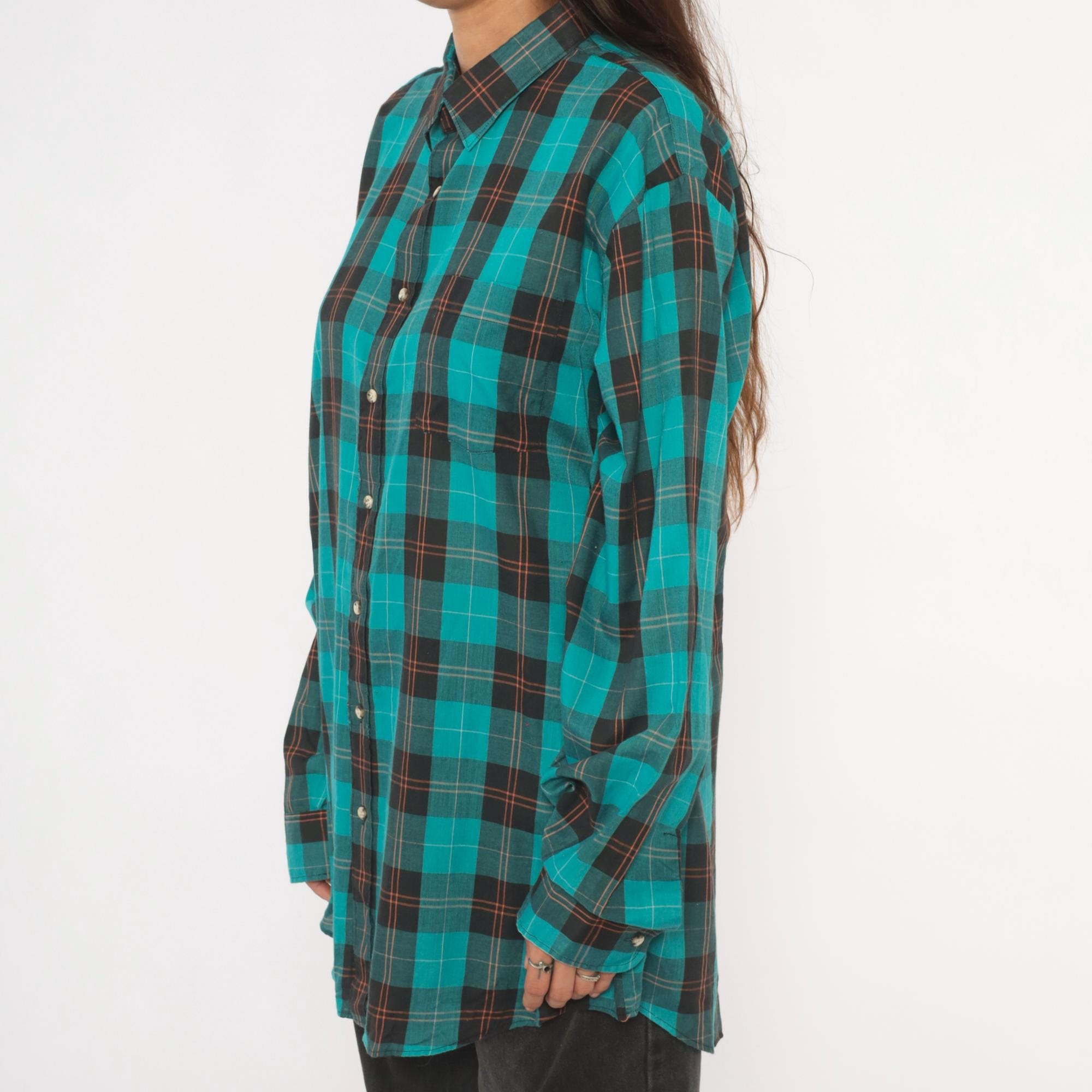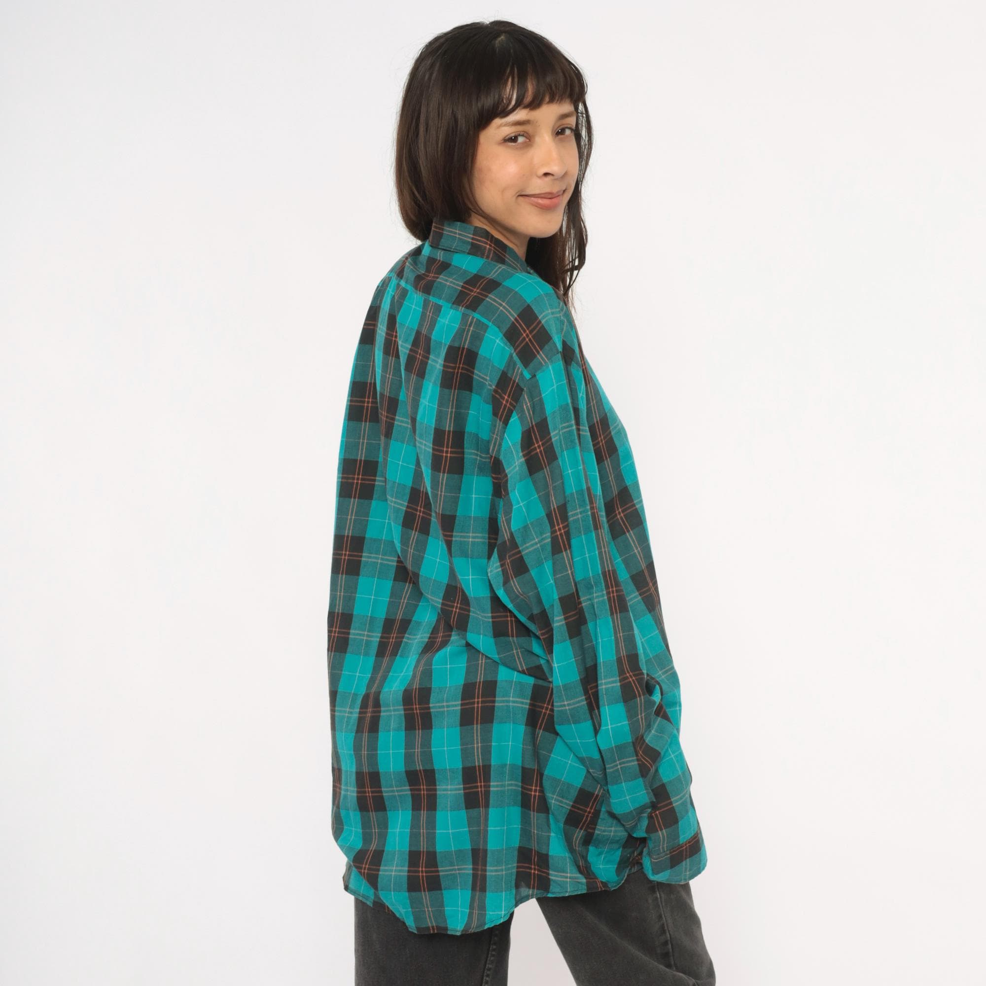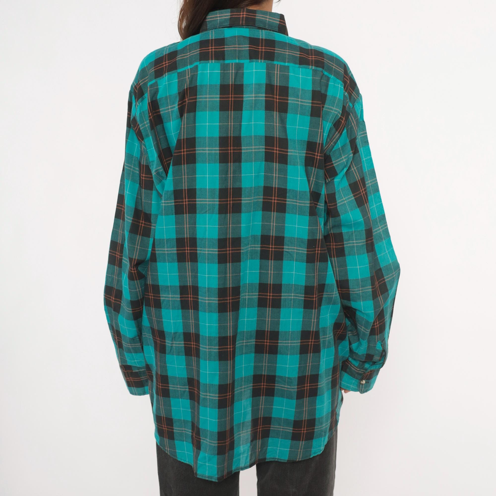 90s teal and black plaid flannel shirt from Career Club with a full button front closure and pointed collar. Long sleeves with buttoned cuffs and a relaxed, straight-cut body. The plaid pattern combines teal, black, and thin red and white accent lines throughout.
