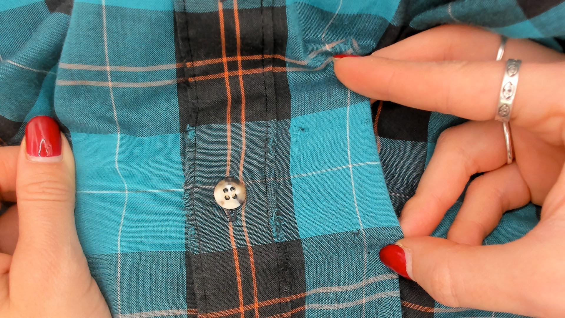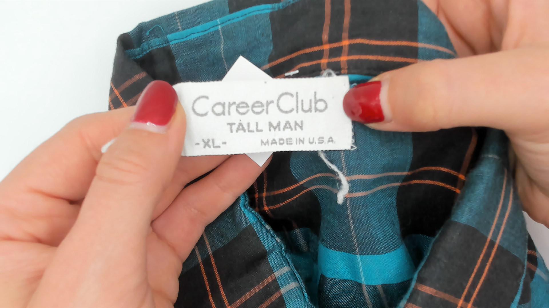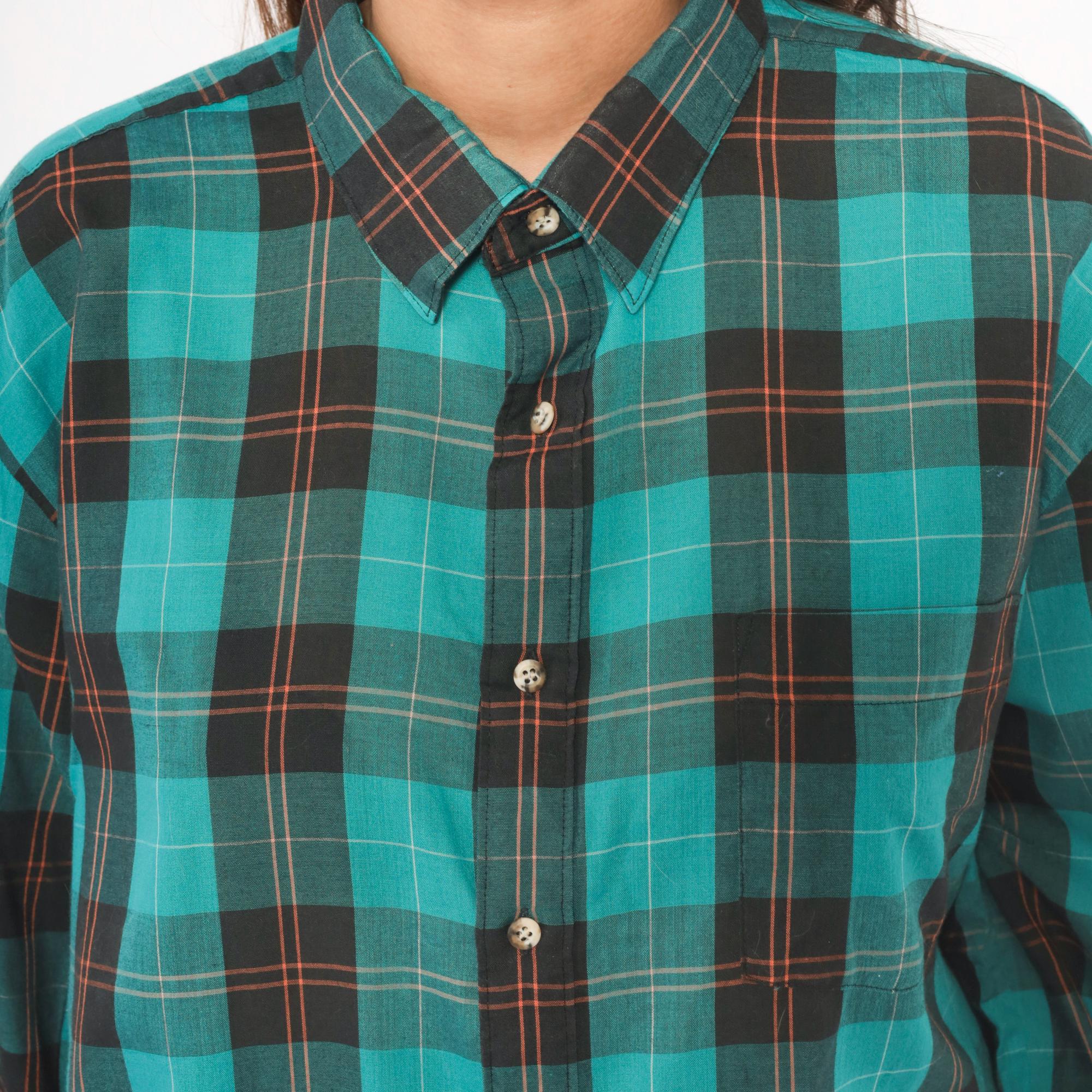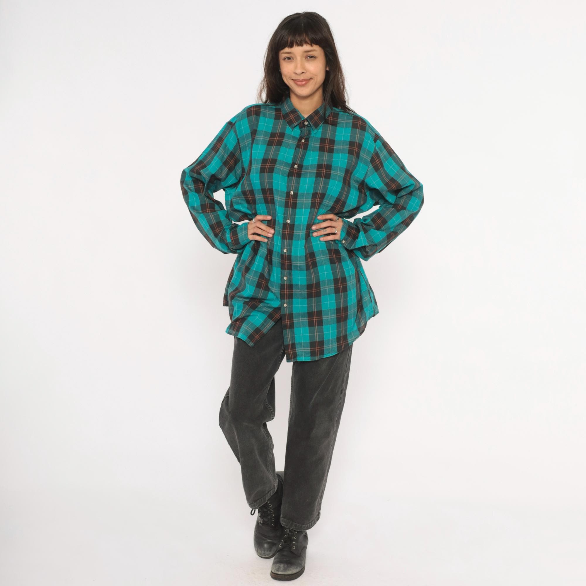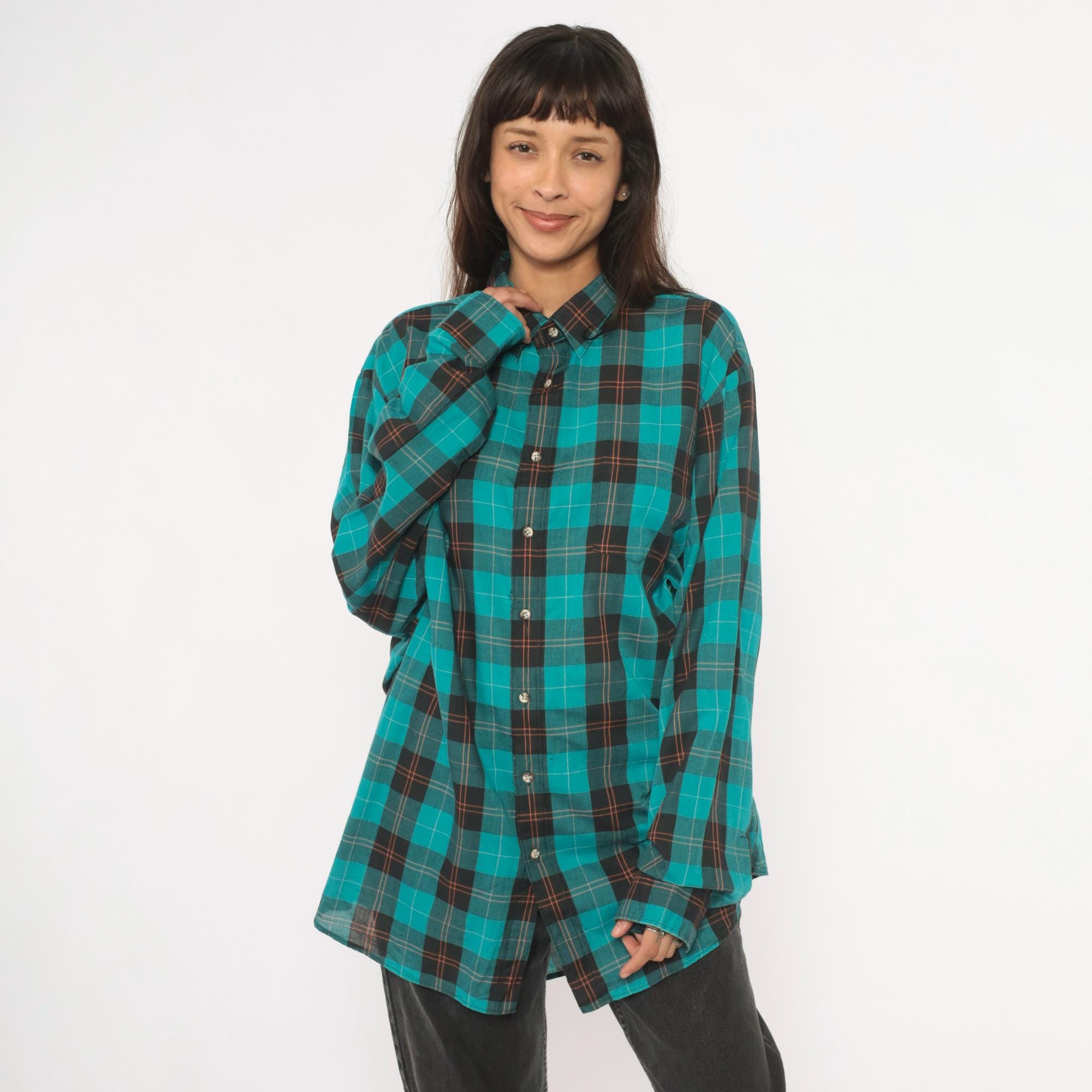 90s teal and black plaid flannel shirt from Career Club with a full button front closure and pointed collar. Long sleeves with buttoned cuffs and a relaxed, straight-cut body. The plaid pattern combines teal, black, and thin red and white accent lines throughout.