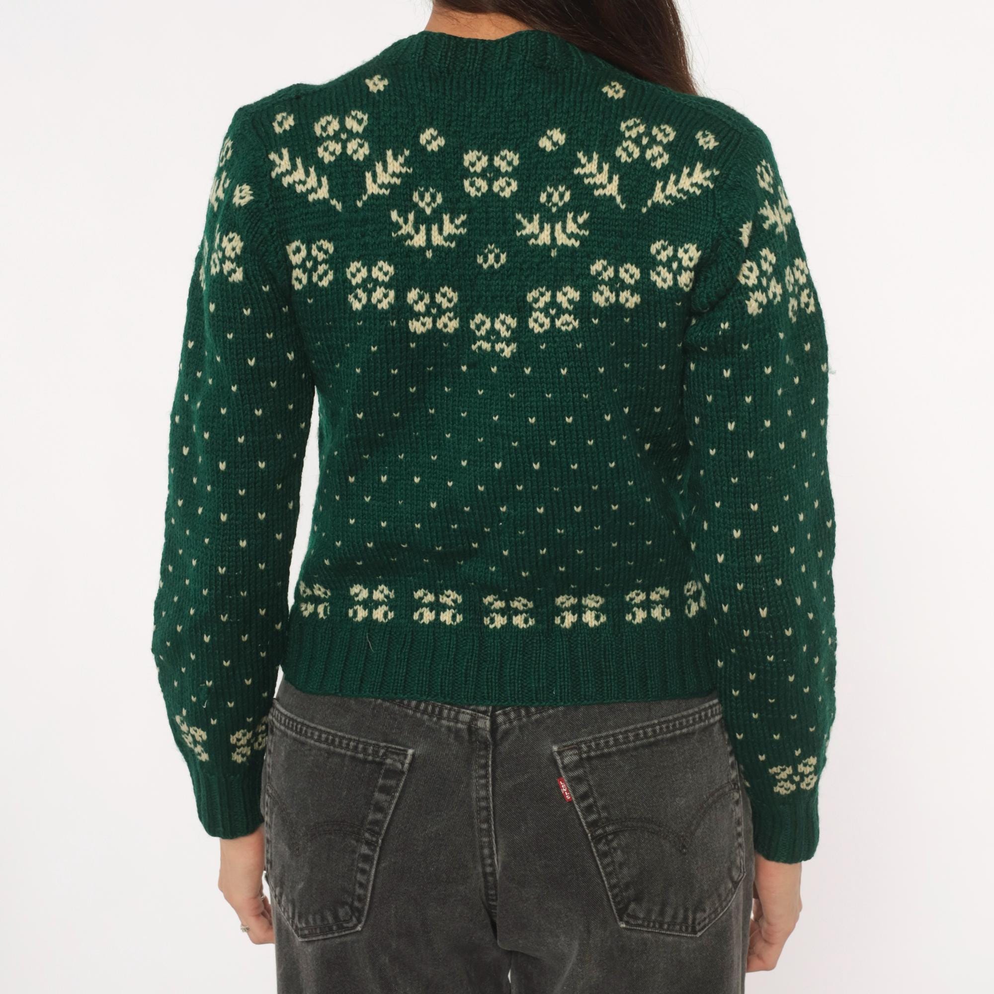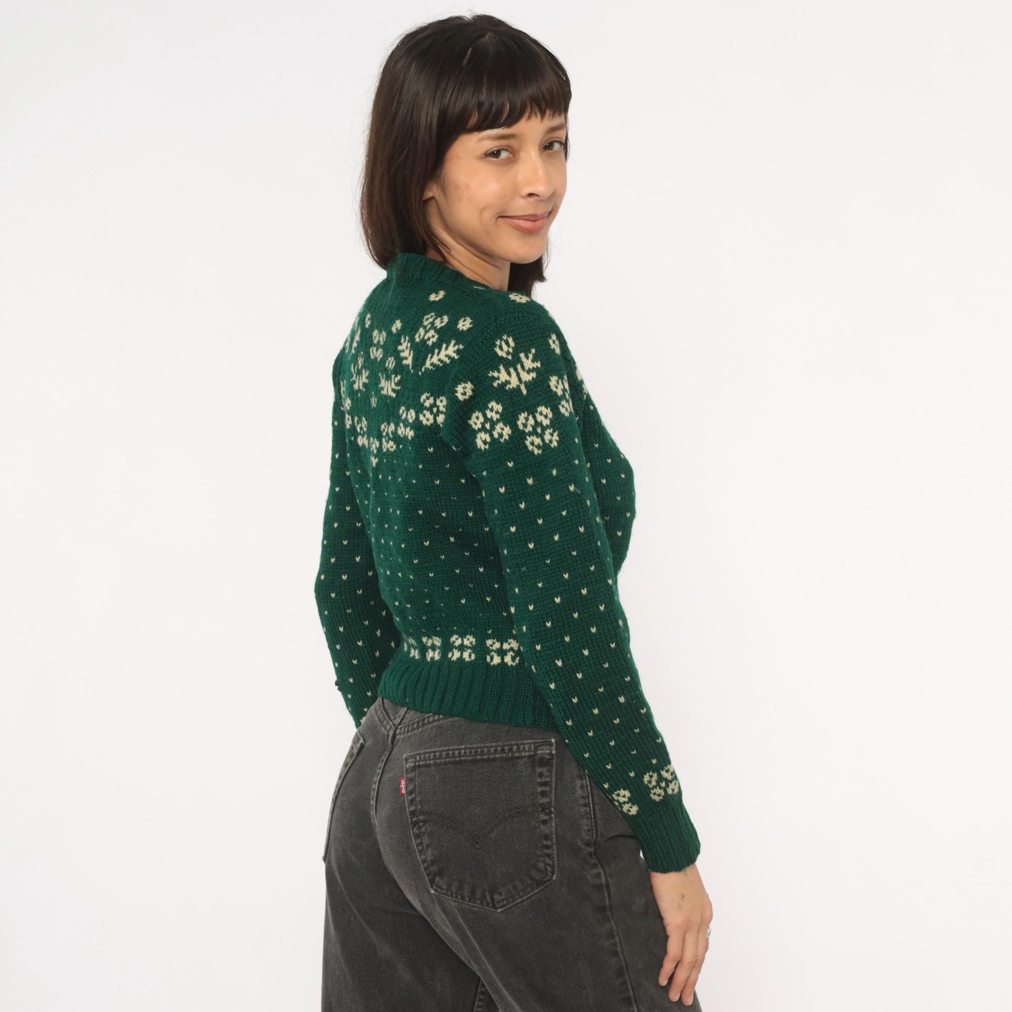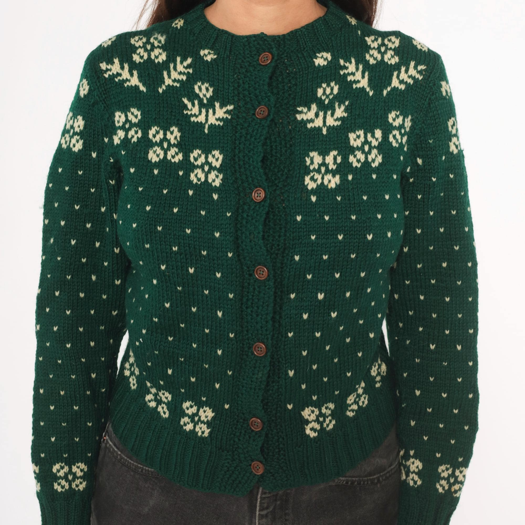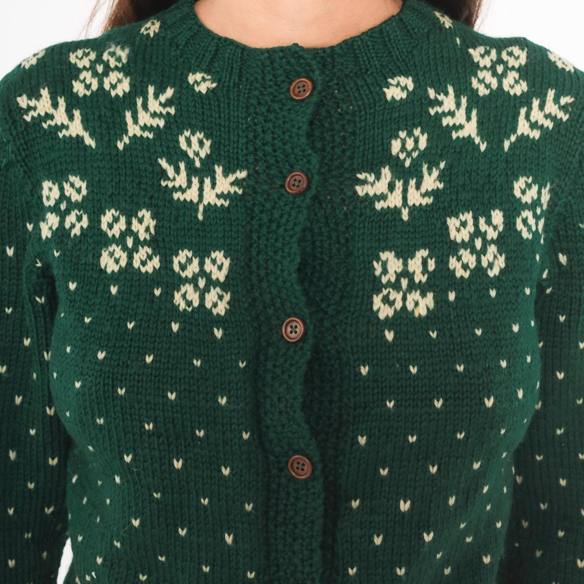 70s forest green cardigan with cream fair isle knit pattern across the body and sleeves, including snowflake and floral motifs with scattered small dot accents. Crew neckline, button front closure with brown buttons, and ribbed cuffs, collar, and hem. Fitted silhouette with long sleeves and a cropped length that hits at the hip.