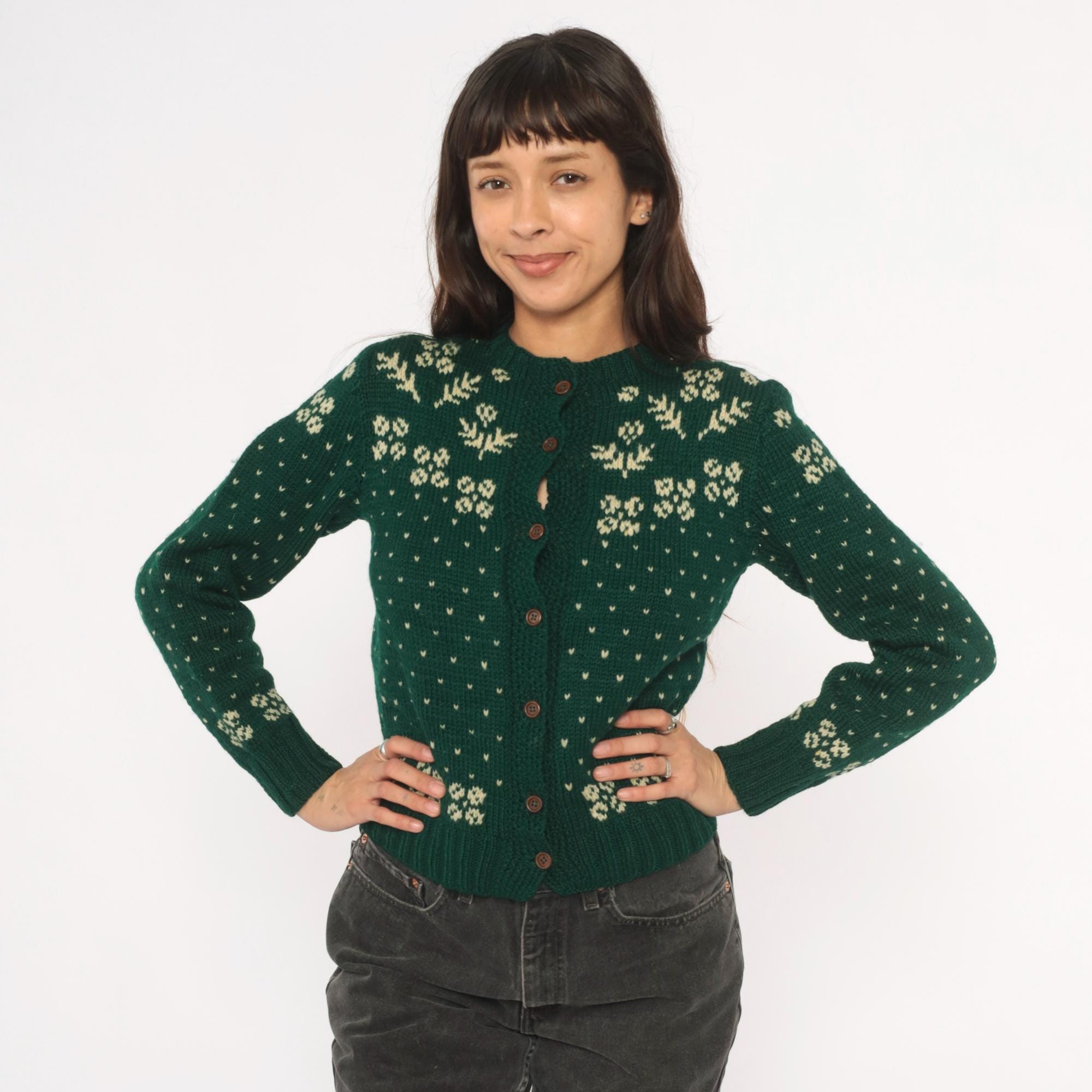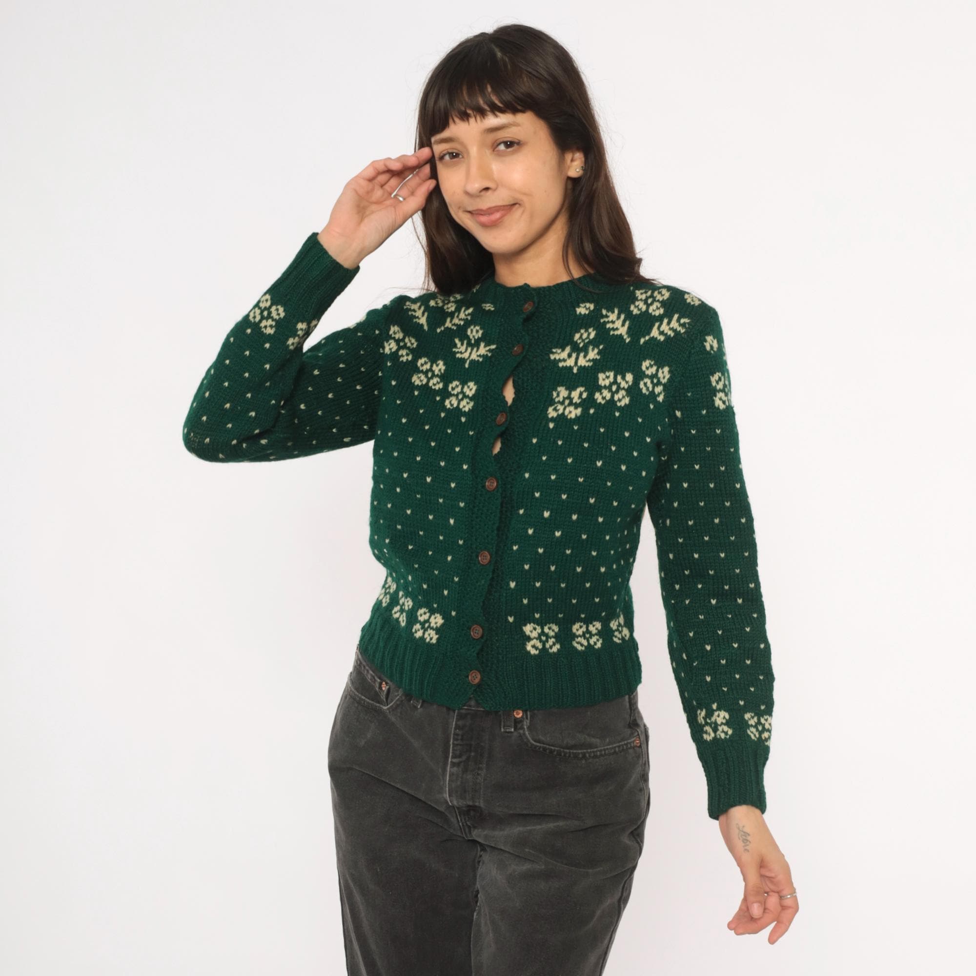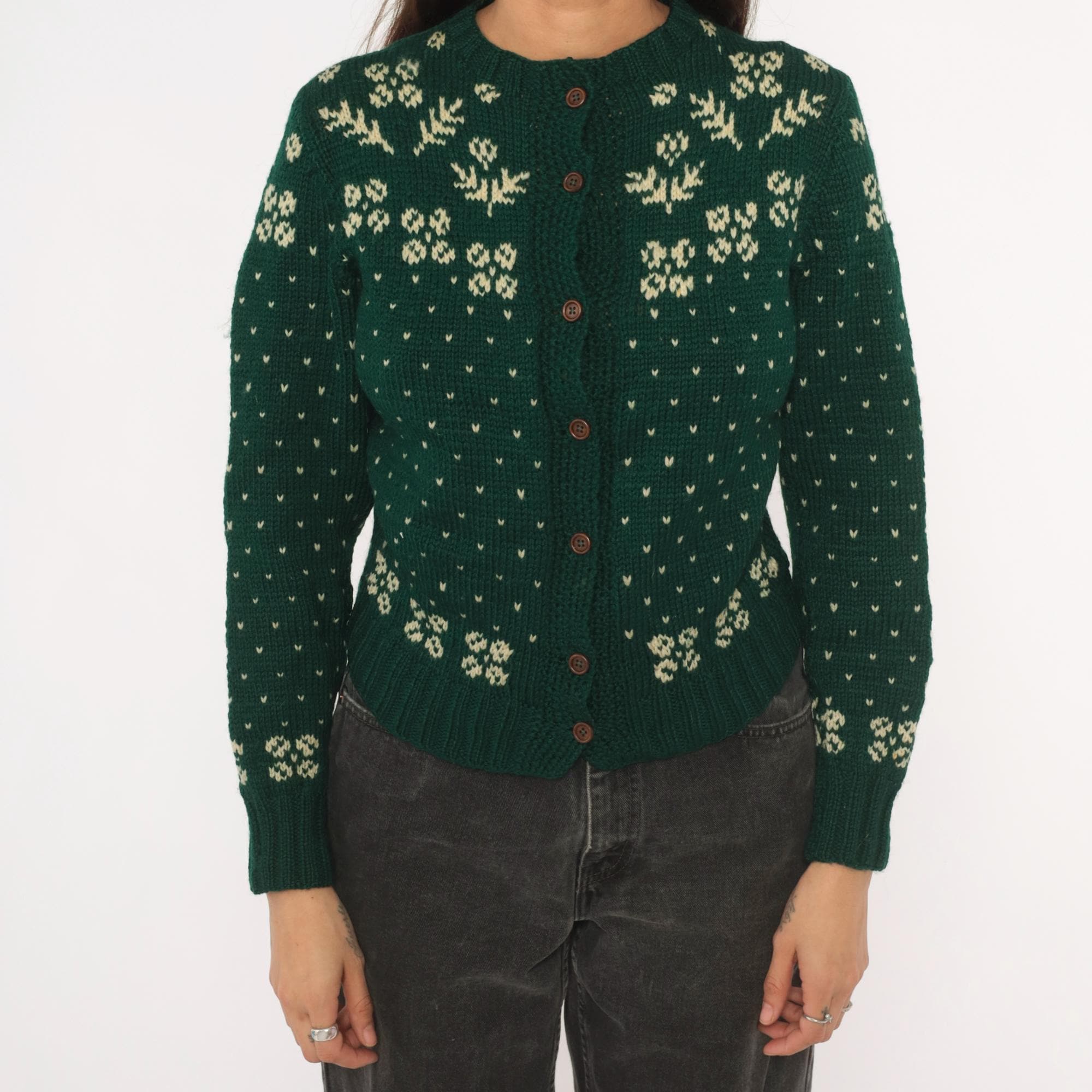70s forest green cardigan with cream fair isle knit pattern across the body and sleeves, including snowflake and floral motifs with scattered small dot accents. Crew neckline, button front closure with brown buttons, and ribbed cuffs, collar, and hem. Fitted silhouette with long sleeves and a cropped length that hits at the hip.