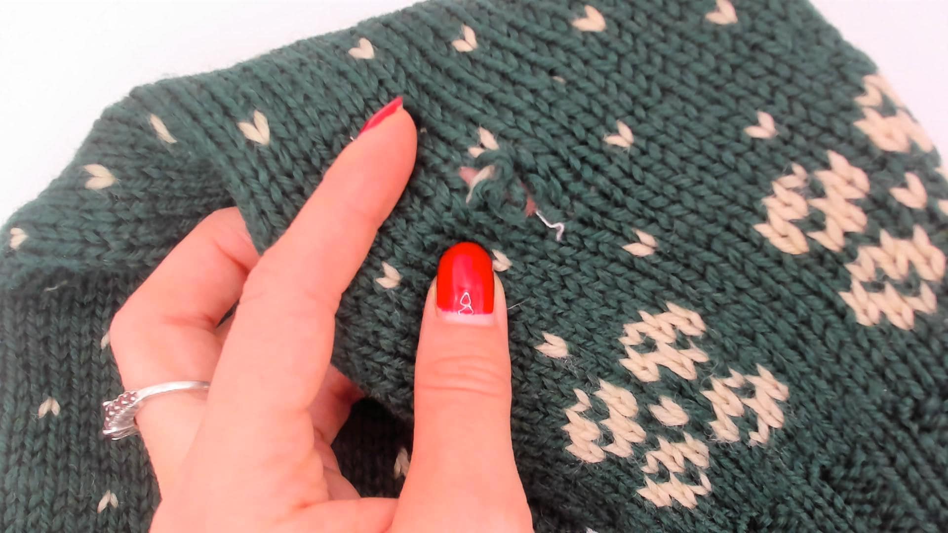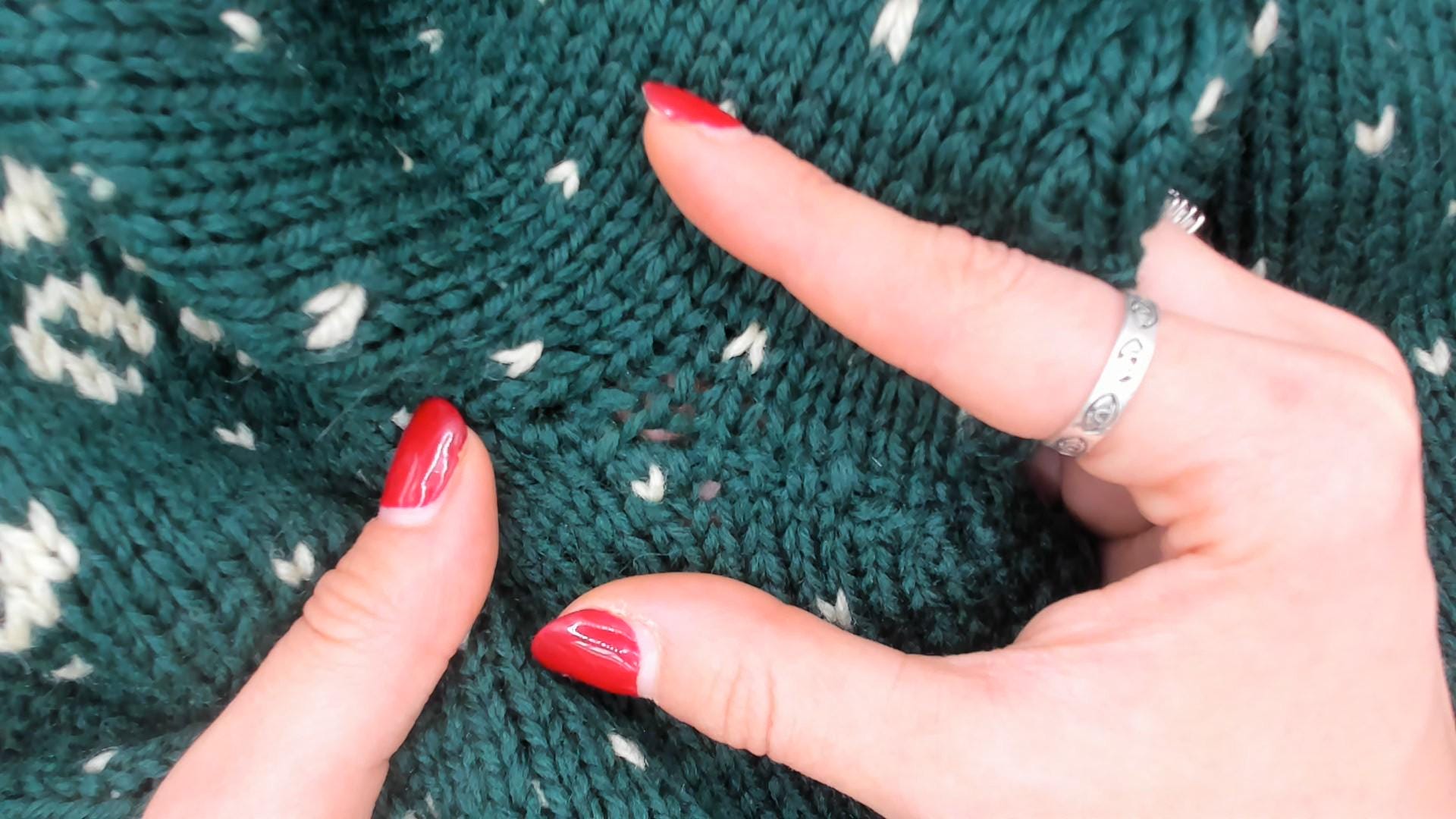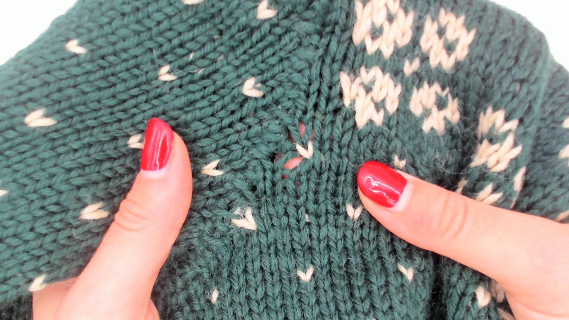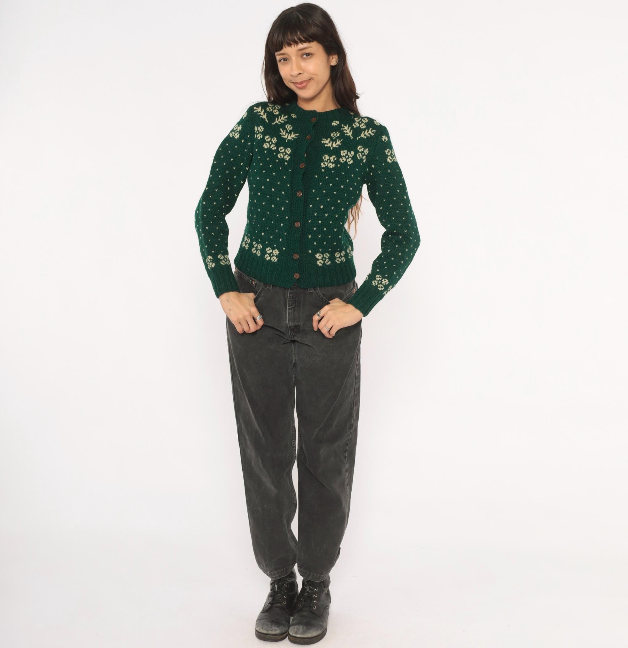 70s forest green cardigan with cream fair isle knit pattern across the body and sleeves, including snowflake and floral motifs with scattered small dot accents. Crew neckline, button front closure with brown buttons, and ribbed cuffs, collar, and hem. Fitted silhouette with long sleeves and a cropped length that hits at the hip.