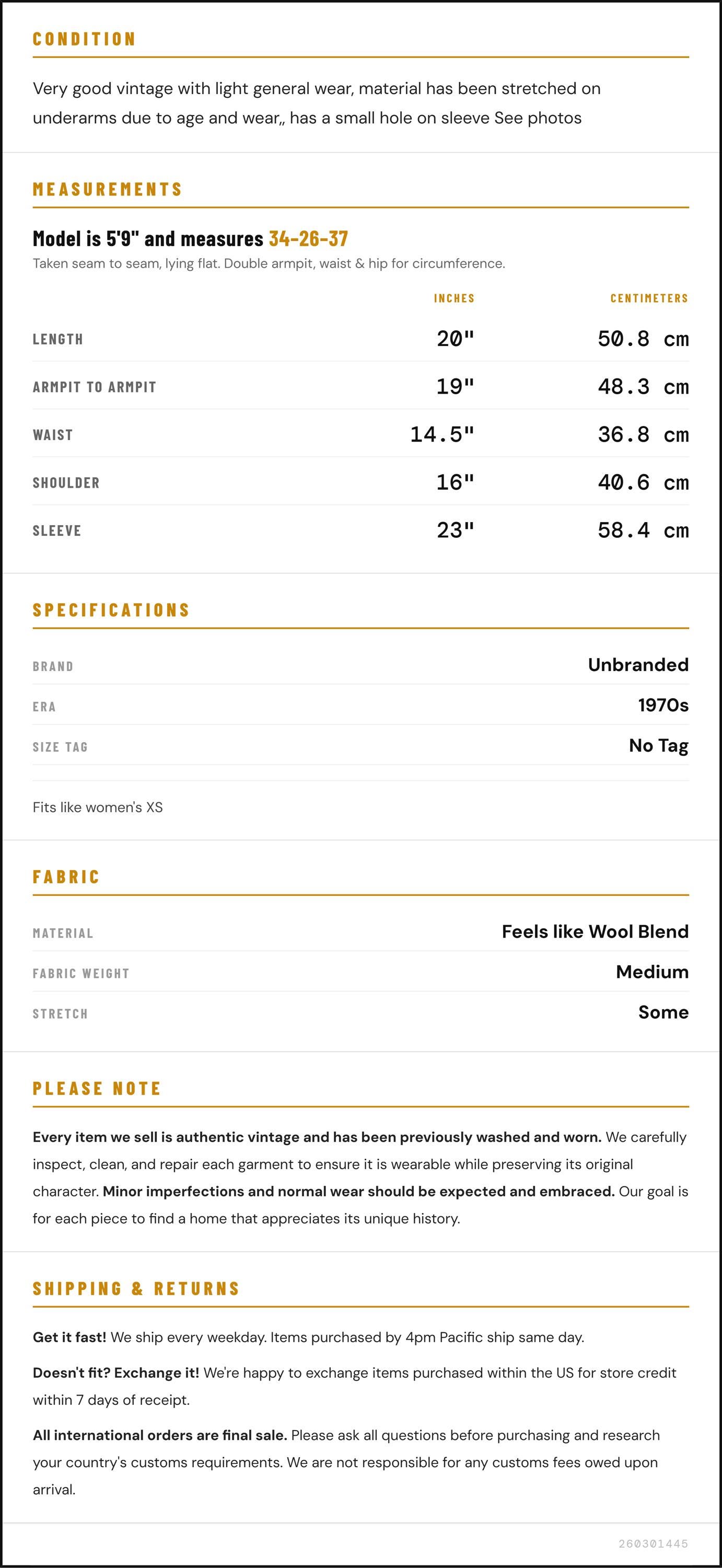 Condition: Very good vintage with light general wear, material has been stretched on underarms due to age and wear,, has a small hole on sleeve See photos