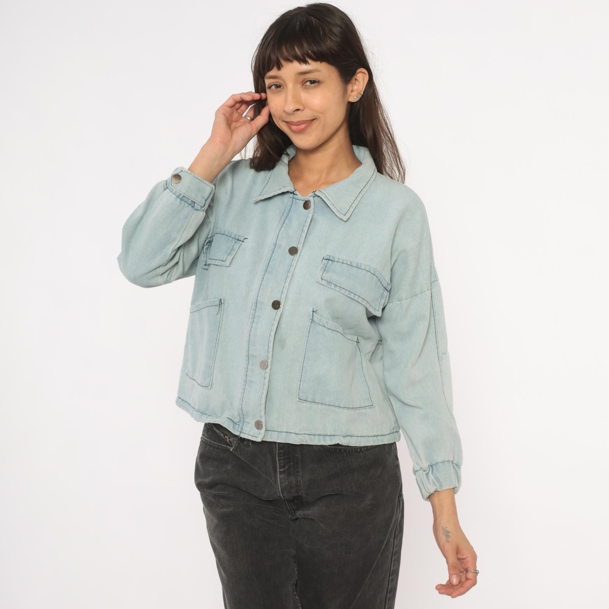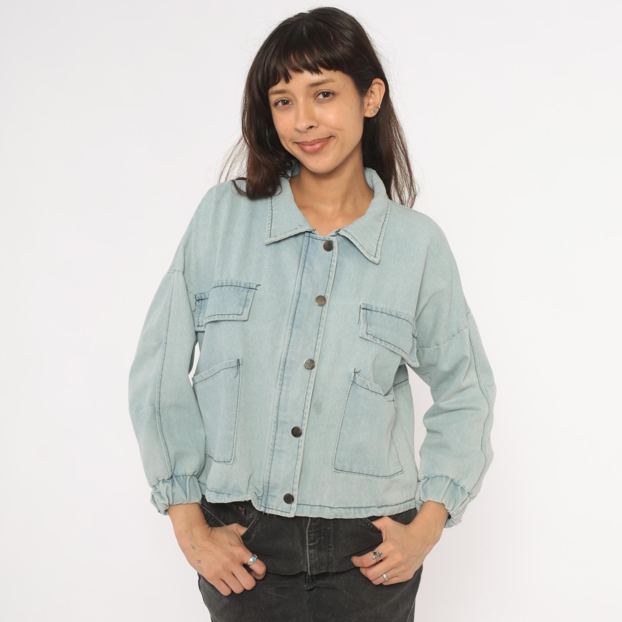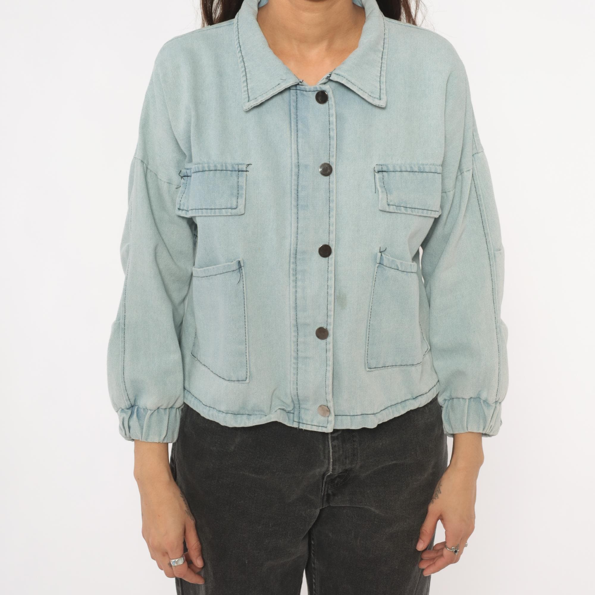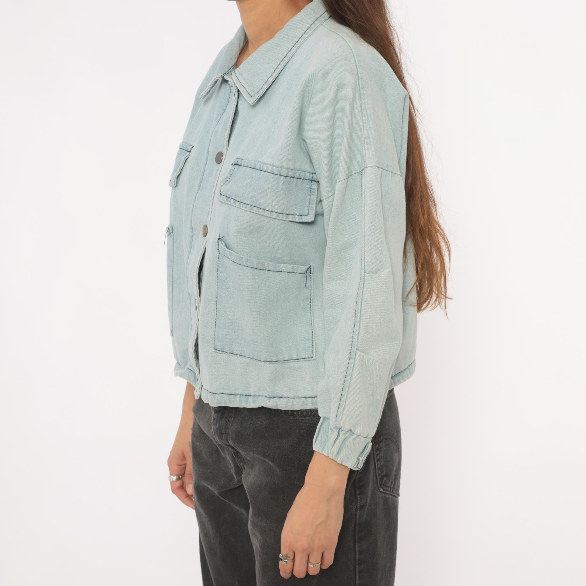 Light wash denim crop jacket from Wang Luo Niu Za with a spread collar and full snap button front closure. Four front patch pockets — two flap chest pockets and two open hip pockets — with contrast dark stitching throughout. Balloon sleeves with elasticized cuffs, elasticized hem, and a boxy cropped silhouette hitting at the waist.
