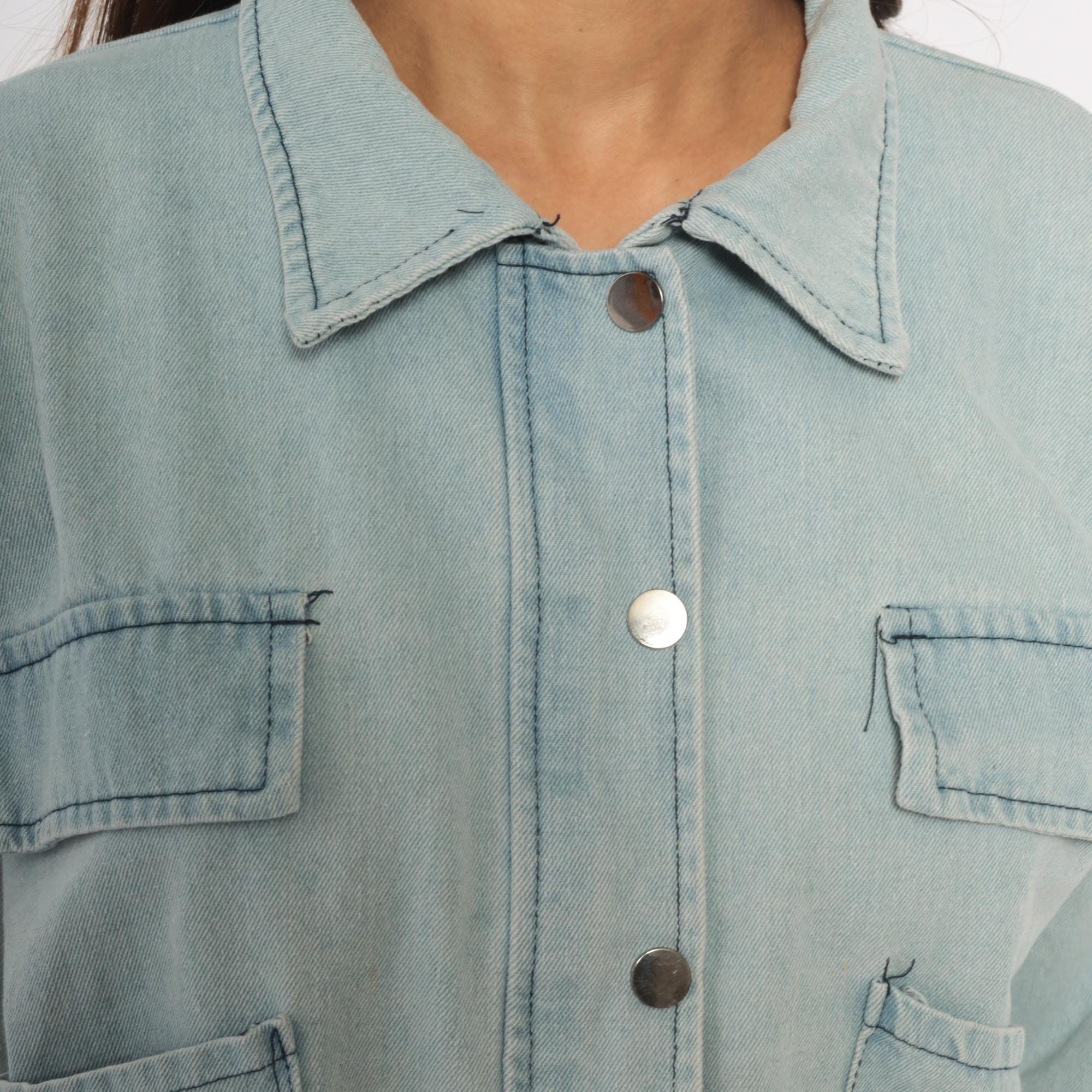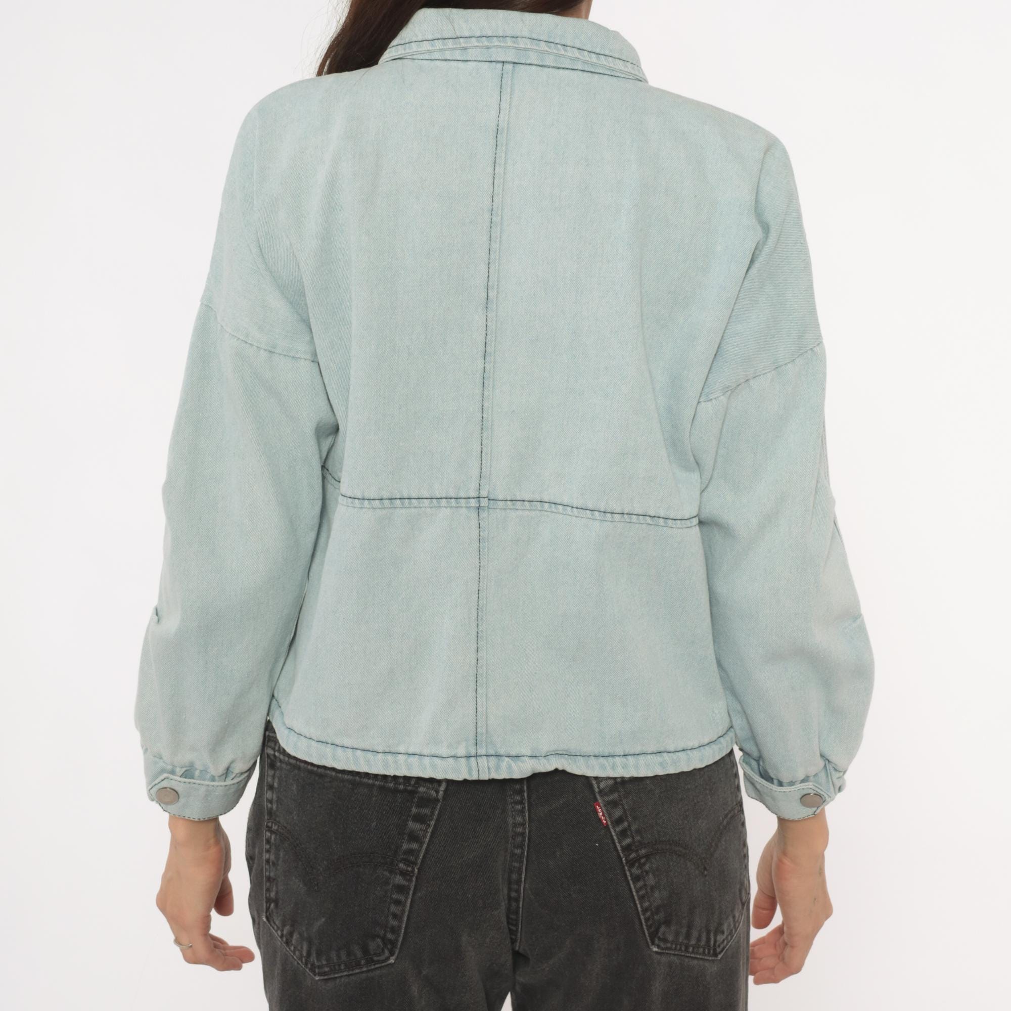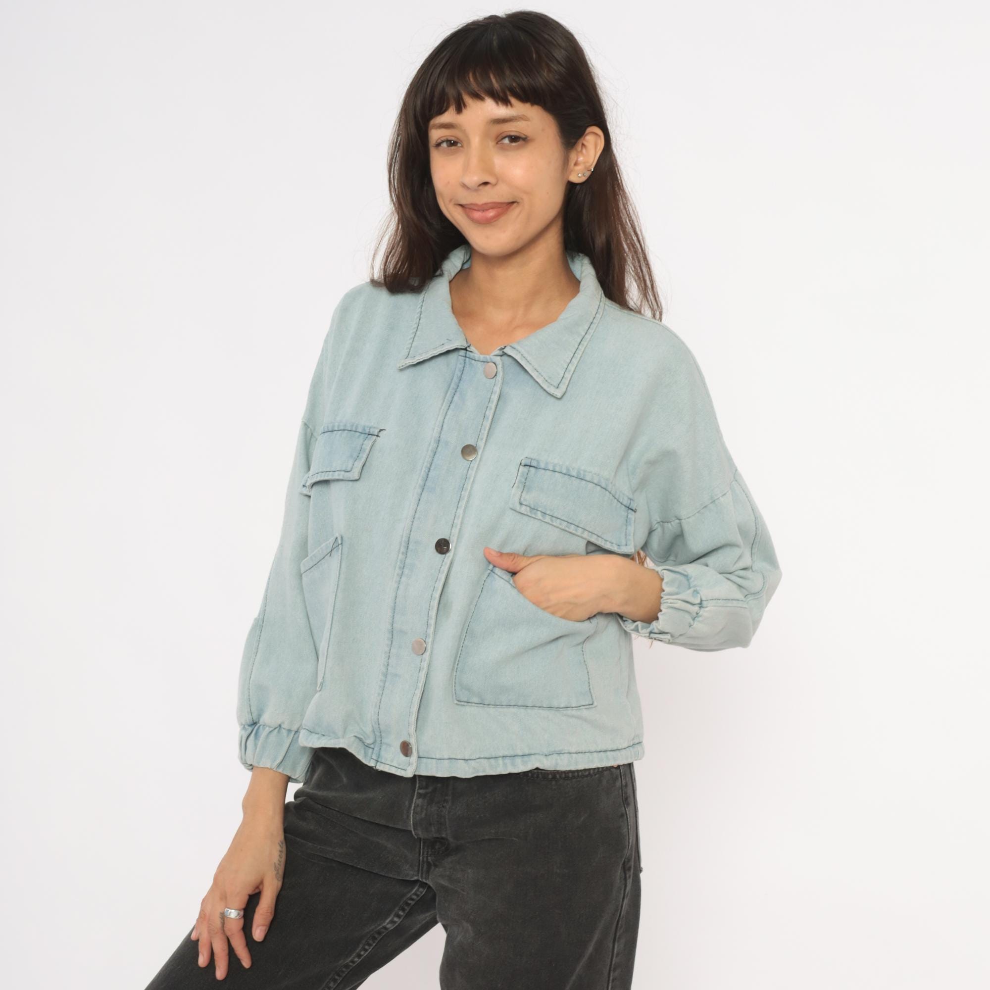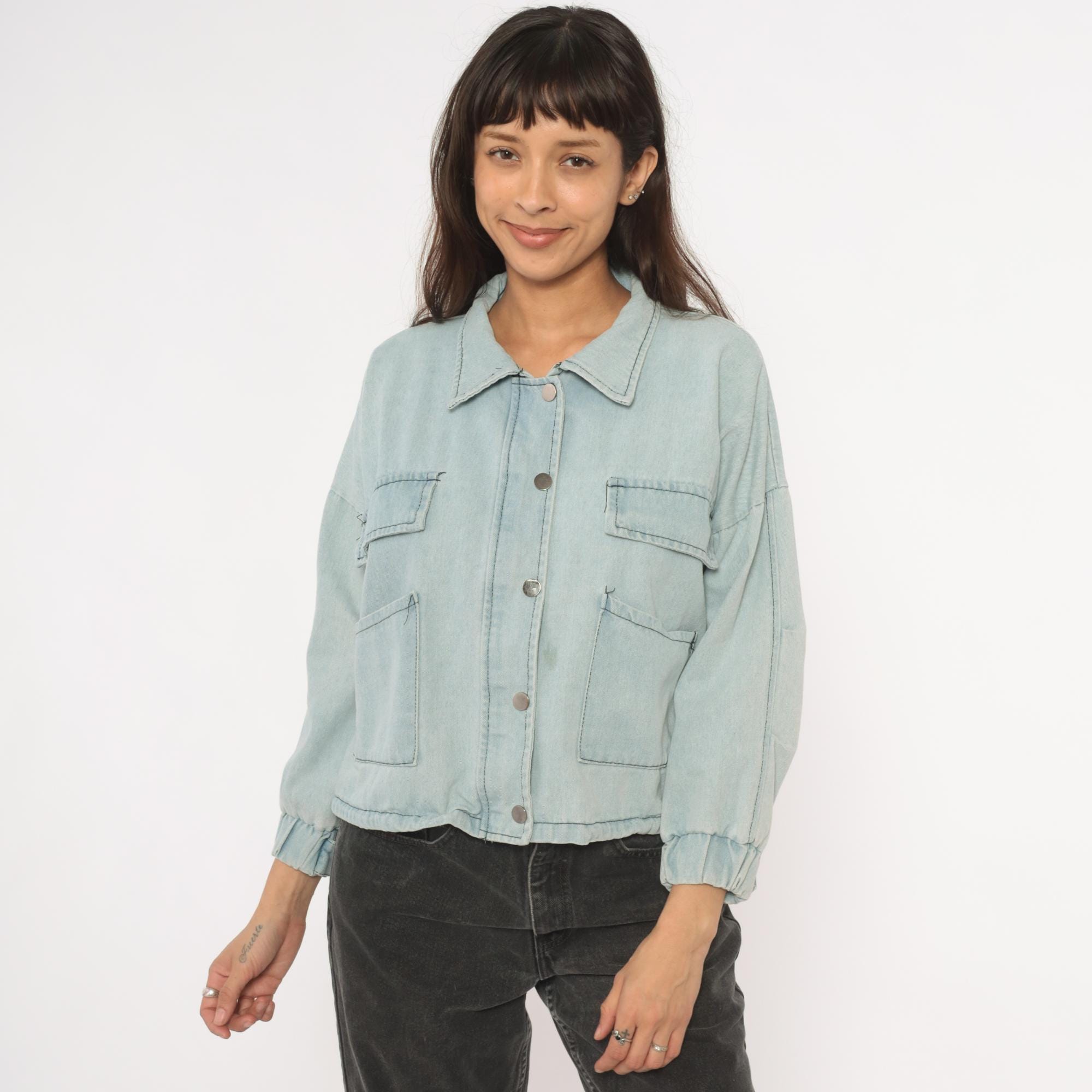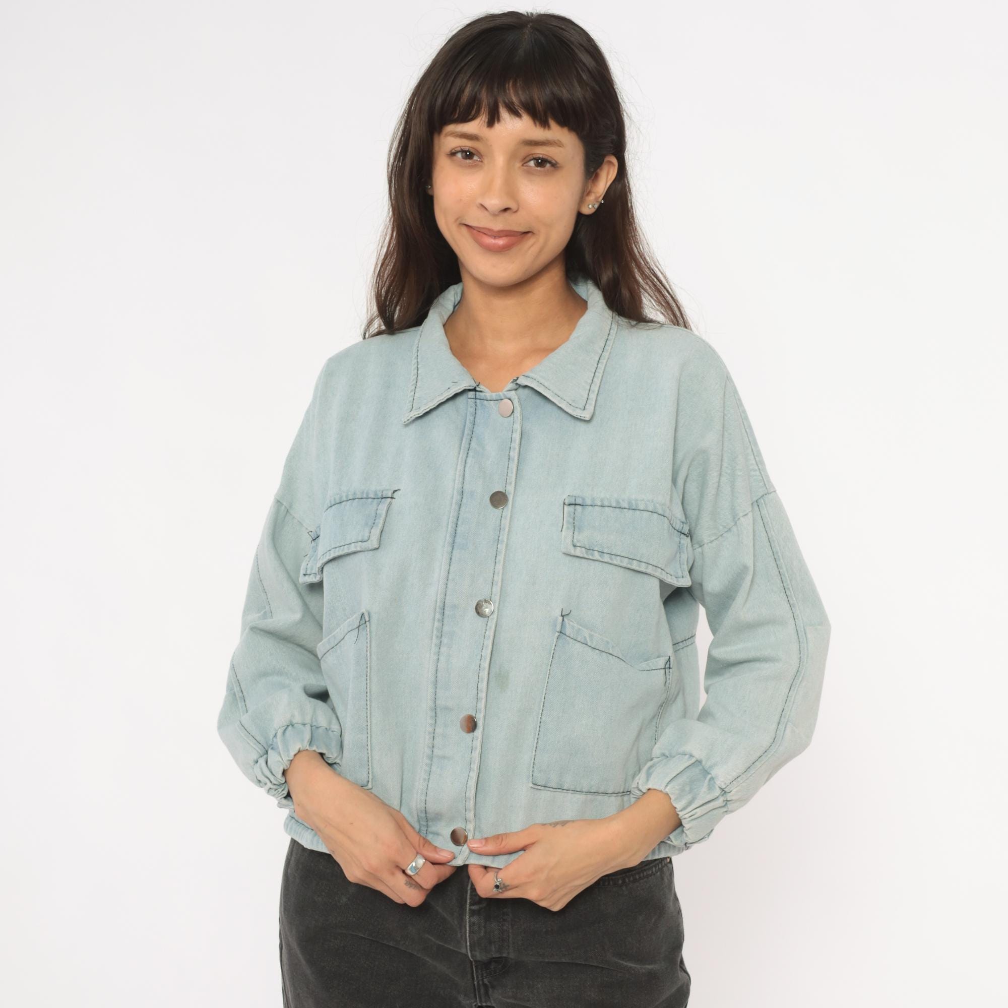 Light wash denim crop jacket from Wang Luo Niu Za with a spread collar and full snap button front closure. Four front patch pockets — two flap chest pockets and two open hip pockets — with contrast dark stitching throughout. Balloon sleeves with elasticized cuffs, elasticized hem, and a boxy cropped silhouette hitting at the waist.