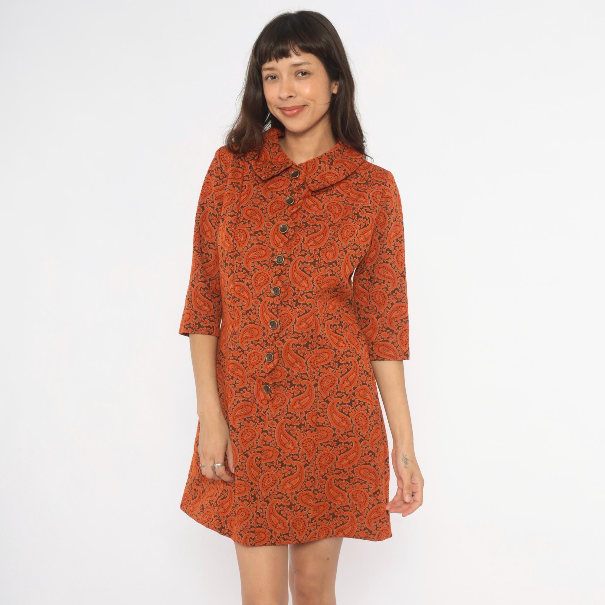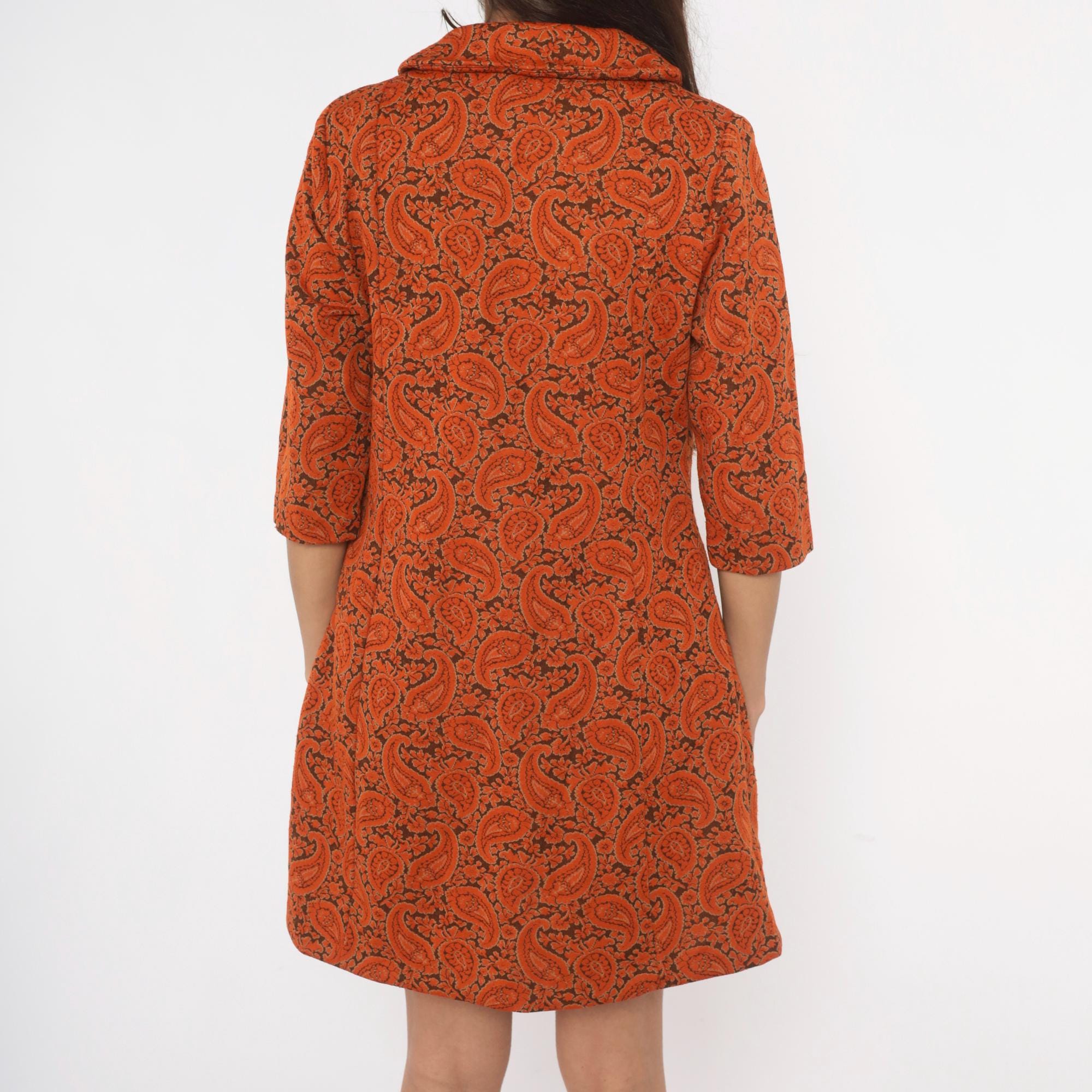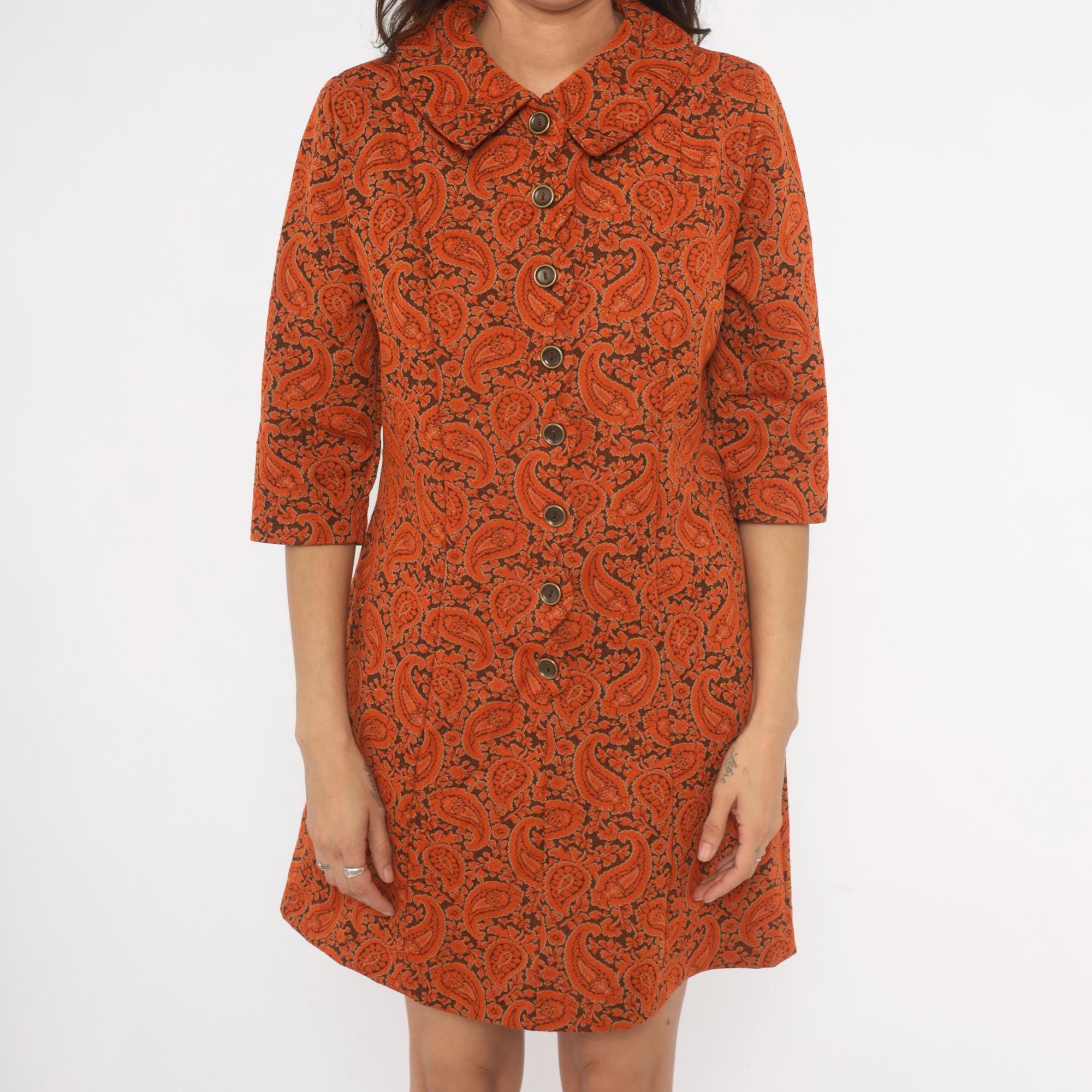 70s orange and brown paisley shift dress from Caldwell with a pointed fold-over collar and full button front closure with brass-tone buttons. Three-quarter length sleeves and an A-line silhouette falling above the knee. Allover paisley and floral print in rust, copper, and deep brown tones across the entire garment.